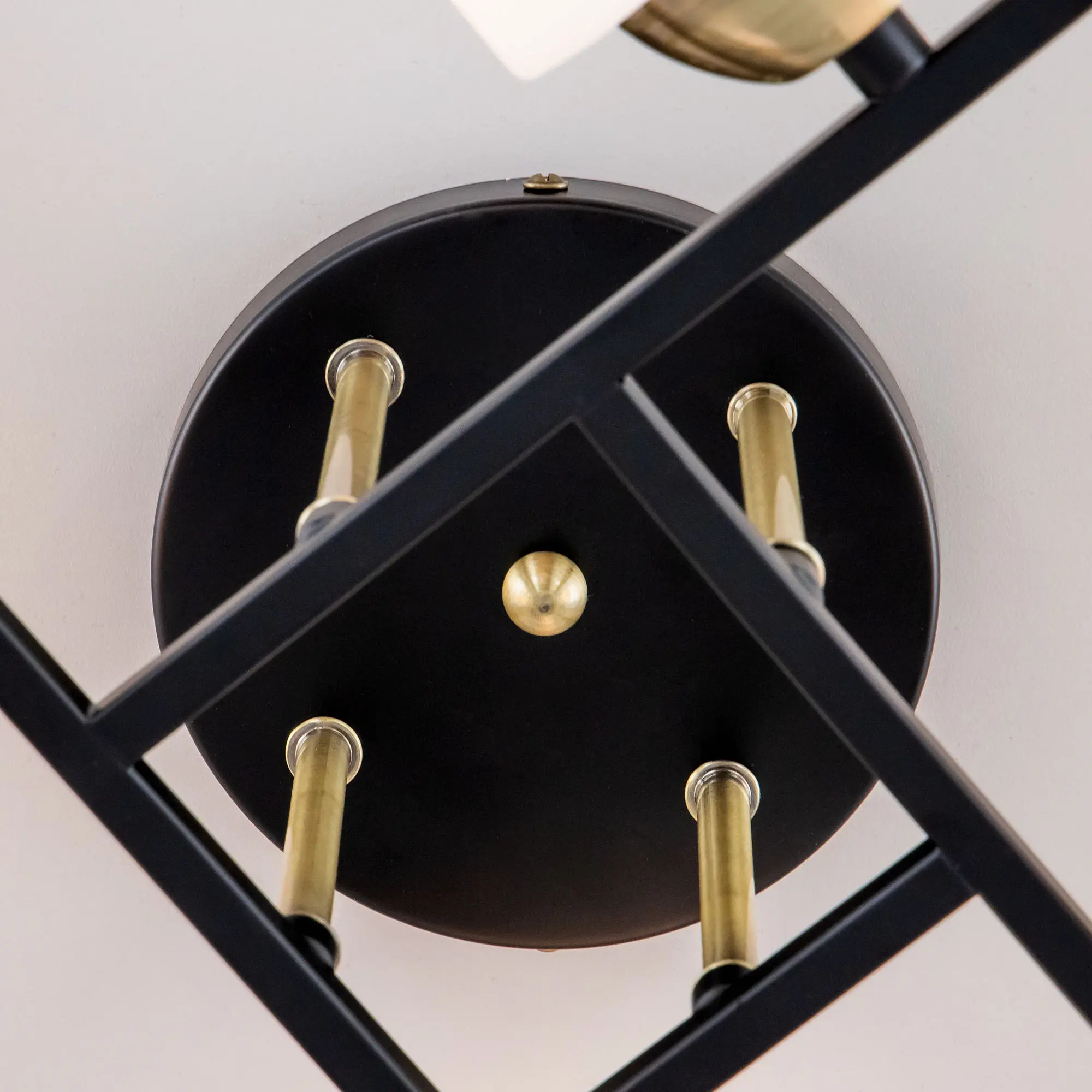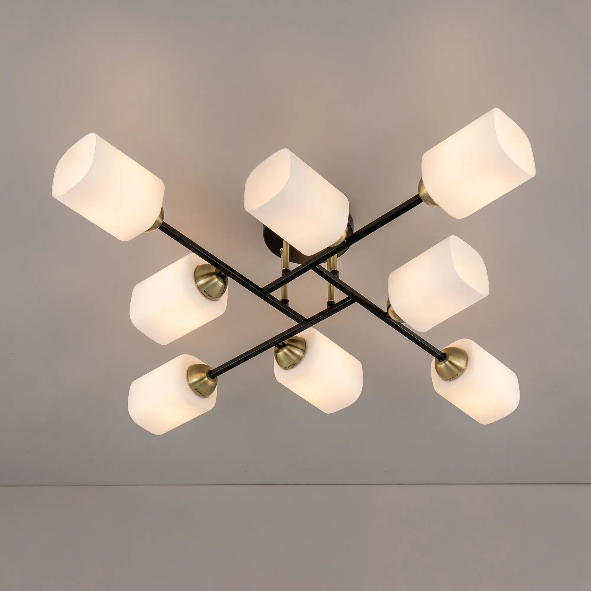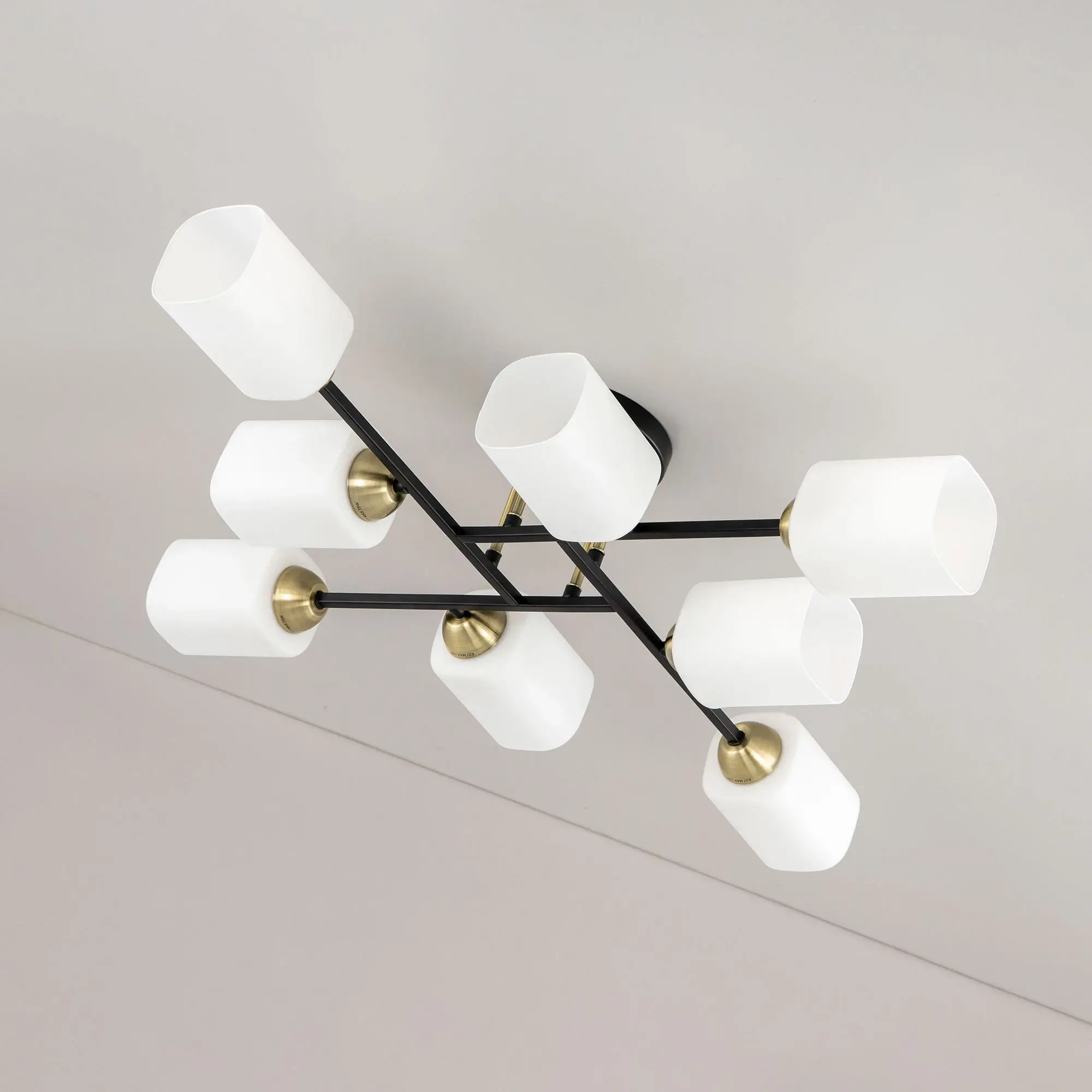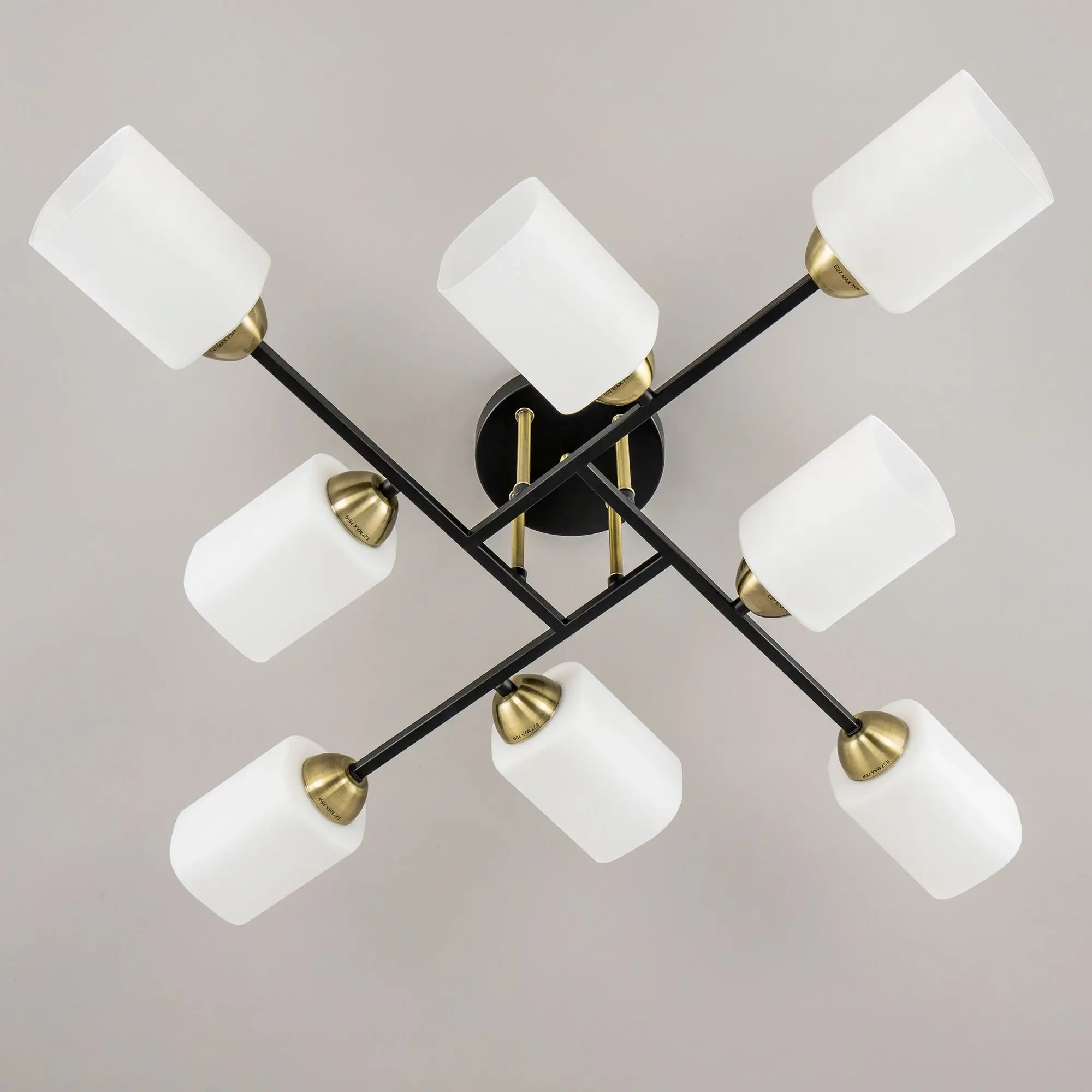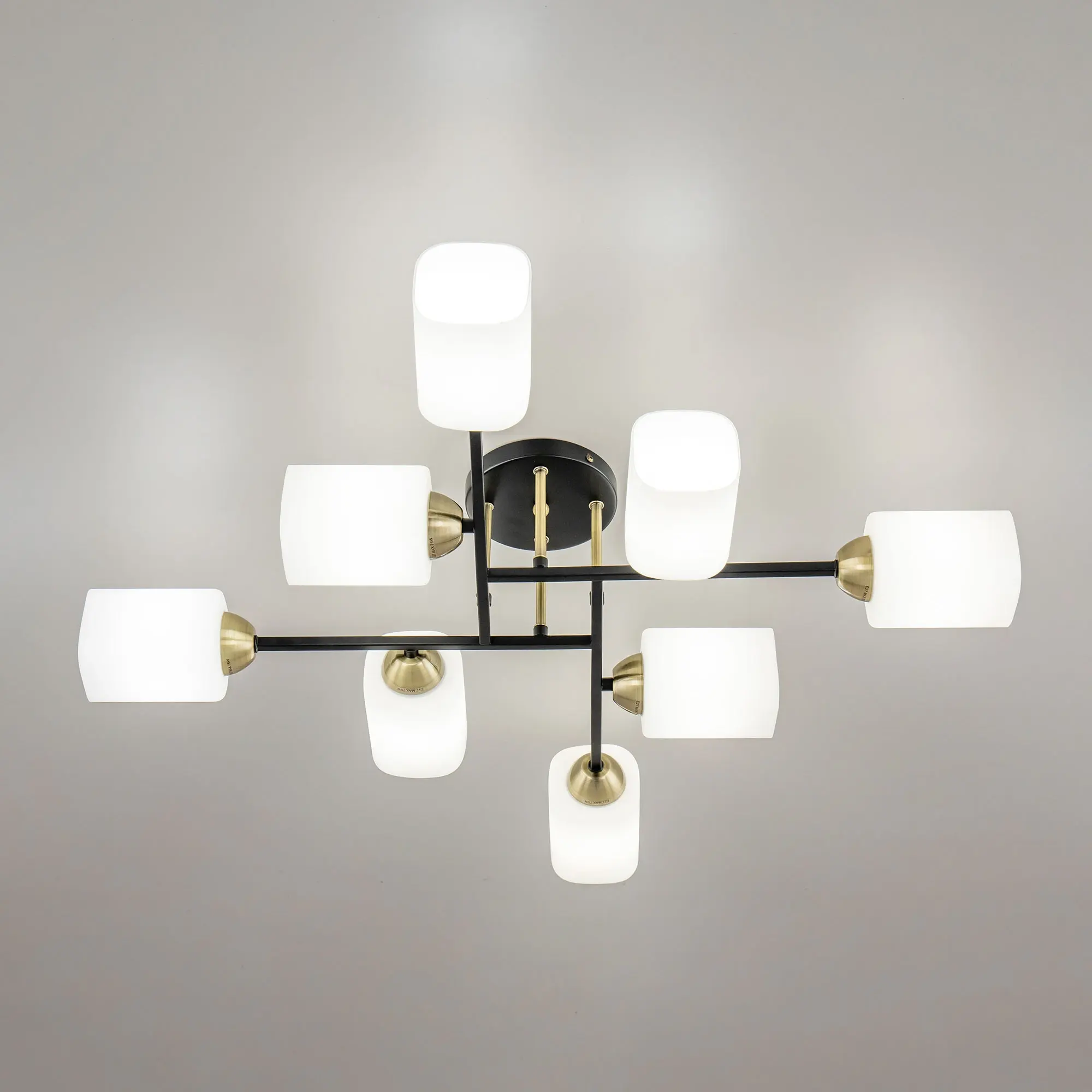 Люстра Citilux Генри CL130285 выполнена в современном стиле. Корпус светильника металлический, цвет чёрный, с декоративными бронзовыми элементами. Основание круглой формы, к нему на коротких штангах крепятся прямые рожки. Плафоны стеклянные матовые квадратной формы, расположены горизонтально. В люстре восемь ламп с цоколем Е27 и максимальной мощностью для ламп накаливания 75Вт. Светодиодные лампы можно использовать более яркие. Модель подходит для всех типов потолков, в том числе натяжных. Тип крепления – планка. Светильник рассчитан на работу как с одноклавишным, так и с двухклавишным выключателем.