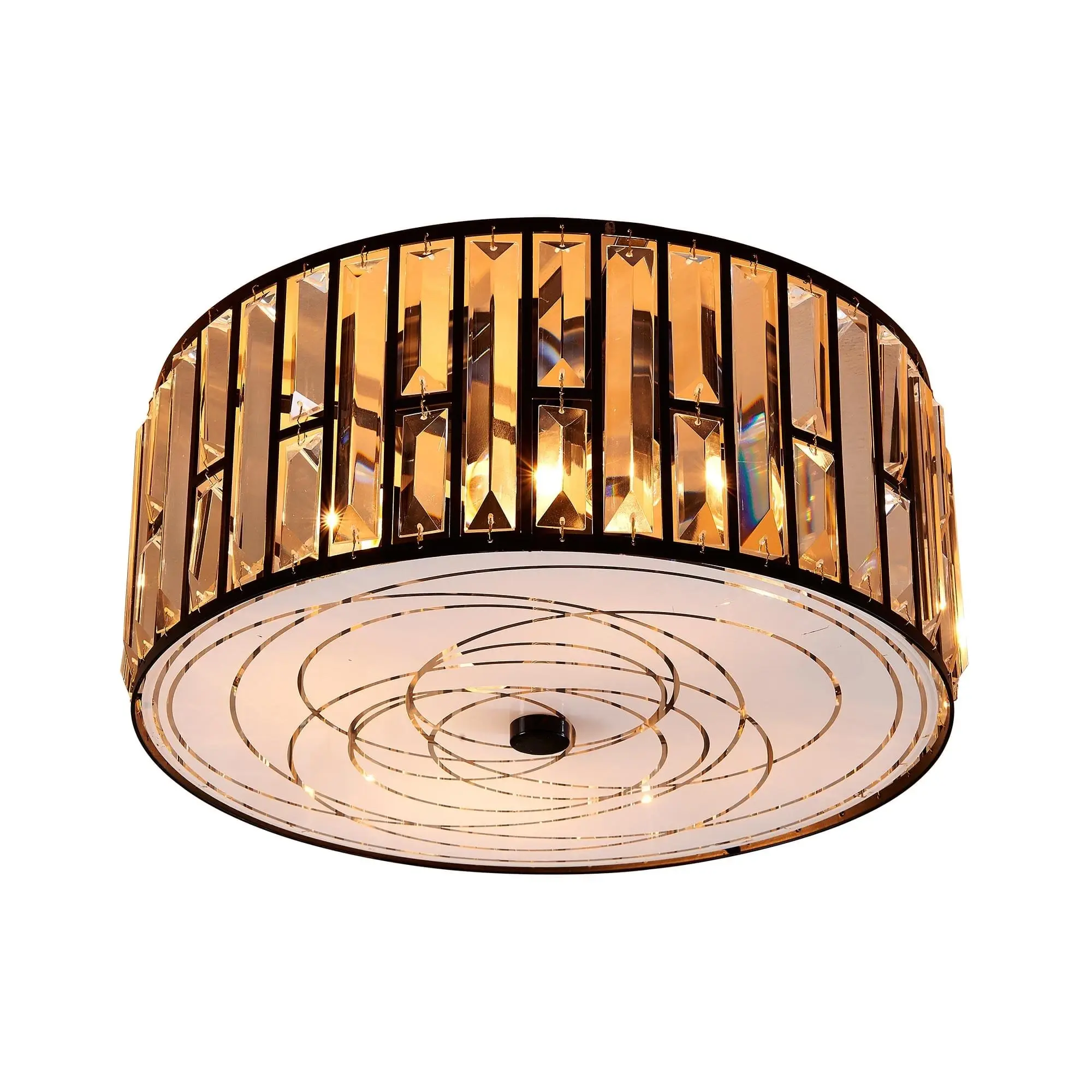 Потолочная люстра Citilux Germes CL331151 с хрустальными элементами. Корпус люстры — из металлического сплава, окрашенного в кофейный оттенок. Светильник цилиндрической формы: нижняя часть — из матового стекла с оригинальным геометрическим прозрачным рисунком, боковая часть составлена из хрустальных элементов с огранкой в форме призмы.