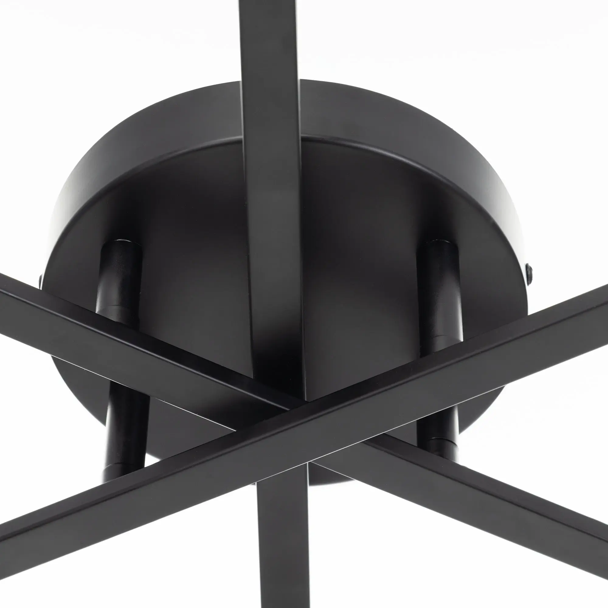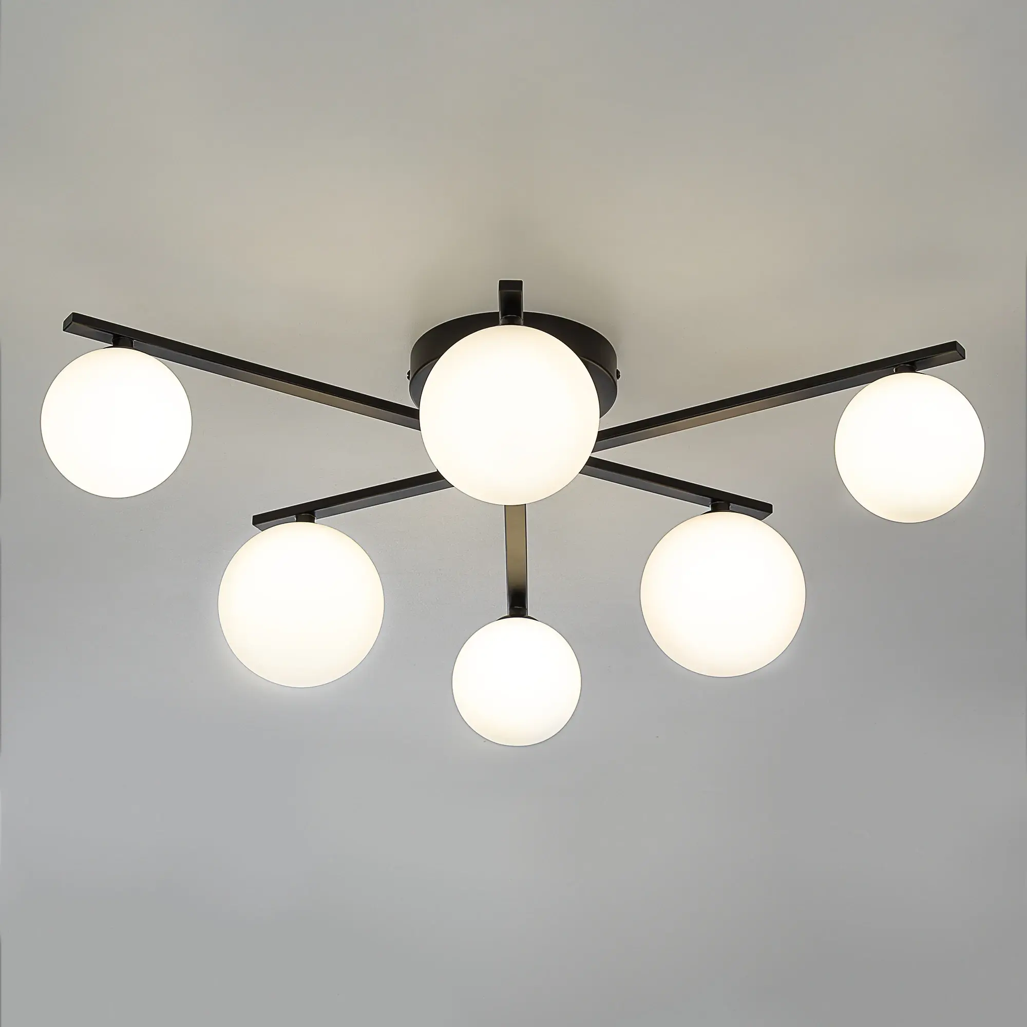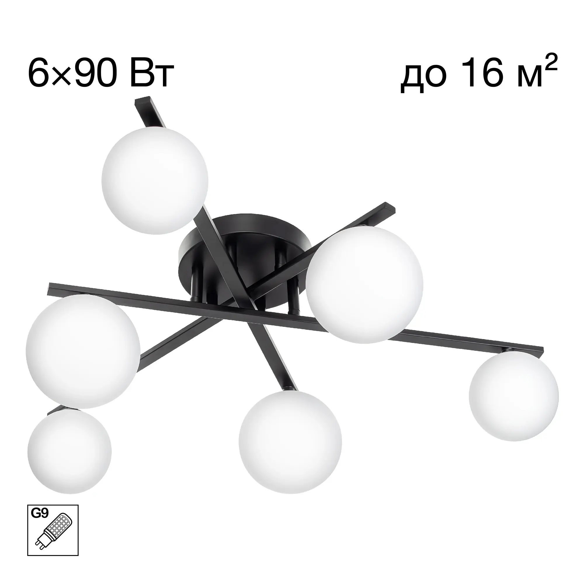Корпус люстры изготовлен из металлического сплава классического черного цвета. Плафоны-сферы из белого матового стекла разного диаметра попарно расположены на горизонтальных рожках-штангах. Плафоны имеют диаметр 10 и 13см, размещены симметрично относительно центра люстры. Форма, материал и расположение плафонов обеспечивают мягкий заливной свет, который равномерно распределяется по всему помещению.
