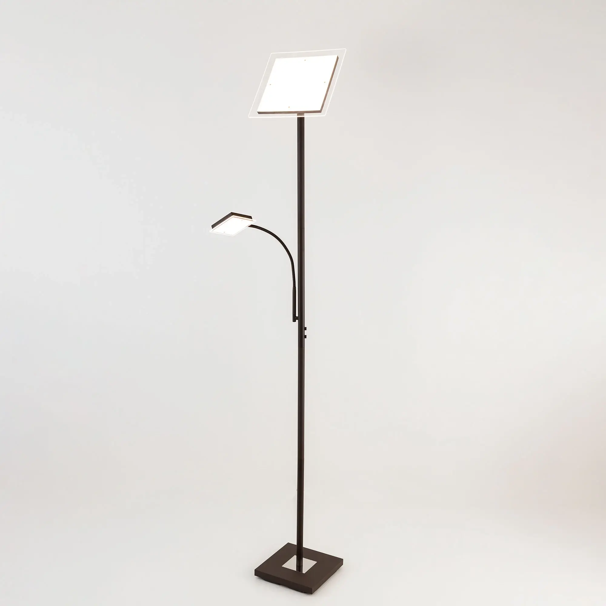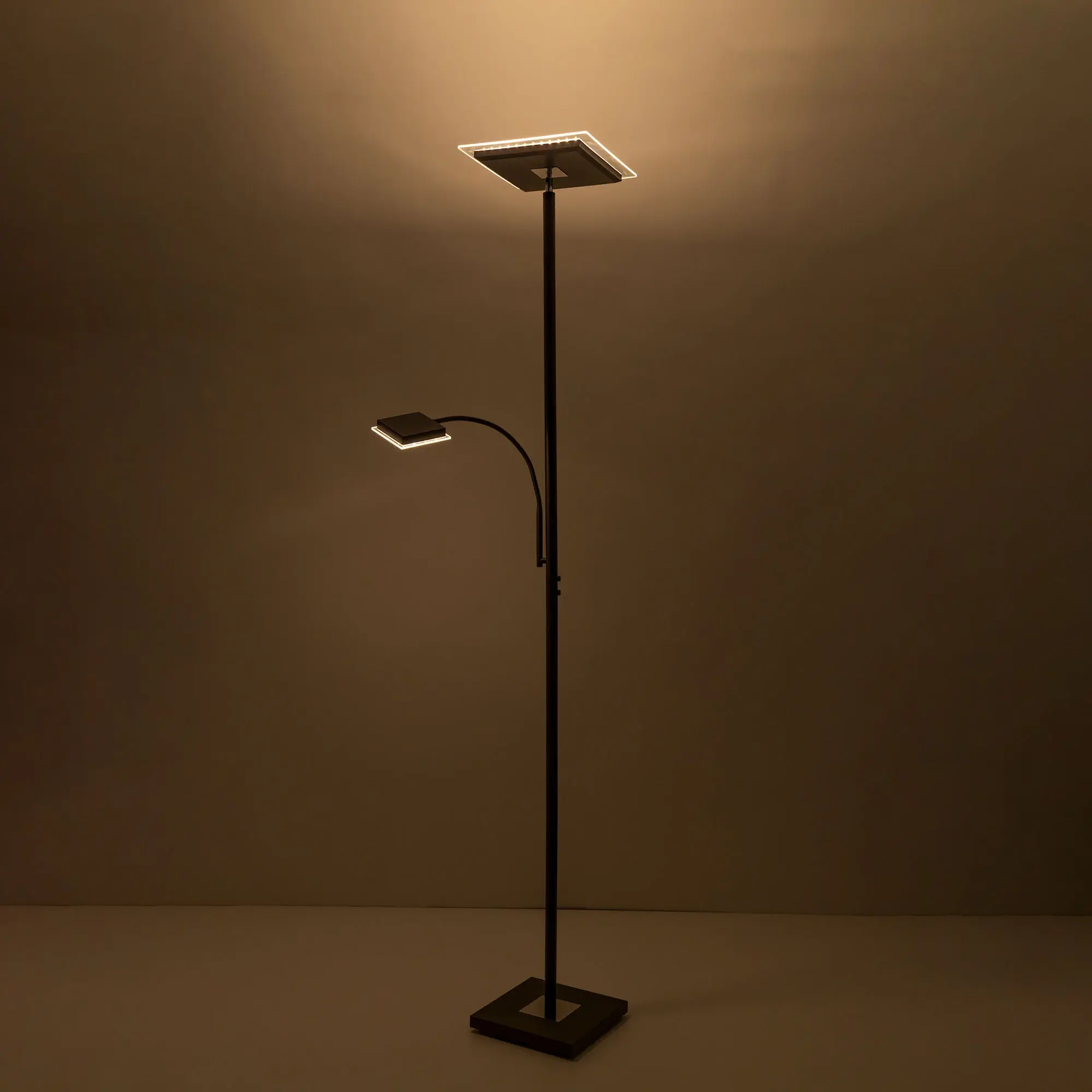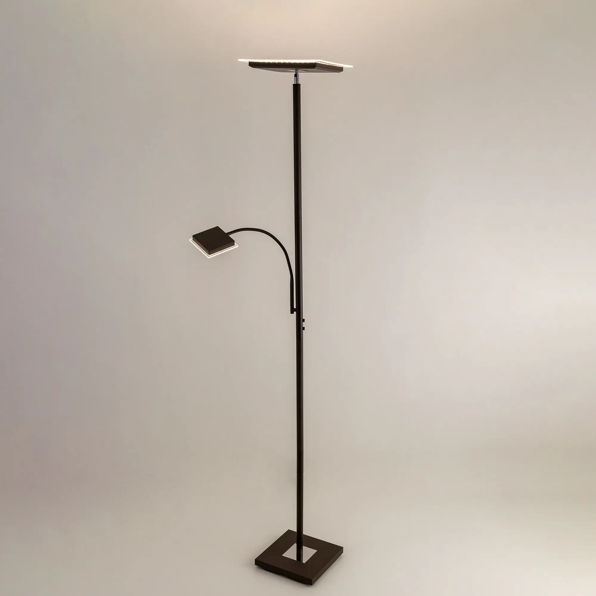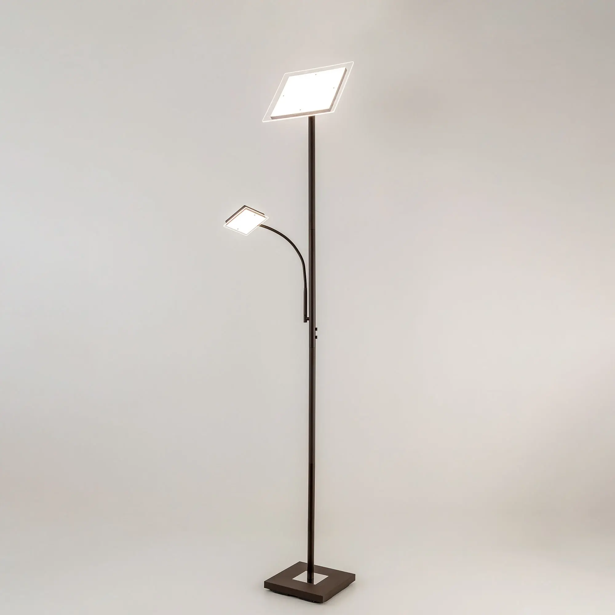 Светодиодный напольный светильник Citilux Харди CL802015 с сенсорным управлением. Корпус металлический, цвет коричневый (кофейный) с декоративными хромированными элементами. Изделие имеет два светодиодных модуля – плафона квадратной формы. Верхний плафон поворотный, для общего освещения, мощность 24Вт. Нижний плафон на гибкой ножке, для чтения, мощность 6Вт. Цветовая температура 3000К – тёплый белый свет. Верхний свет с плавной регулировкой яркости 10-100%, подсветка для чтения с индивидуальным выключателем. Размеры: 28х28см, высота 182см, длина сетевого шнура 2,1м. Торшер Citilux Харди CL802015 подойдёт для комфортного освещения современных квартир и загородных домов