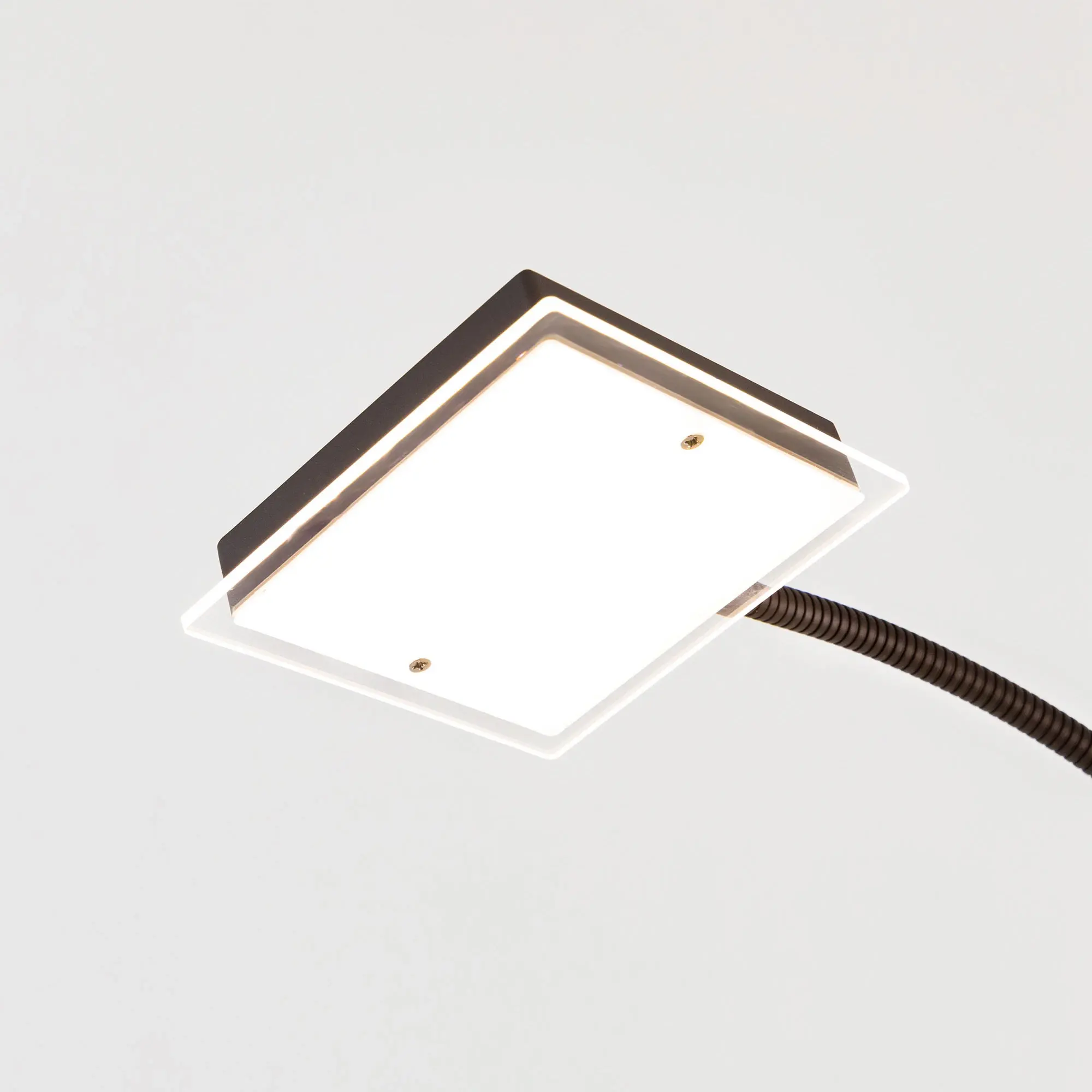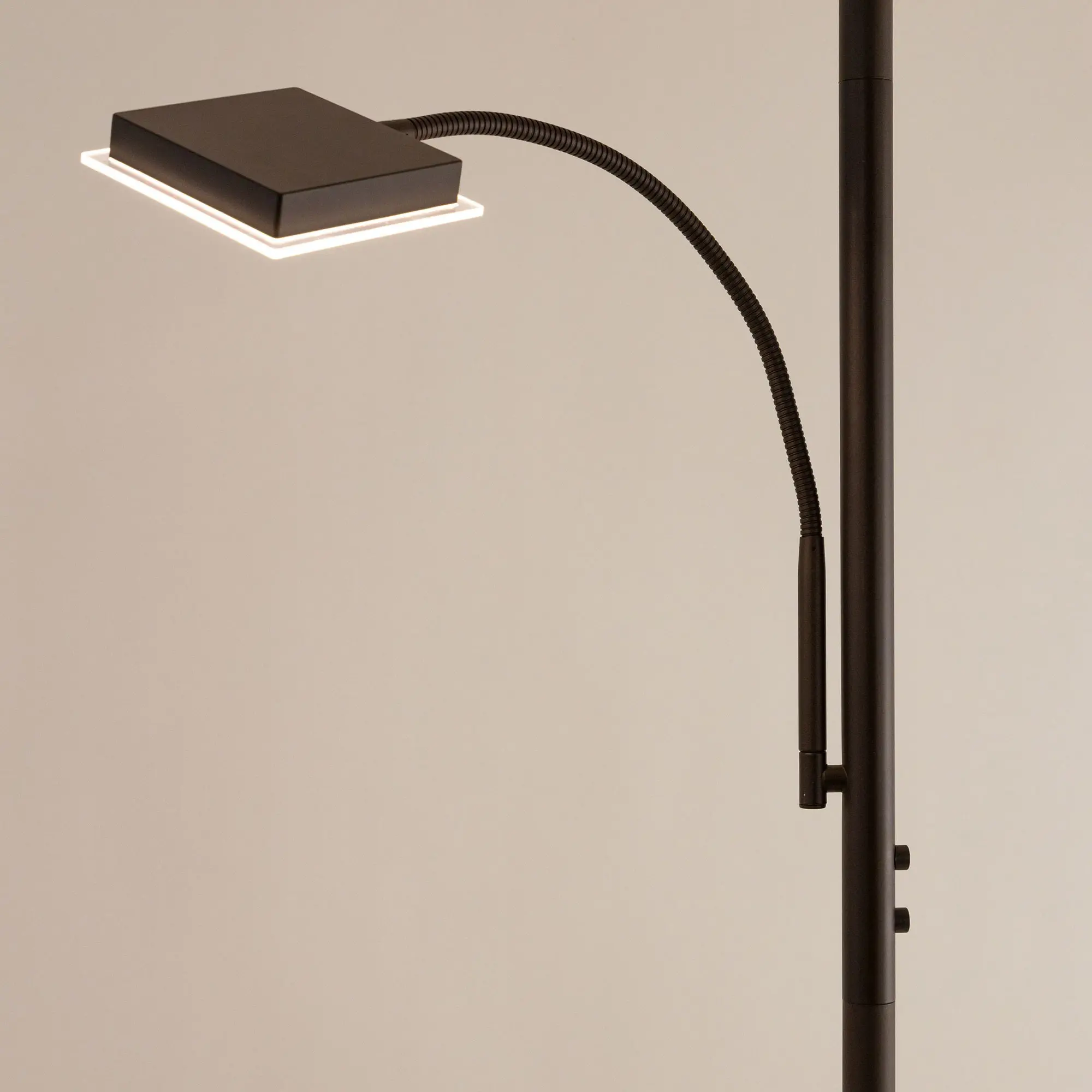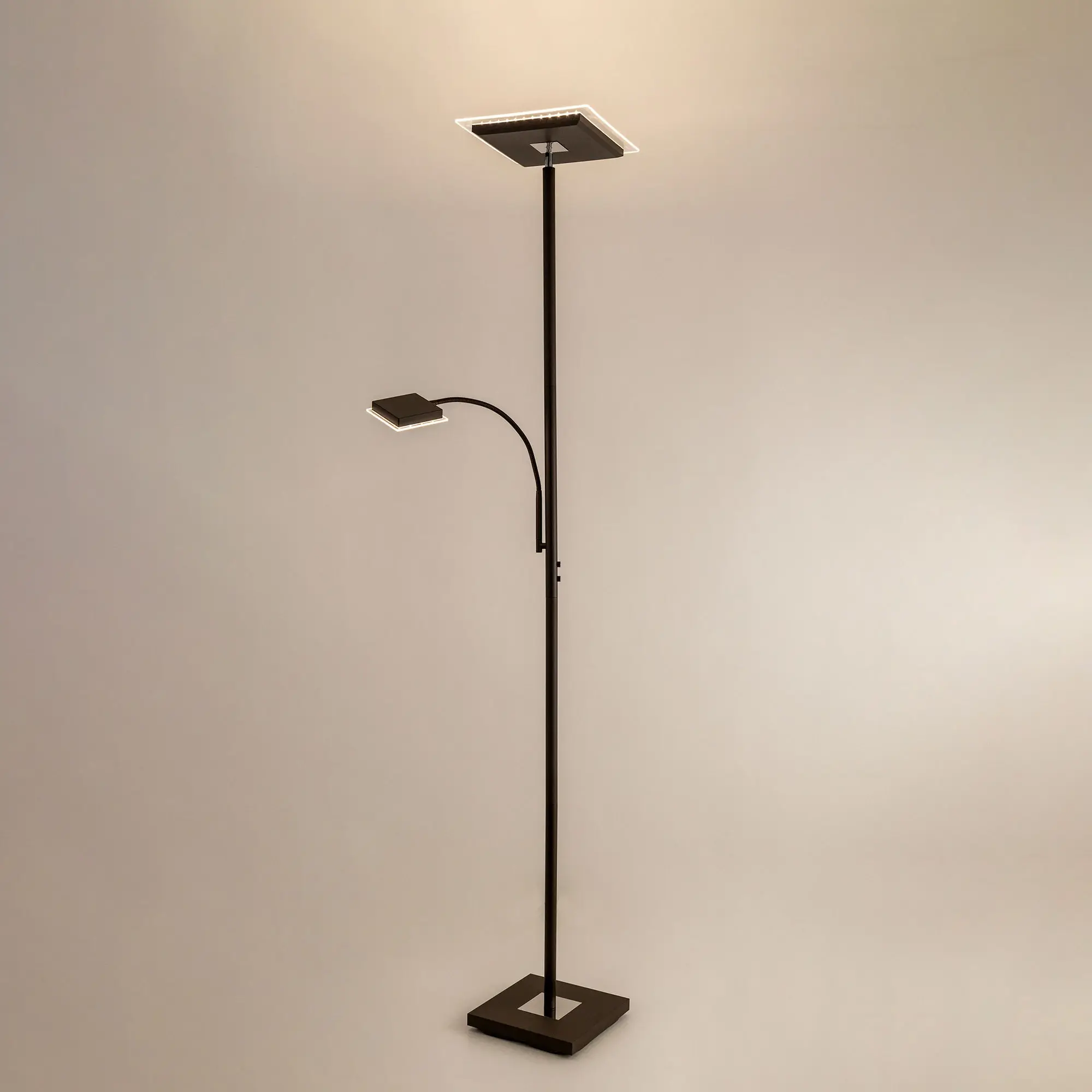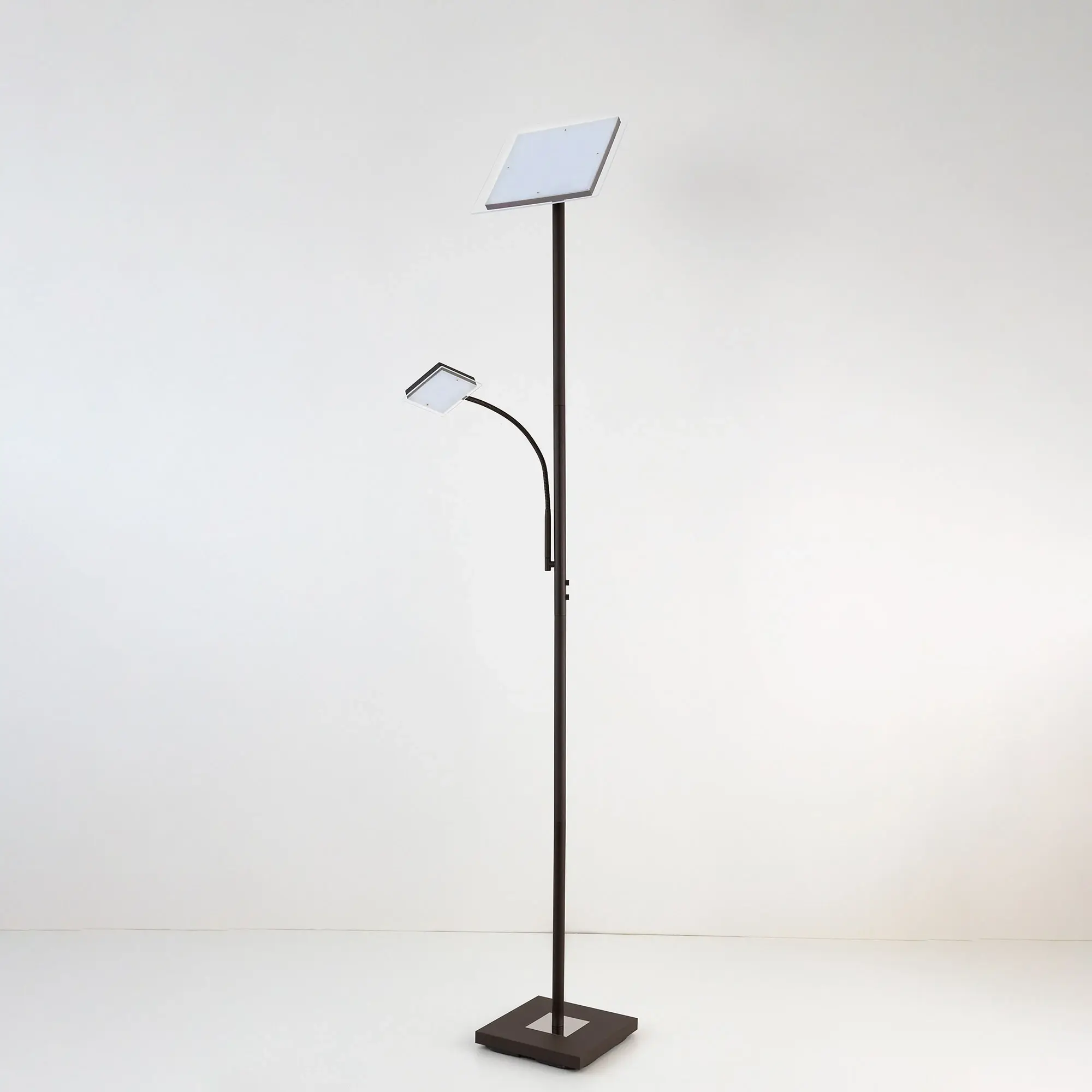Светодиодный напольный светильник Citilux Харди CL802015 с сенсорным управлением. Корпус металлический, цвет коричневый (кофейный) с декоративными хромированными элементами. Изделие имеет два светодиодных модуля – плафона квадратной формы. Верхний плафон поворотный, для общего освещения, мощность 24Вт. Нижний плафон на гибкой ножке, для чтения, мощность 6Вт. Цветовая температура 3000К – тёплый белый свет. Верхний свет с плавной регулировкой яркости 10-100%, подсветка для чтения с индивидуальным выключателем. Размеры: 28х28см, высота 182см, длина сетевого шнура 2,1м. Торшер Citilux Харди CL802015 подойдёт для комфортного освещения современных квартир и загородных домов