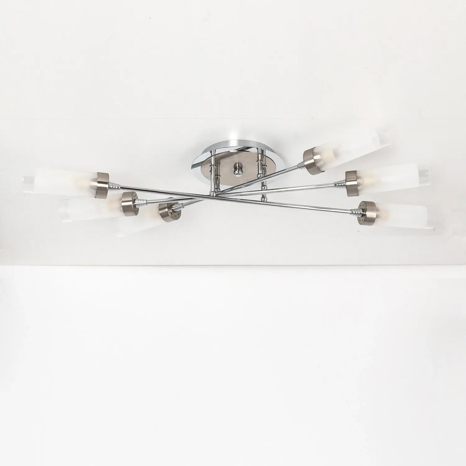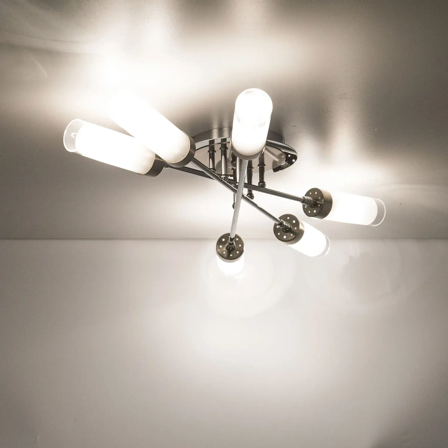 Светильник потолочный коллекции «Хеликс» на 6 рожков прямоугольной, вытянутой форму. Такое решение позволяет идеально рассеивать освещение на помещения такой формы, если монтировать светильник по длинной стороне комнаты. Если же помещение больше правильной, квадратной форму, то можно рассмотреть вариант установки по диагонали из угла в угол, что ещё эффективней осветит вашу комнату. Площадь освещения до 17 квадратных метров. Плафоны полупрозрачные, что способствует очень хорошему рассеянию света на всю комнату, не оставляя тёмных углов. Арматура люстры покрашена в двойной цвет: хром и хром матовый, что очень стильно смотрится и облегчает привязку по цвету к дизайну помещения. В конструкции используются термостойкие качественные патроны цоколя Е14, позволяющие применить лампы накаливания до 60 ватт, светодиодные лампочки допускается использовать любой мощности. Вытянутая форма плафона будет идеально смотреться с лампочкой в форме свечи. Способ крепления потолочный, на планку. Подходит для любого типа потолка, в том числе и натяжного. С завода светильник в упаковке сразу собран и скоммутирован на двойной выключатель. С одной клавиши включается четыре лампы, со второй две. При желании можно переделать так, как Вам это больше понравится, вся проводка выходит в основание.