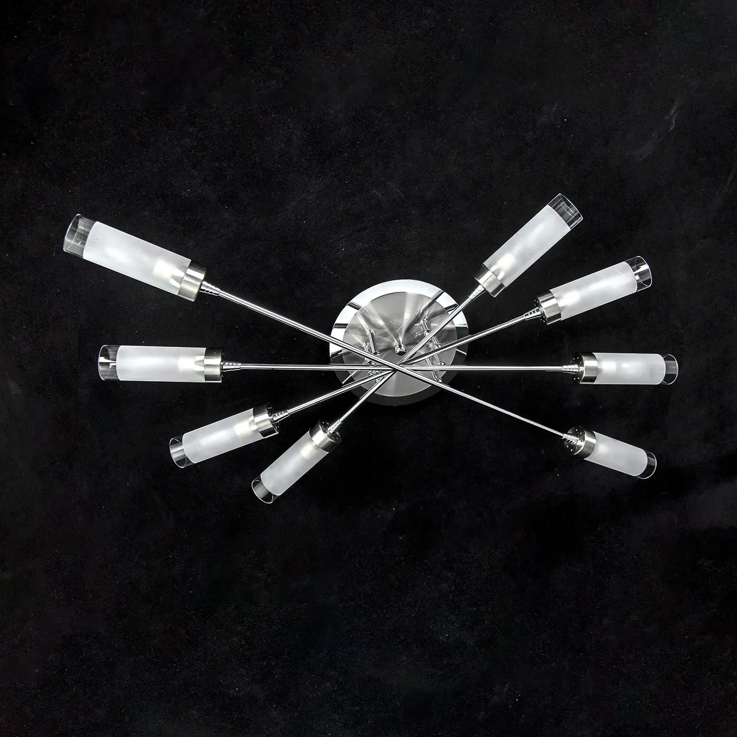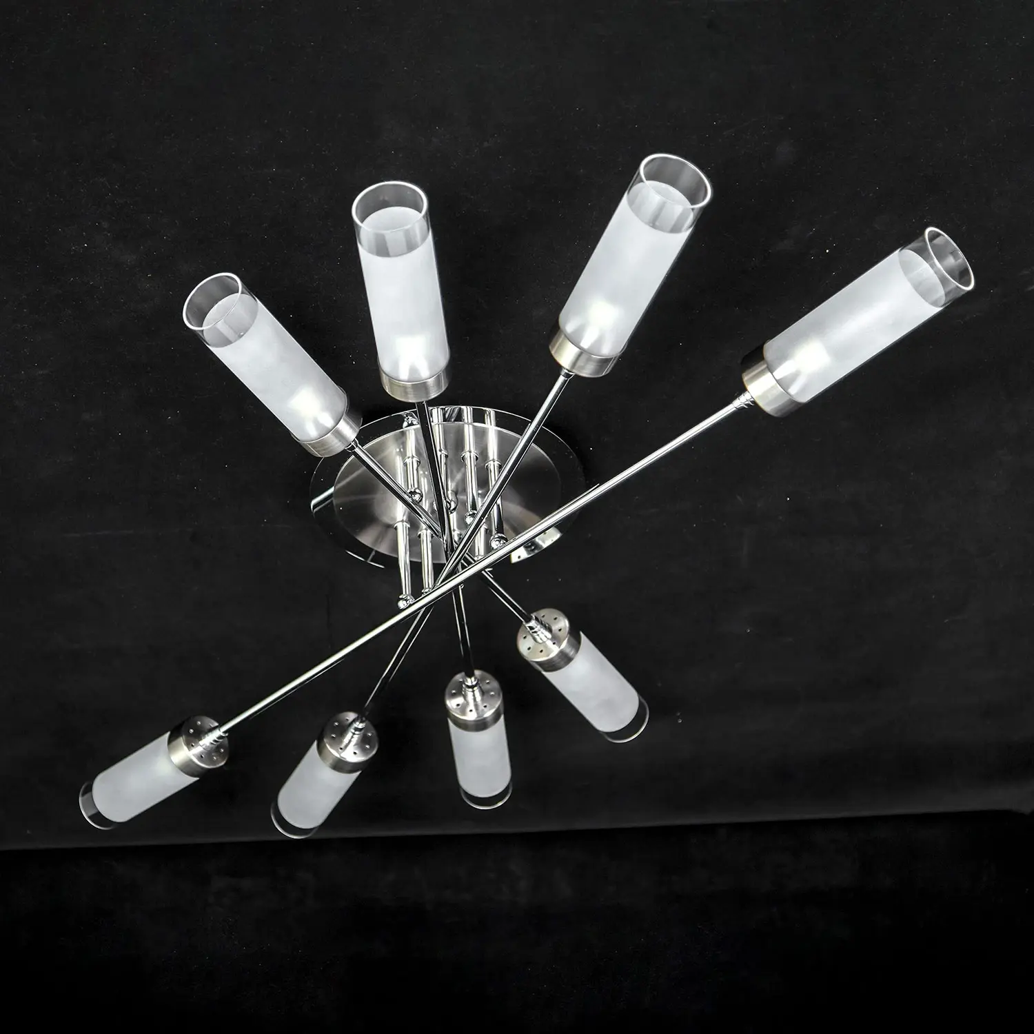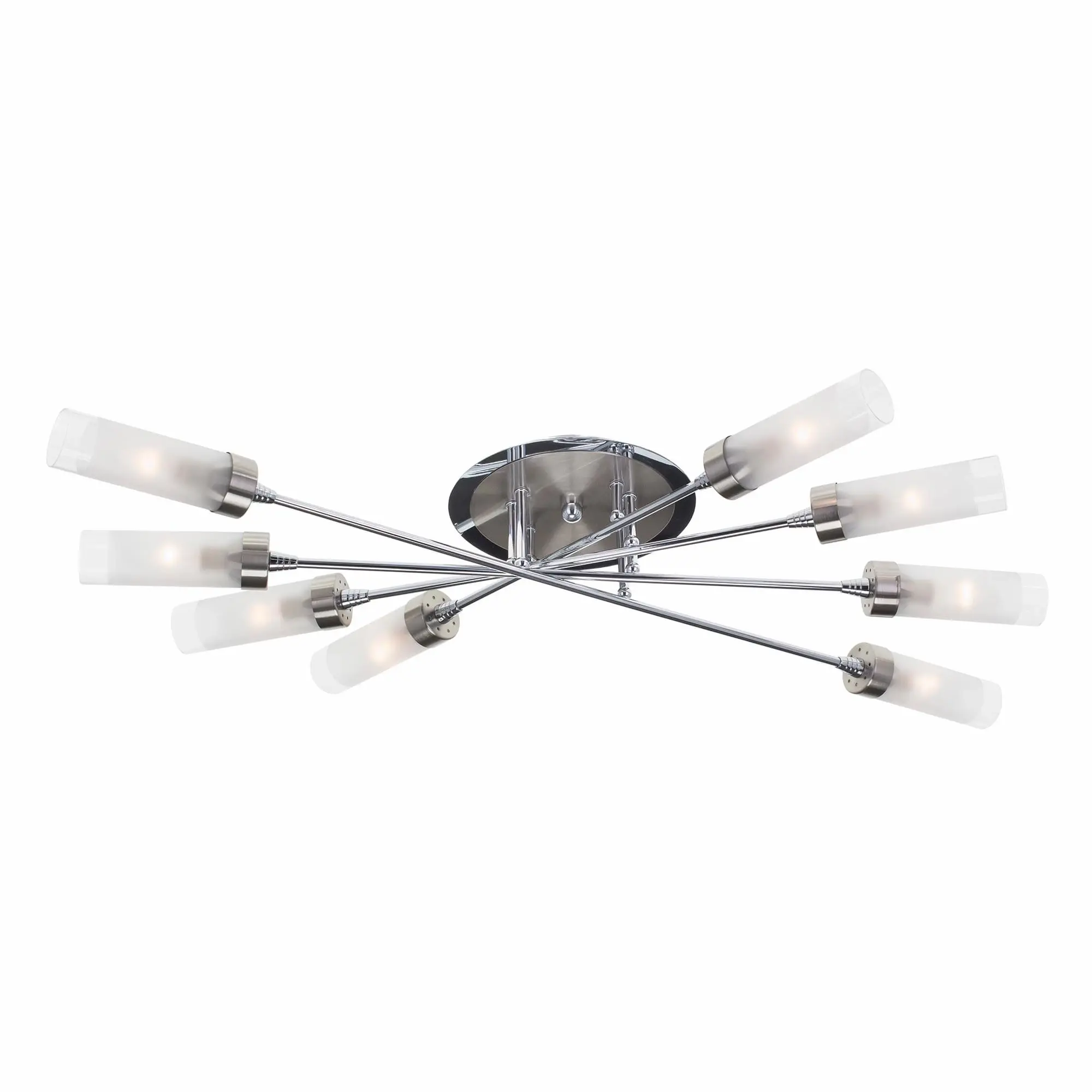 Люстра потолочная серии «Хеликс» на восемь рожков яркий представитель стиля хай тек. Светильник по высоте всего 15 сантиметров, за счёт такой компактности подойдёт для установки даже на самые низкие потолки. Конструкция очень пропорциональная, идеально будет смотреться в помещениях любой геометрической формы. Арматура светильника сделана из металла, плафоны из стекла. Арматура покрашена в два цвета – хром и хром матовый, что добавляет светильнику универсальности с точки зрения цветовой привязки в интерьере. Плафон очень удобно крепится с помощью прижимного пружинного механизма. Фактически при сборке он просто вставляется на своё место, сразу фиксируясь по центру. Такой способ крепления очень удобен с точки зрения замены лампочек. Плафон полупрозрачный, равномерно рассеивает свет на всё помещение, в том числе и на потолок, не оставляя тёмных углов. Площадь освещения до 23 квадратных метров. Модель в упаковке практически полностью собрана, нужно закрепить только плафоны. Электрика разведена с завода на двойной выключатель, с первой клавиши включается 4 рожка по краям, со второй 4 рожка по центру. При желании можно коммутацию переделать так, как для вас это удобно, все провода выведены в основание люстры.