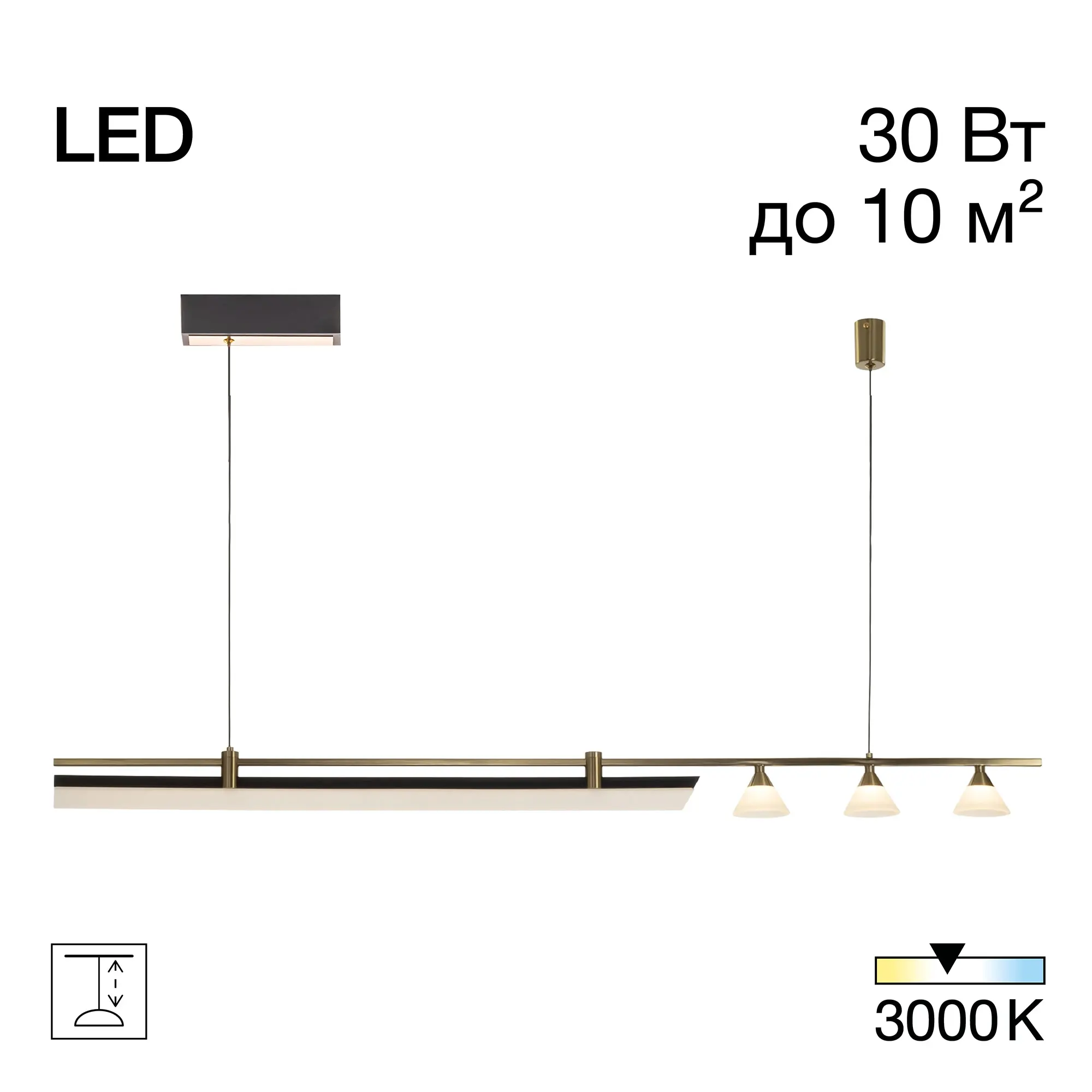 Мощность изделия составляет 30Вт, цветовая температура 3000К обеспечивает тёплый, комфортный свет, идеально подходящий для гостиной, столовой, кухни или рабочего кабинета площадью до 10м². Возможность регулировки высоты подвеса в диапазоне от 30см до 1,5м позволяет адаптировать светильник под различные пространства, делая его универсальным выбором для любого интерьера.