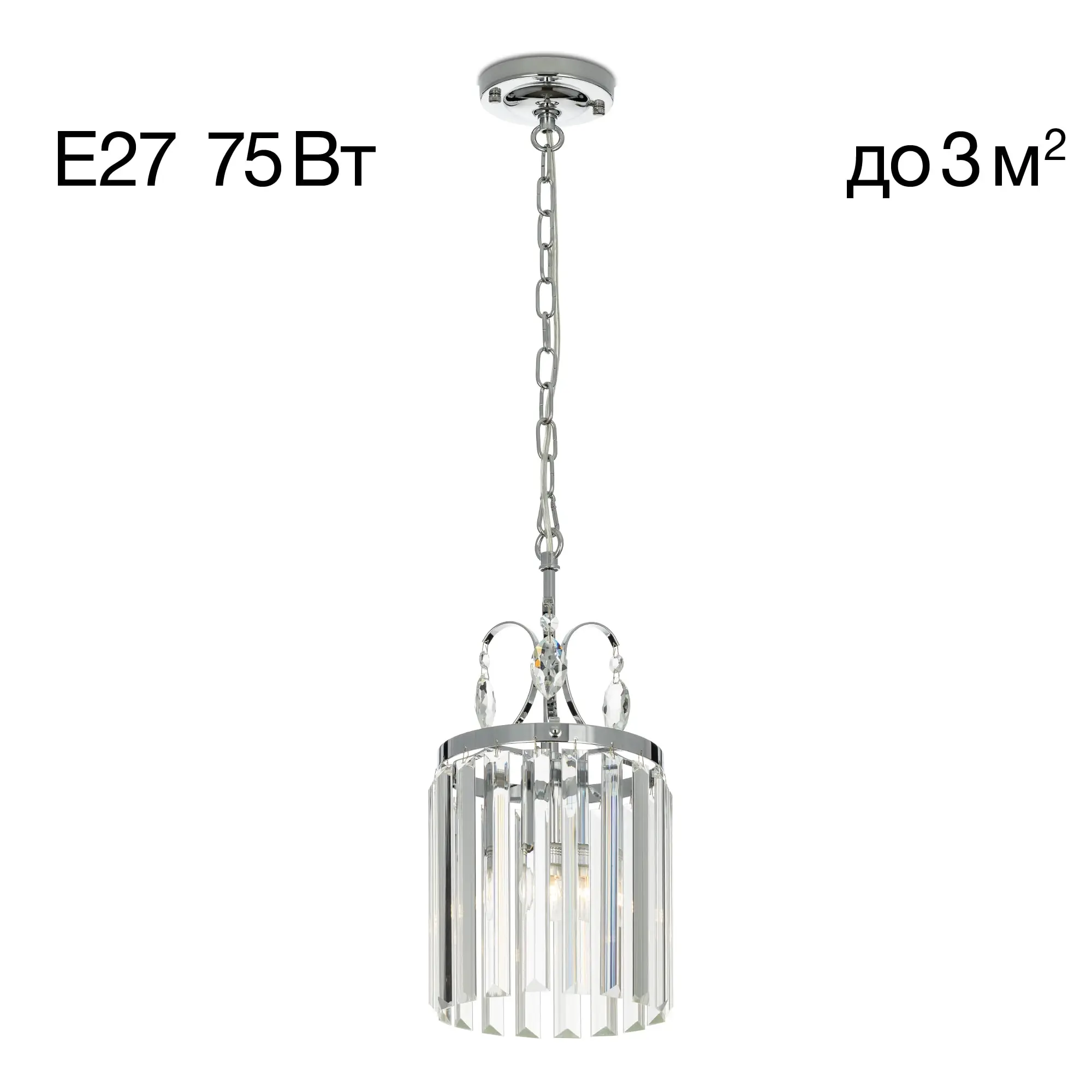 В изделии 1 лампа с цоколем Е27 максимальной мощностью для ламп накаливания 75Вт (в комплект не входит, приобретается отдельно), светодиодные лампы можно использовать более яркие. Диаметр светильника 19см, высота легко регулируется от 40см до 1,2м. Площадь освещения около 3м². Модель подходит для всех типов потолков, в том числе натяжных, тип крепления – планка.