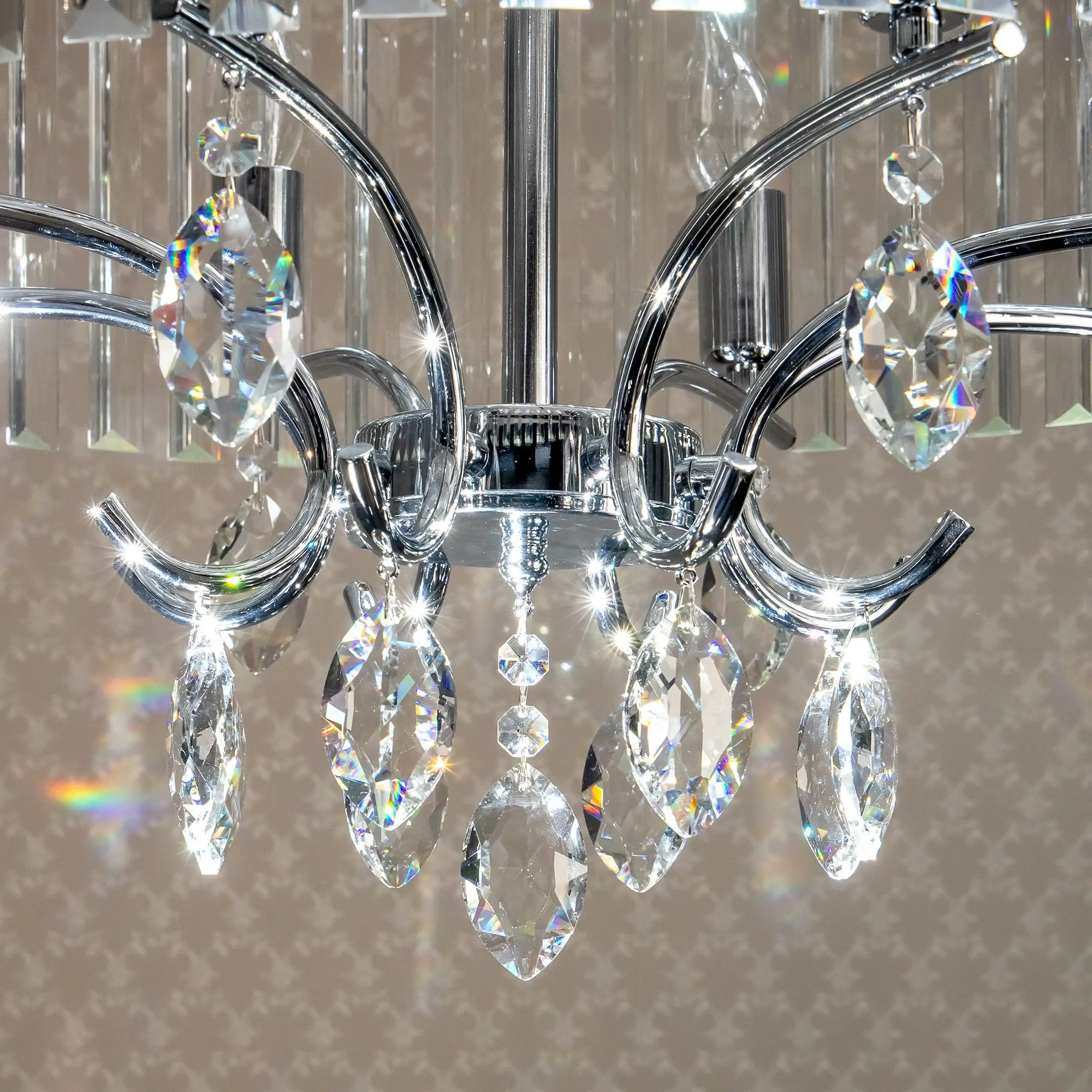 Хрустальная люстра Citilux Инга CL335181 на цепи. Корпус светильника металлический, цвет хром. Подвески хрустальные, прозрачные с классической огранкой. В модели используются 8 ламп с цоколем Е14, максимальной мощностью для ламп накаливания 60Вт. Светодиодные лампы можно использовать более яркие. Площадь освещения около 23м². Люстра подходит для всех типов потолков, в том числе натяжных. Тип крепления к потолку – планка. Светильник отлично подойдет для освещения пространств, оформленных как в современном, так и в классическом стиле,
