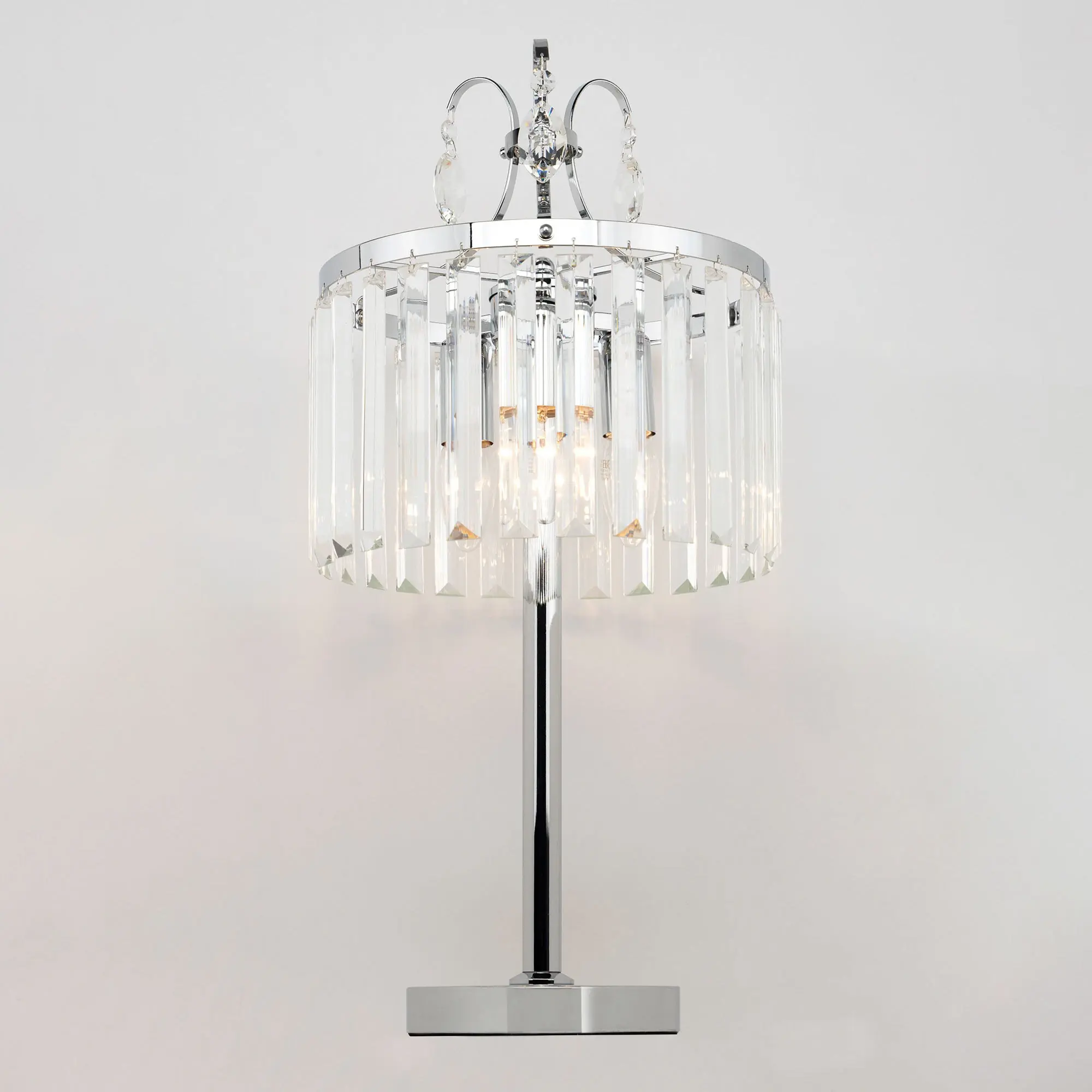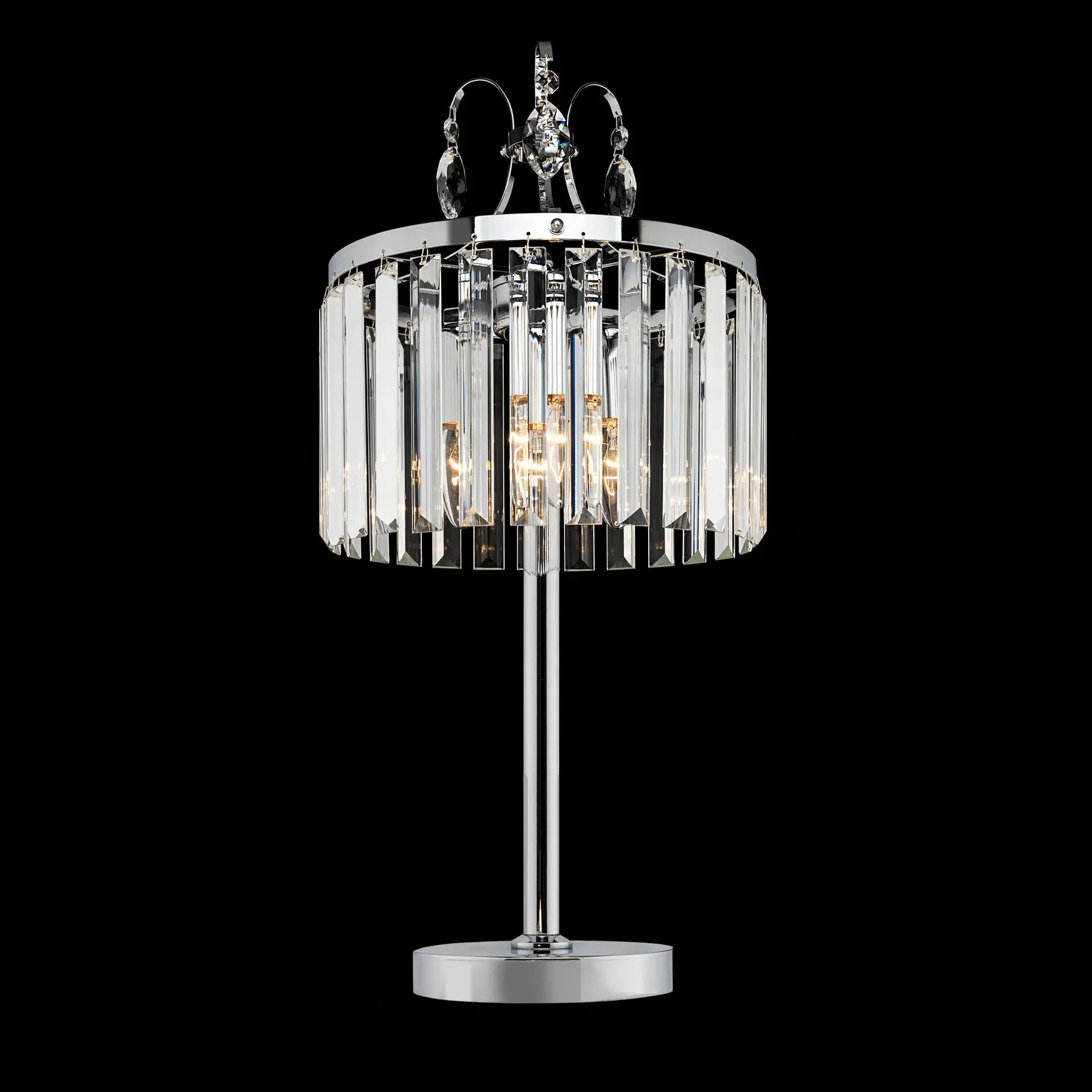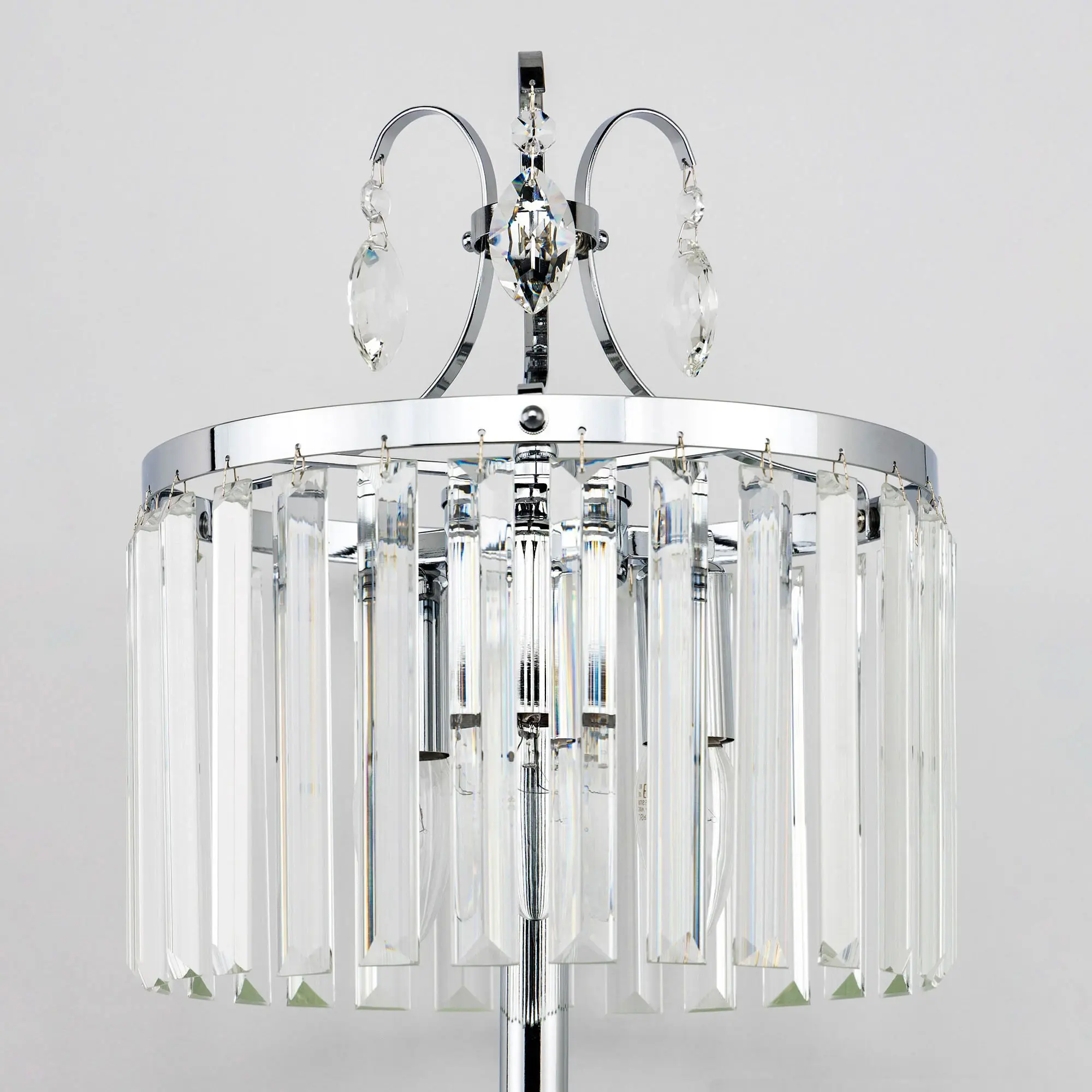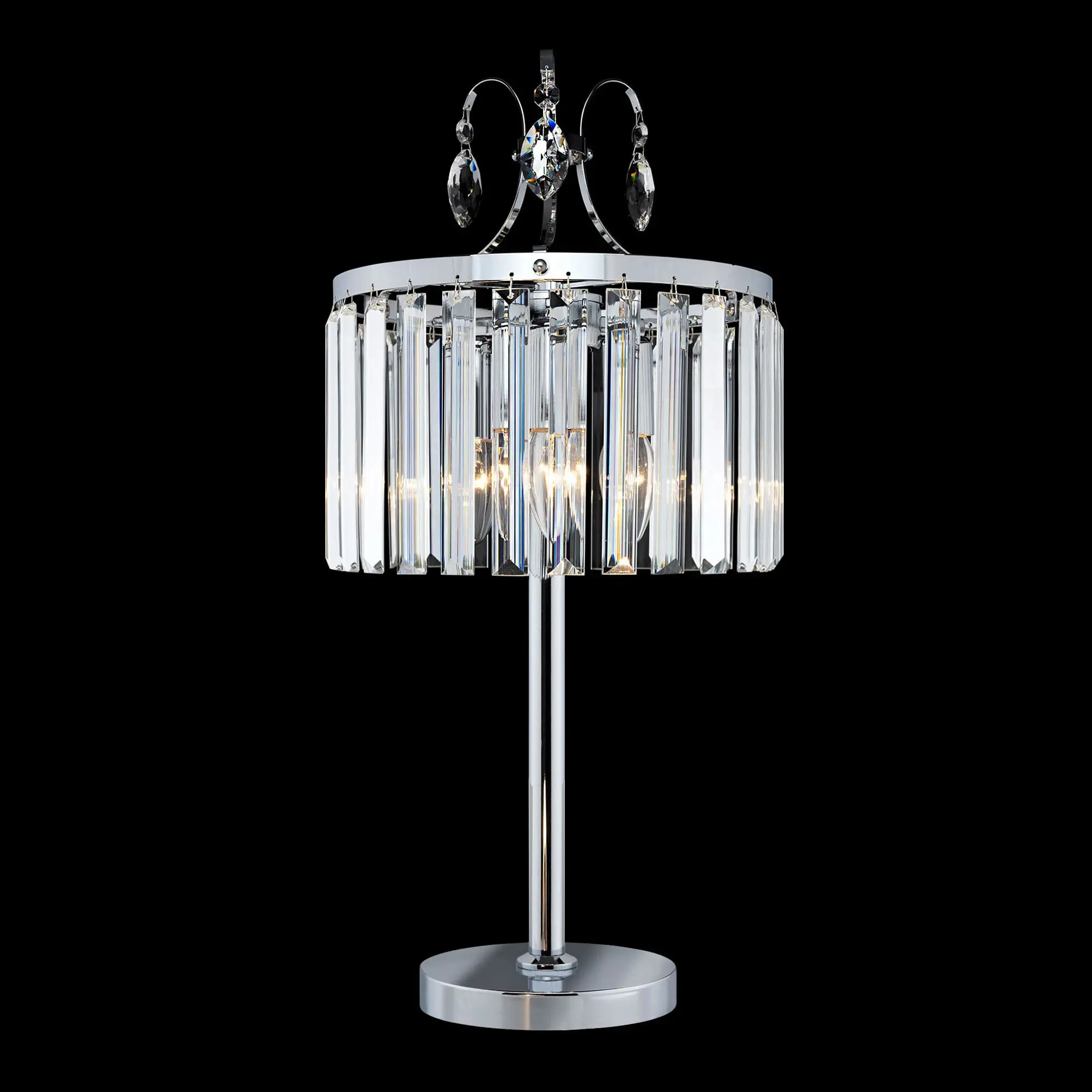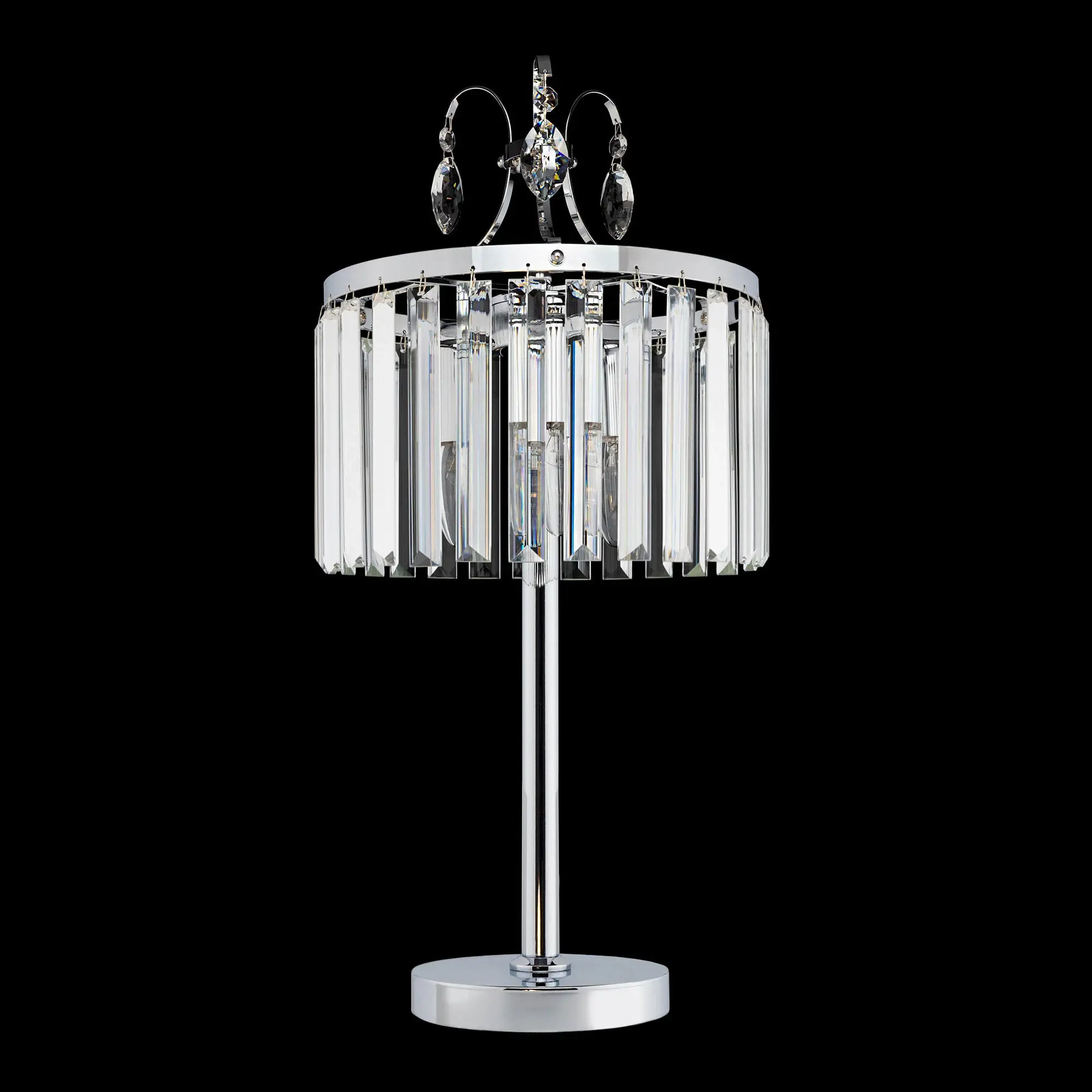 Настольная лампа Citilux Инга CL335831 с шикарными хрустальными подвесками. Корпус светильника металлический, цвет хром. В изделии используются 3 лампы с цоколем Е14, максимальной мощностью для ламп накаливания 60Вт (в комплект не входят, приобретаются отдельно). Высота светильника 56см, диаметр хрустального абажура 27см. Длина сетевого шнура 170см, выключатель находится на расстоянии 20см от основания. Светильник можно разместить на камине, столе или прикроватной тумбе. Он отлично подойдет для освещения зала, гостиной, столовой или кабинета, оформленных в классическом или современном стиле,