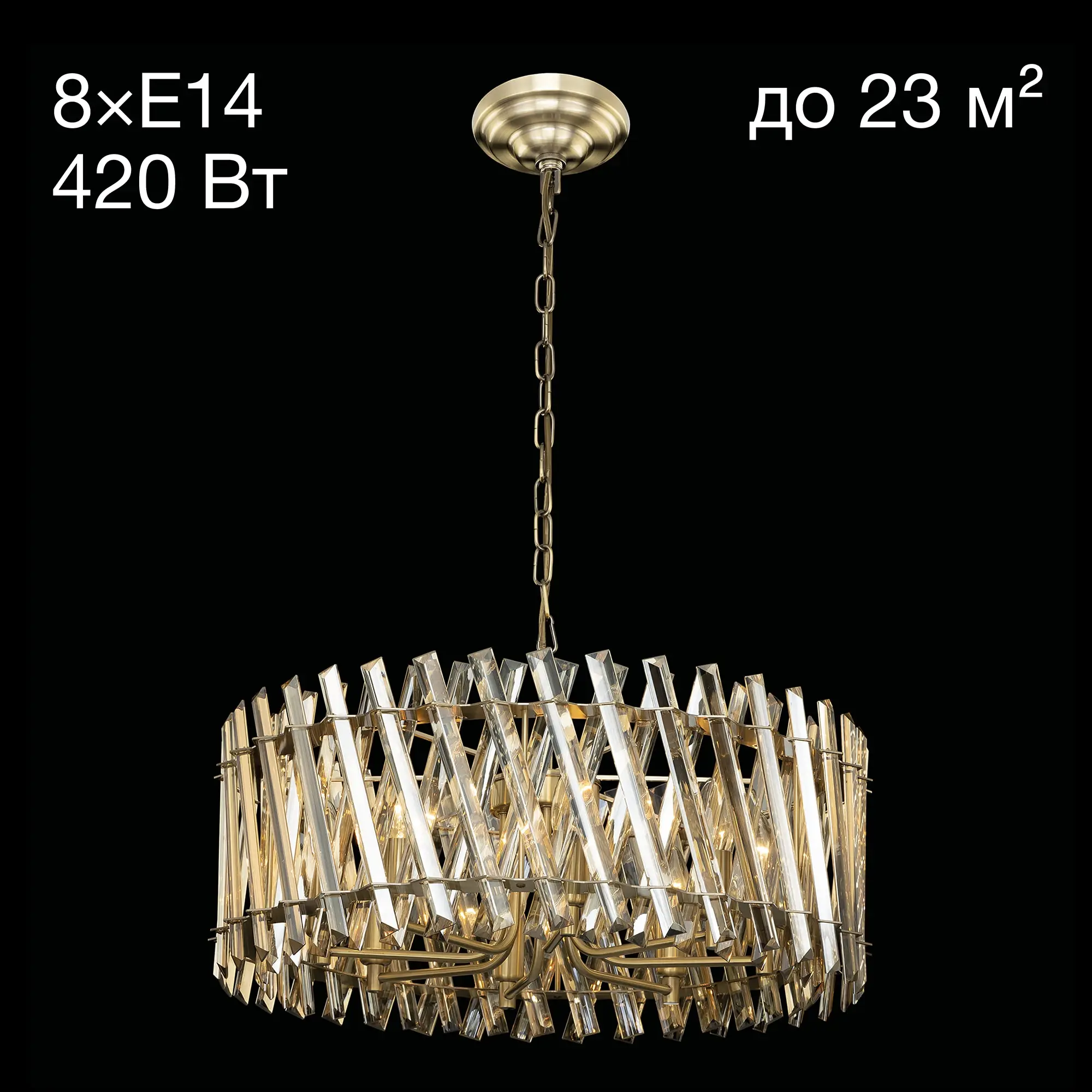 В изделии 8 ламп с цоколем Е14 максимальной мощностью для ламп накаливания 60Вт (в комплект не входят, приобретаются отдельно). Люстра подходит для общего и дополнительного освещения помещений как с высокими, так и с низкими потолками, длина цепи регулируется при установке, тип крепления – планка. Диаметр модели 60см, высота 45-110см, осветит до 23м².