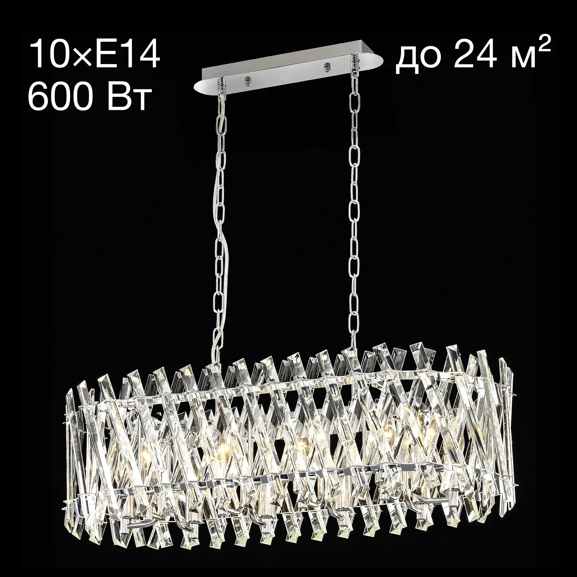 В изделии 10 ламп с цоколем Е14, максимальной мощностью для ламп накаливания 60Вт (в комплект не входят, приобретаются отдельно). Люстра подходит для общего и дополнительного освещения помещений как с высокими, так и с низкими потолками, длина цепи регулируется при установке, тип крепления – планка. Размеры модели - длина 81см, ширина 36см, высота 45-140см, осветит до 24м².