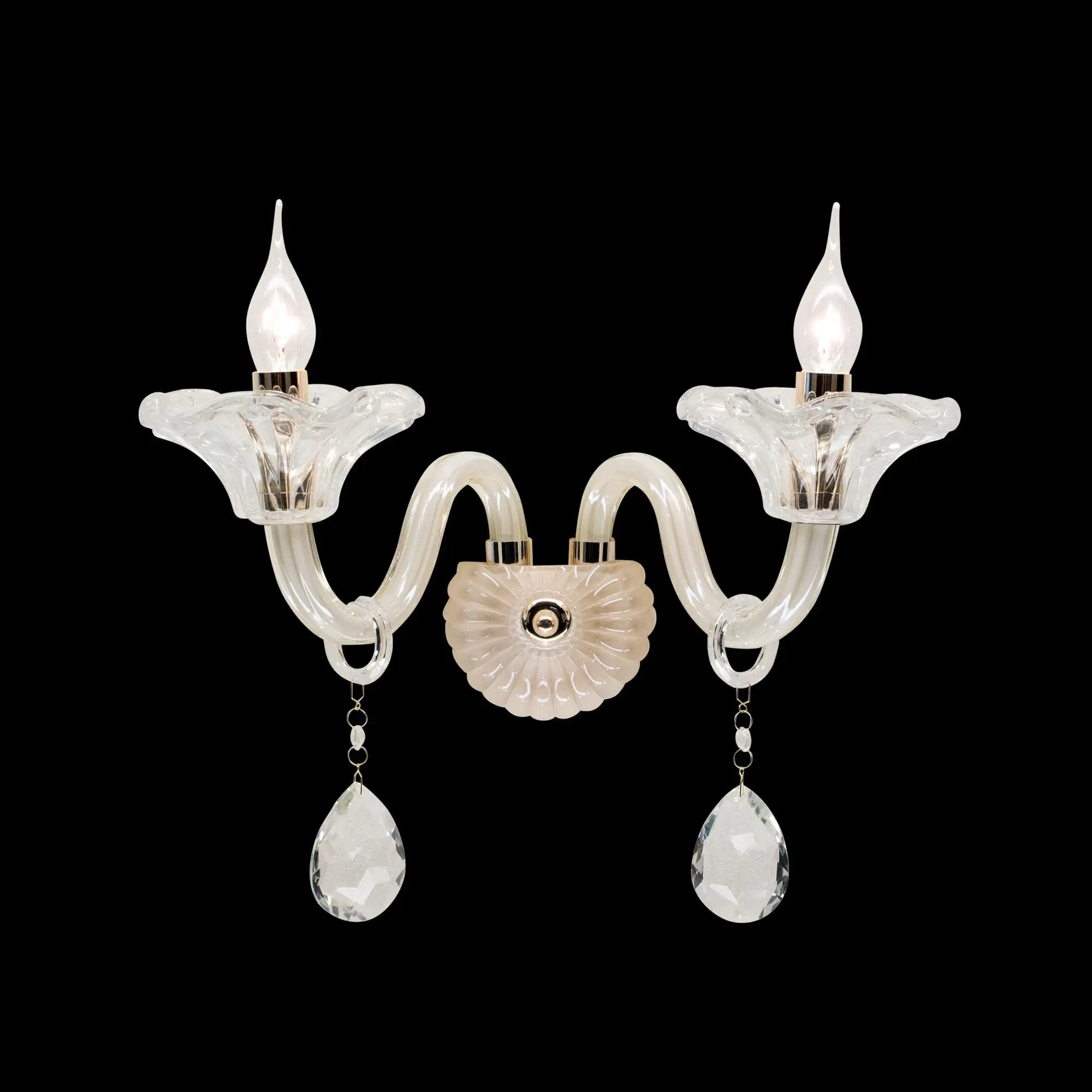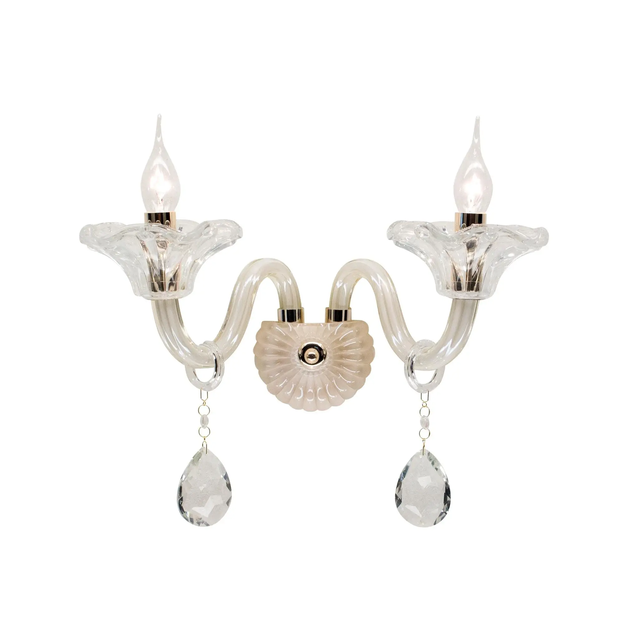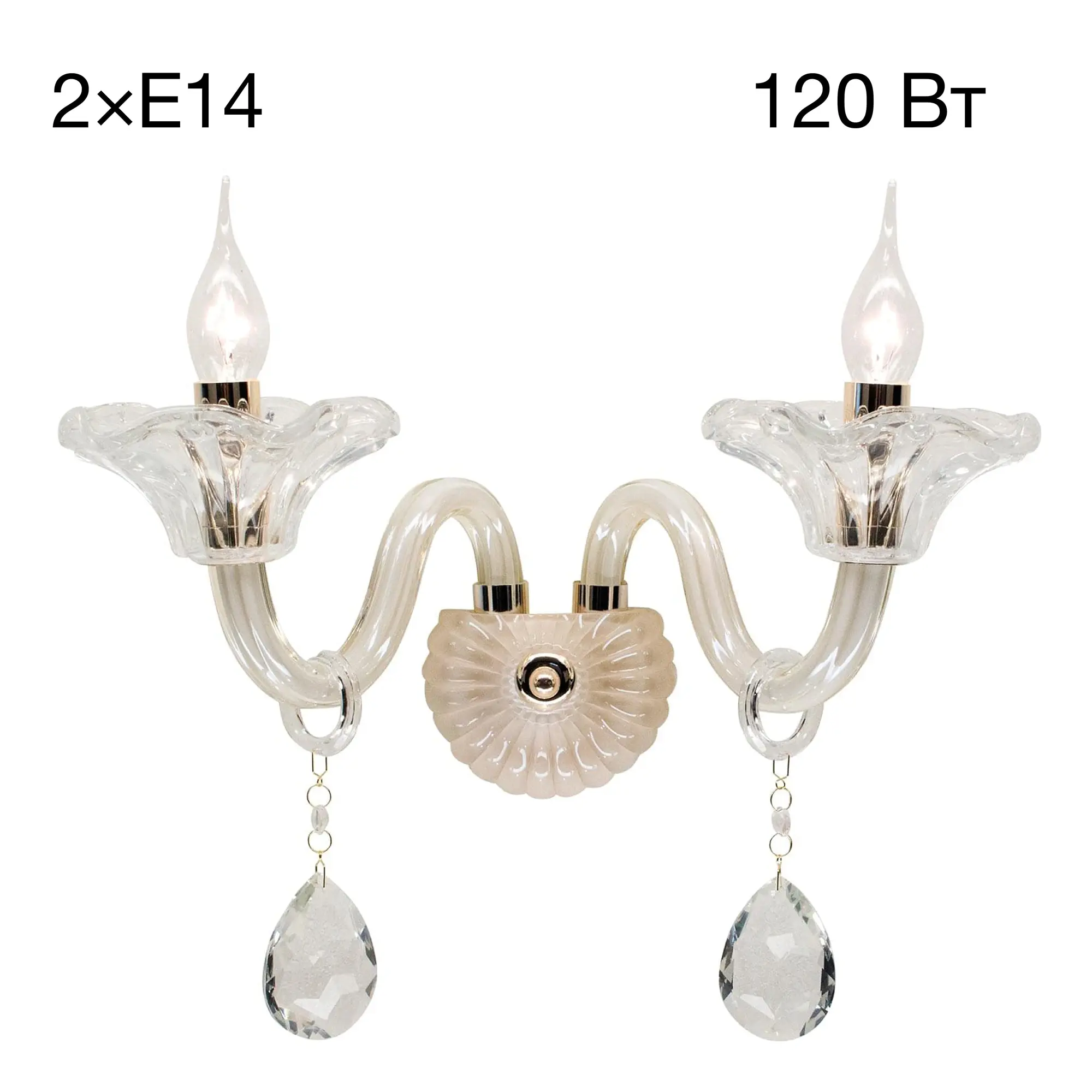 Стеклянное бра Citilux Irida CL351321 в неоклассическом стиле. Арматура — металлическая, с золотистым покрытием, корпус изготовлен из стекла оттенка шампань. Рожки с открытыми лампами напоминают старинные подсвечники. Внешний вид светильника дополняют изящные подвески из хрусталя в форме капли.