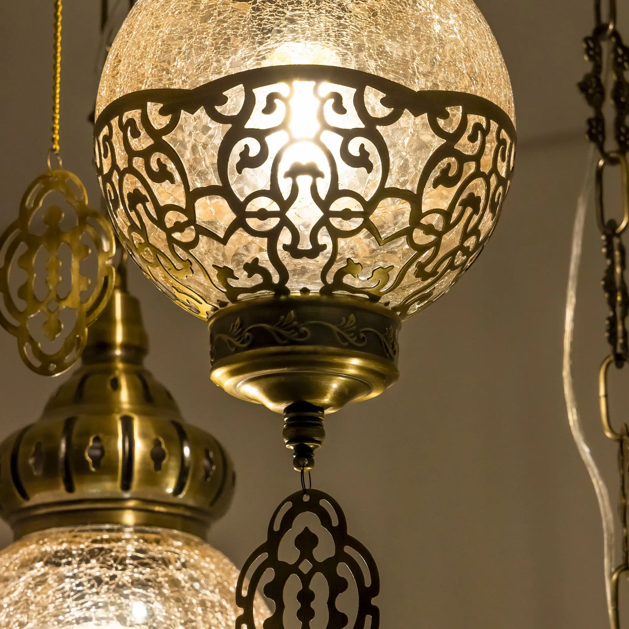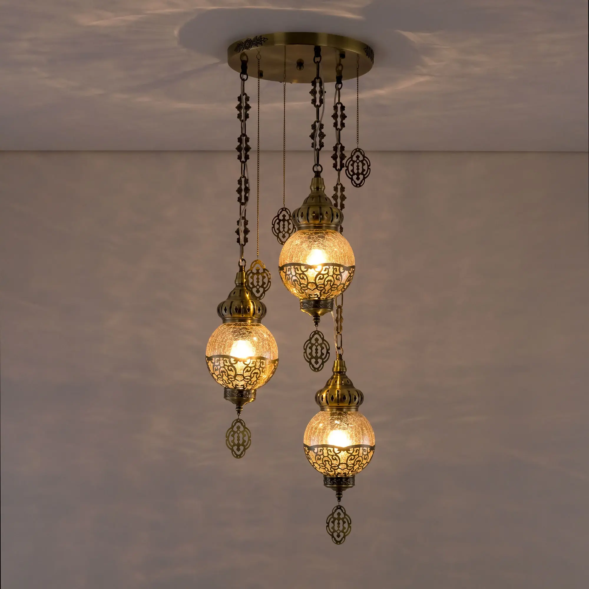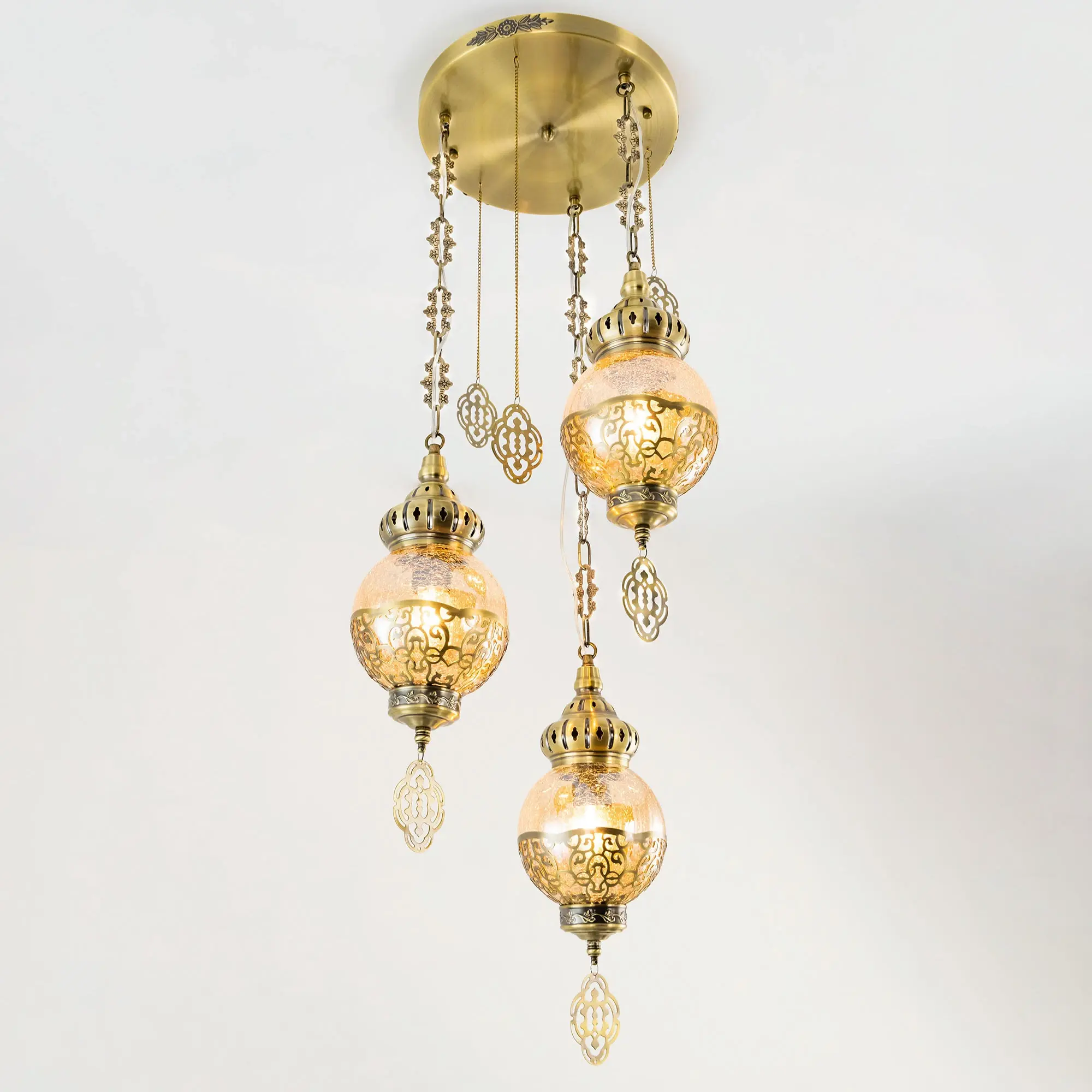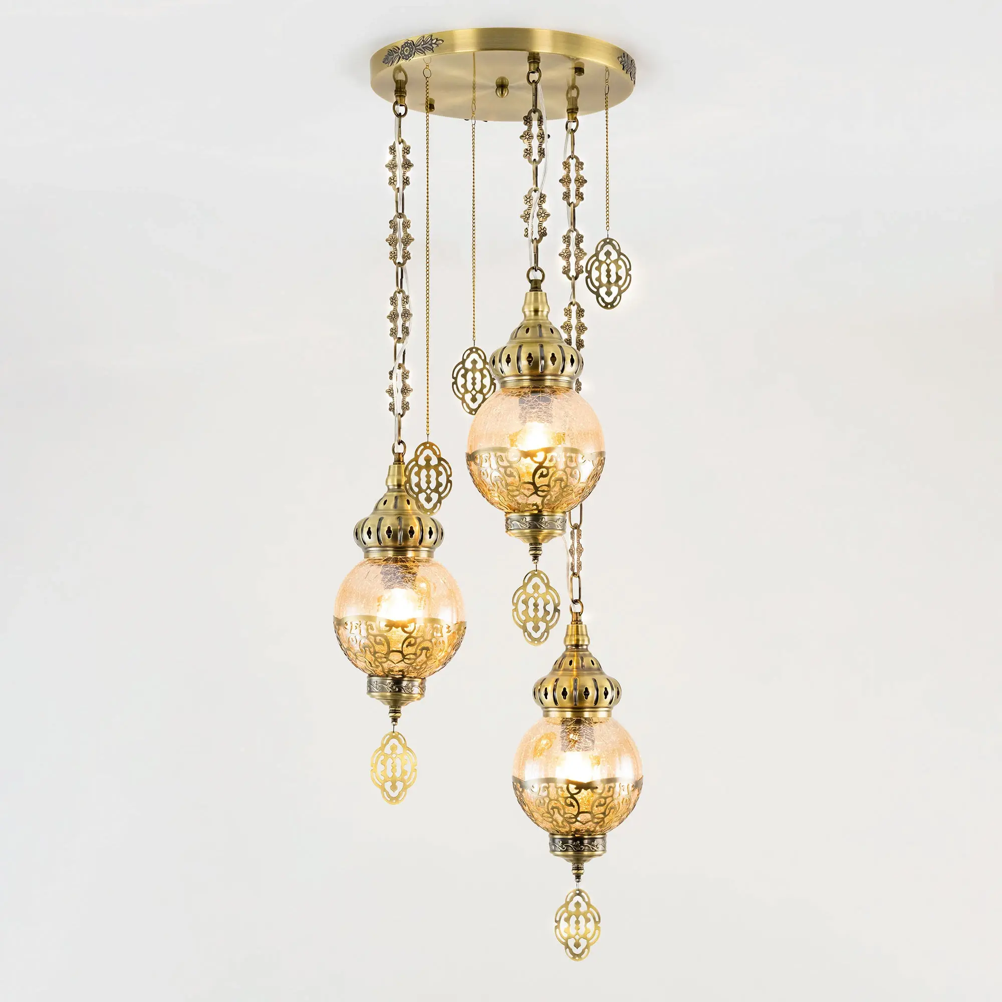 Восточный каскадный светильник Citilux Каир CL419133 с тремя подвесными плафонами. Корпус металлический, цвет бронза. Плафоны в форме шара, изготовлены из прозрачного стекла медового оттенка, украшены декоративными, ажурными элементами. В изделии используются лампы с цоколем Е27, максимальной мощностью для ламп накаливания 75Вт. Светодиодные лампы можно устанавливать более яркие. Модель подходит для всех типов потолков, в том числе натяжных. Тип крепления – планка. Светильник Каир CL419133 прекрасный вариант для атмосферного освещения интерьеров квартир и загородных домов, выполненных в восточном стиле. Это великолепное решение при оформления уютных кафе, баров и ресторанов,