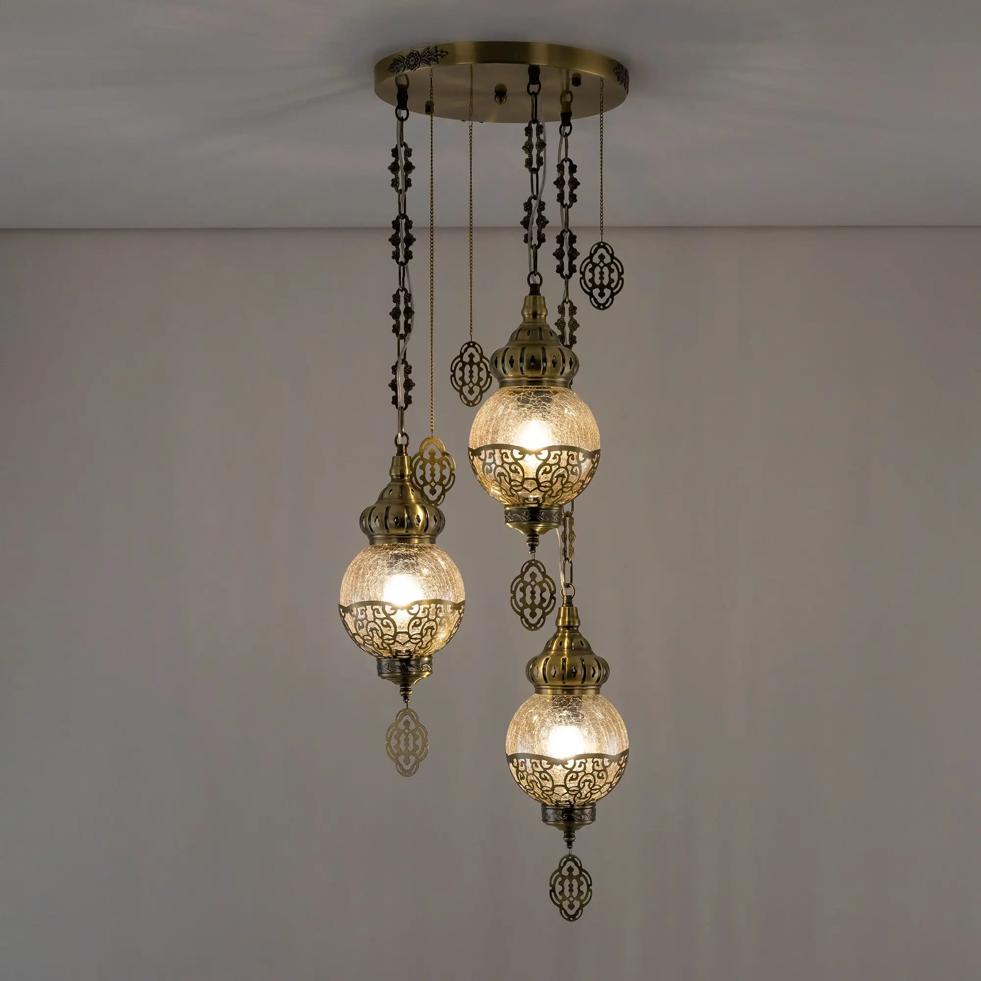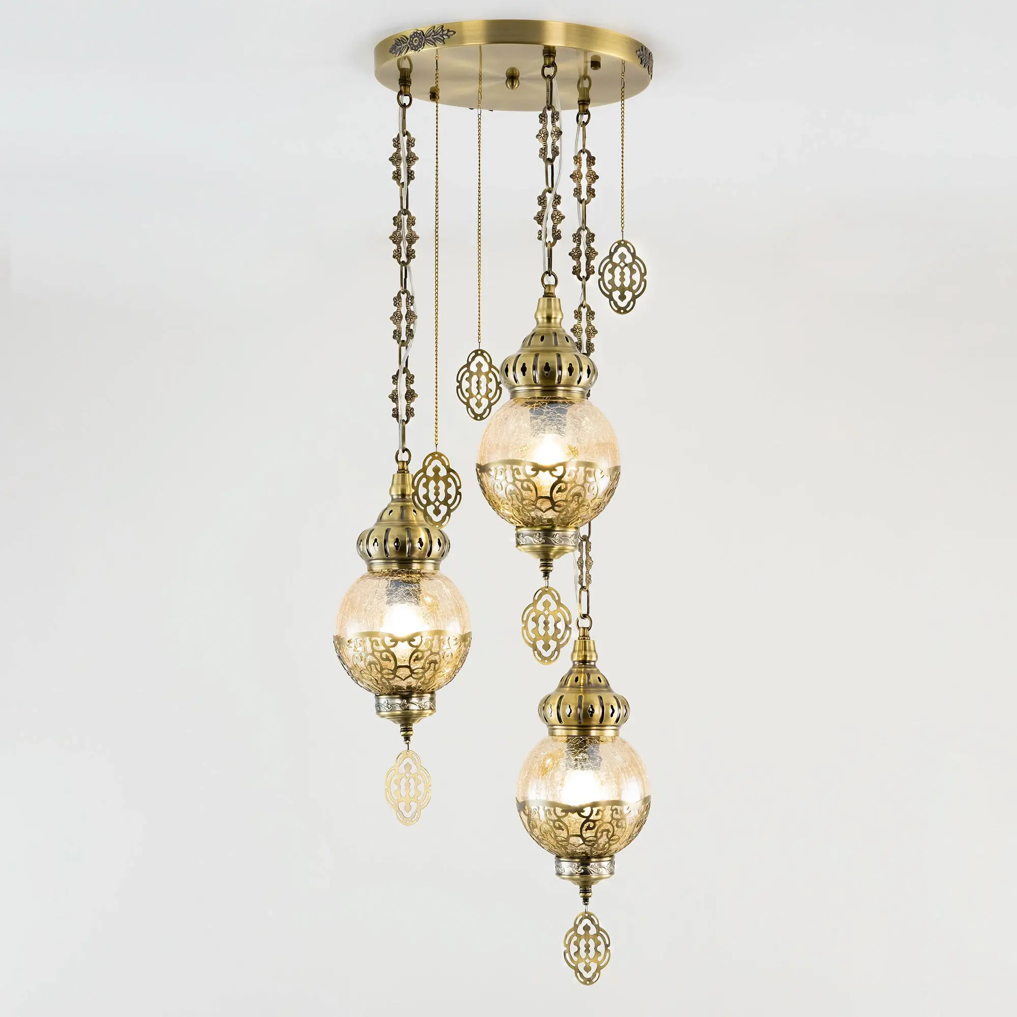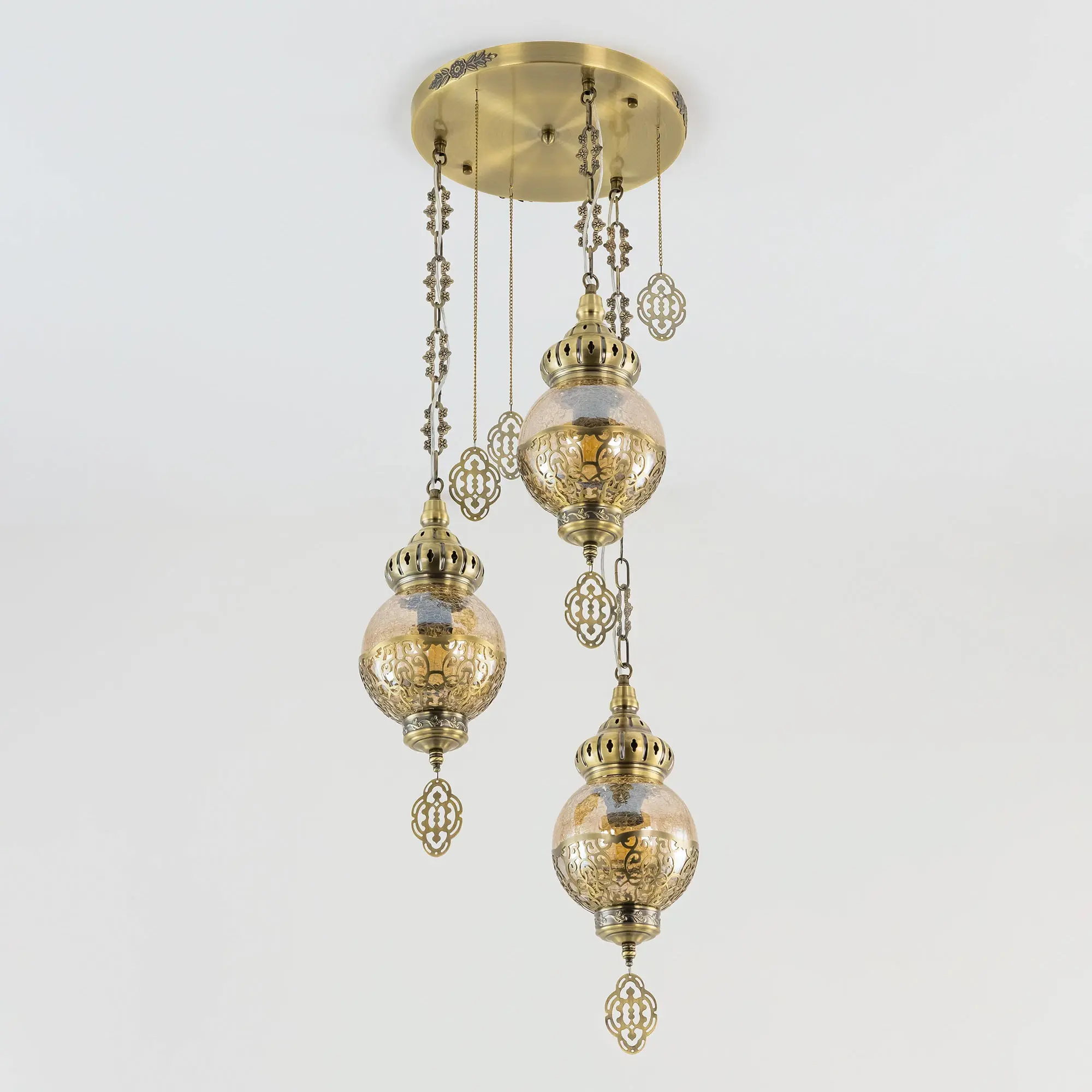 Восточный каскадный светильник Citilux Каир CL419133 с тремя подвесными плафонами. Корпус металлический, цвет бронза. Плафоны в форме шара, изготовлены из прозрачного стекла медового оттенка, украшены декоративными, ажурными элементами. В изделии используются лампы с цоколем Е27, максимальной мощностью для ламп накаливания 75Вт. Светодиодные лампы можно устанавливать более яркие. Модель подходит для всех типов потолков, в том числе натяжных. Тип крепления – планка. Светильник Каир CL419133 прекрасный вариант для атмосферного освещения интерьеров квартир и загородных домов, выполненных в восточном стиле. Это великолепное решение при оформления уютных кафе, баров и ресторанов.,