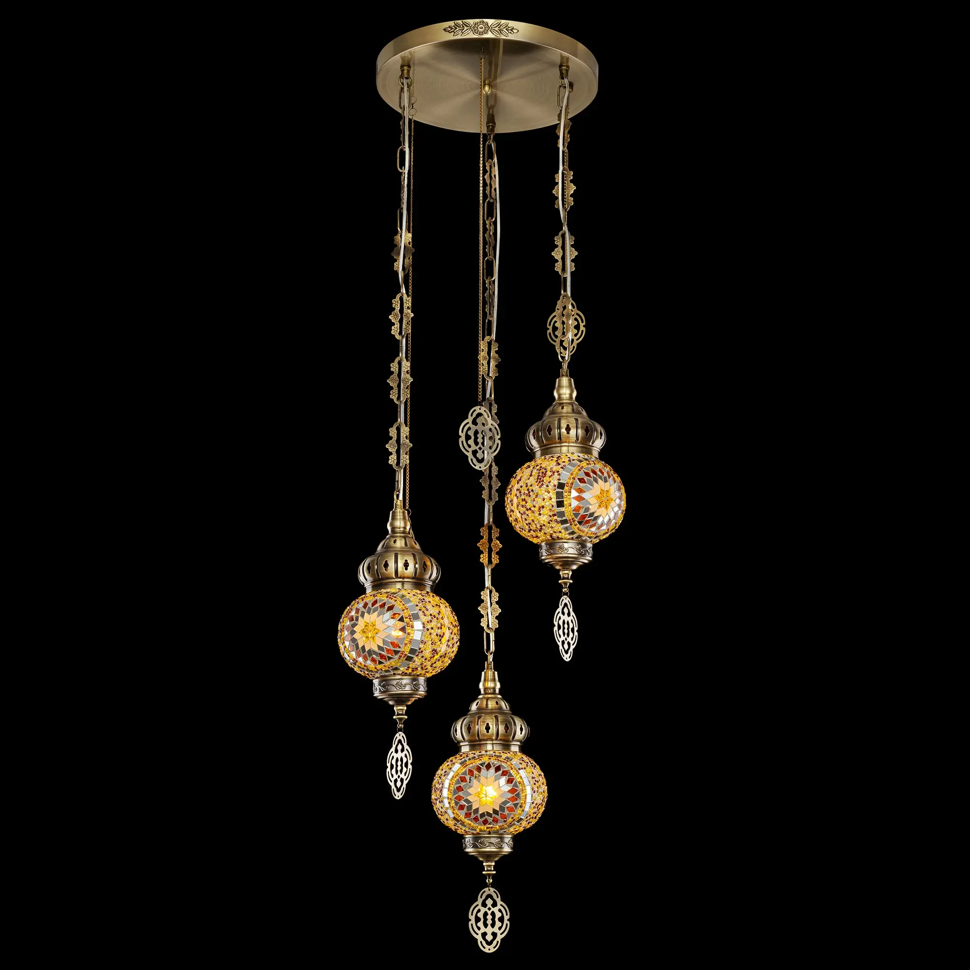 Три подвесных плафона выполненных в форме слегка приплюснутых шаров, словно капли меда, застывшие в воздухе. Стеклянная мозаика в оттенках янтаря наполняет пространство теплым, уютным свечением. Металлический каркас благородного бронзового цвета украшен искусной чеканкой.