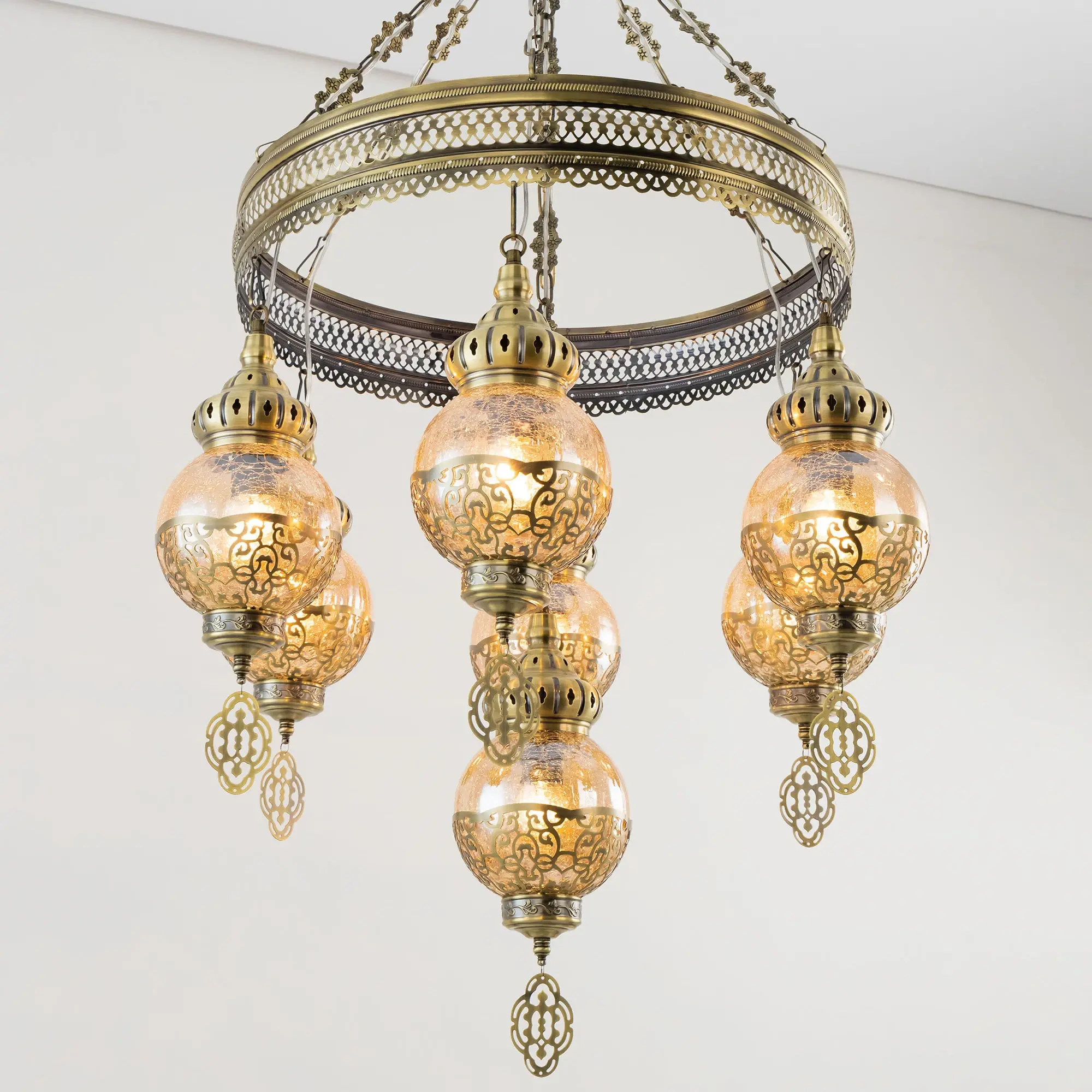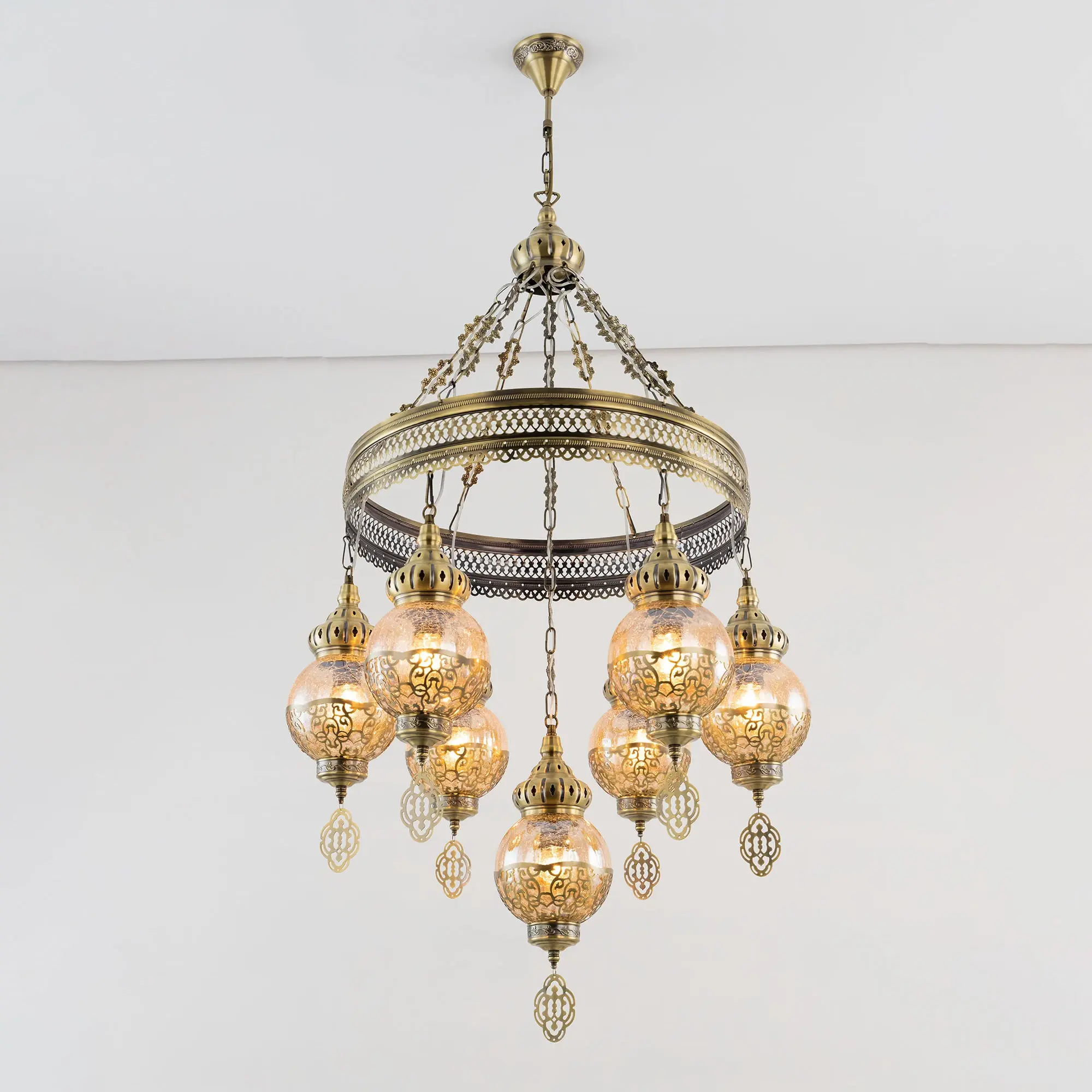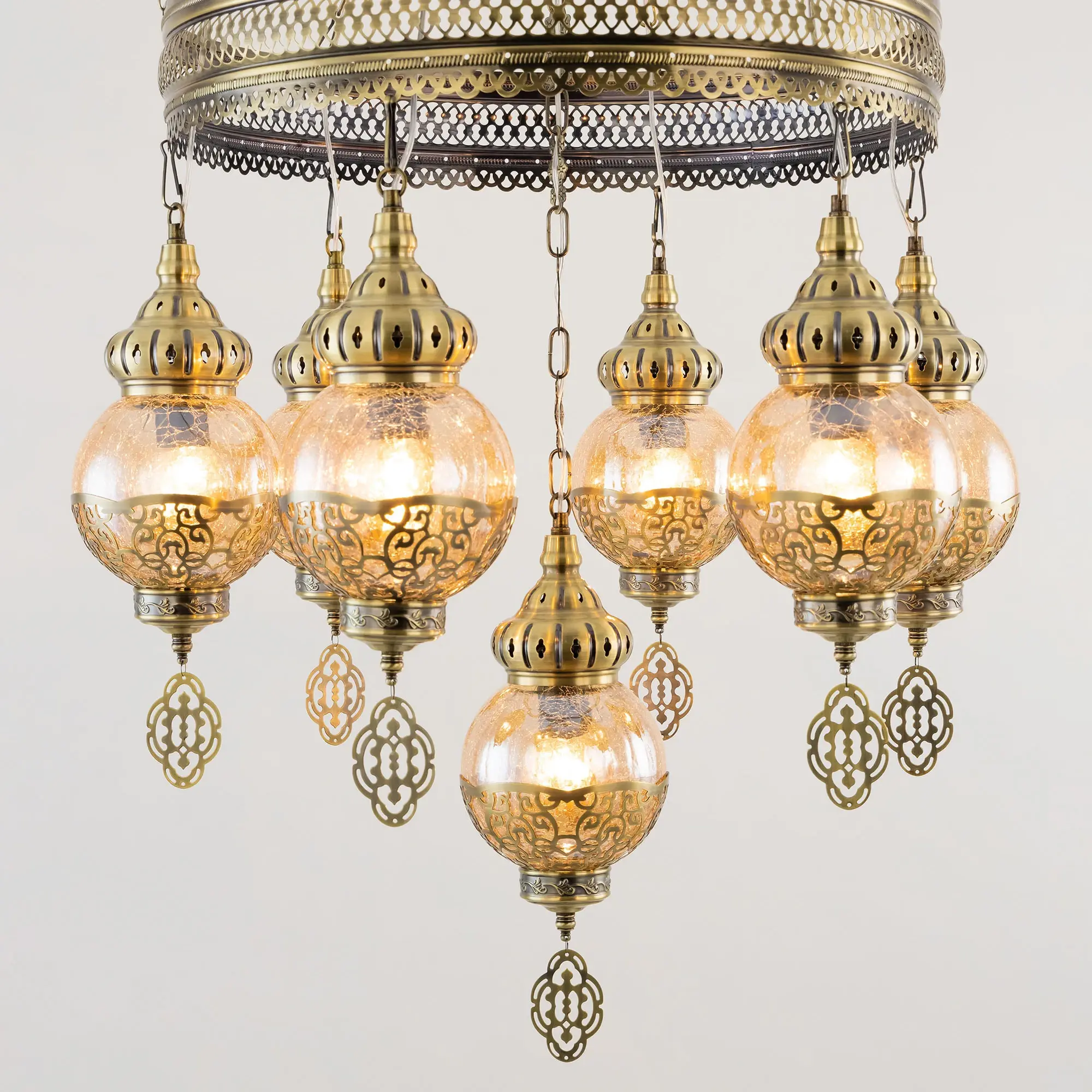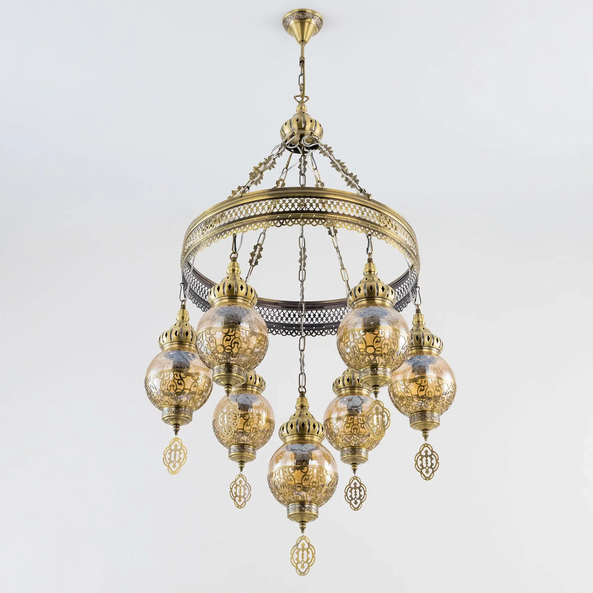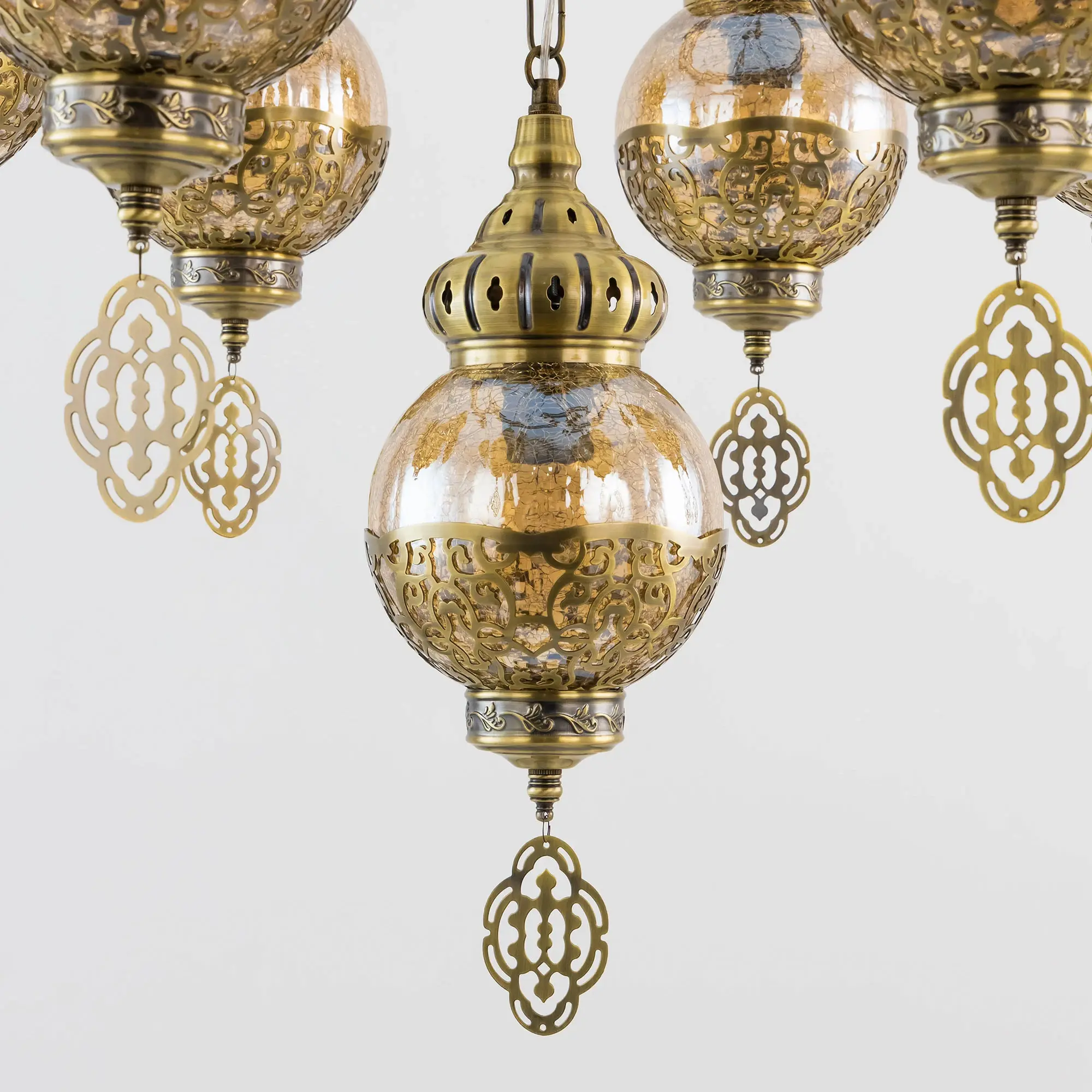 Восточная каскадная люстра Citilux Каир CL419163 с семью подвесными плафонами. Каркас металлический, цвет бронза. Плафоны в форме шара, изготовлены из прозрачного стекла медового оттенка, украшены декоративными, ажурными элементами. В изделии используются лампы с цоколем Е27, максимальной мощностью для ламп накаливания 75Вт. Светодиодные лампы можно устанавливать более яркие. Модель подходит для всех типов потолков, в том числе натяжных. Тип крепления – крючок. Люстра Каир CL419163 прекрасный вариант для атмосферного освещения интерьеров квартир и загородных домов, выполненных в восточном стиле. Это великолепное решение при оформления уютных кафе, баров и ресторанов.,
