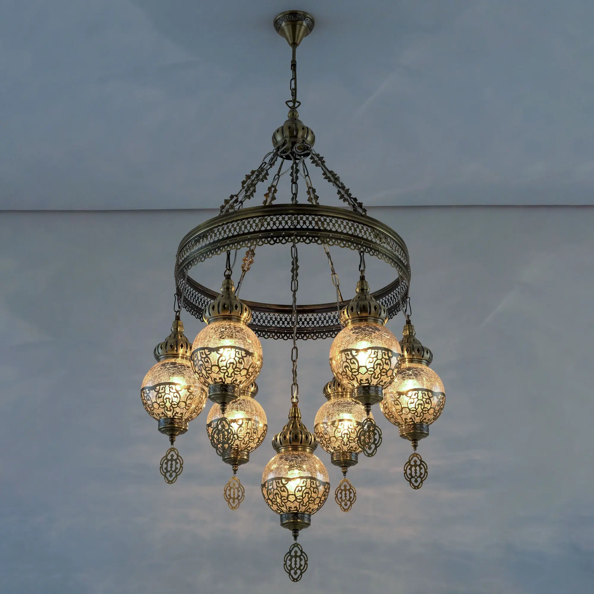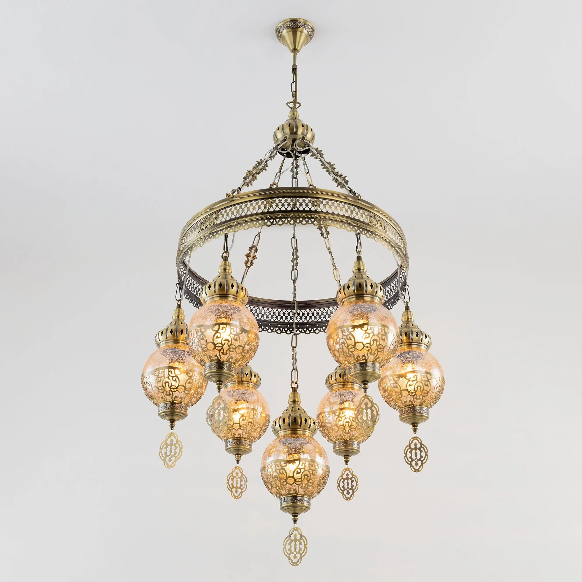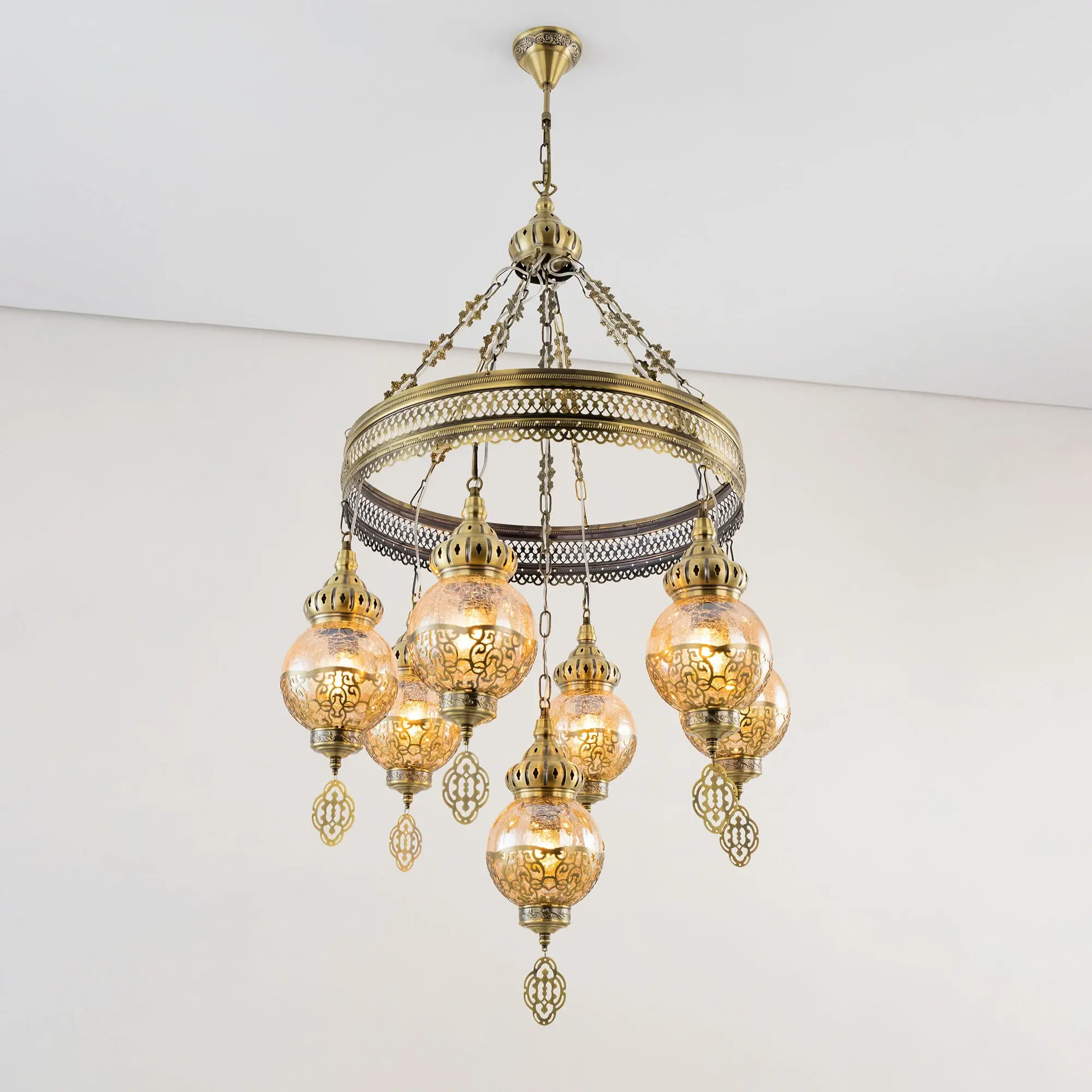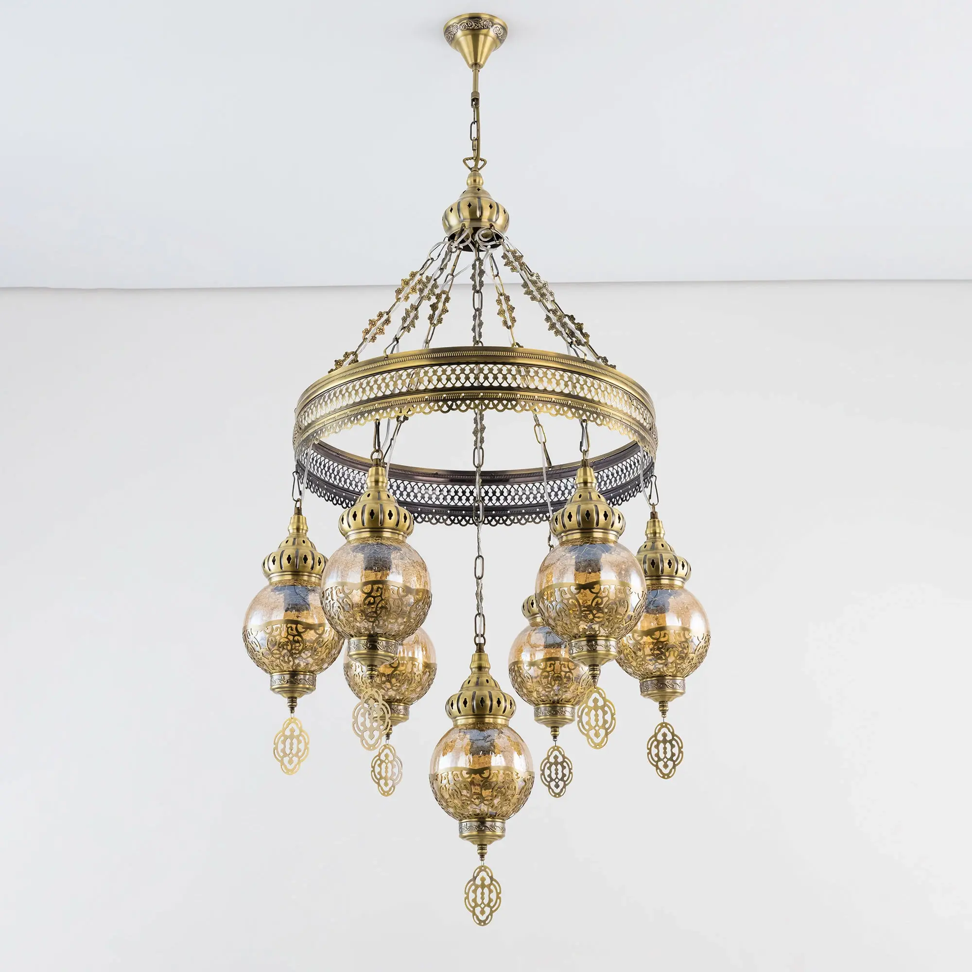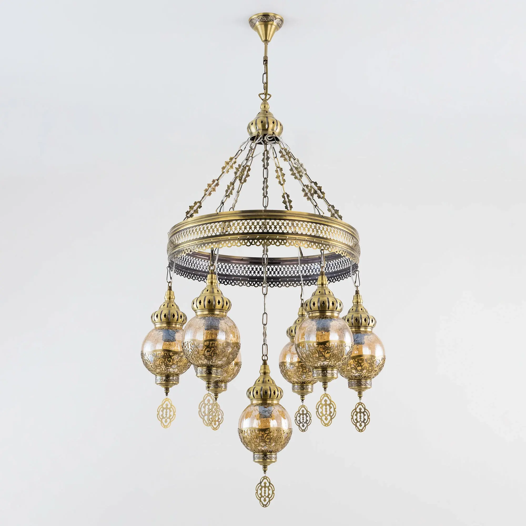 Восточная каскадная люстра Citilux Каир CL419163 с семью подвесными плафонами. Каркас металлический, цвет бронза. Плафоны в форме шара, изготовлены из прозрачного стекла медового оттенка, украшены декоративными, ажурными элементами. В изделии используются лампы с цоколем Е27, максимальной мощностью для ламп накаливания 75Вт. Светодиодные лампы можно устанавливать более яркие. Модель подходит для всех типов потолков, в том числе натяжных. Тип крепления – крючок. Люстра Каир CL419163 прекрасный вариант для атмосферного освещения интерьеров квартир и загородных домов, выполненных в восточном стиле. Это великолепное решение при оформления уютных кафе, баров и ресторанов.,