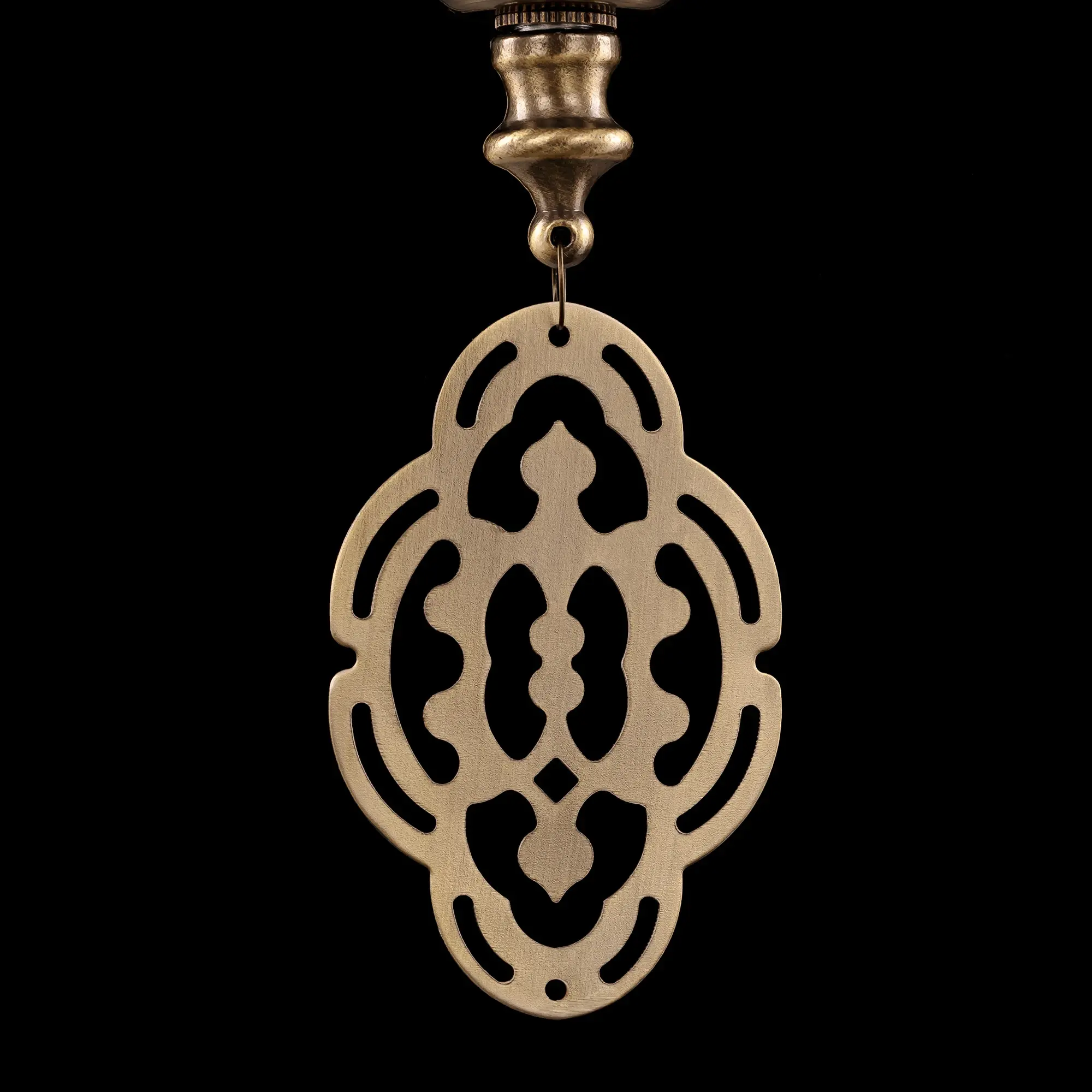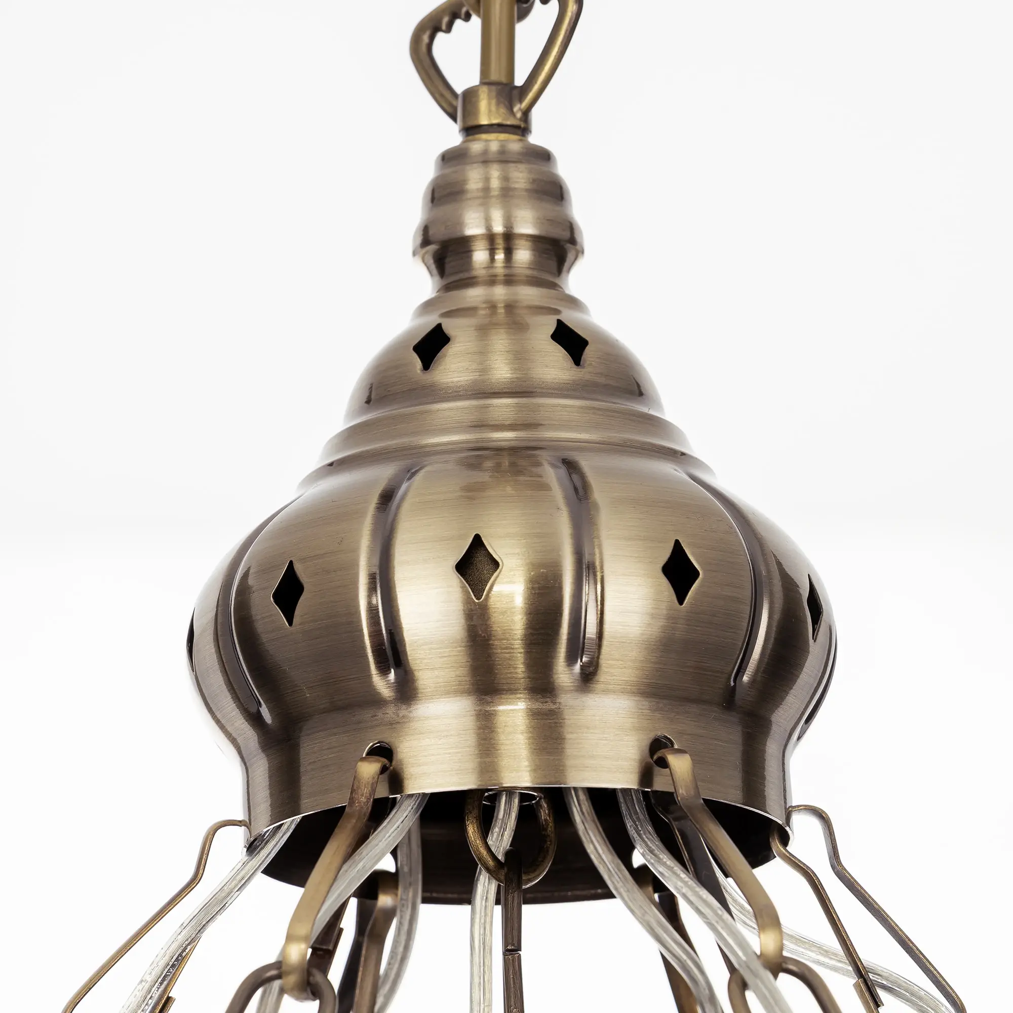 Семь подвесных плафонов, выполненных в форме слегка приплюснутых шаров, словно капли меда, застывшие в воздухе. Стеклянная мозаика в оттенках янтаря наполняет пространство теплым, уютным свечением. Металлический каркас благородного бронзового цвета декорирован искусной чеканкой.