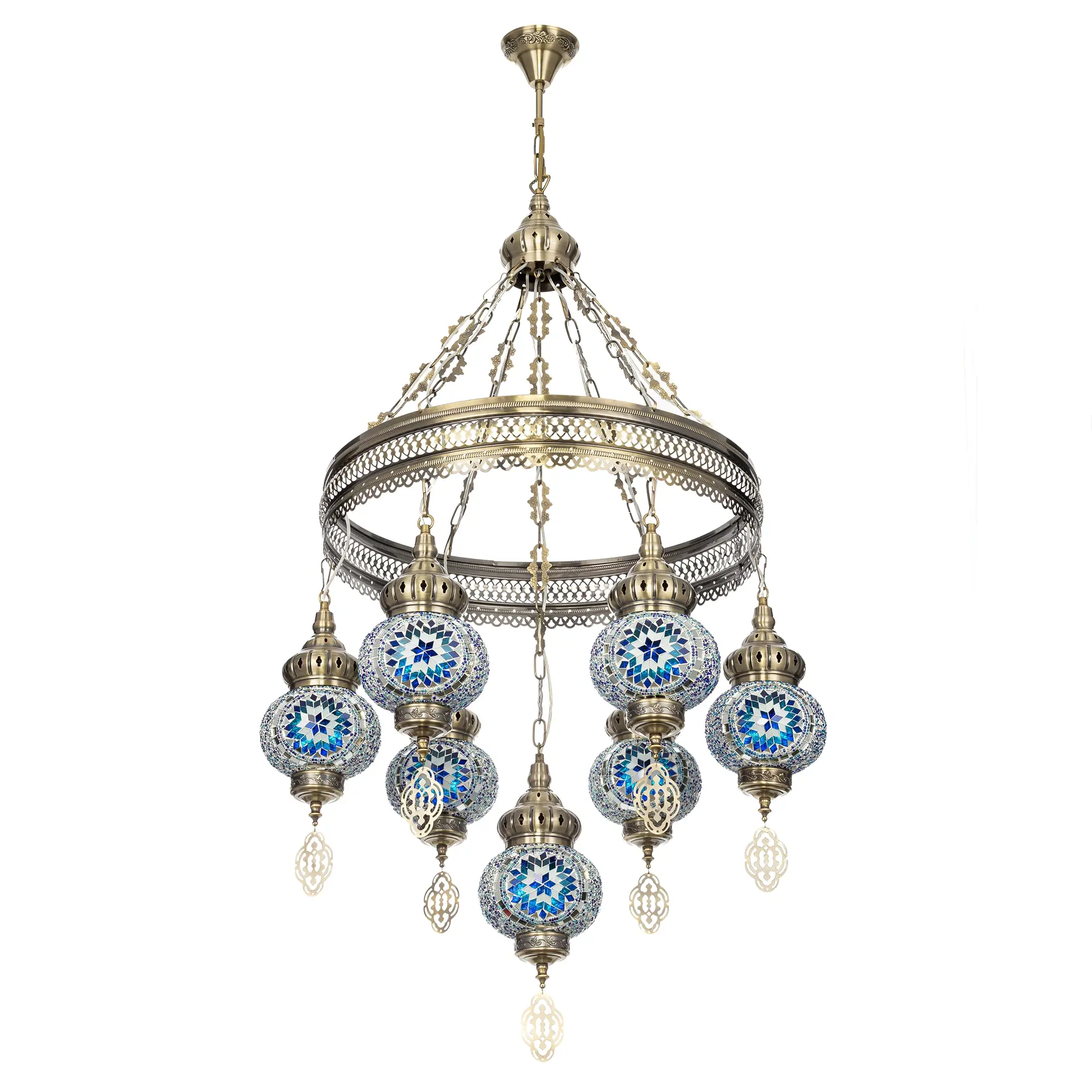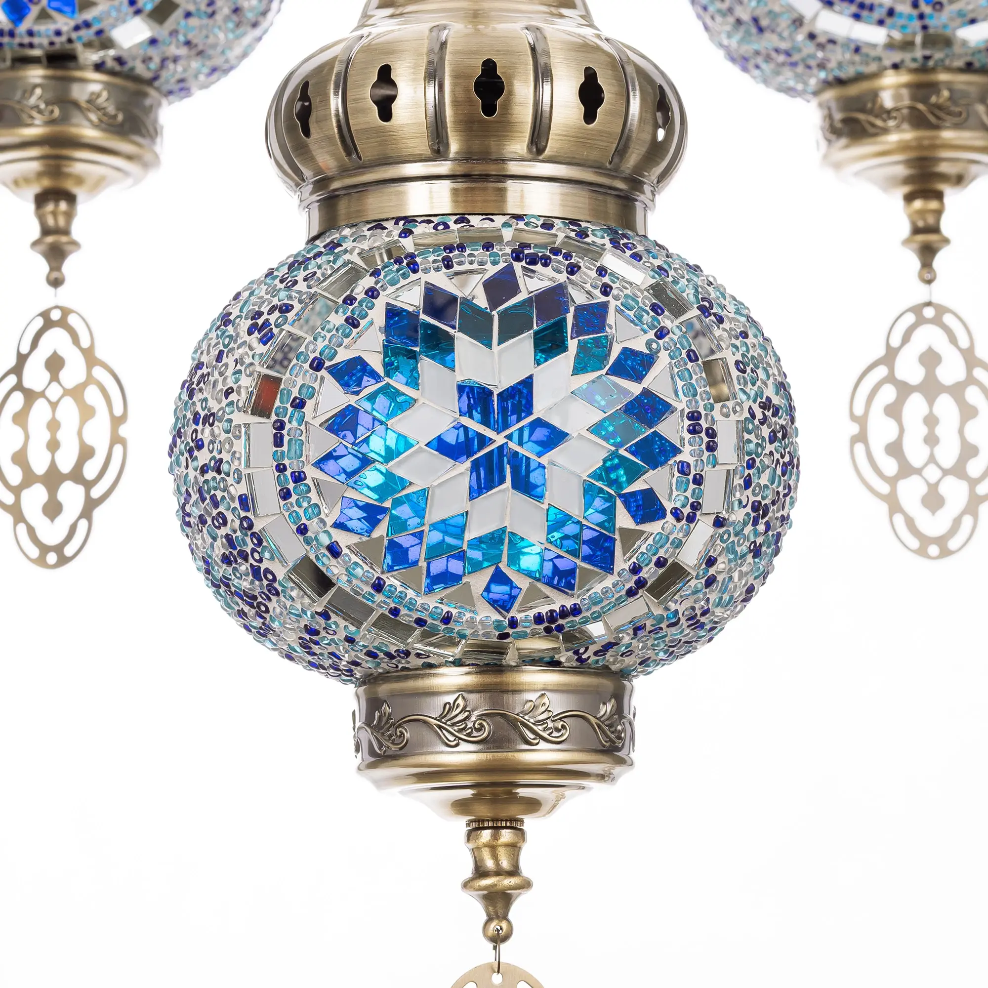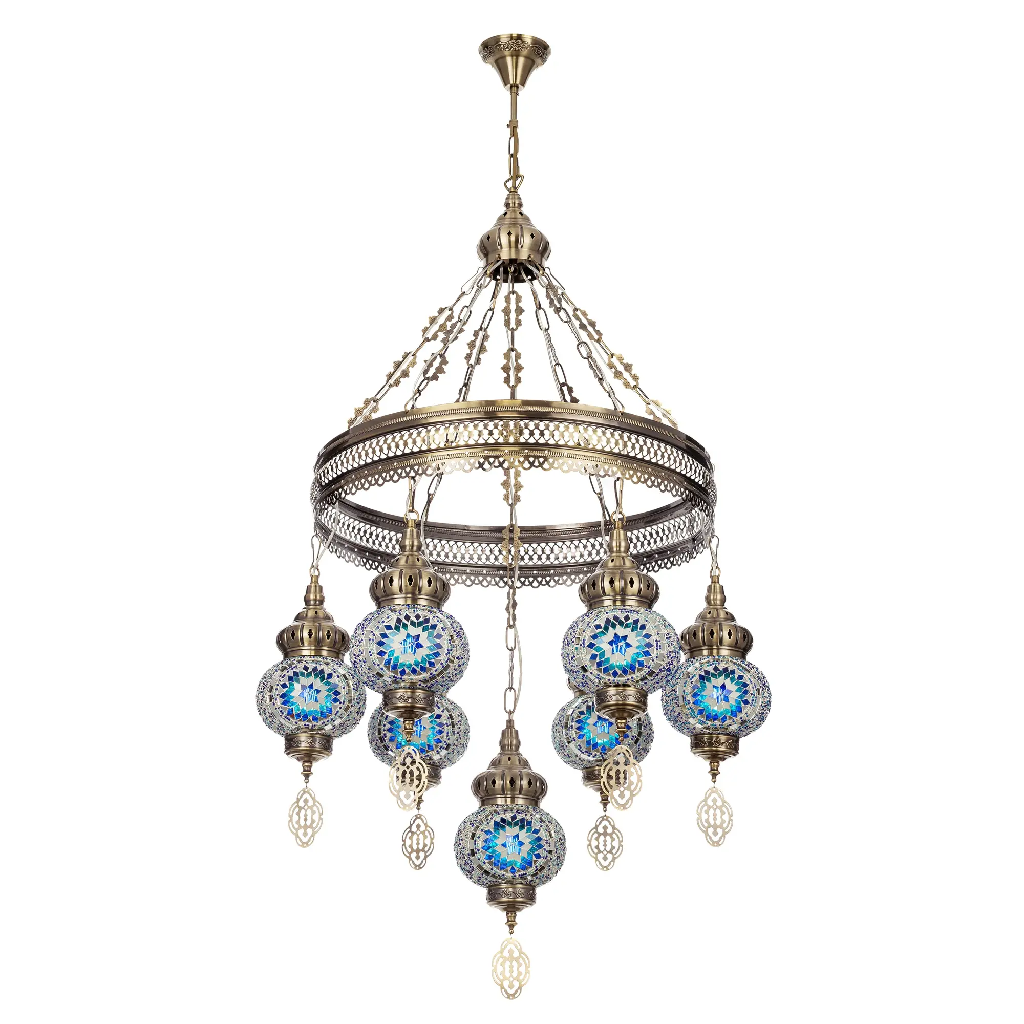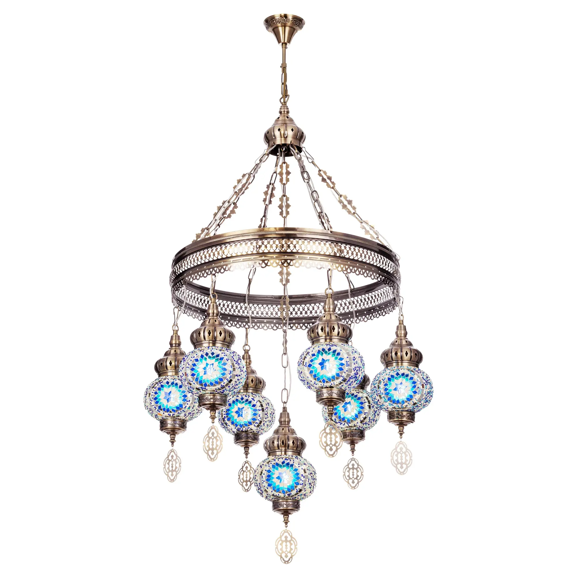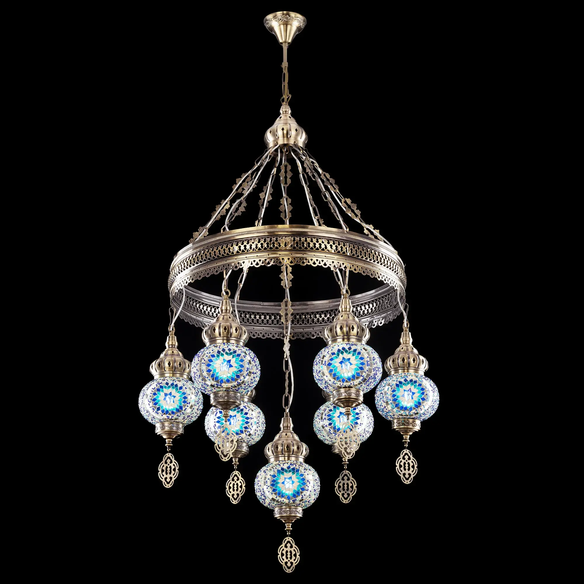 Семь подвесных плафонов, выполненных в форме слегка приплюснутых шаров, украшены мозаикой в сине-голубых оттенках. Это наполняет пространство чувством свежести и гармонии. Металлический каркас благородного бронзового цвета декорирован искусной чеканкой.