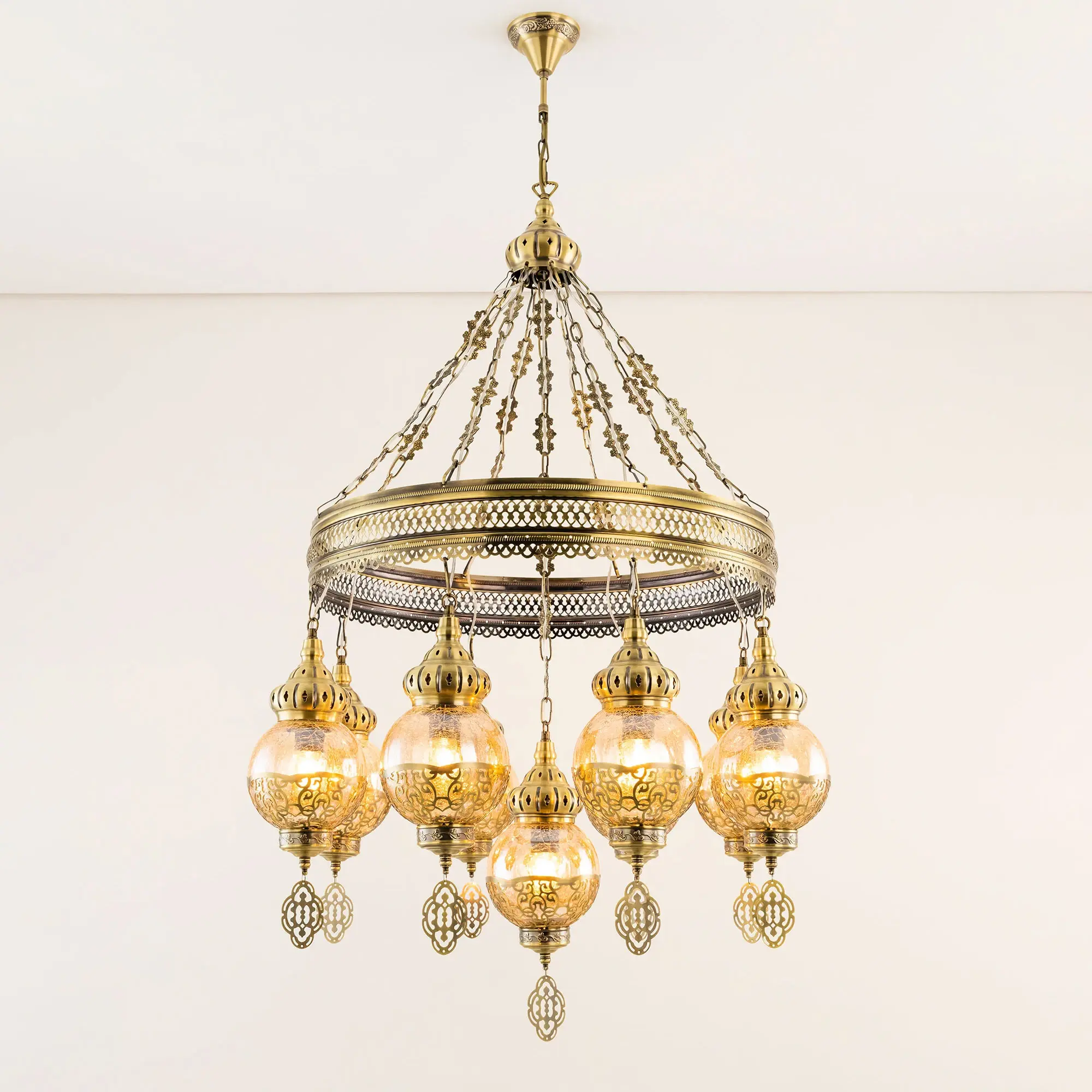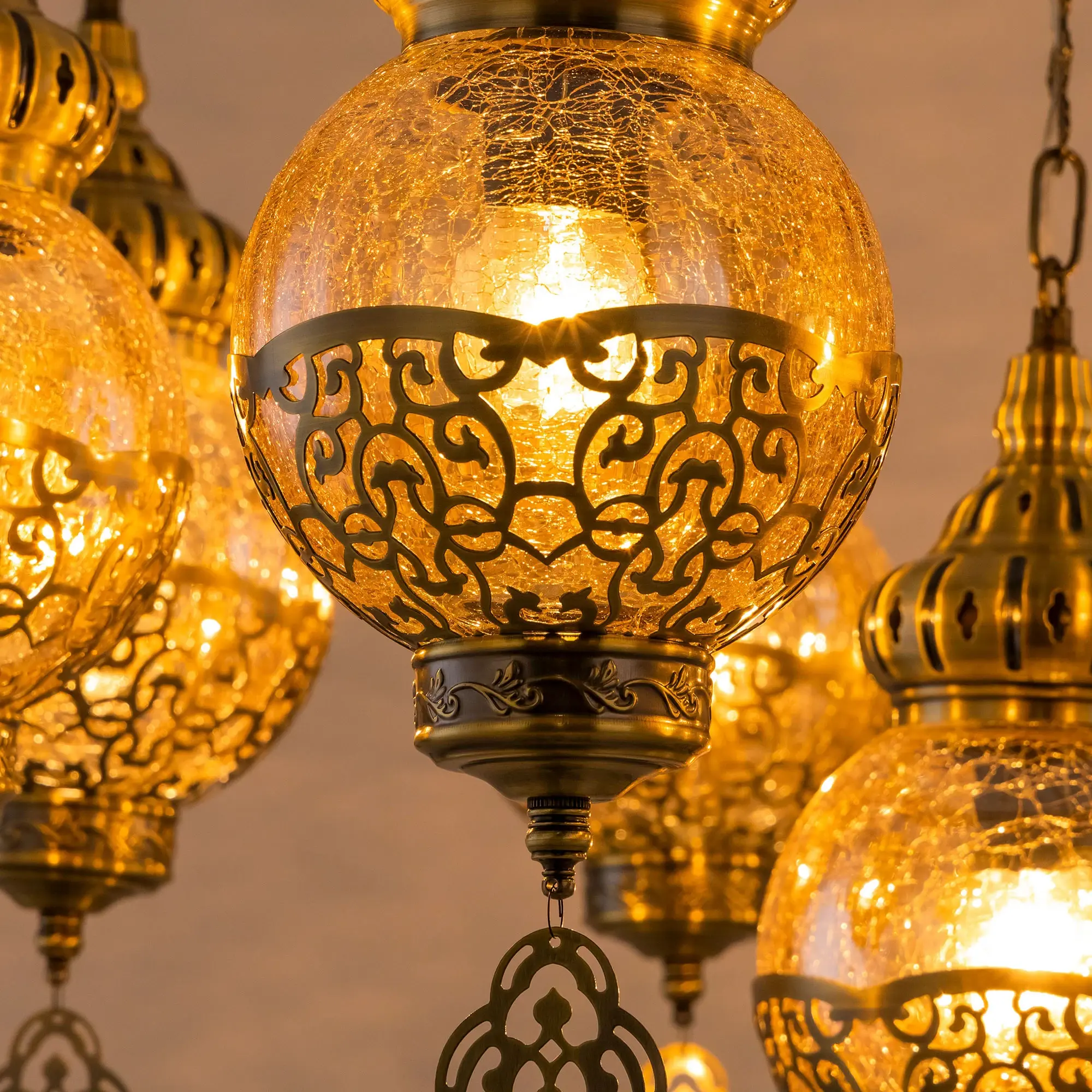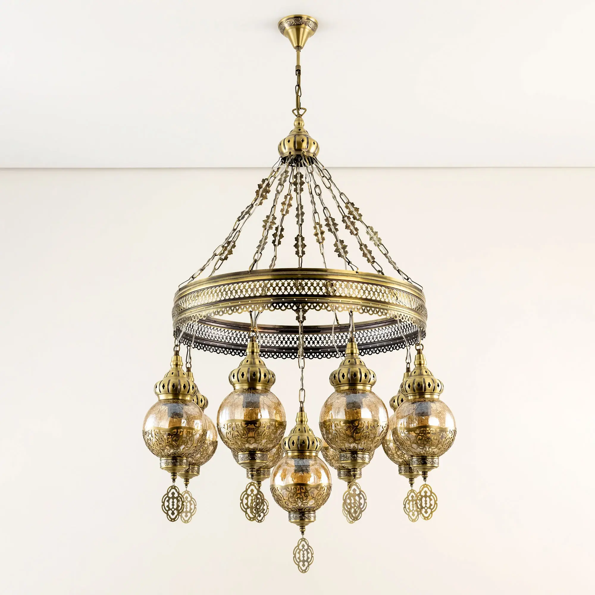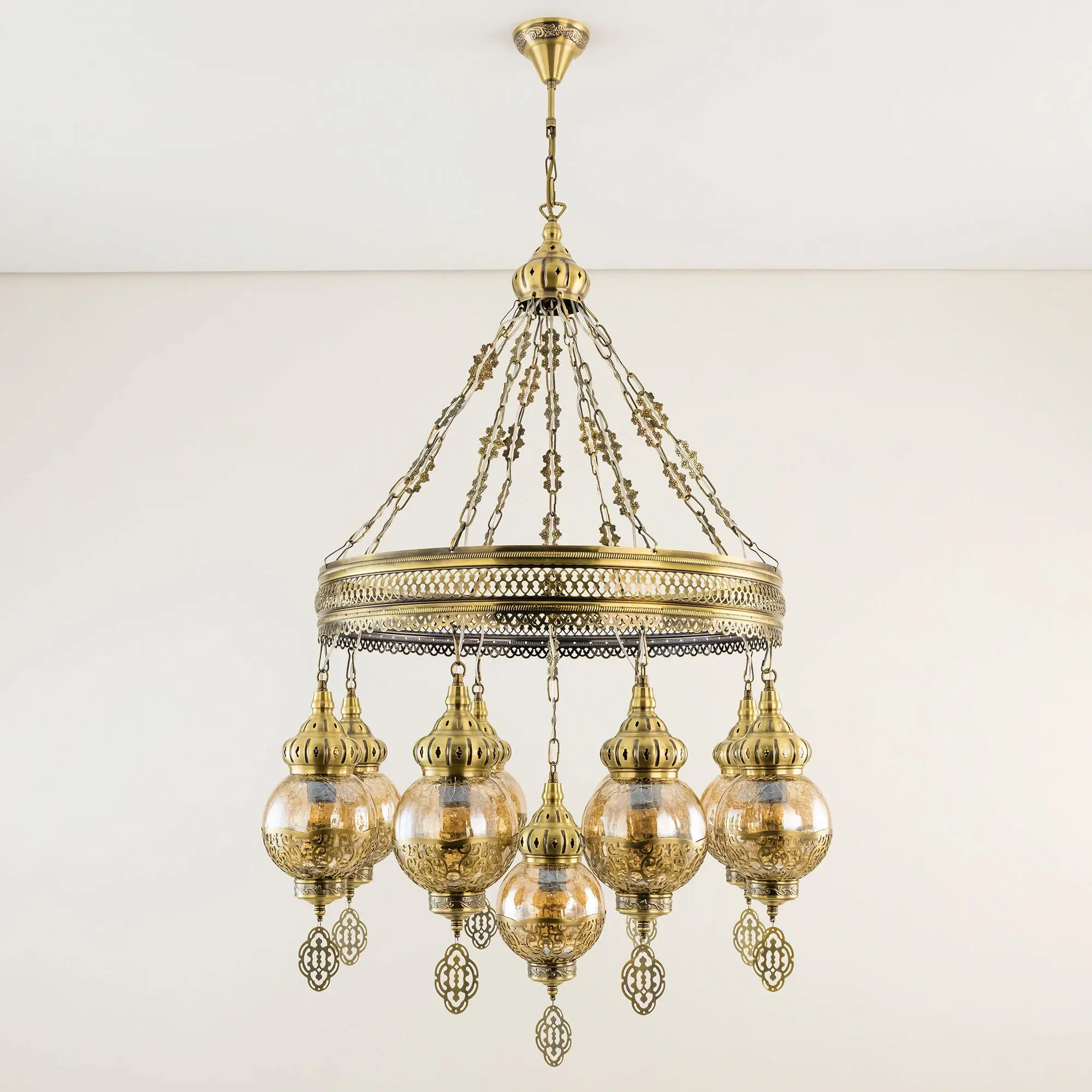 Восточная каскадная люстра Citilux Каир CL419183 с девятью подвесными плафонами. Каркас металлический, цвет бронза. Плафоны в форме шара, изготовлены из прозрачного стекла медового оттенка, украшены декоративными, ажурными элементами. В изделии используются лампы с цоколем Е27, максимальной мощностью для ламп накаливания 75Вт. Светодиодные лампы можно устанавливать более яркие. Модель подходит для всех типов потолков, в том числе натяжных. Тип крепления – крючок. Люстра Каир CL419183 прекрасный вариант для атмосферного освещения интерьеров квартир и загородных домов, выполненных в восточном стиле. Это великолепное решение при оформления уютных кафе, баров и ресторанов.