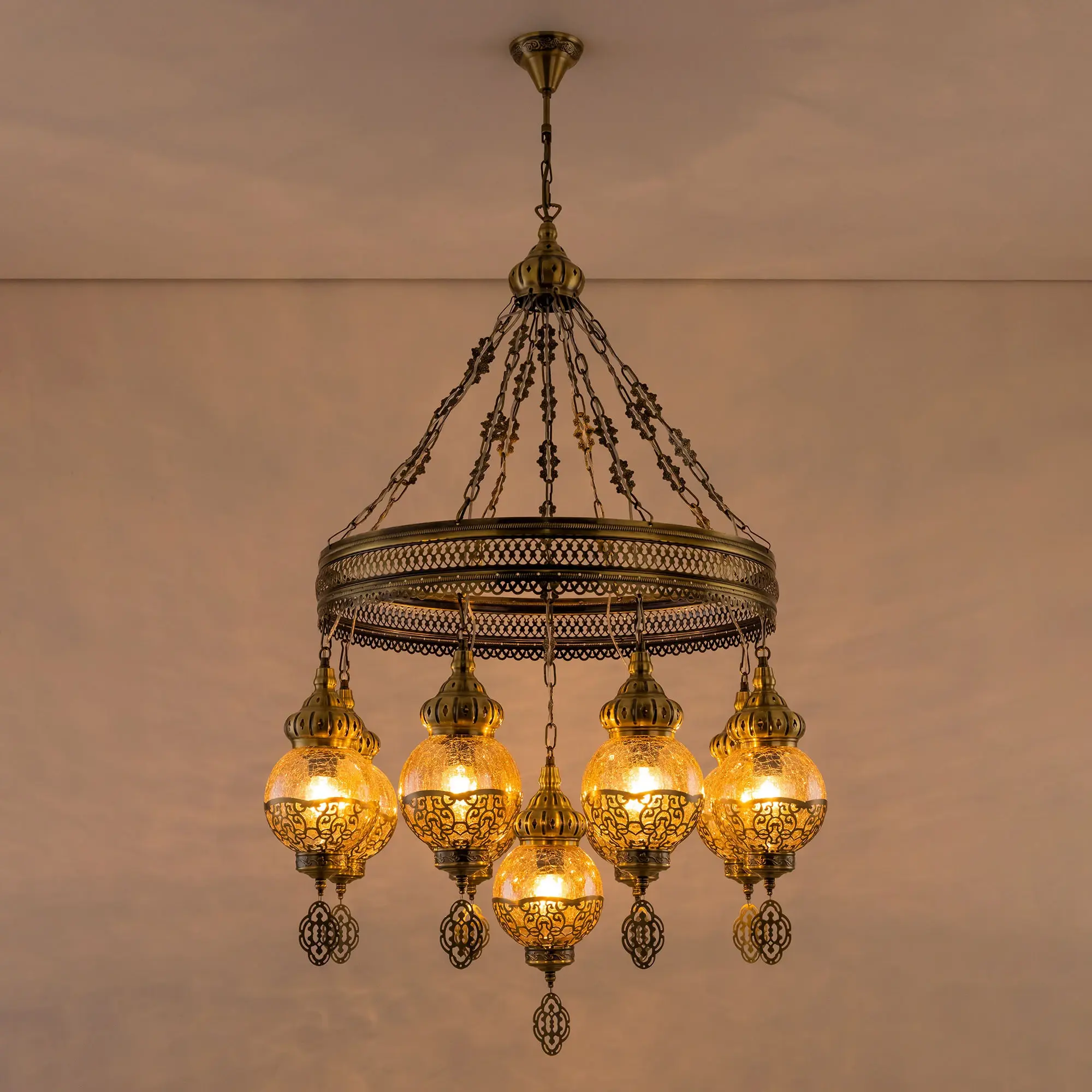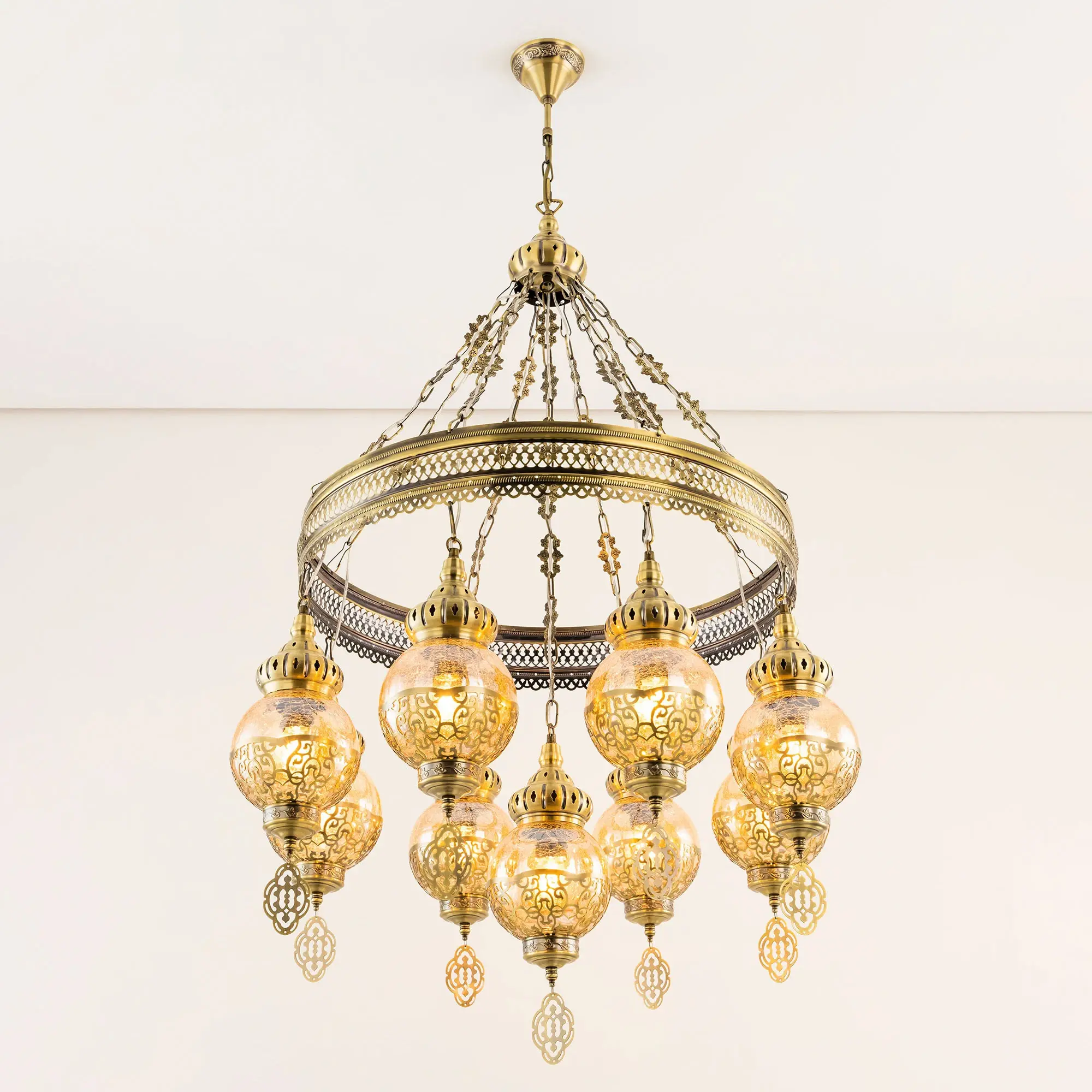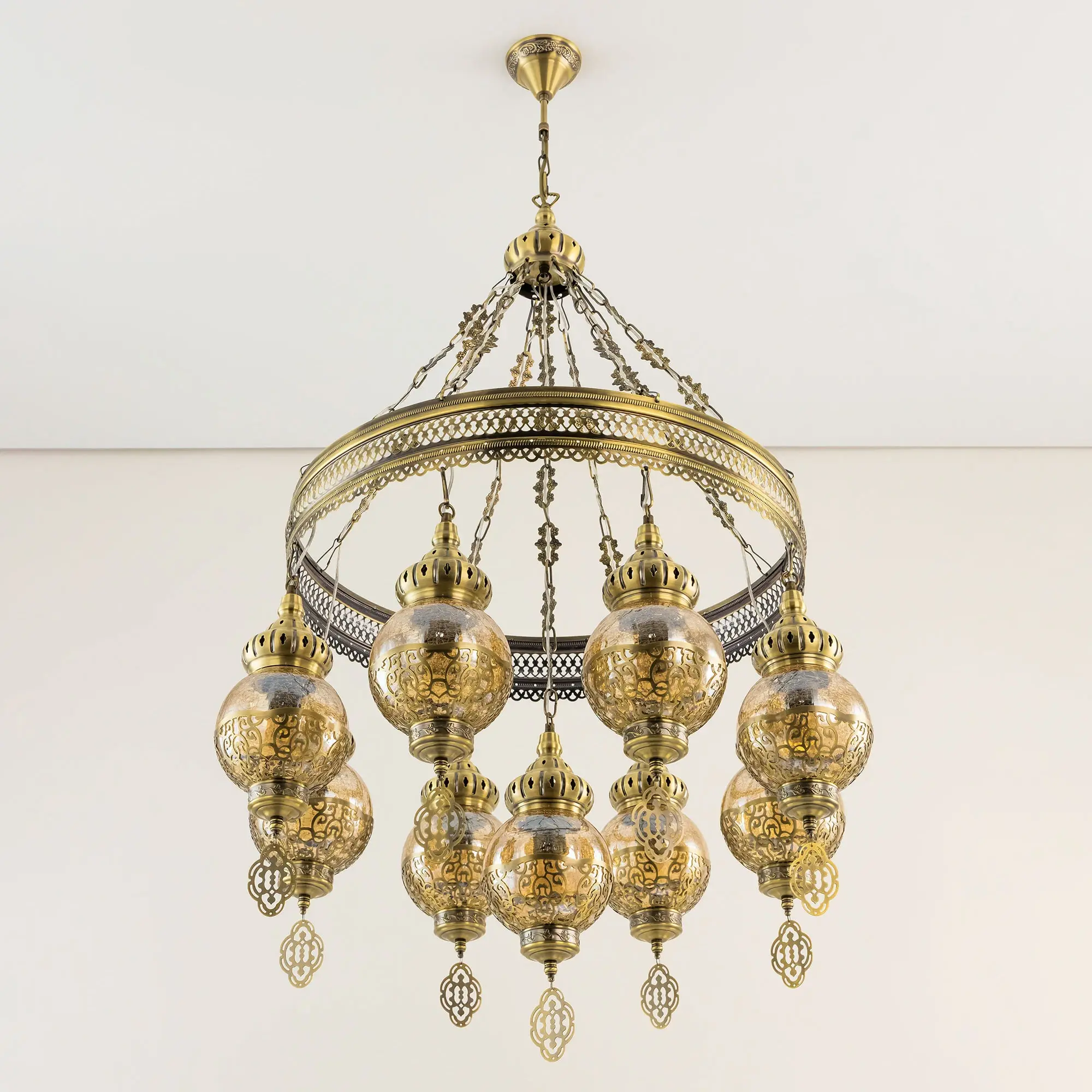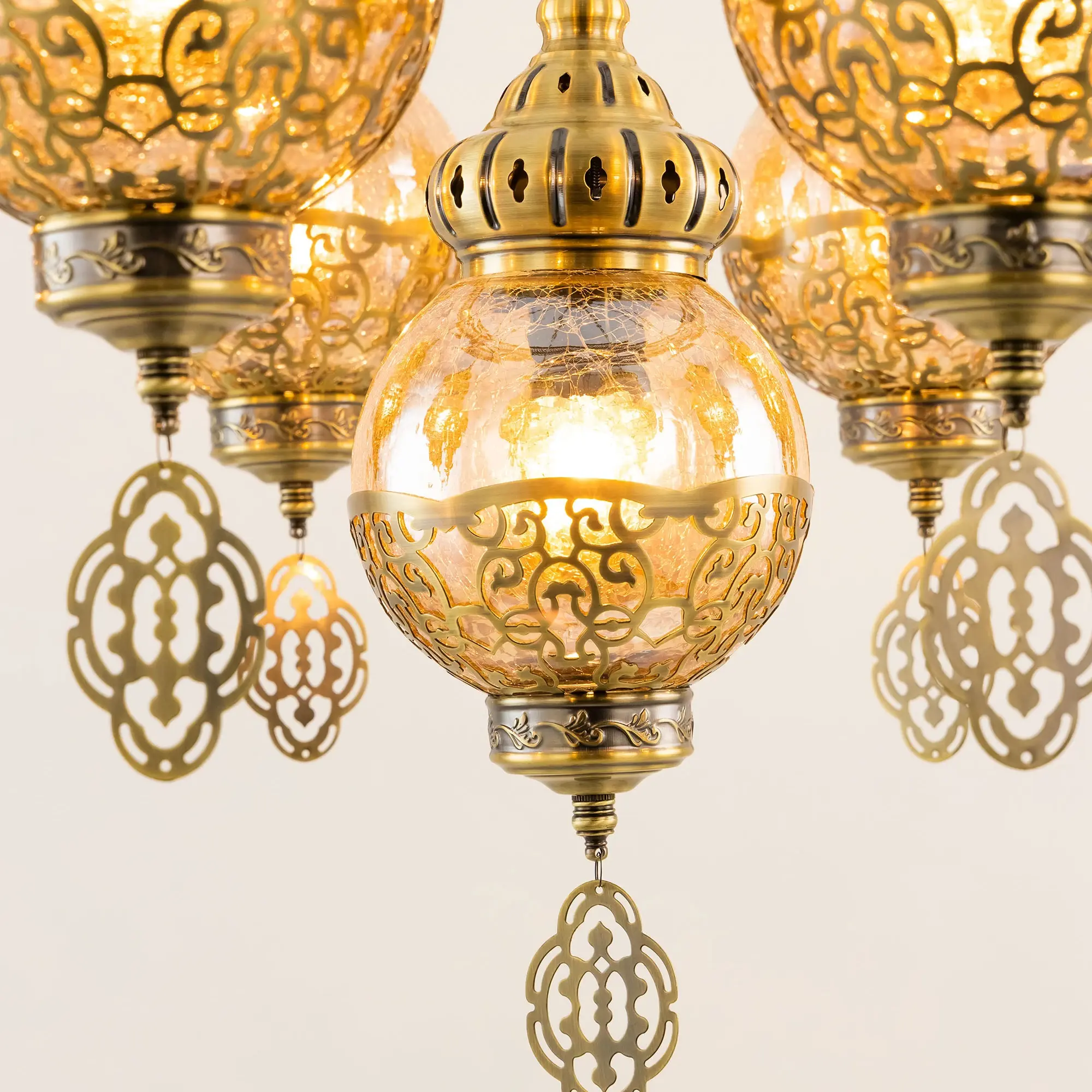 Восточная каскадная люстра Citilux Каир CL419183 с девятью подвесными плафонами. Каркас металлический, цвет бронза. Плафоны в форме шара, изготовлены из прозрачного стекла медового оттенка, украшены декоративными, ажурными элементами. В изделии используются лампы с цоколем Е27, максимальной мощностью для ламп накаливания 75Вт. Светодиодные лампы можно устанавливать более яркие. Модель подходит для всех типов потолков, в том числе натяжных. Тип крепления – крючок. Люстра Каир CL419183 прекрасный вариант для атмосферного освещения интерьеров квартир и загородных домов, выполненных в восточном стиле. Это великолепное решение при оформления уютных кафе, баров и ресторанов.