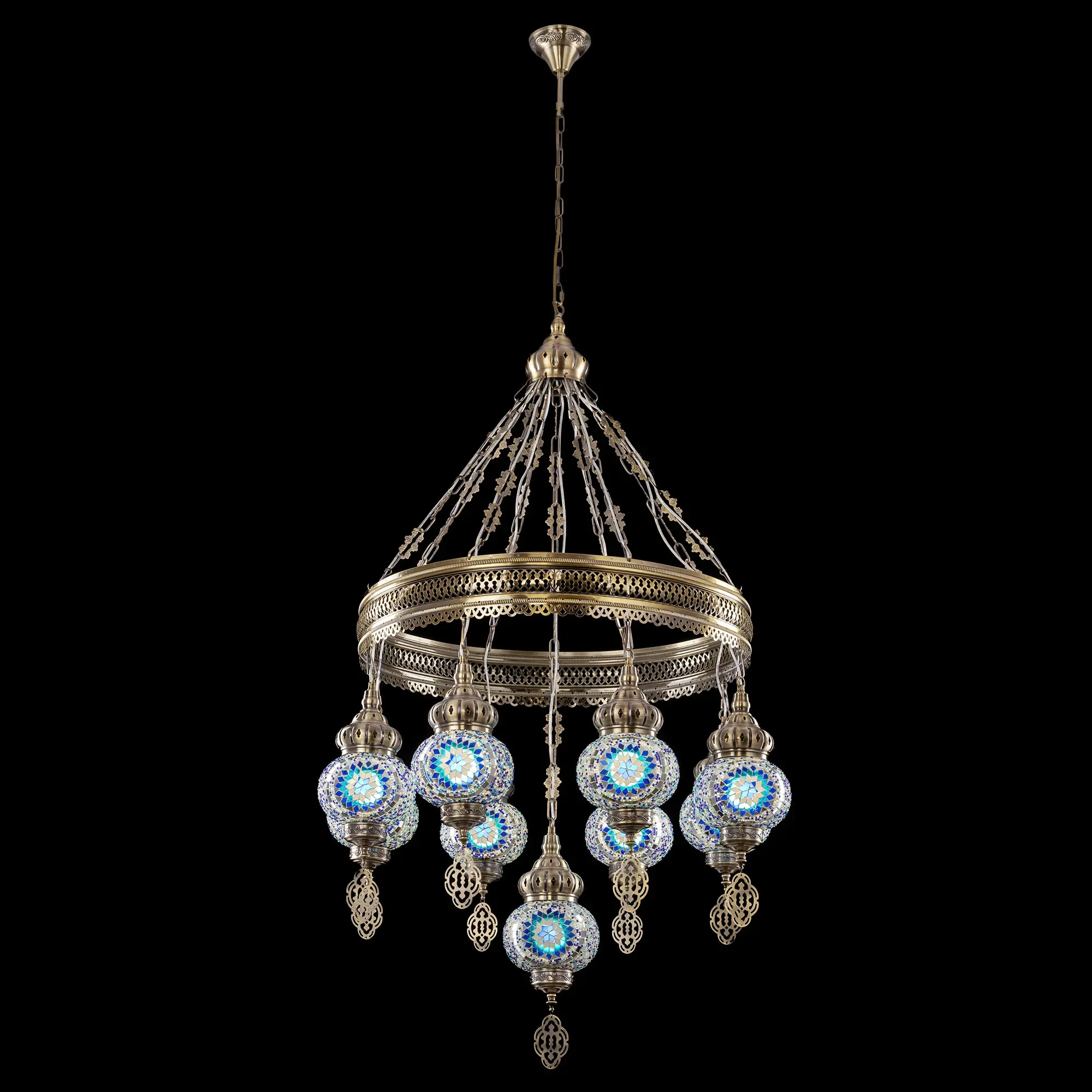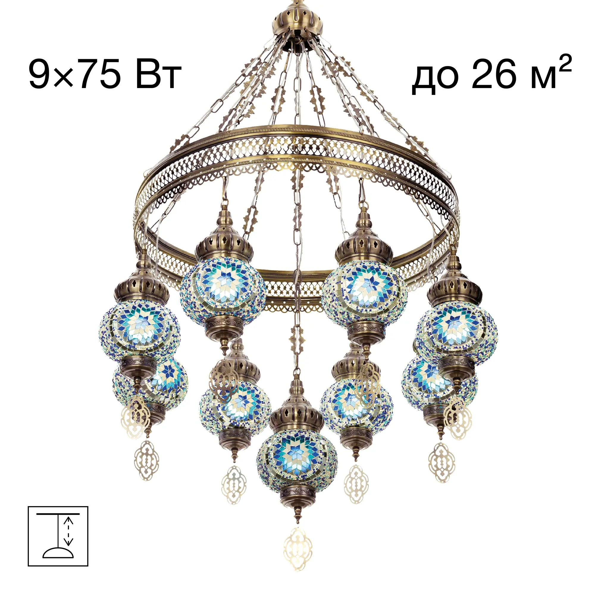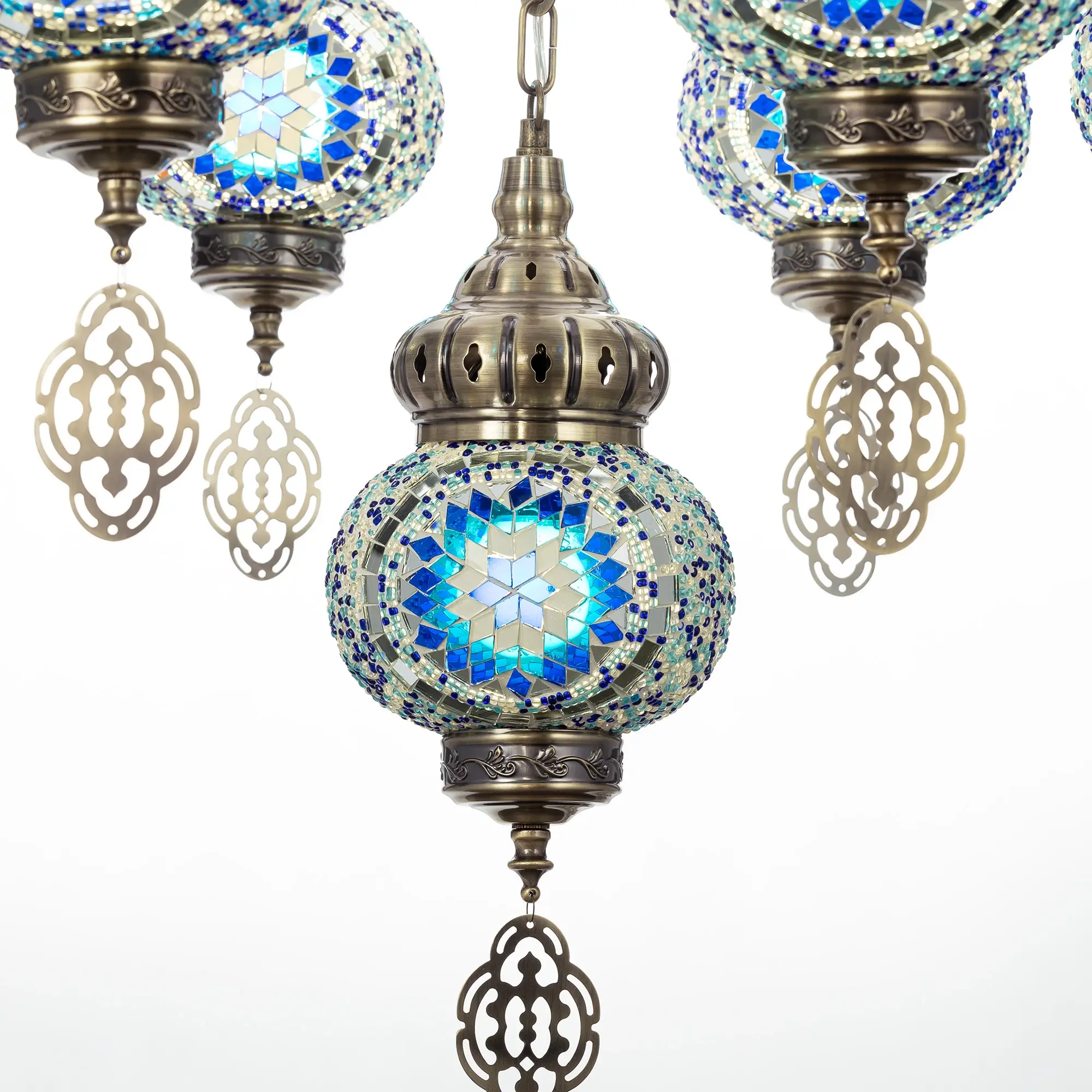 Девять подвесных плафонов, выполненных в форме слегка приплюснутых шаров, украшены мозаикой в сине-голубых оттенках. Это наполняет пространство чувством свежести и гармонии. Металлический каркас благородного бронзового цвета декорирован искусной чеканкой.