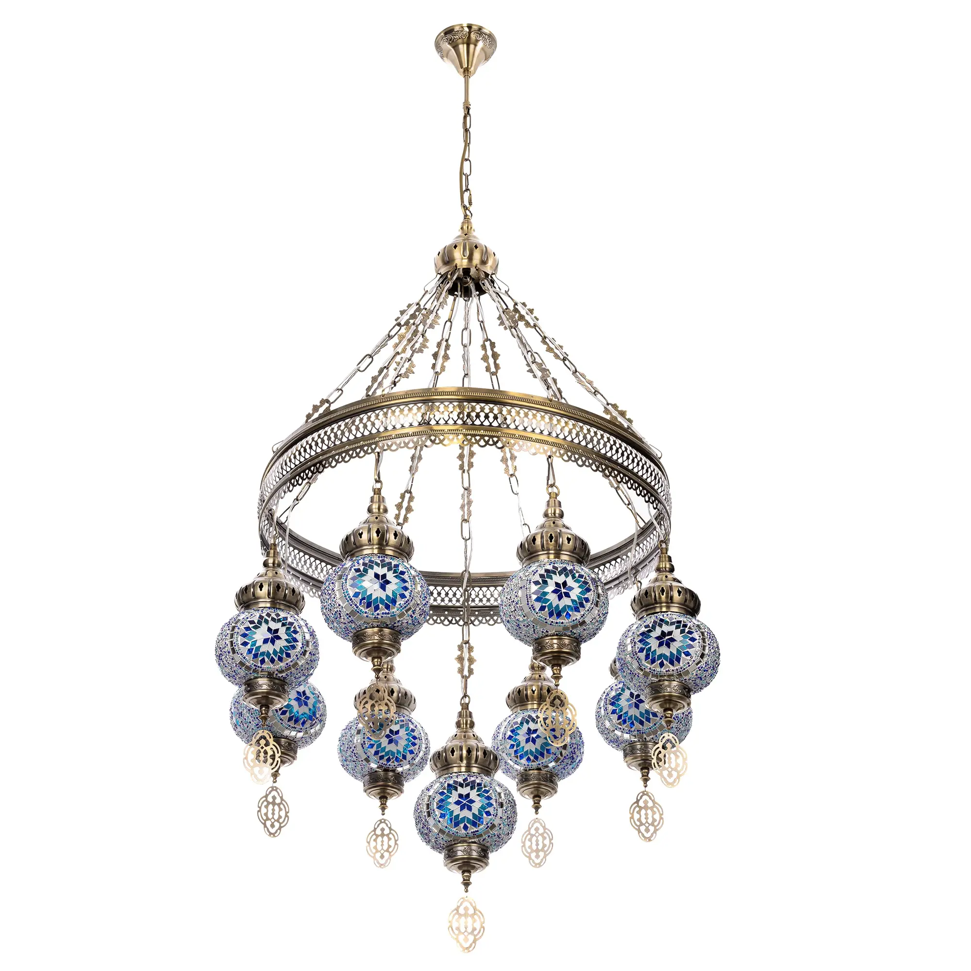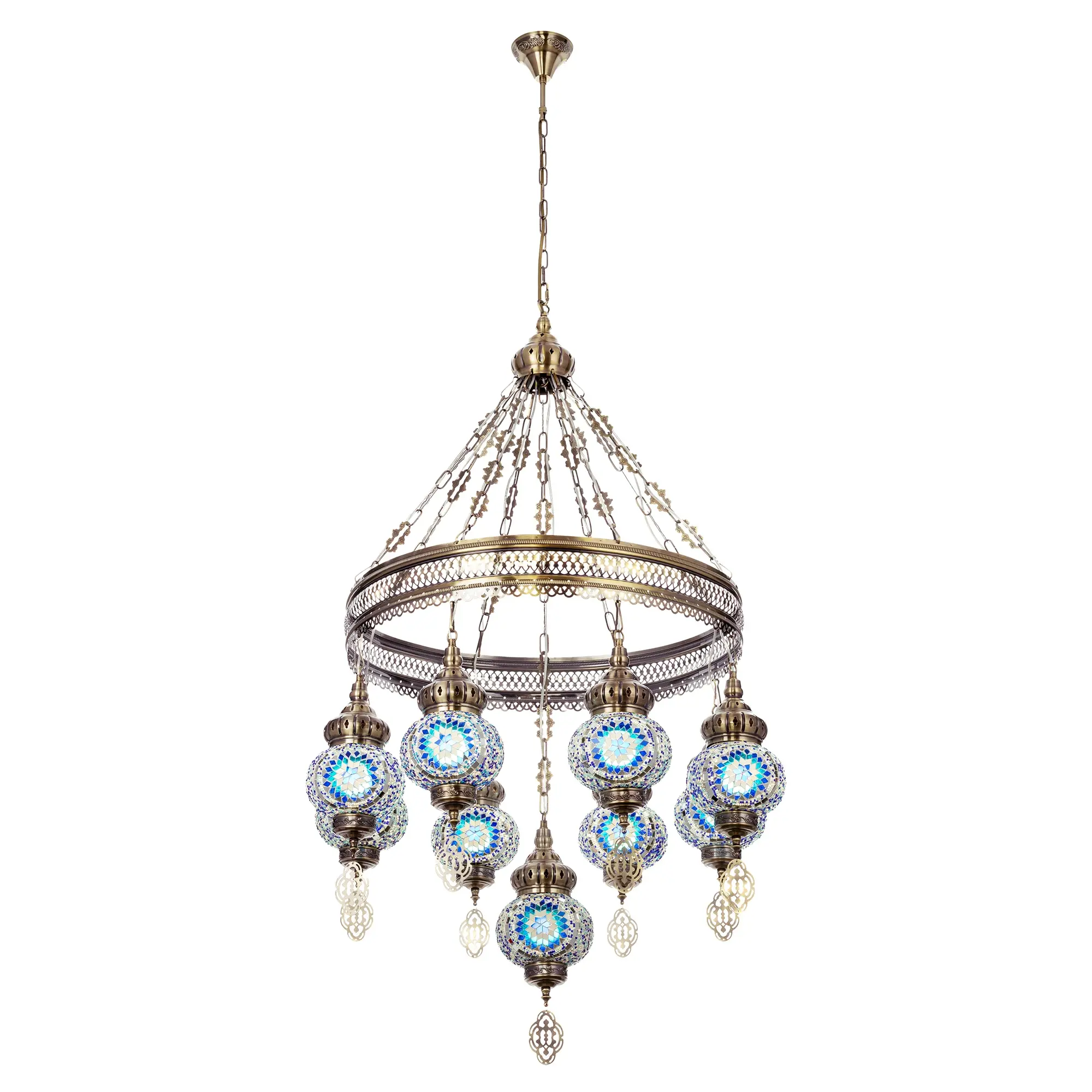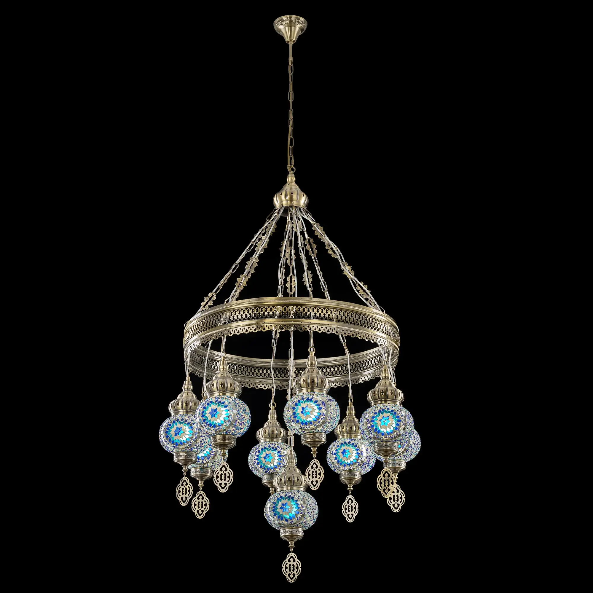 Девять подвесных плафонов, выполненных в форме слегка приплюснутых шаров, украшены мозаикой в сине-голубых оттенках. Это наполняет пространство чувством свежести и гармонии. Металлический каркас благородного бронзового цвета декорирован искусной чеканкой.