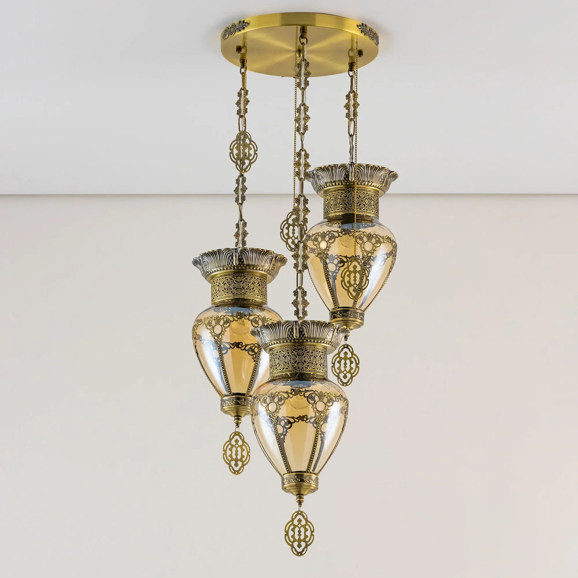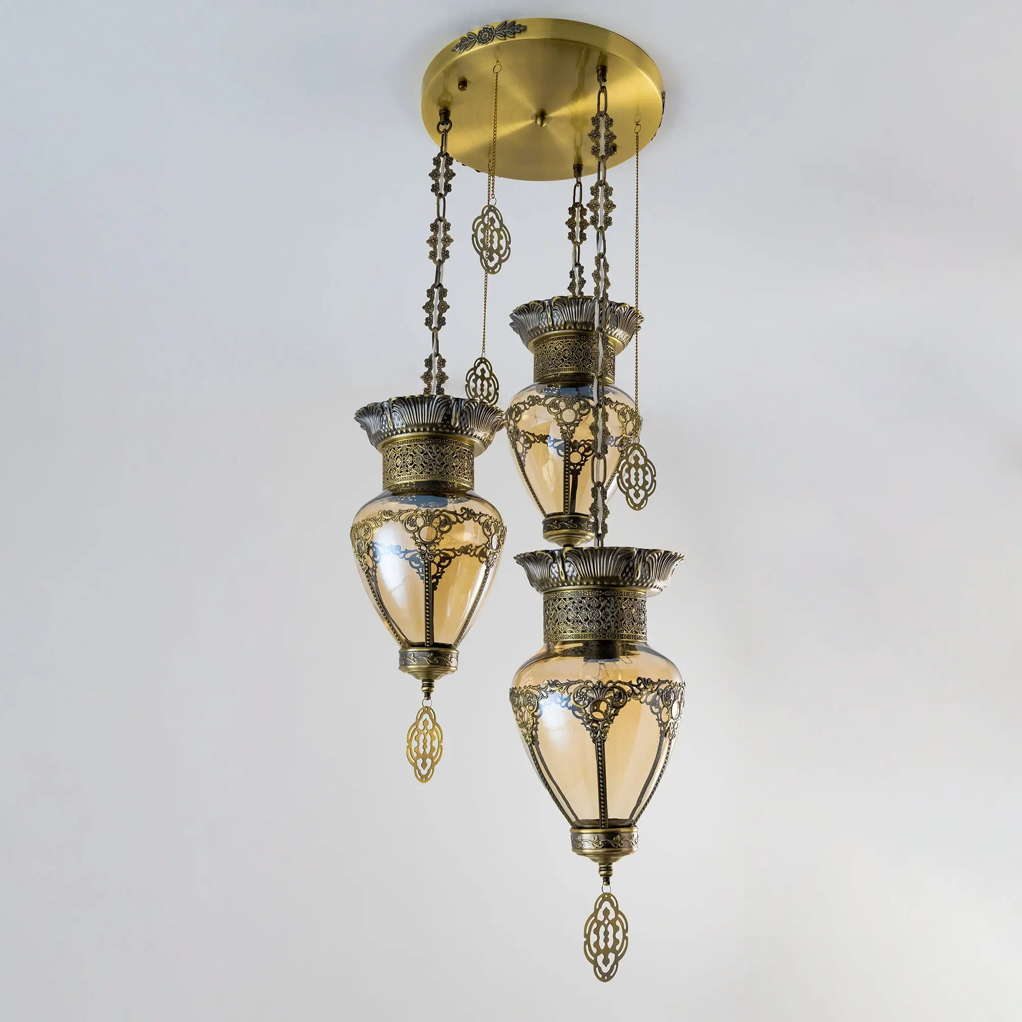 Восточный каскадный светильник Citilux Каир CL419233 с тремя подвесными плафонами. Корпус металлический, цвет бронза. Плафоны оригинальной формы, изготовлены из прозрачного стекла медового оттенка, украшены декоративными, ажурными элементами. В изделии используются лампы с цоколем Е27, максимальной мощностью для ламп накаливания 75Вт. Светодиодные лампы можно устанавливать более яркие. Модель подходит для всех типов потолков, в том числе натяжных. Тип крепления – планка. Люстра Каир CL419233 прекрасный вариант для атмосферного освещения интерьеров квартир и загородных домов, выполненных в восточном стиле. Это великолепное решение при оформления уютных кафе, баров и ресторанов