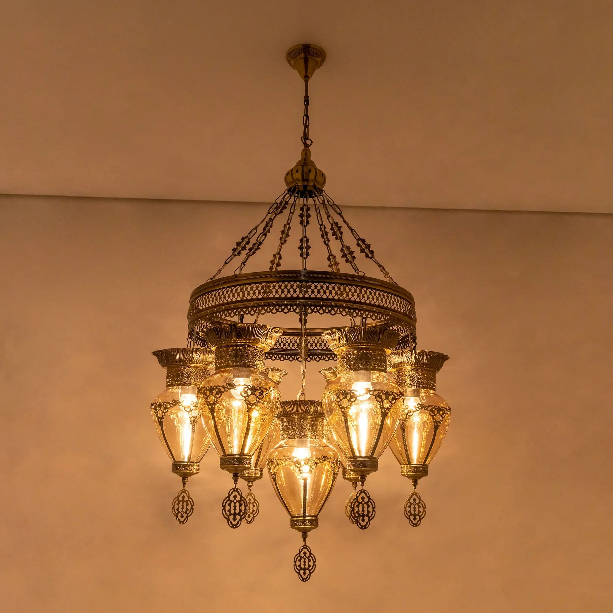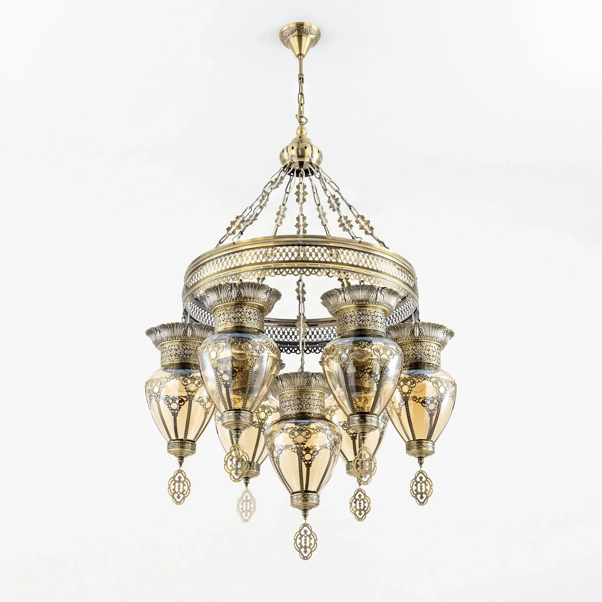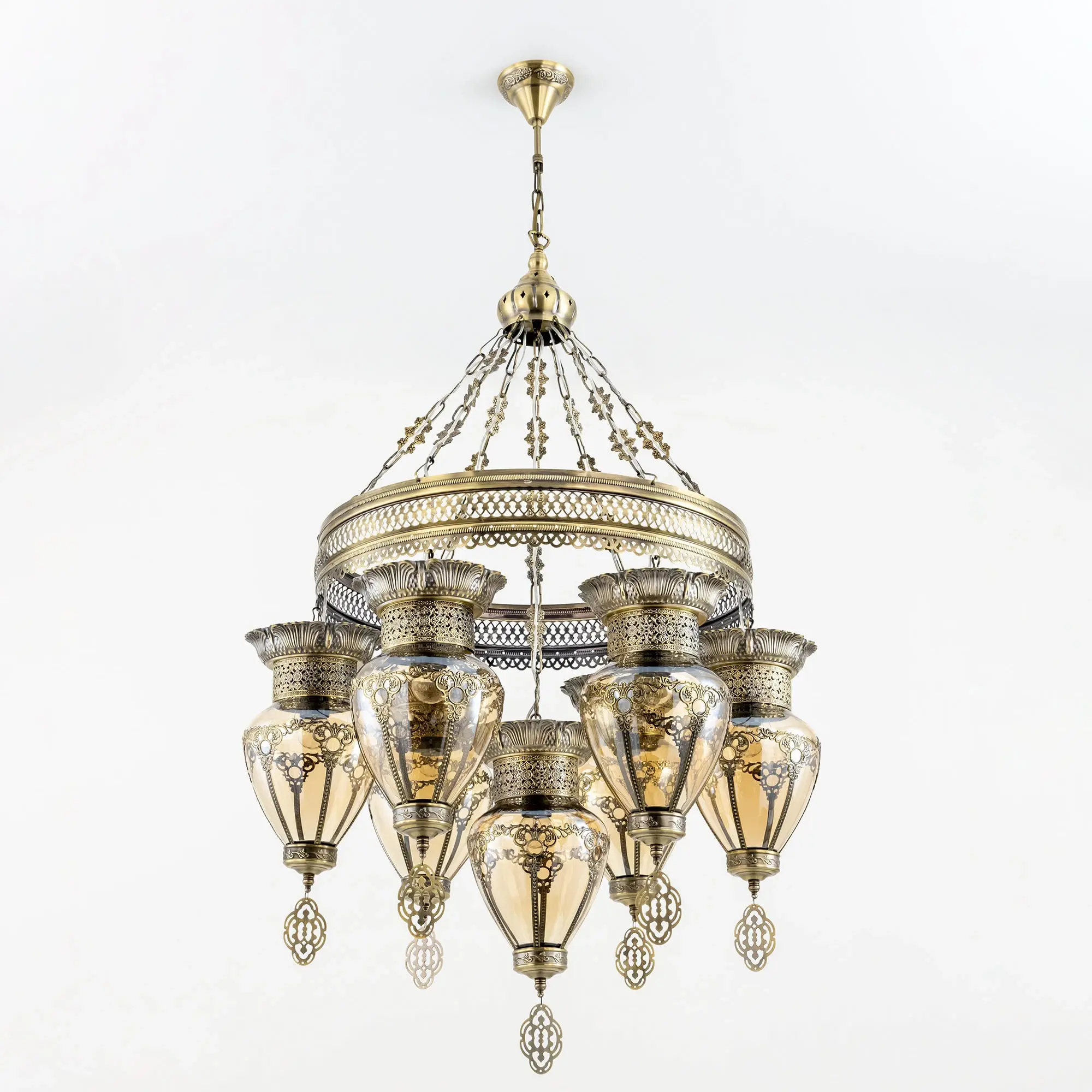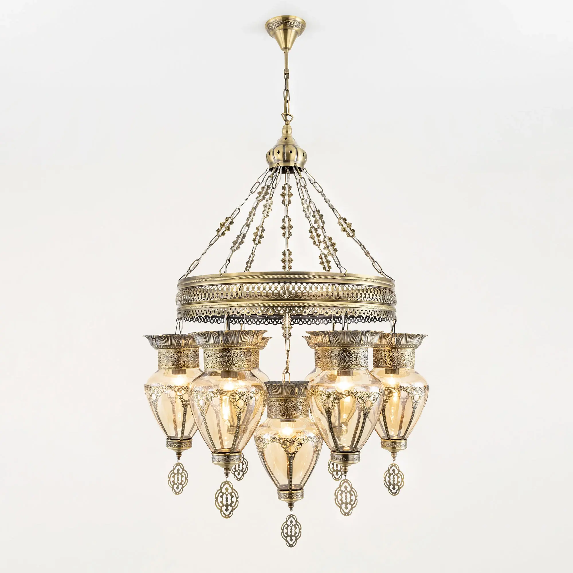Восточная каскадная люстра Citilux Каир CL419263 с семью подвесными плафонами. Каркас металлический, цвет бронза. Плафоны в форме шара, изготовлены из прозрачного стекла медового оттенка, украшены декоративными, ажурными элементами. В изделии используются лампы с цоколем Е27, максимальной мощностью для ламп накаливания 75Вт. Светодиодные лампы можно устанавливать более яркие. Модель подходит для всех типов потолков, в том числе натяжных. Тип крепления – крючок. Люстра Каир CL419263 прекрасный вариант для атмосферного освещения интерьеров квартир и загородных домов, уютных кафе, баров и ресторанов, оформленных в восточном стиле.