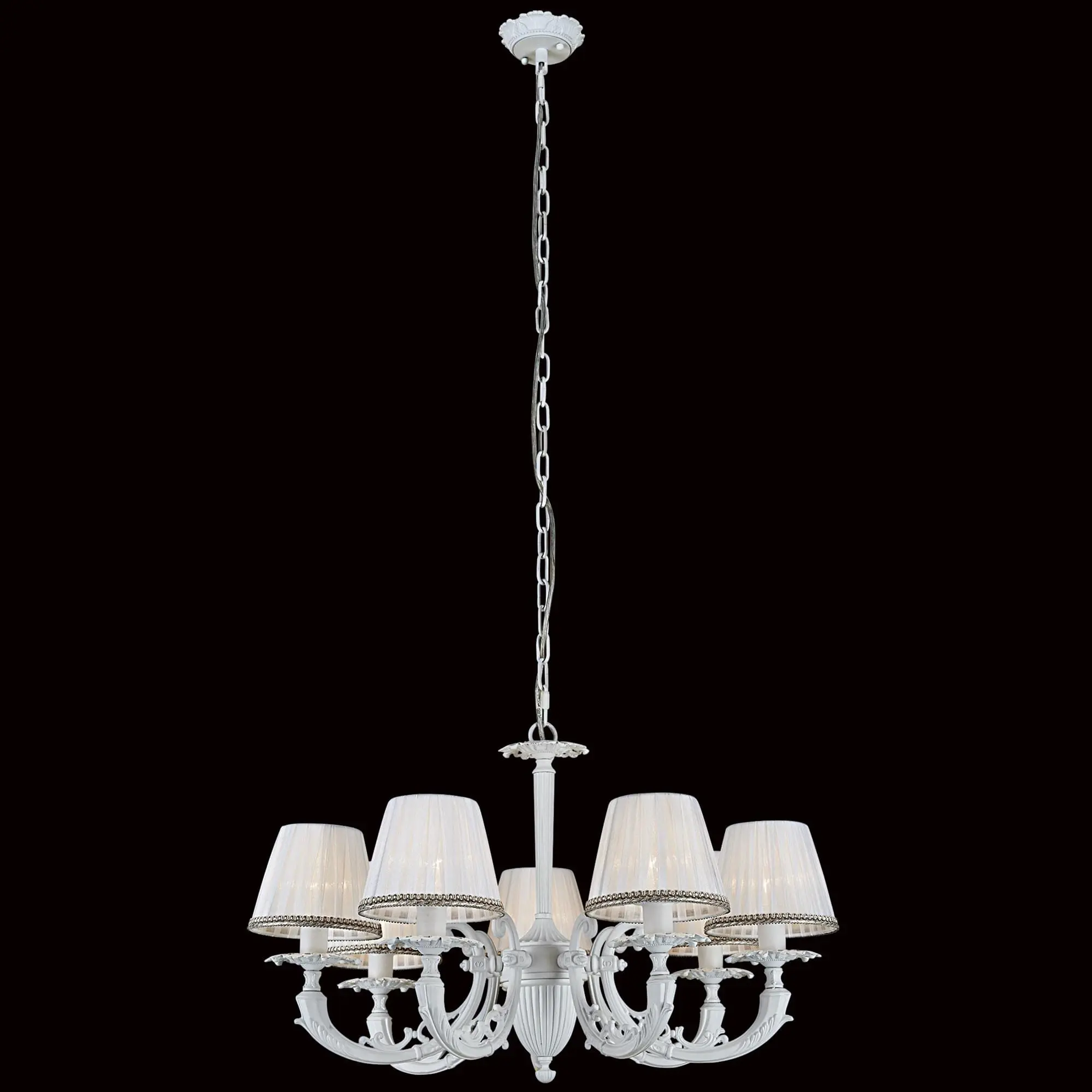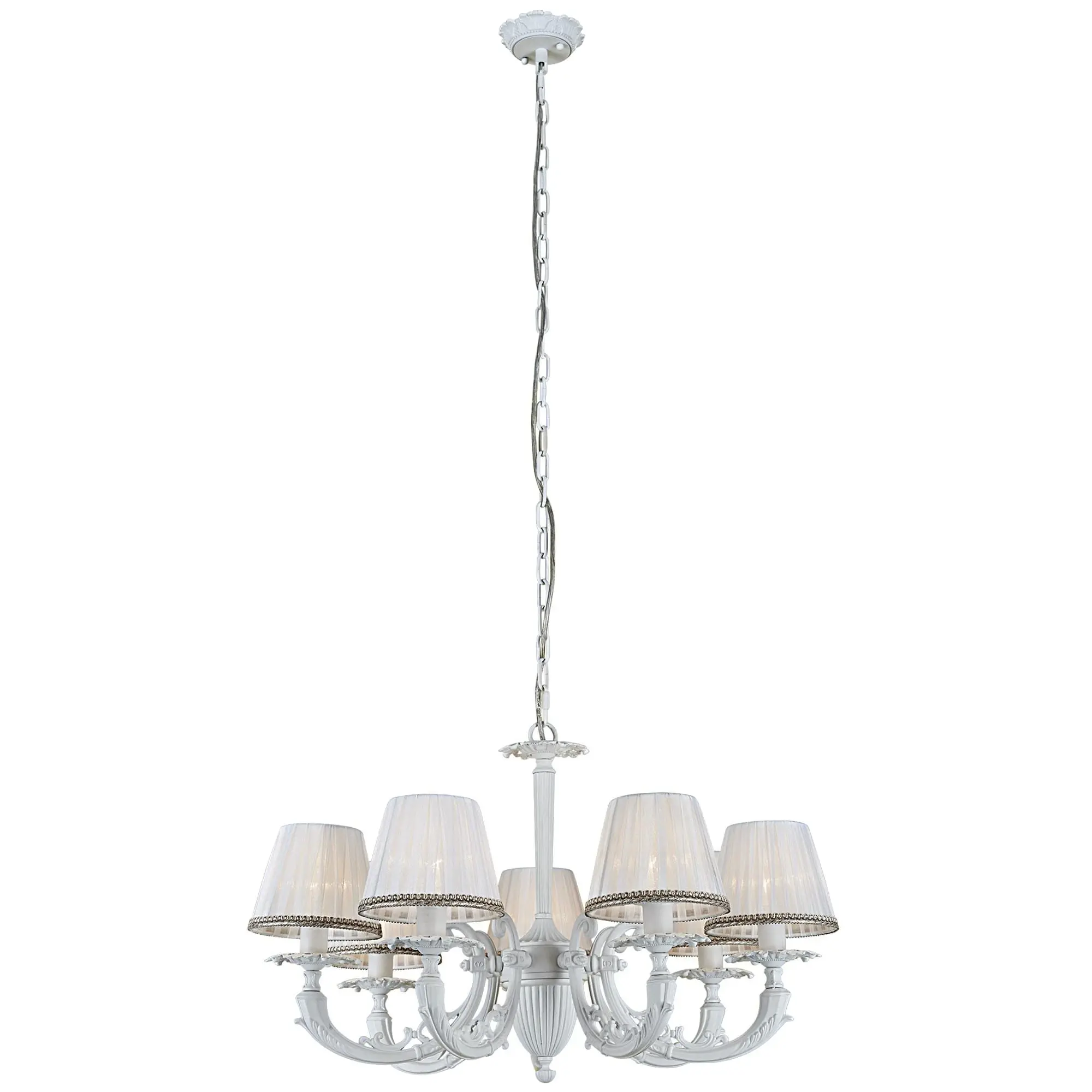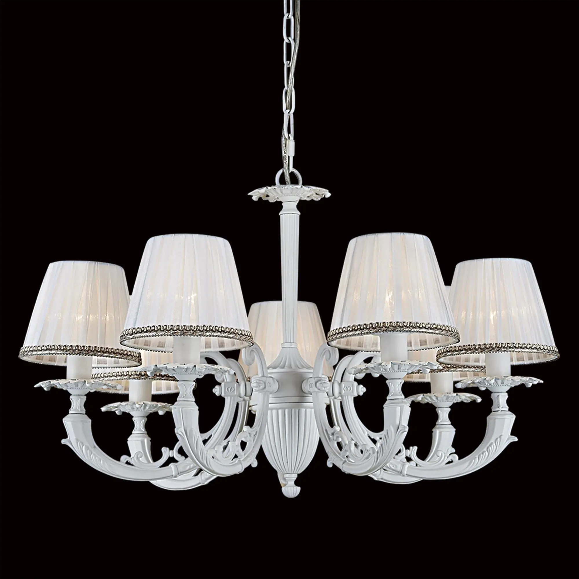 Подвесная люстра Citilux Kanon CL412172 с абажурами. Металлический корпус окрашен в белый цвет, 7 рожков дополнены декоративными лепными элементами. Абажуры в форме усеченного конуса изготовлены из белой плиссированной ткани, по краю украшенной ажурной тесьмой.