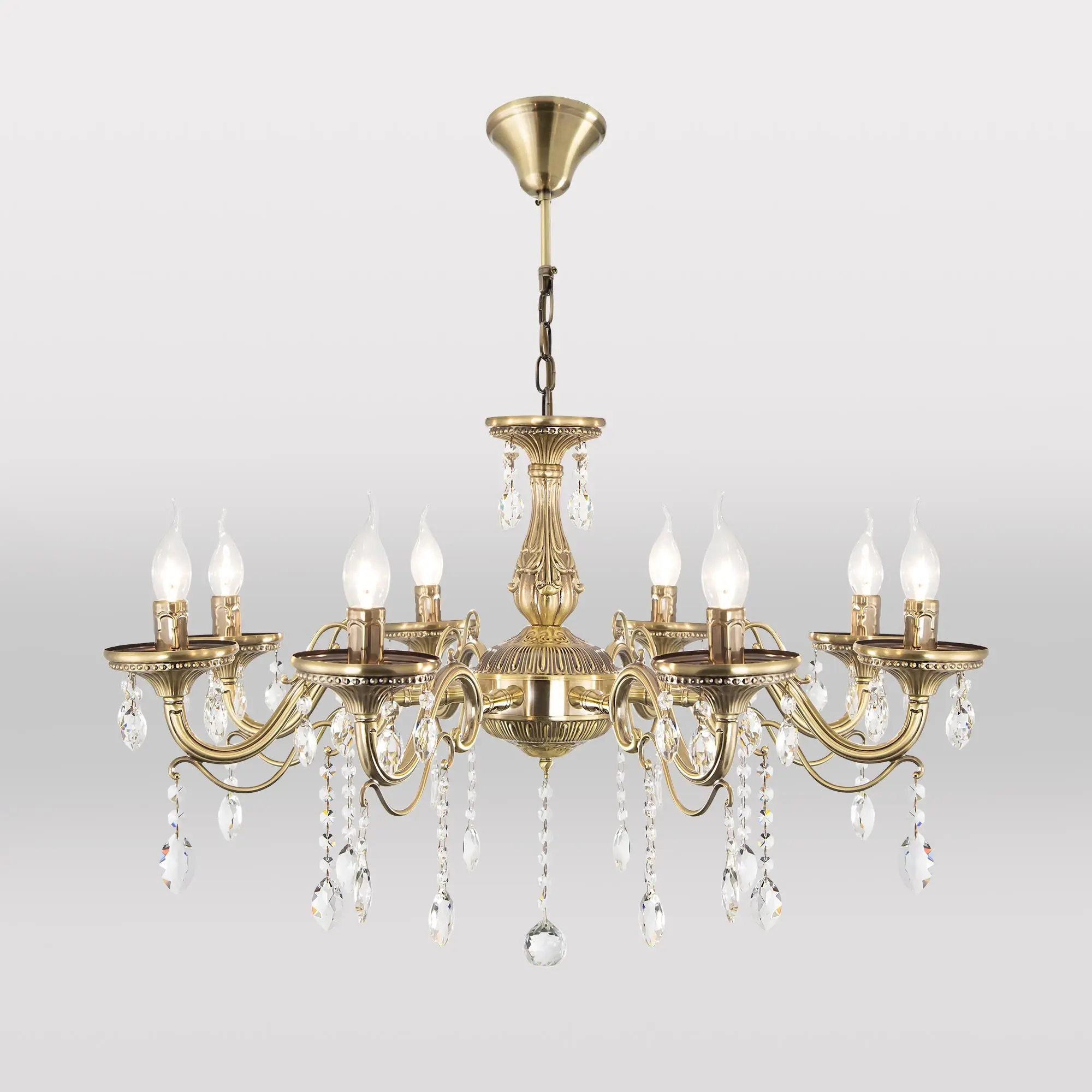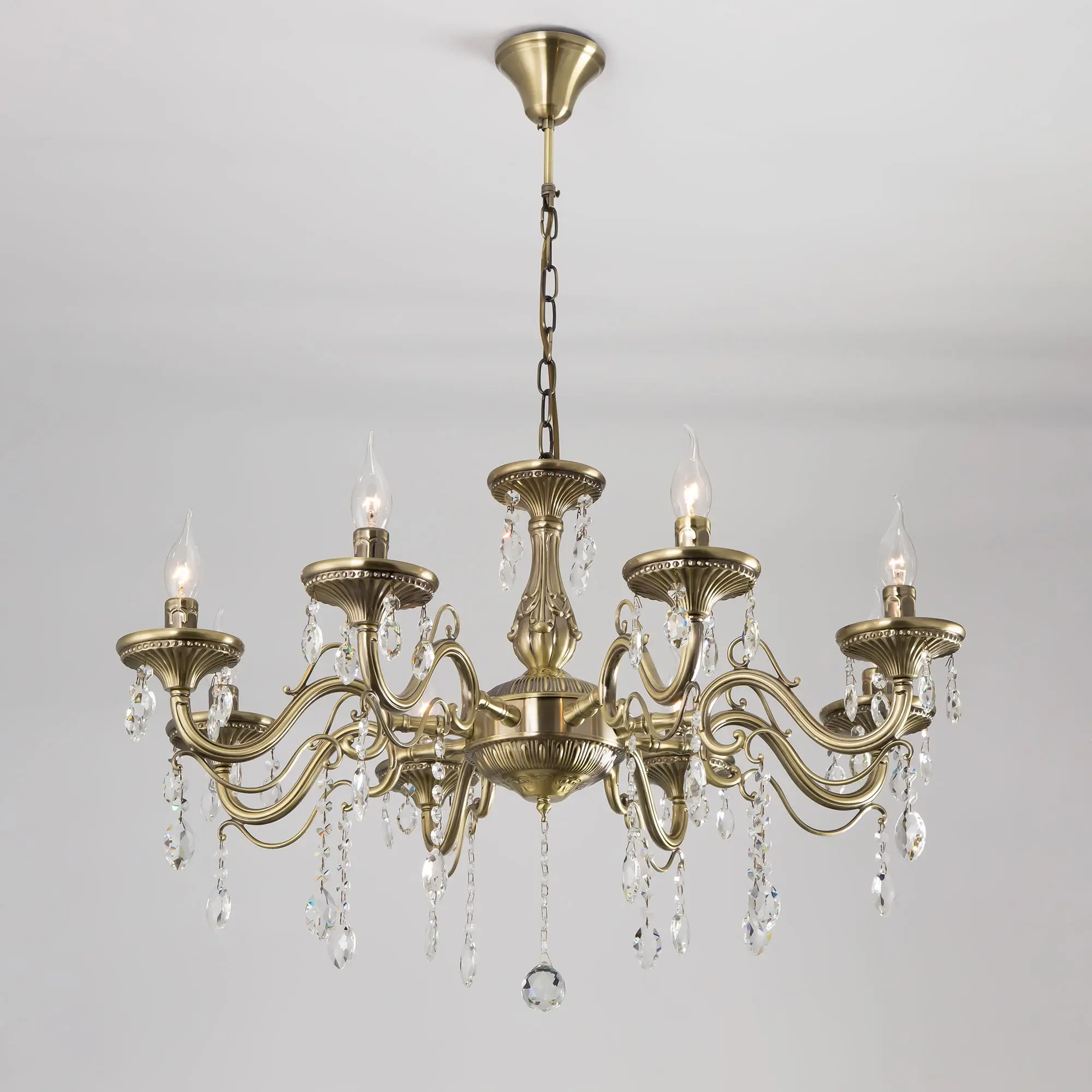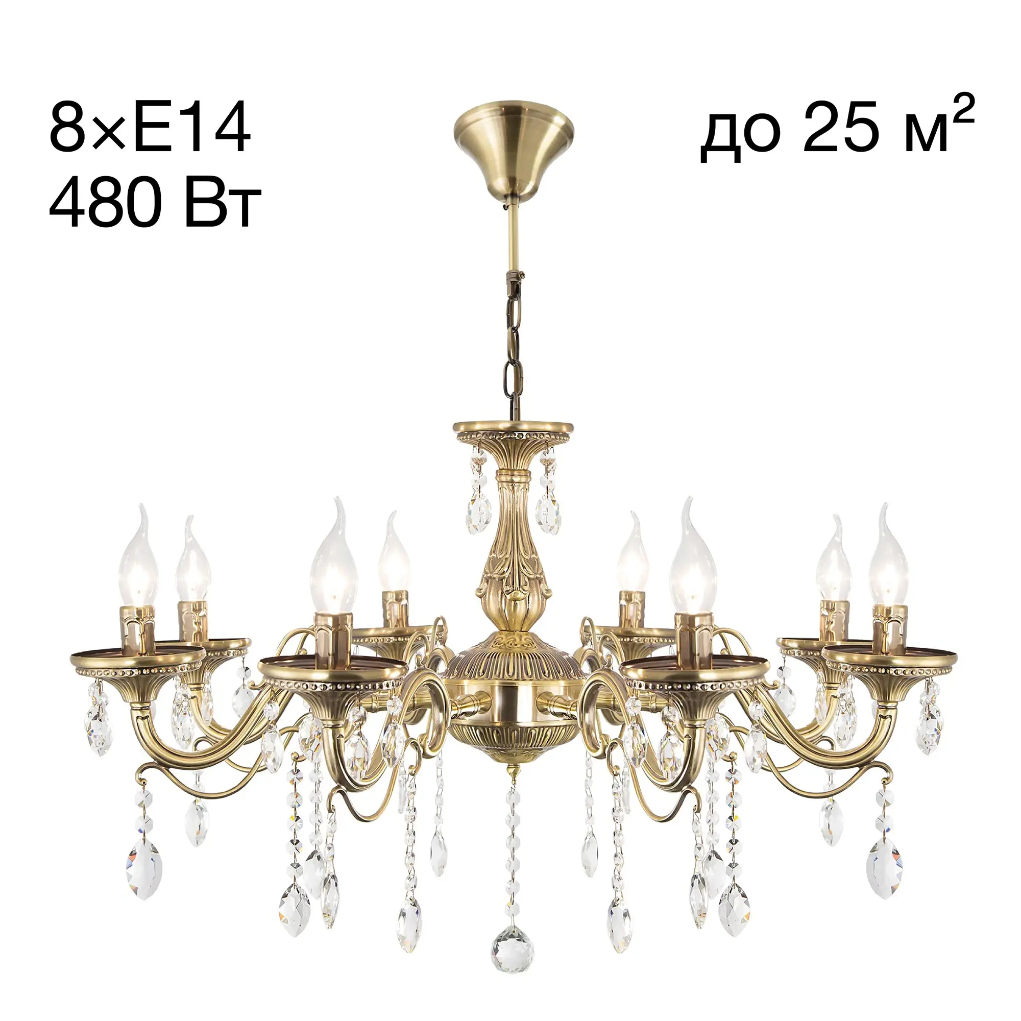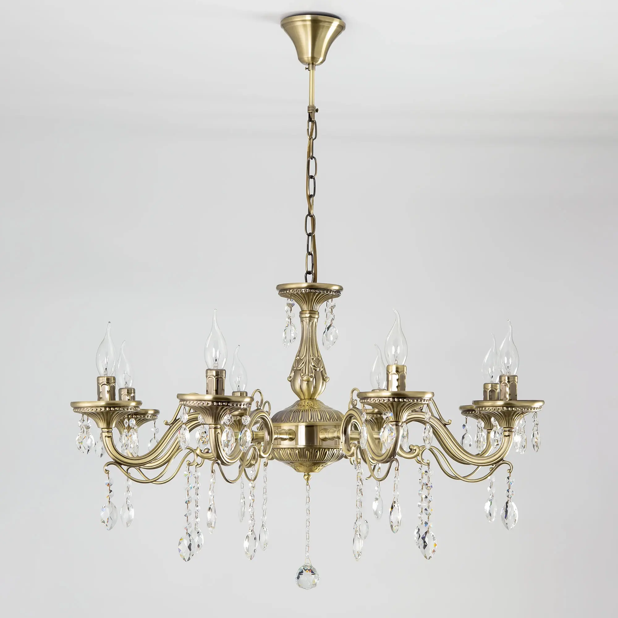 Люстра Ситилюкс Кармен CL404183 восьмирожковая, выполнена в классическом стиле. Корпус модели металлический, с литыми рожками, цвет бронза. Люстра украшена хрустальными подвесками с красивой огранкой. Модель отлично подойдет для помещений с высокими и низкими потолками, для этого нужно перед установкой отрегулировать длину подвесной цени. Более того, изделие можно скоммутировать для работы как с одноклавишным, так и с двухклавишным выключателем. Тип крепления к потолку – на крючок. В люстре используются восемь ламп с цоколем Е14 и максимальной мощностью для ламп накаливания 60Вт. Суммарная мощность 480Вт. Светодиодные лампы можно использовать большей яркости,