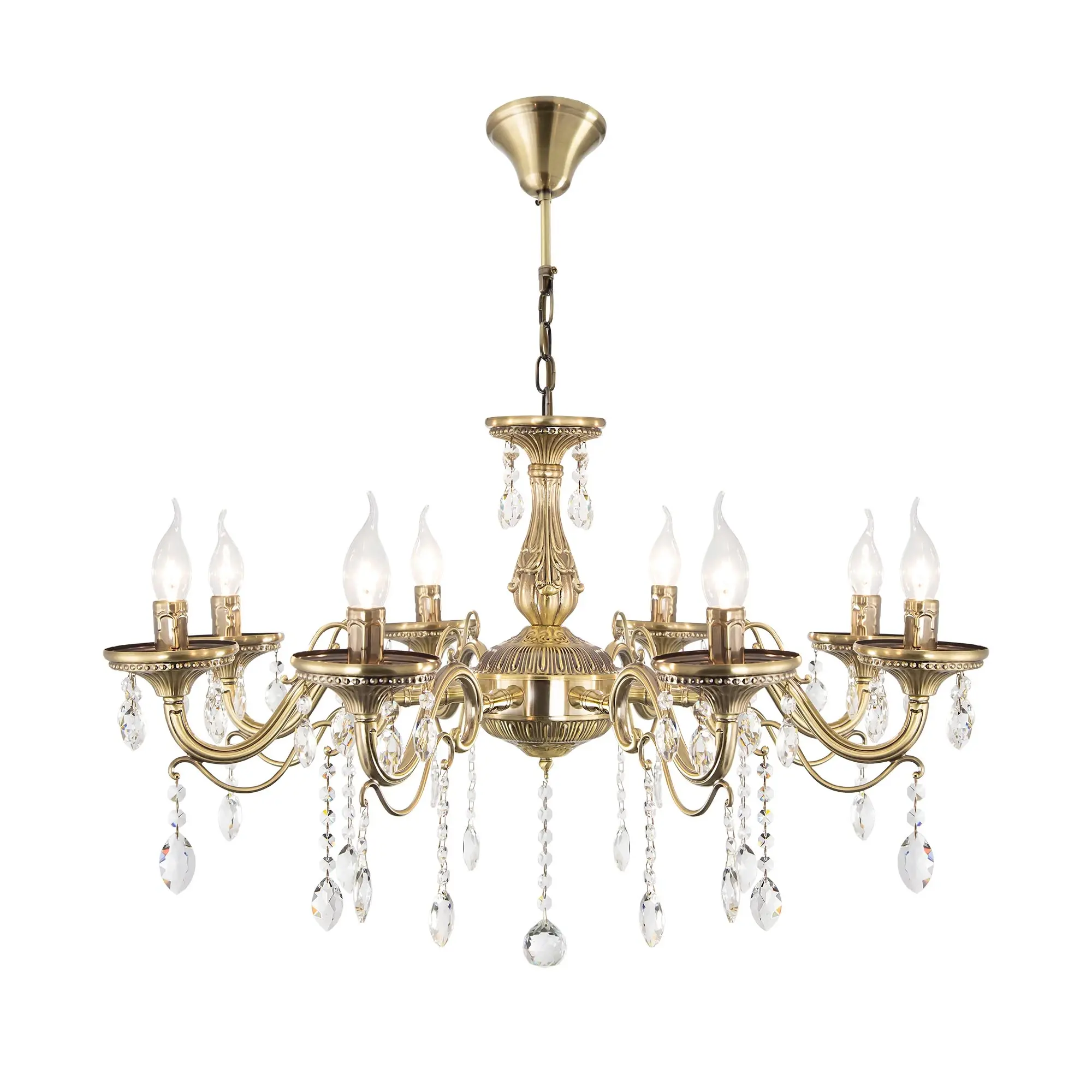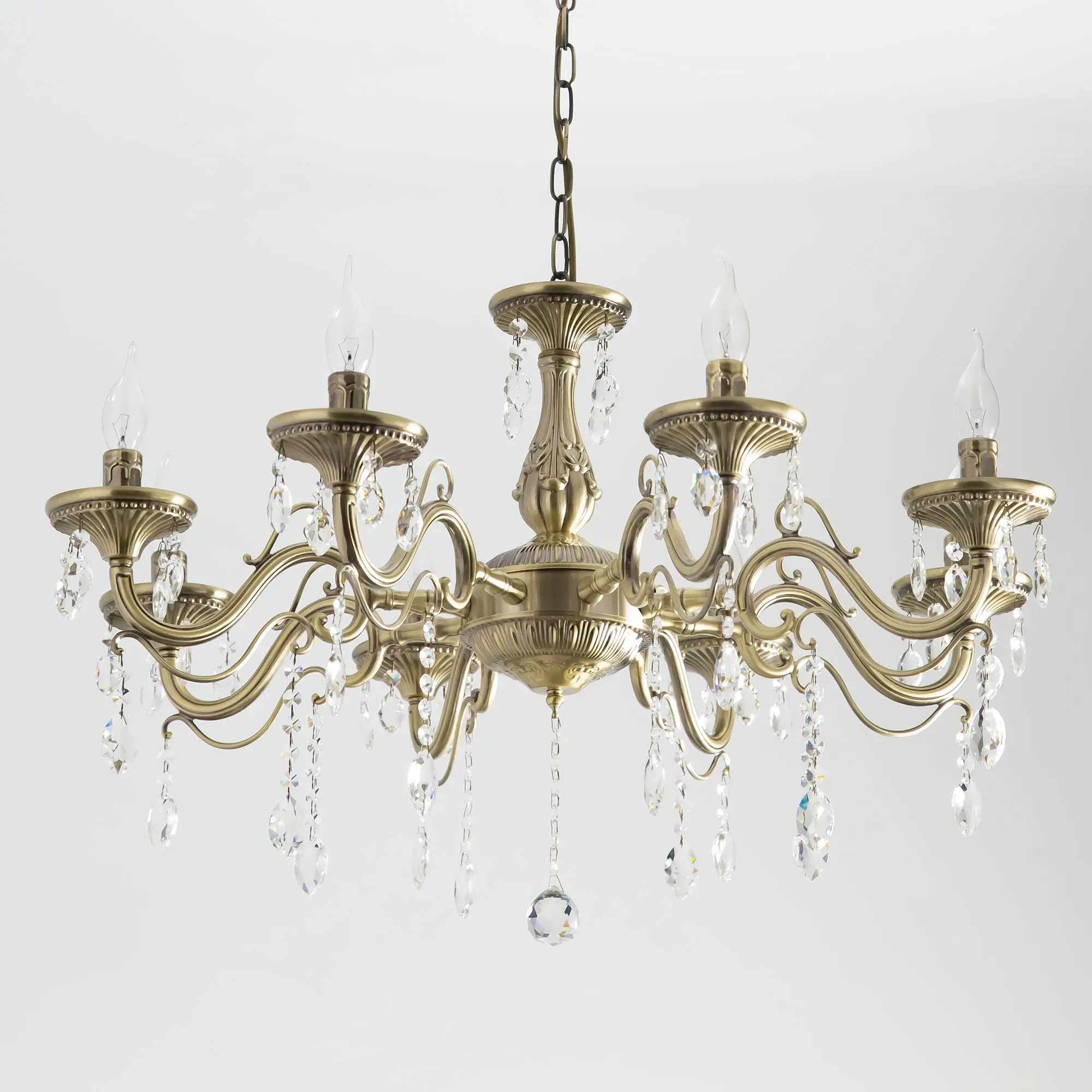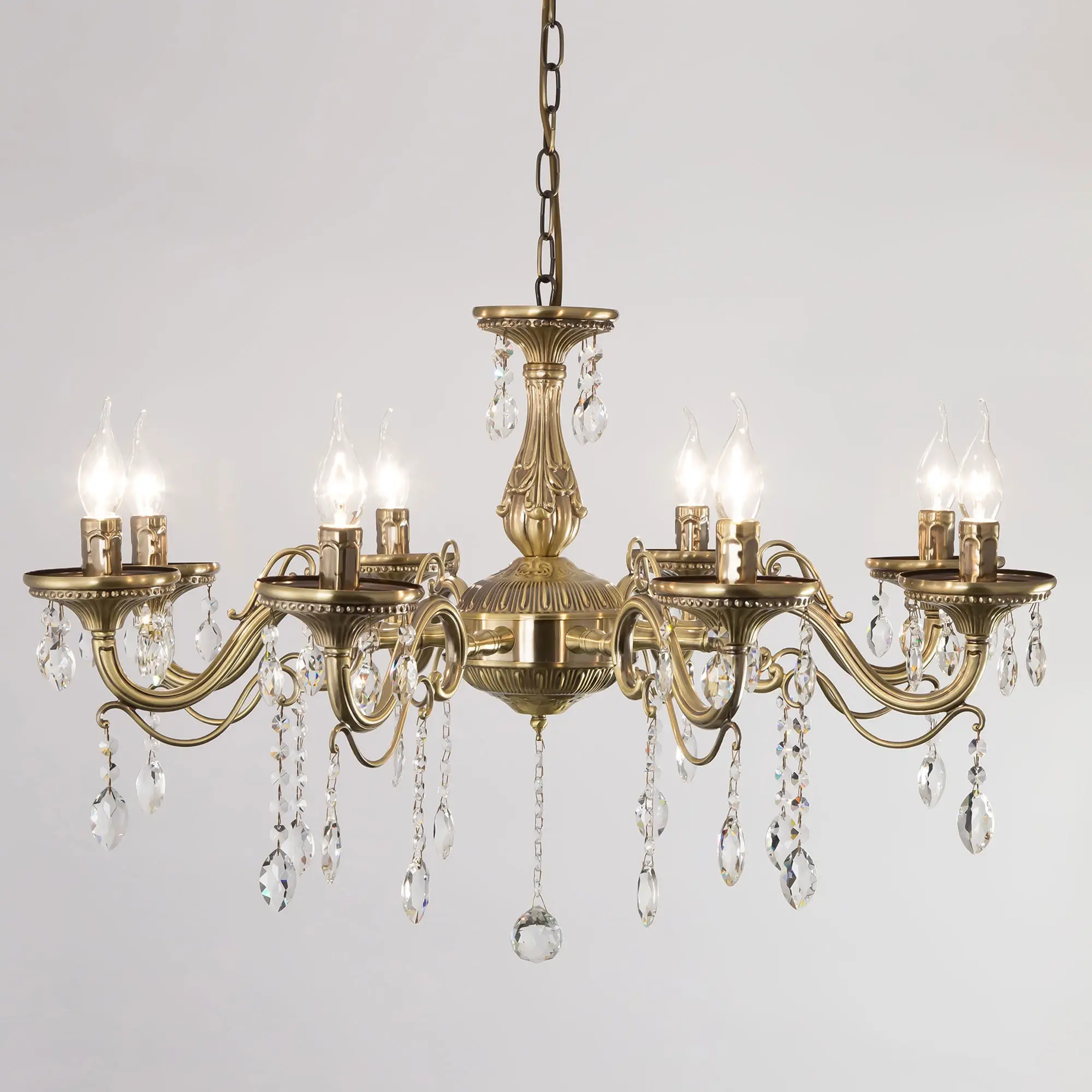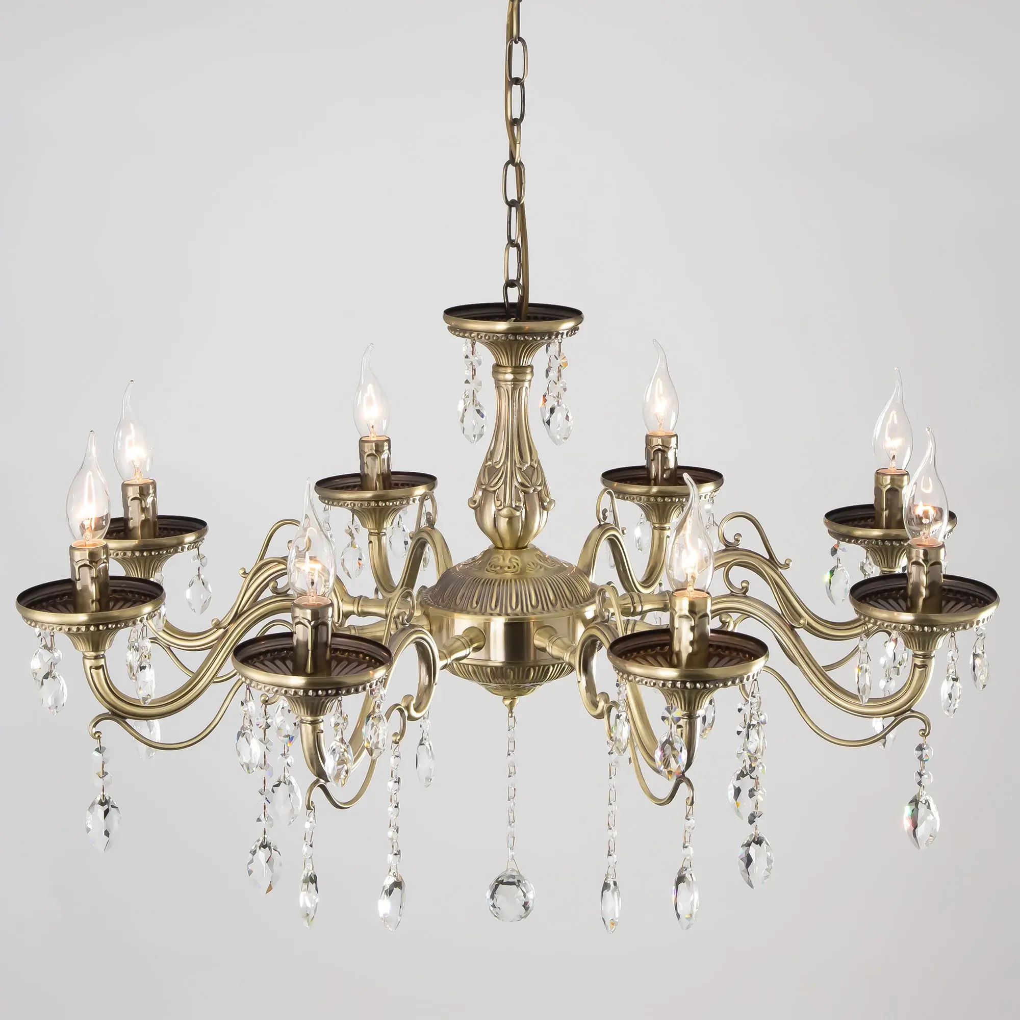 Люстра Ситилюкс Кармен CL404183 восьмирожковая, выполнена в классическом стиле. Корпус модели металлический, с литыми рожками, цвет бронза. Люстра украшена хрустальными подвесками с красивой огранкой. Модель отлично подойдет для помещений с высокими и низкими потолками, для этого нужно перед установкой отрегулировать длину подвесной цени. Более того, изделие можно скоммутировать для работы как с одноклавишным, так и с двухклавишным выключателем. Тип крепления к потолку – на крючок. В люстре используются восемь ламп с цоколем Е14 и максимальной мощностью для ламп накаливания 60Вт. Суммарная мощность 480Вт. Светодиодные лампы можно использовать большей яркости,