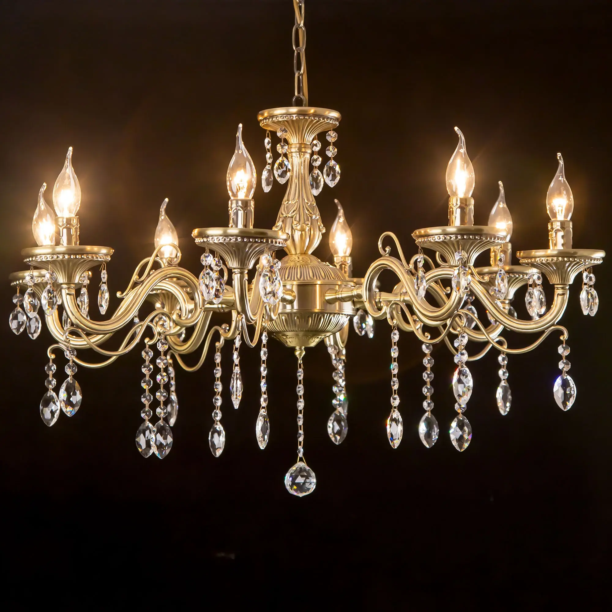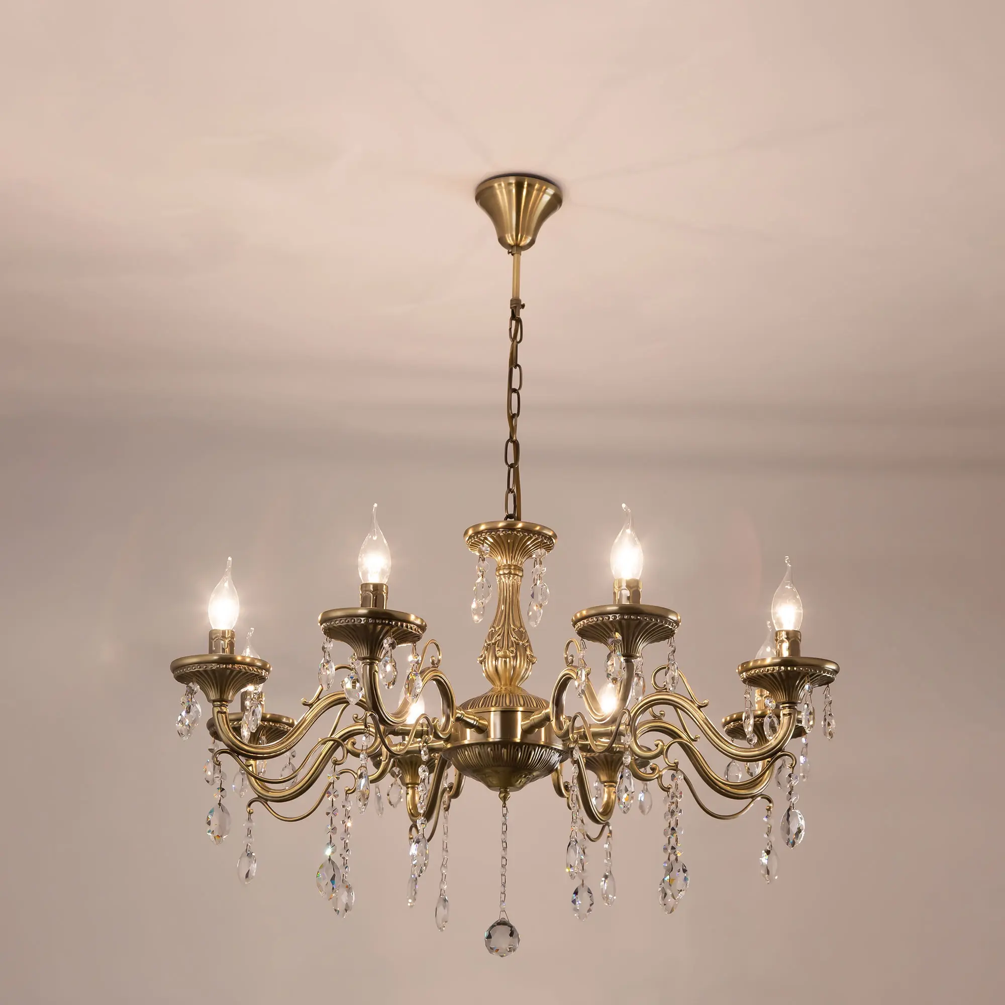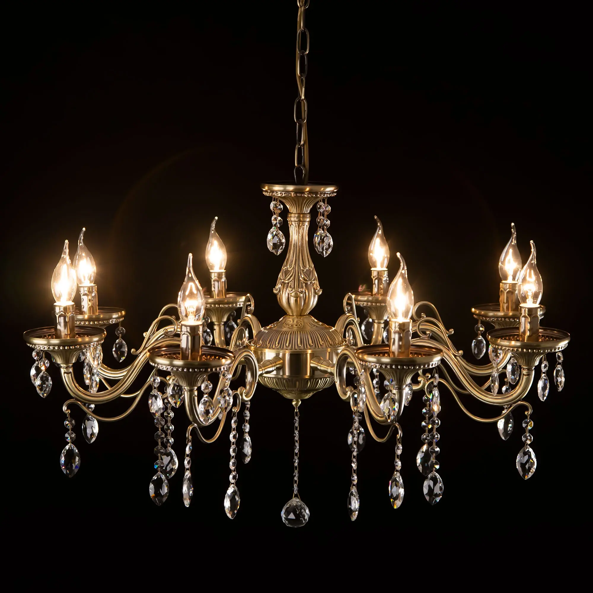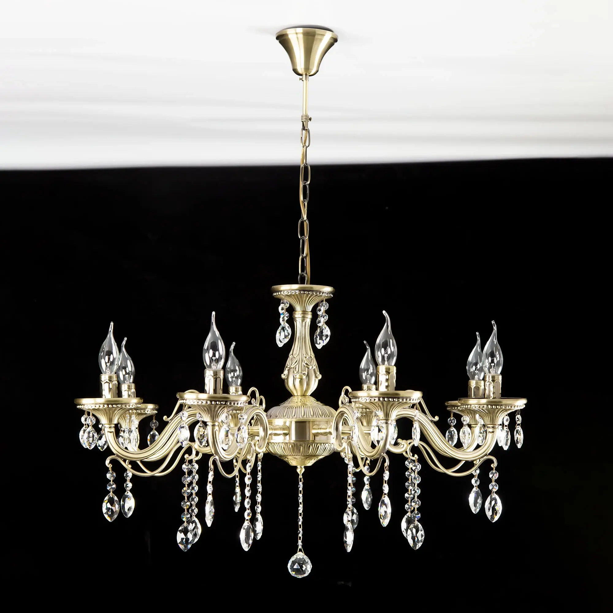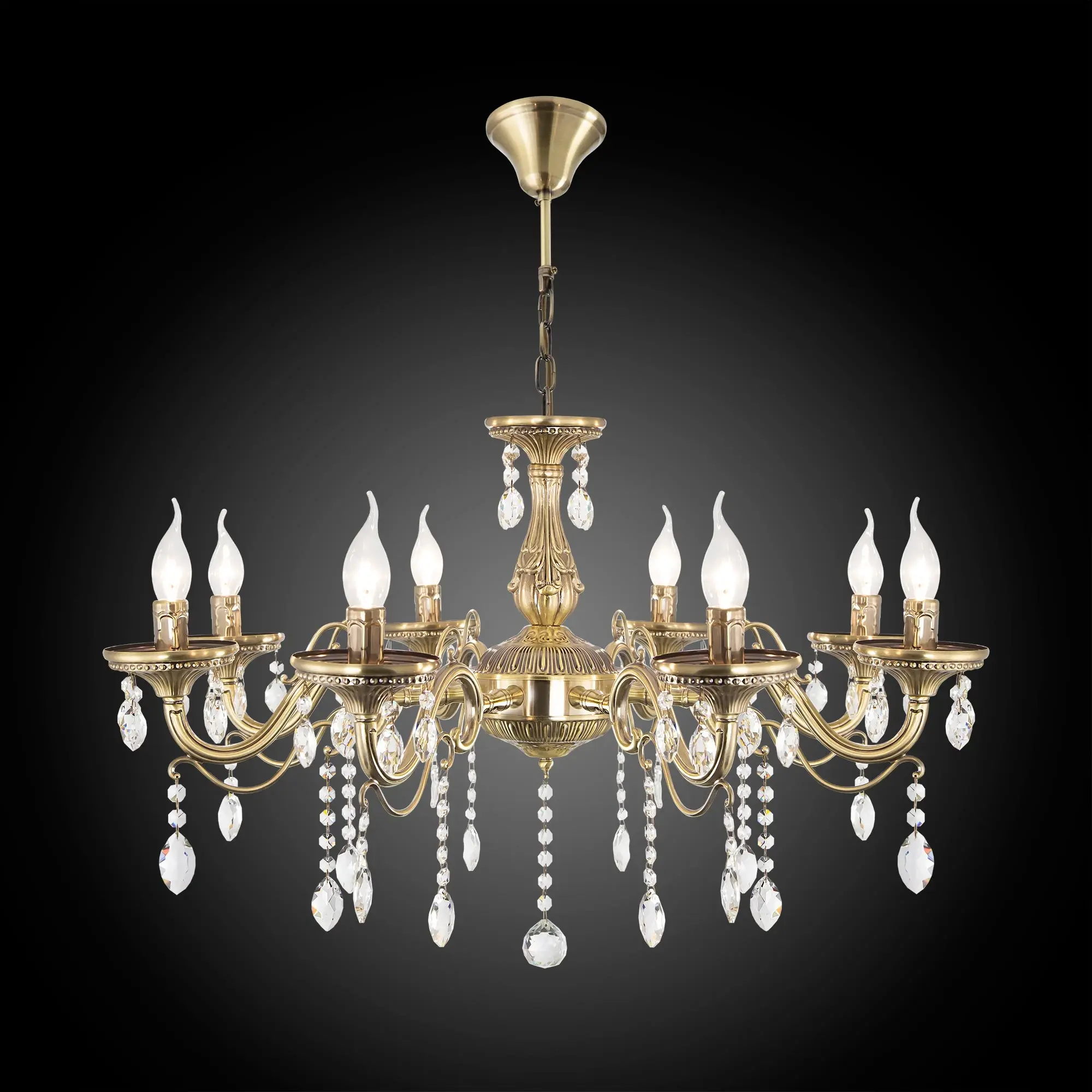 Люстра Ситилюкс Кармен CL404183 восьмирожковая, выполнена в классическом стиле. Корпус модели металлический, с литыми рожками, цвет бронза. Люстра украшена хрустальными подвесками с красивой огранкой. Модель отлично подойдет для помещений с высокими и низкими потолками, для этого нужно перед установкой отрегулировать длину подвесной цени. Более того, изделие можно скоммутировать для работы как с одноклавишным, так и с двухклавишным выключателем. Тип крепления к потолку – на крючок. В люстре используются восемь ламп с цоколем Е14 и максимальной мощностью для ламп накаливания 60Вт. Суммарная мощность 480Вт. Светодиодные лампы можно использовать большей яркости,