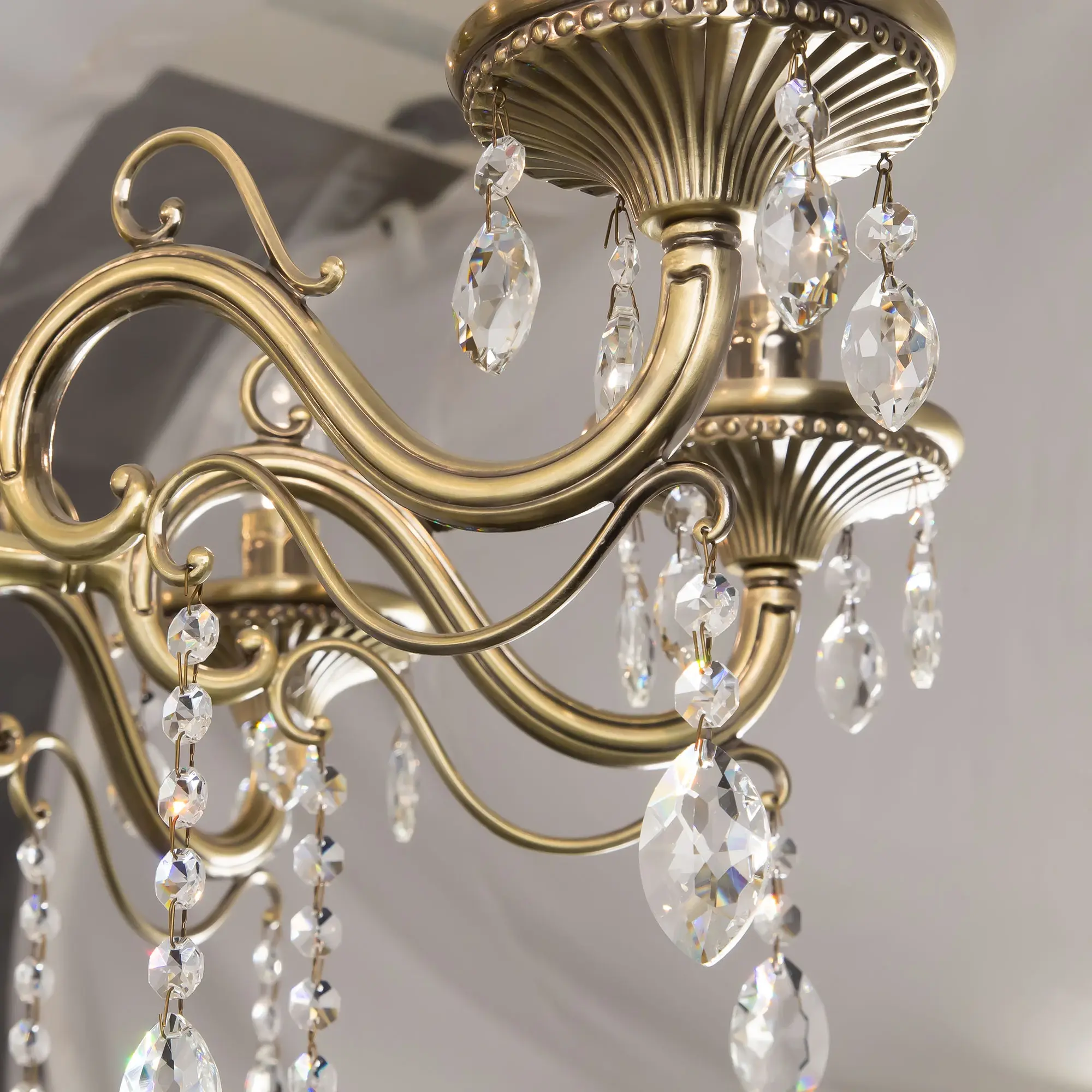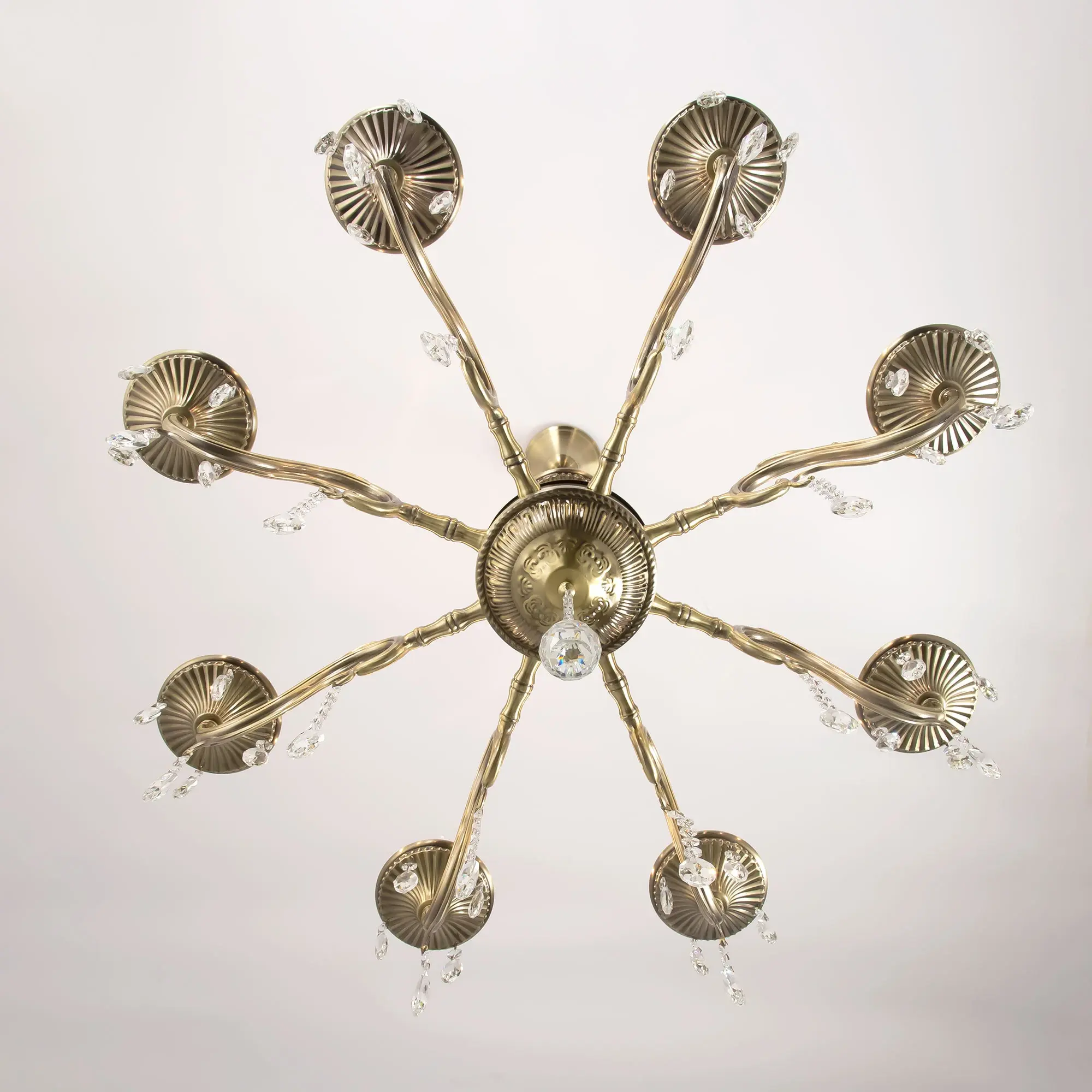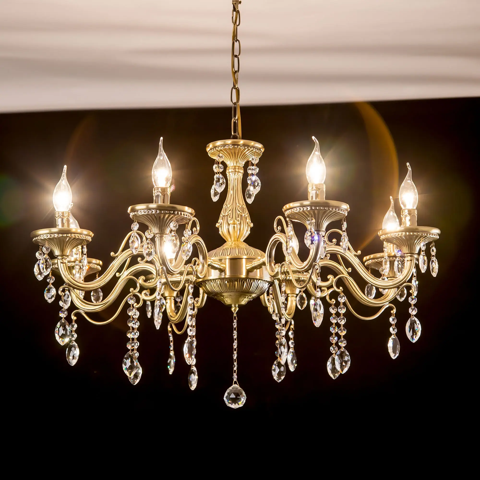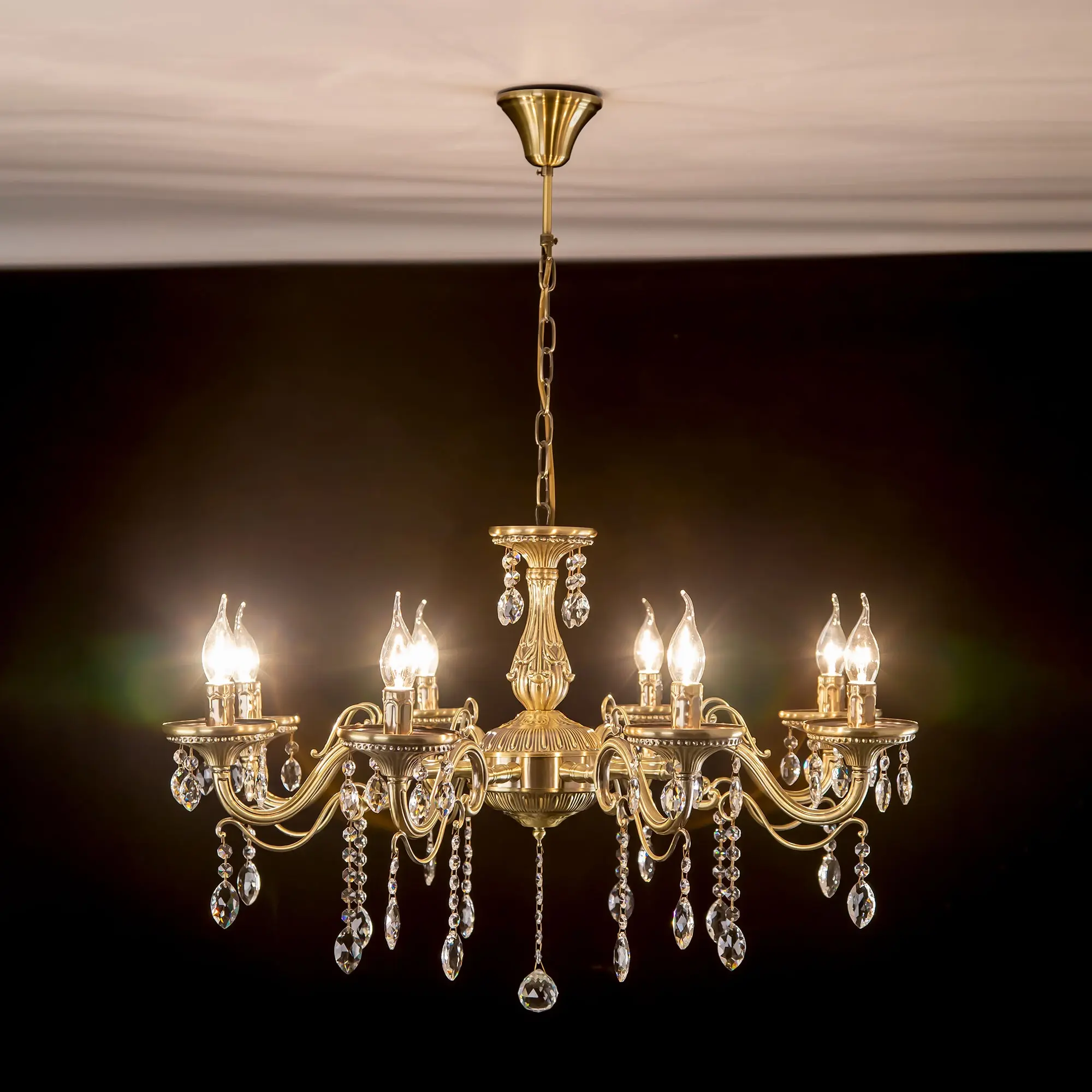 Люстра Ситилюкс Кармен CL404183 восьмирожковая, выполнена в классическом стиле. Корпус модели металлический, с литыми рожками, цвет бронза. Люстра украшена хрустальными подвесками с красивой огранкой. Модель отлично подойдет для помещений с высокими и низкими потолками, для этого нужно перед установкой отрегулировать длину подвесной цени. Более того, изделие можно скоммутировать для работы как с одноклавишным, так и с двухклавишным выключателем. Тип крепления к потолку – на крючок. В люстре используются восемь ламп с цоколем Е14 и максимальной мощностью для ламп накаливания 60Вт. Суммарная мощность 480Вт. Светодиодные лампы можно использовать большей яркости,