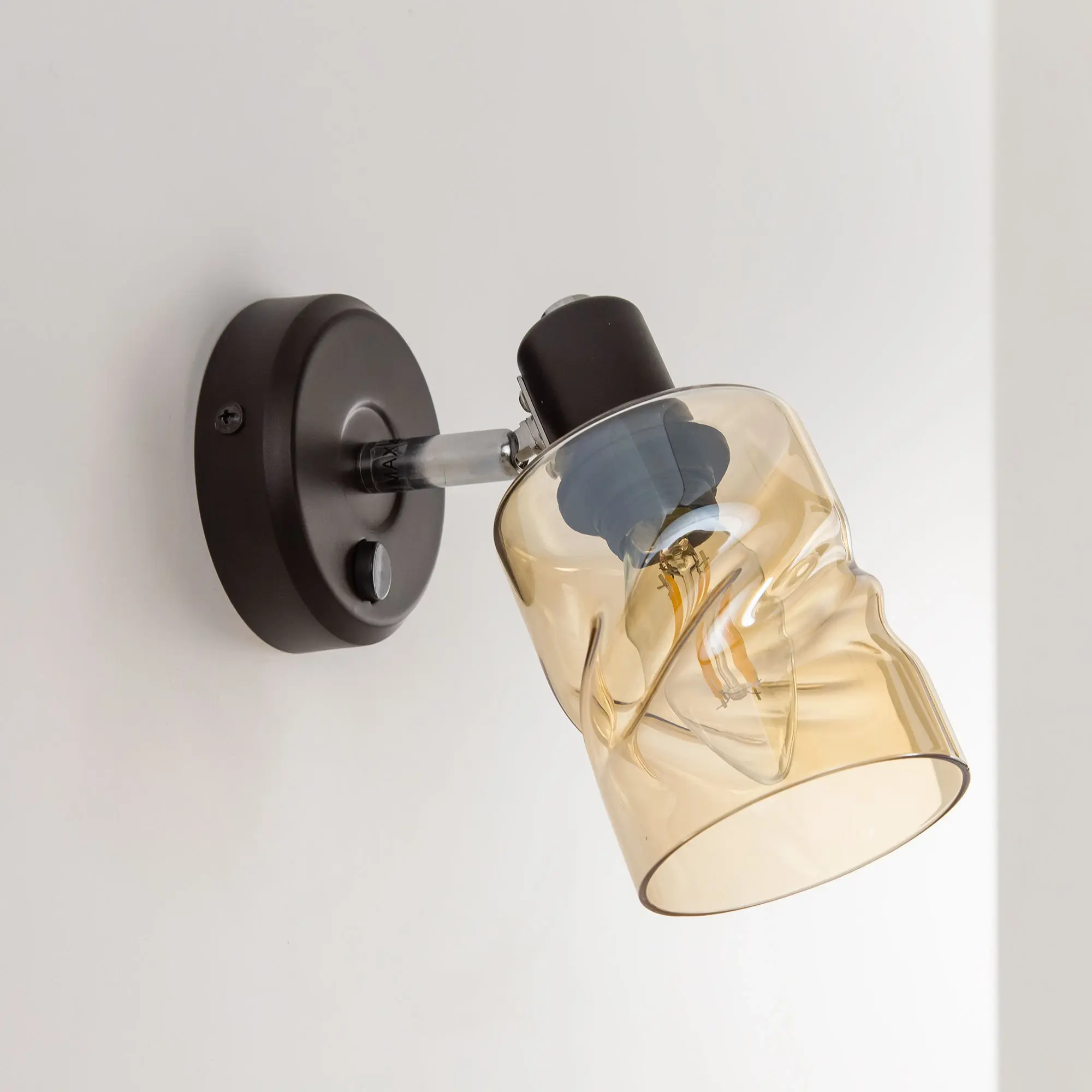 Металлический корпус коричневого цвета с хромированными элементами подчёркивает элегантность светильника. Оригинальный плафон цилиндрической формы из прозрачного светло-янтарного стекла обеспечивает приятное освещение. Поворотная конструкция плафона позволяет регулировать направление света.