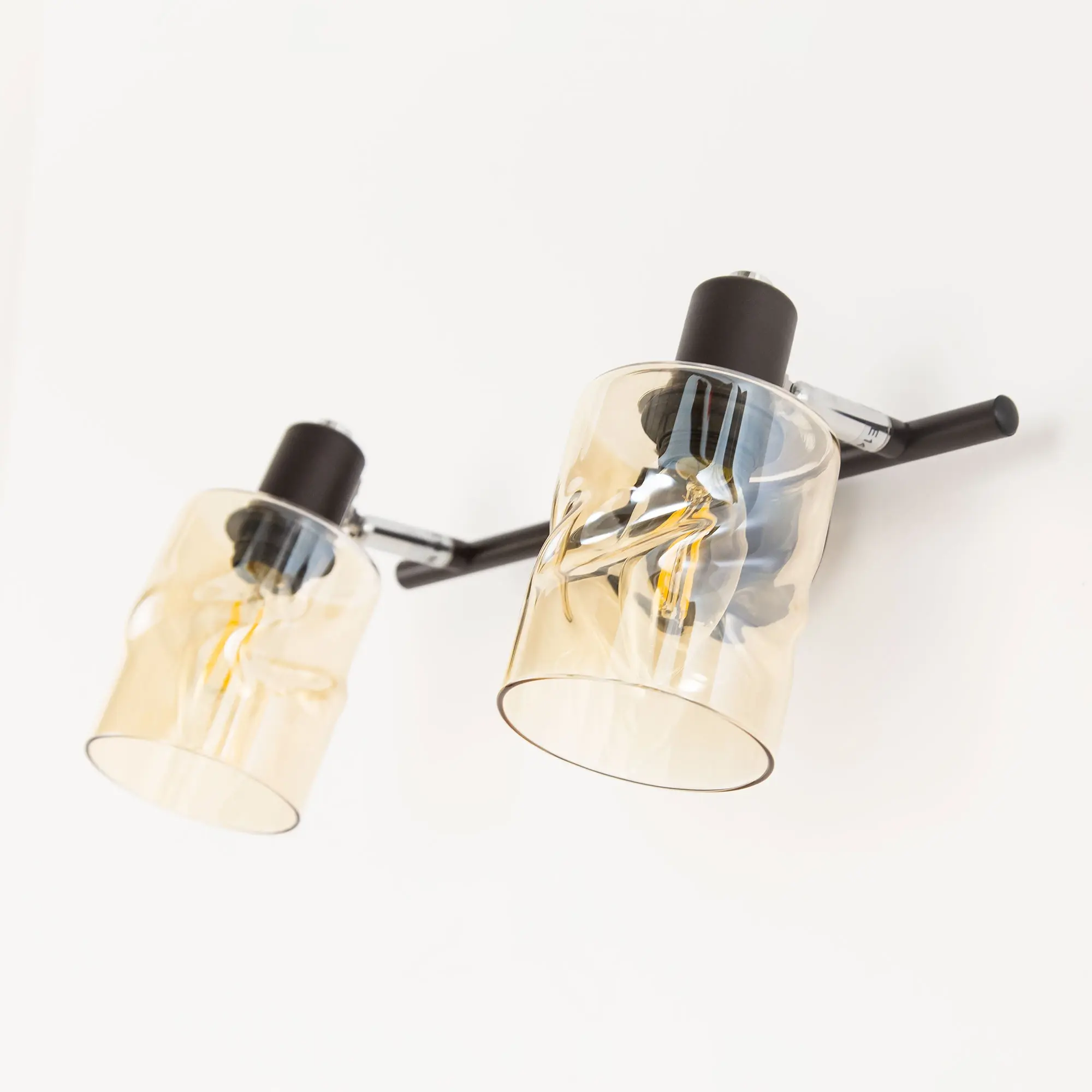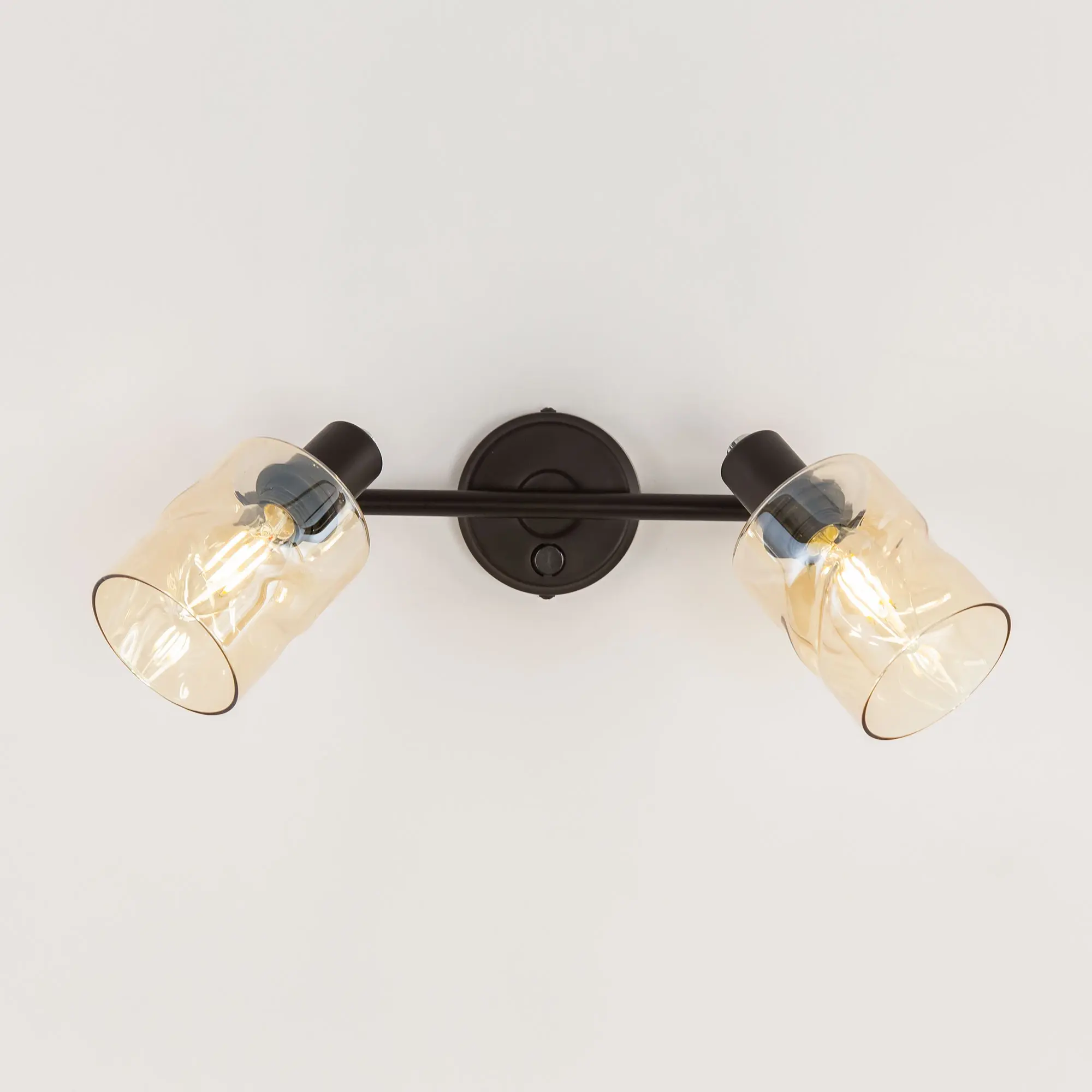 Металлический корпус коричневого цвета с хромированными элементами подчёркивает элегантность светильника. Оригинальные плафоны цилиндрической формы из прозрачного светло-янтарного стекла обеспечивают приятное освещение. Поворотная конструкция плафонов позволяет регулировать направление света.