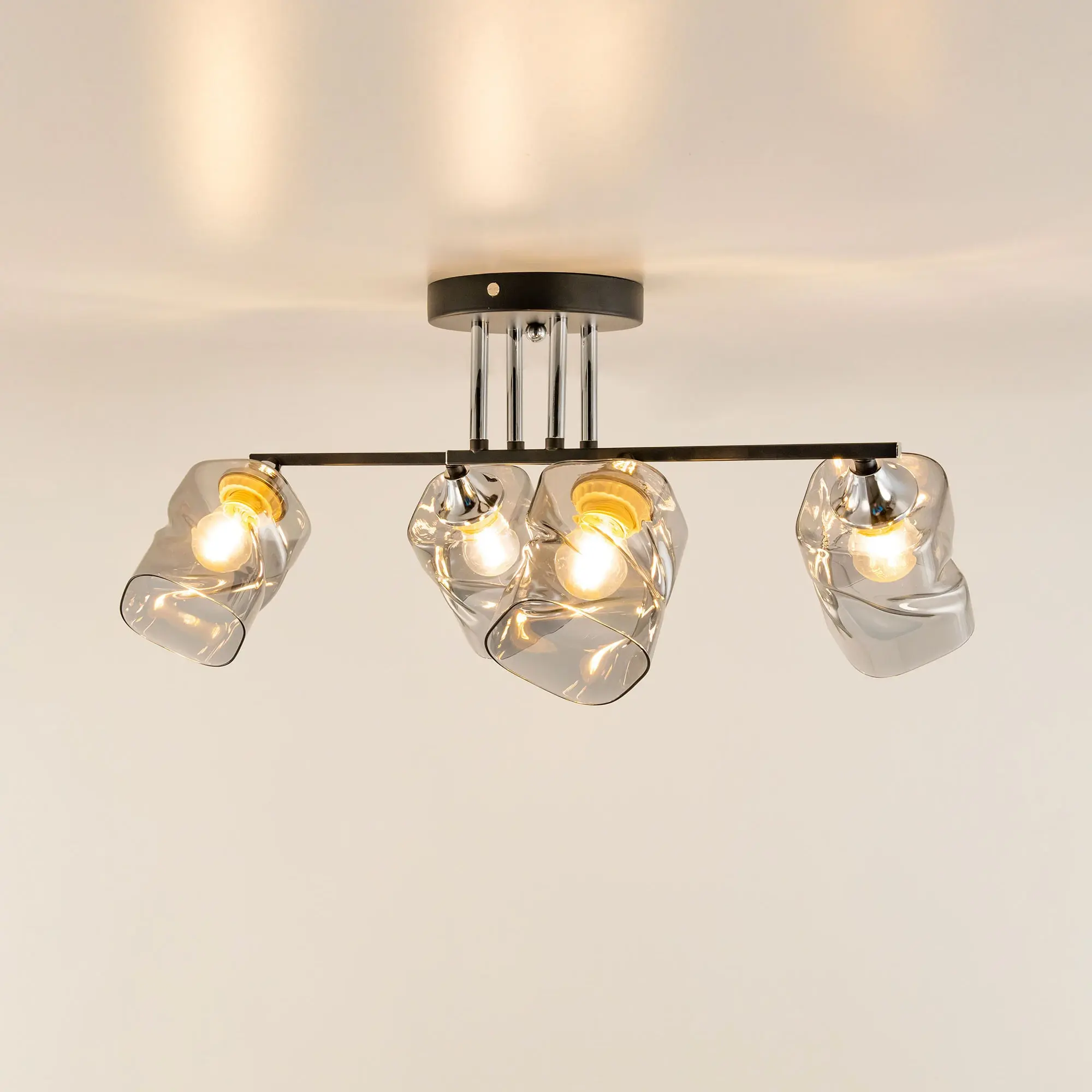 Современная потолочная люстра Citilux Клаус CL134145 для стильных интерьеров. Корпус светильника металлический, с рожками штангами. Основной цвет чёрный матовый, с декоративными хромированными элементами. Плафоны стеклянные, оригинальной формы, прозрачные, с дымчатой тонировкой. Люстру можно скоммутировать для работы как с одноклавишным, так и с двухклавишным выключателем. В изделии 4 лампы с цоколем Е27, максимальной мощностью для ламп накаливания 60Вт. Рекомендуем использовать светодиодные лампы. Подходит для всех типов потолков, в том числе натяжных. Тип крепления-планка. Прекрасный вариант для яркого освещения помещений с низкими потолками, площадью около 14м².