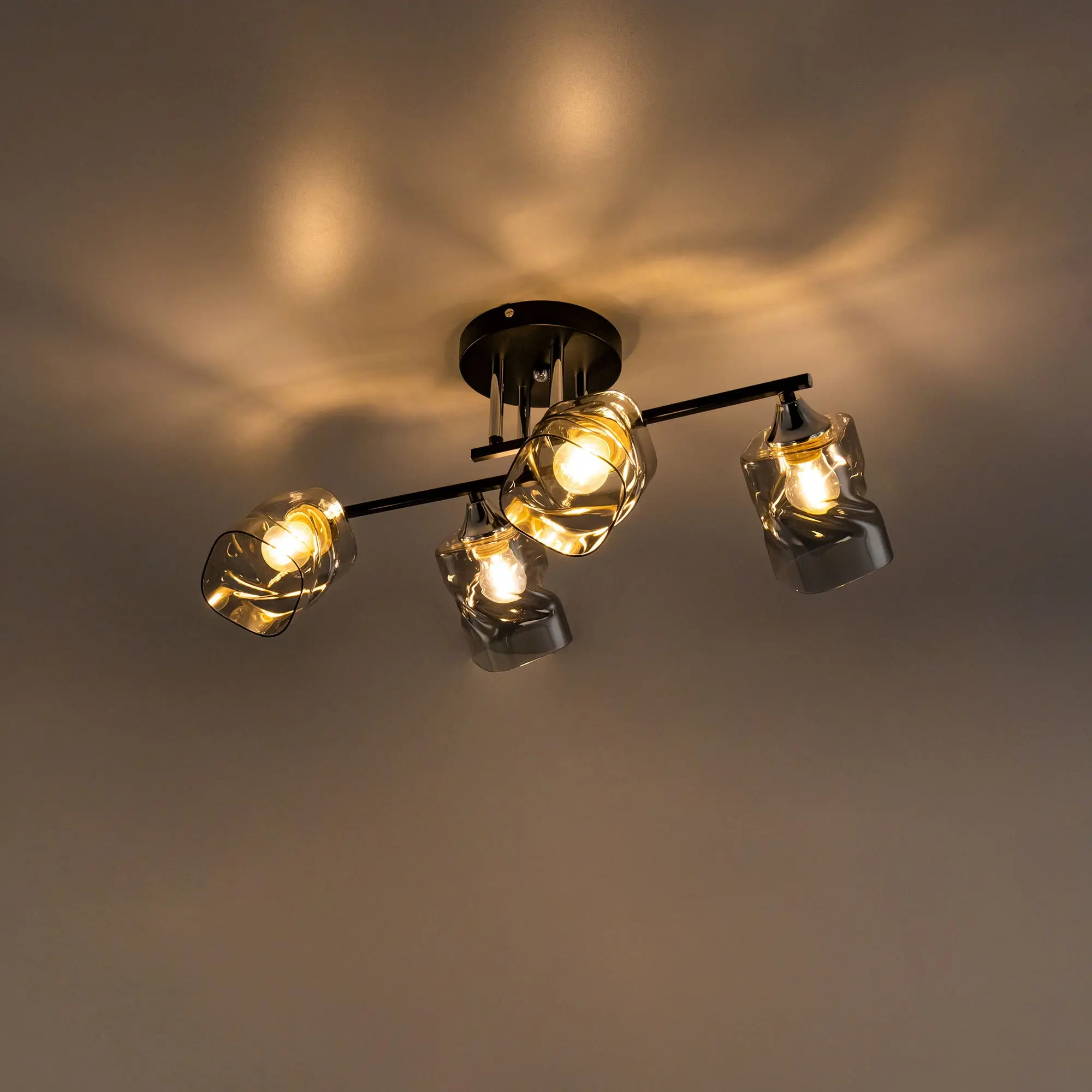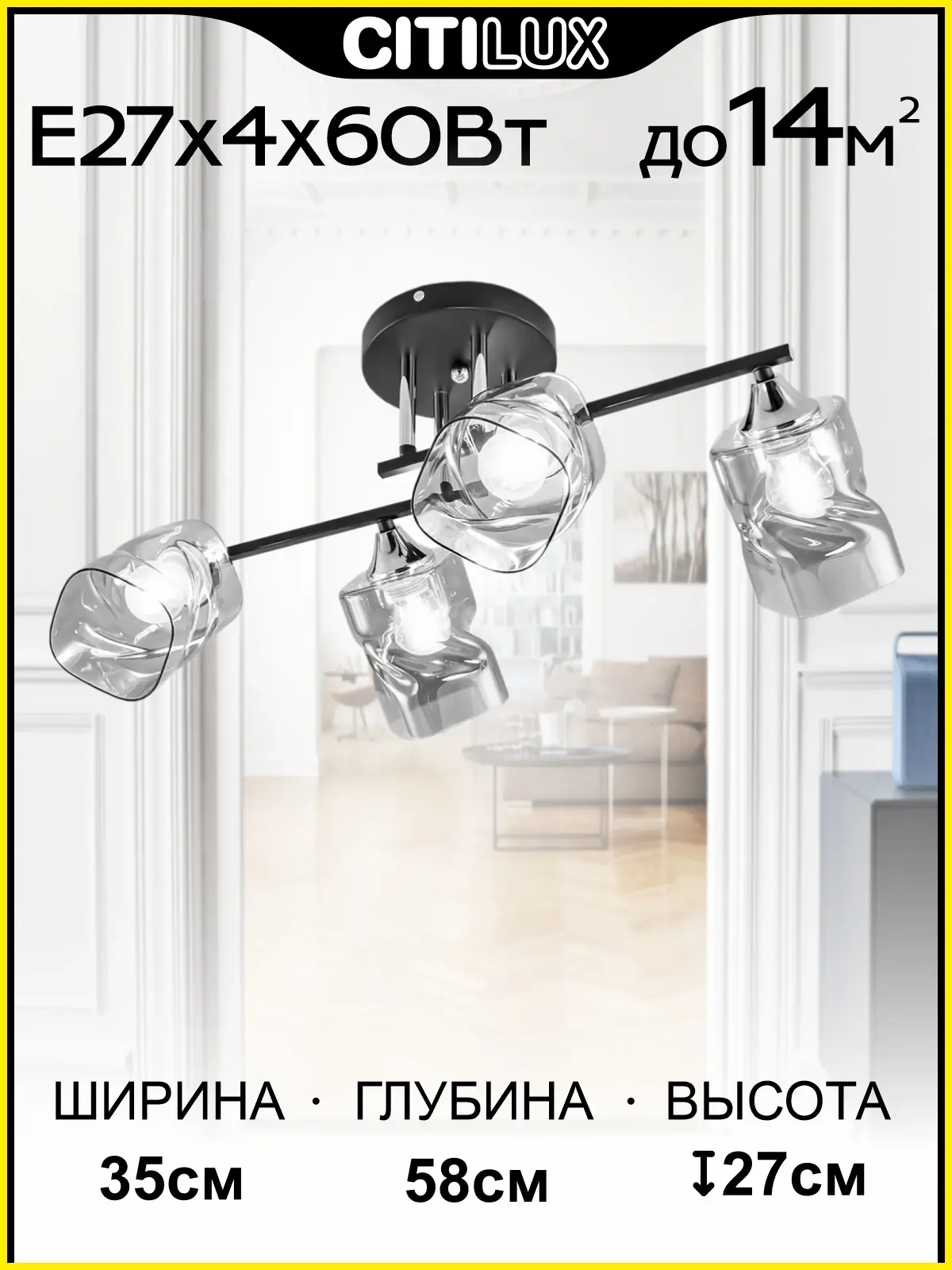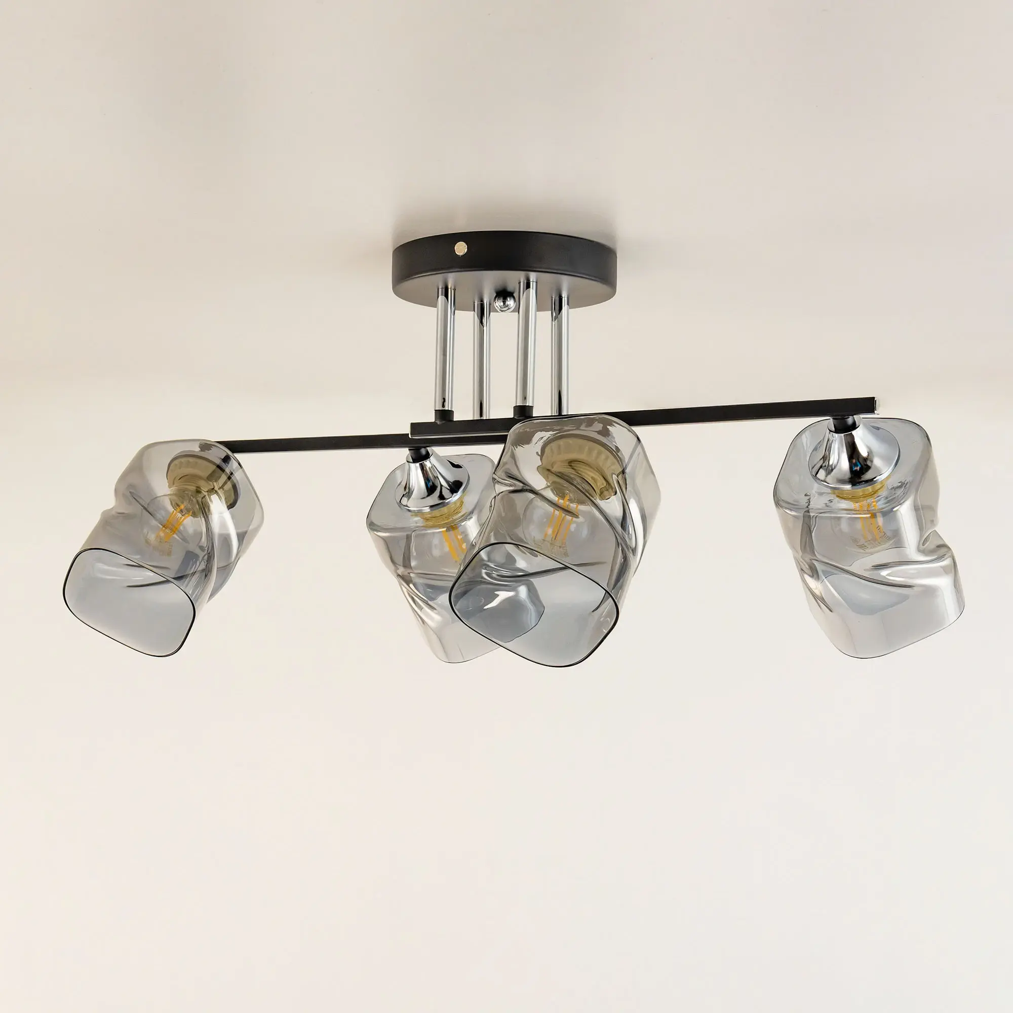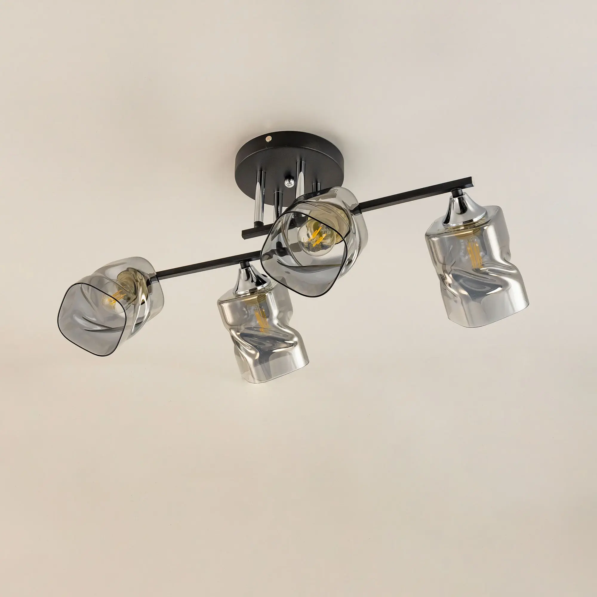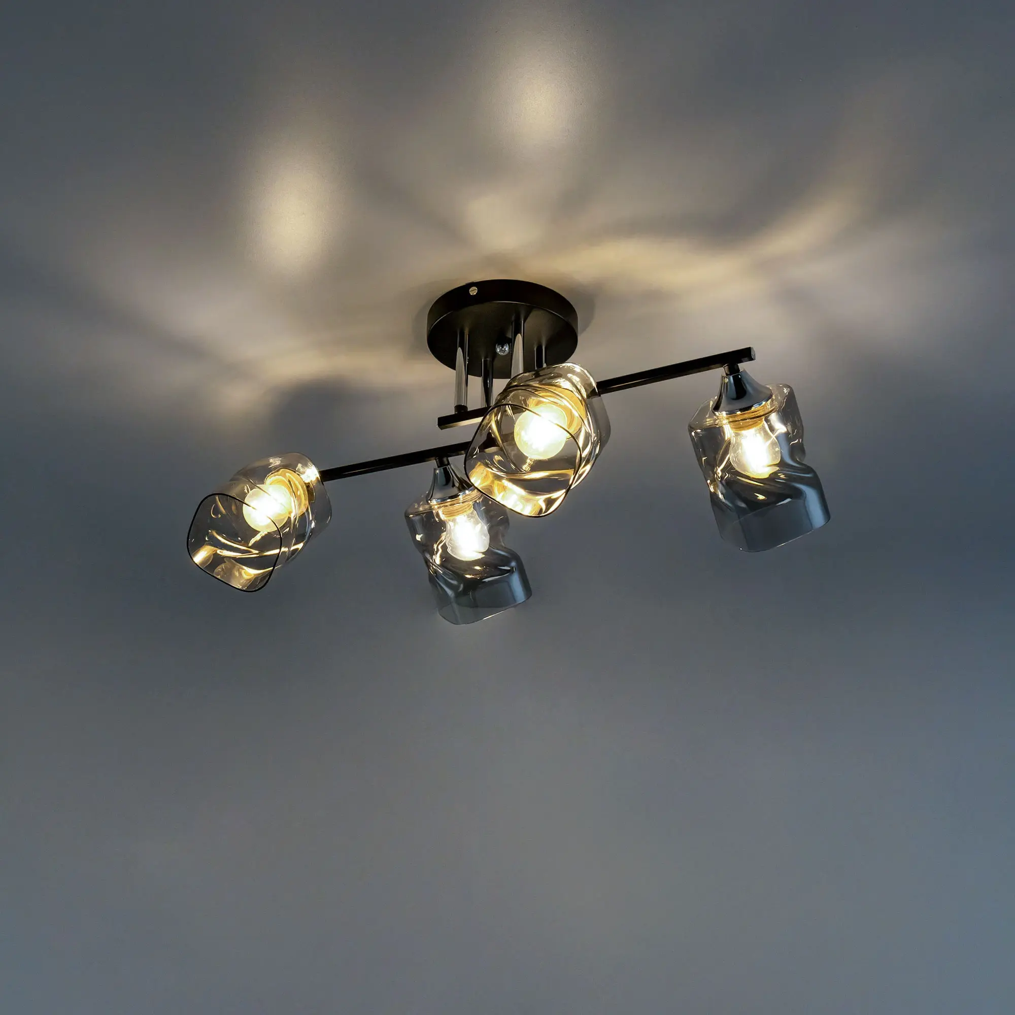 Современная потолочная люстра Citilux Клаус CL134145 для стильных интерьеров. Корпус светильника металлический, с рожками штангами. Основной цвет чёрный матовый, с декоративными хромированными элементами. Плафоны стеклянные, оригинальной формы, прозрачные, с дымчатой тонировкой. Люстру можно скоммутировать для работы как с одноклавишным, так и с двухклавишным выключателем. В изделии 4 лампы с цоколем Е27, максимальной мощностью для ламп накаливания 60Вт. Рекомендуем использовать светодиодные лампы. Подходит для всех типов потолков, в том числе натяжных. Тип крепления-планка. Прекрасный вариант для яркого освещения помещений с низкими потолками, площадью около 14м².,