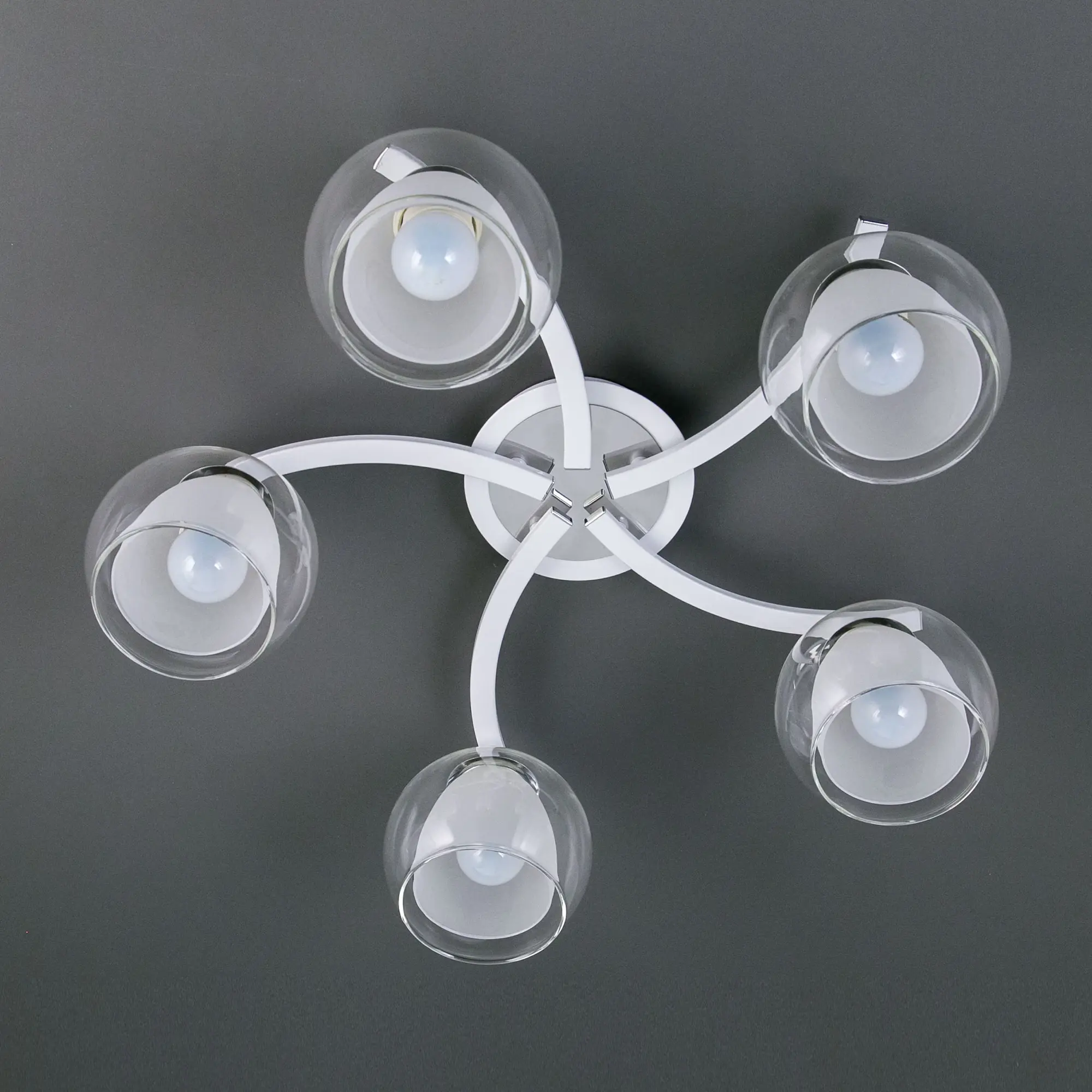 В изделии 5 ламп с цоколем Е27 максимальной мощностью для ламп накаливания 75Вт (в комплект не входят, приобретаются отдельно). Светильник совместим как с одноклавишными, так и с двухклавишными выключателями, обеспечивая удобство использования. Благодаря своей конструкции подходит для различных типов потолков, включая натяжные, тип крепления – планка. Диаметр модели 54см, высота 19см, осветит до 18м².