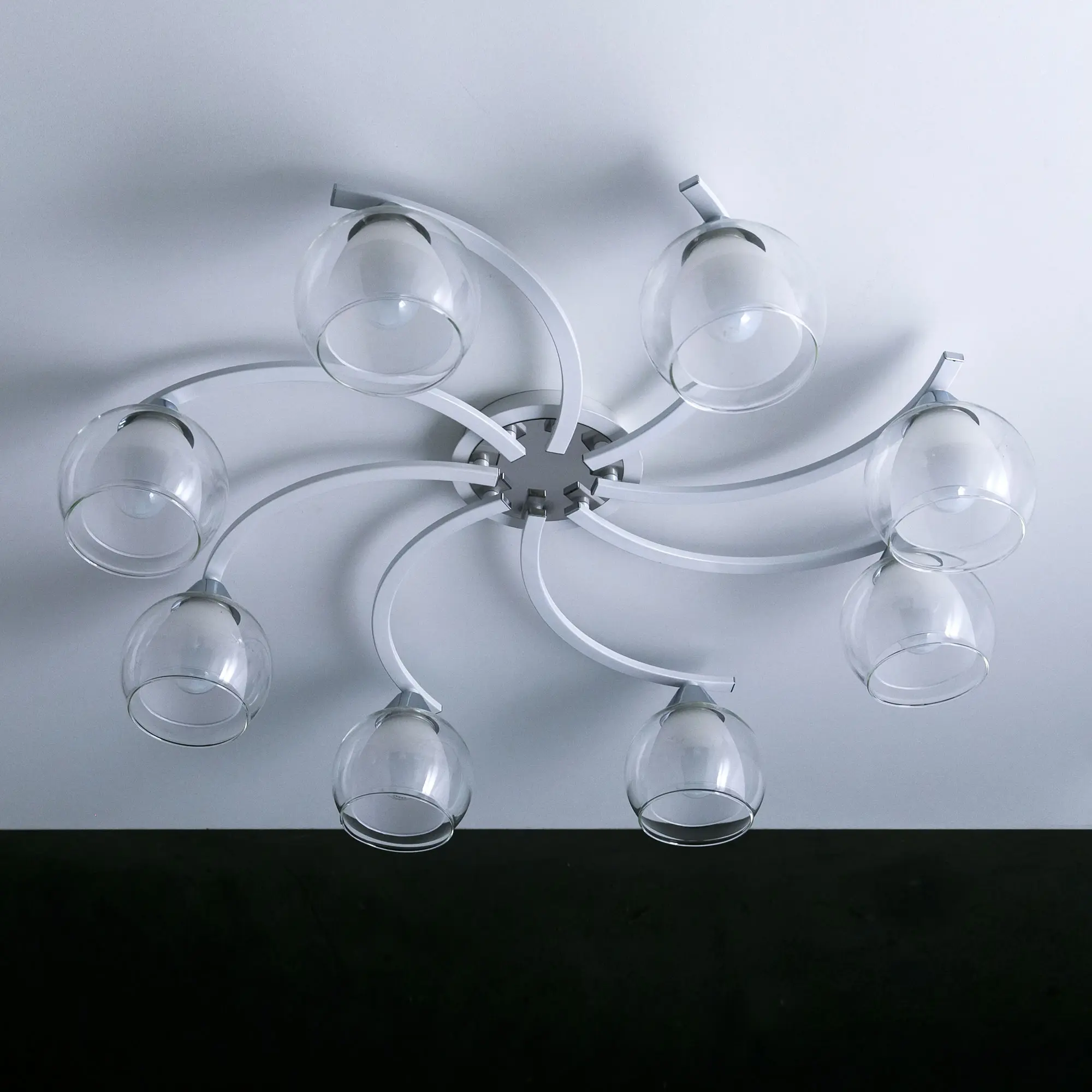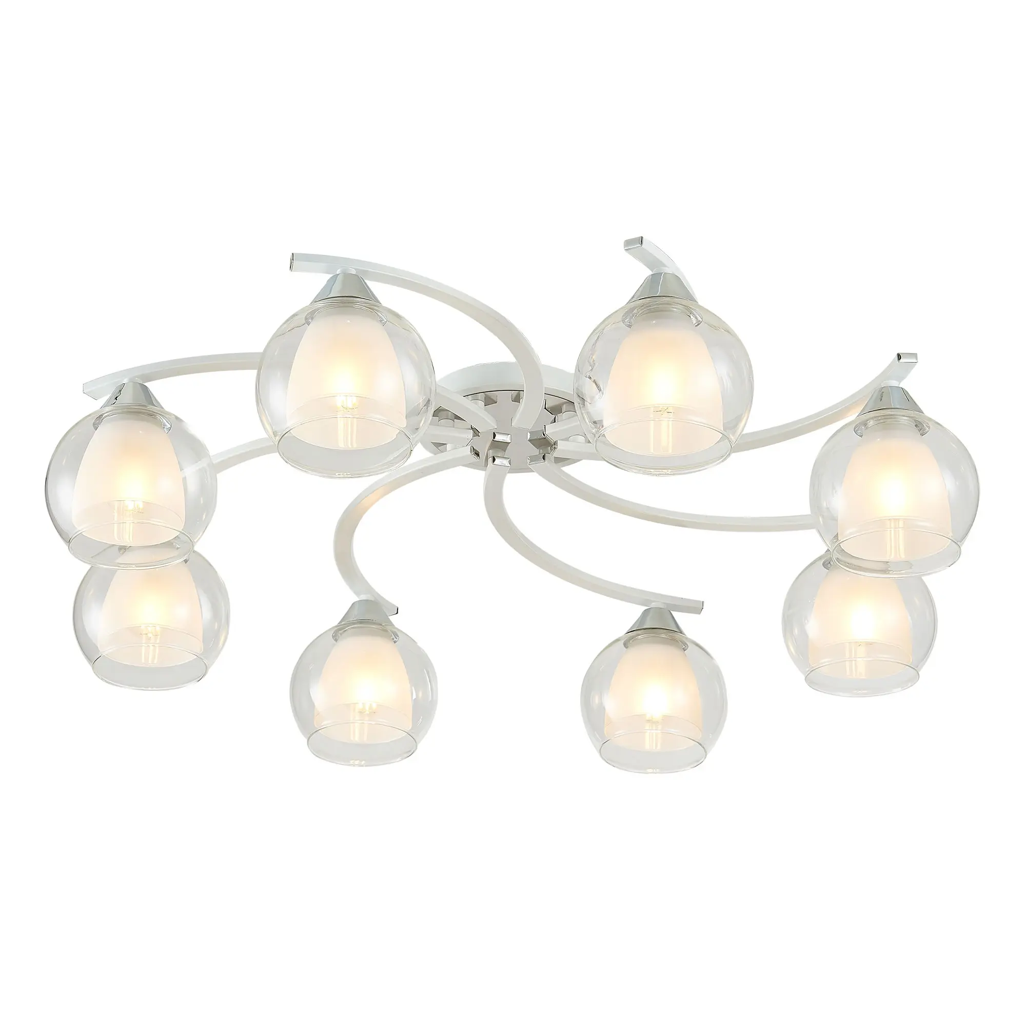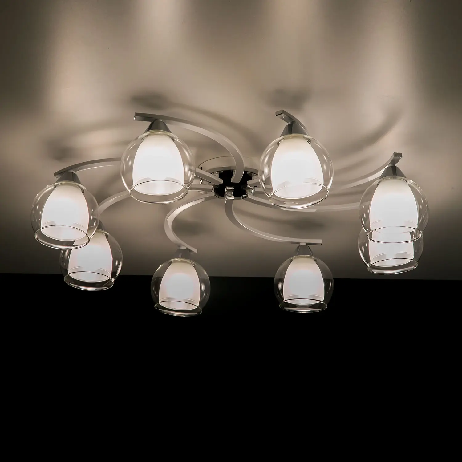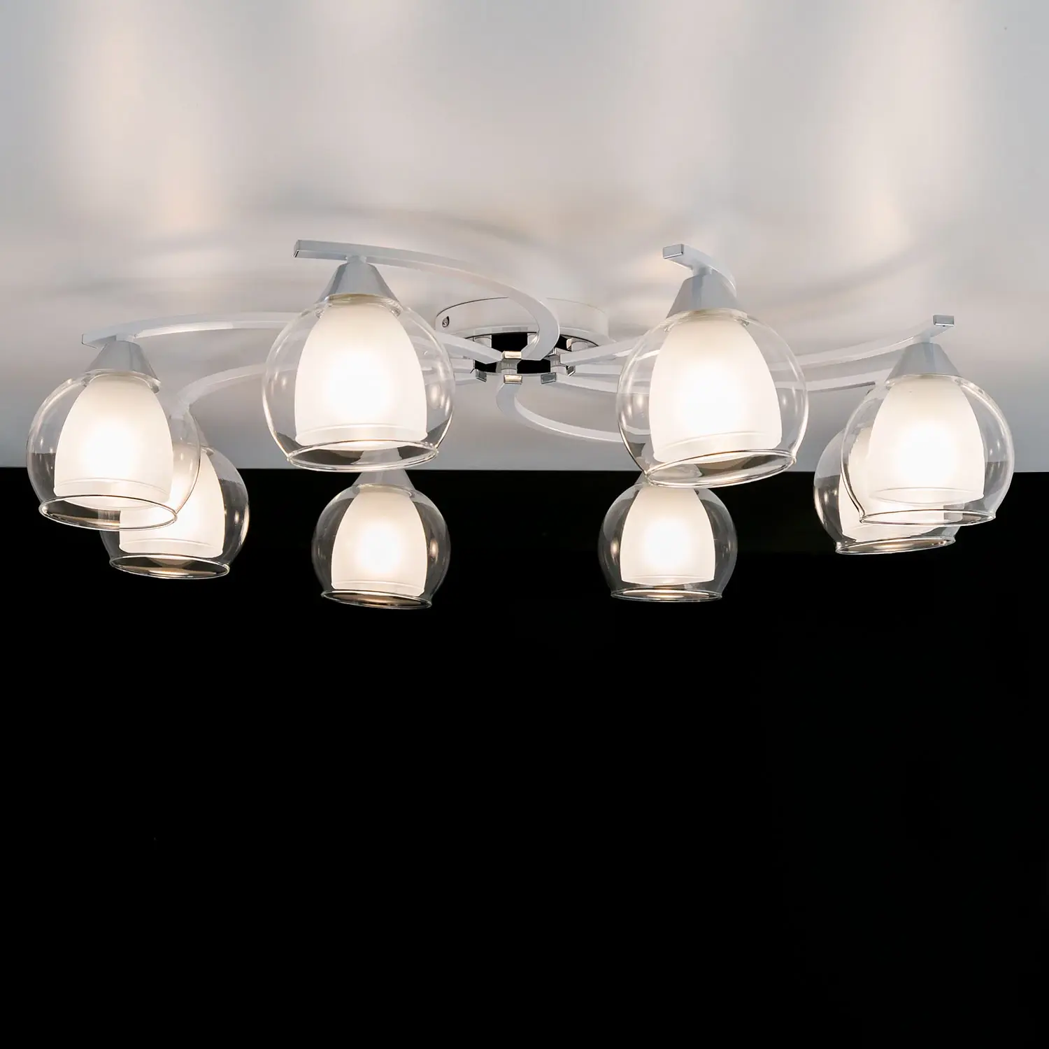 Главной изюминкой этой люстры являются оригинальные плафоны, имеющие форму усеченного шара. Они изготовлены из двух типов стекла: внутренняя часть плафона полуматовая, а внешняя - прозрачная. Такое сочетание позволяет создать приятное рассеянное освещение, сохраняя при этом высокую светопроницаемость.