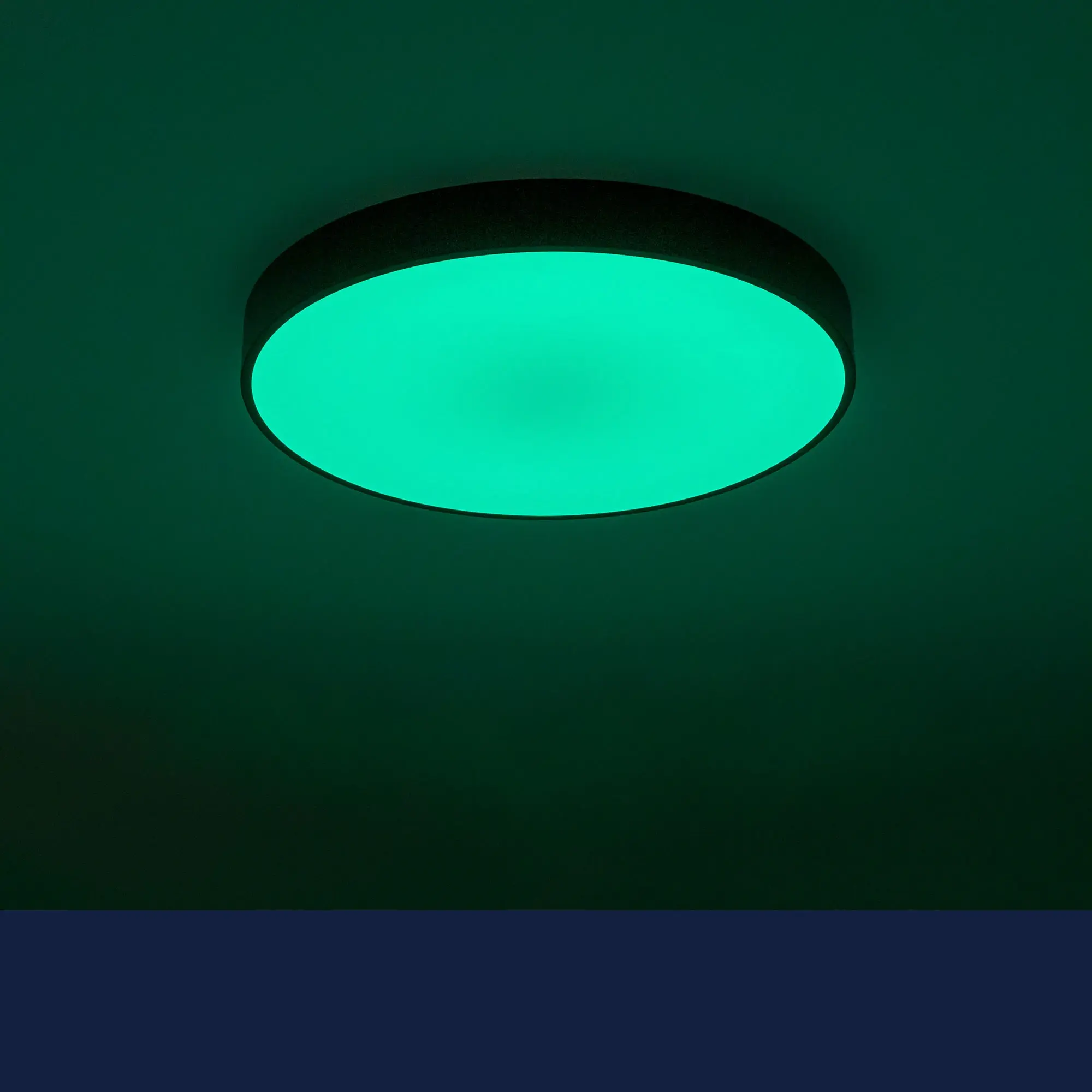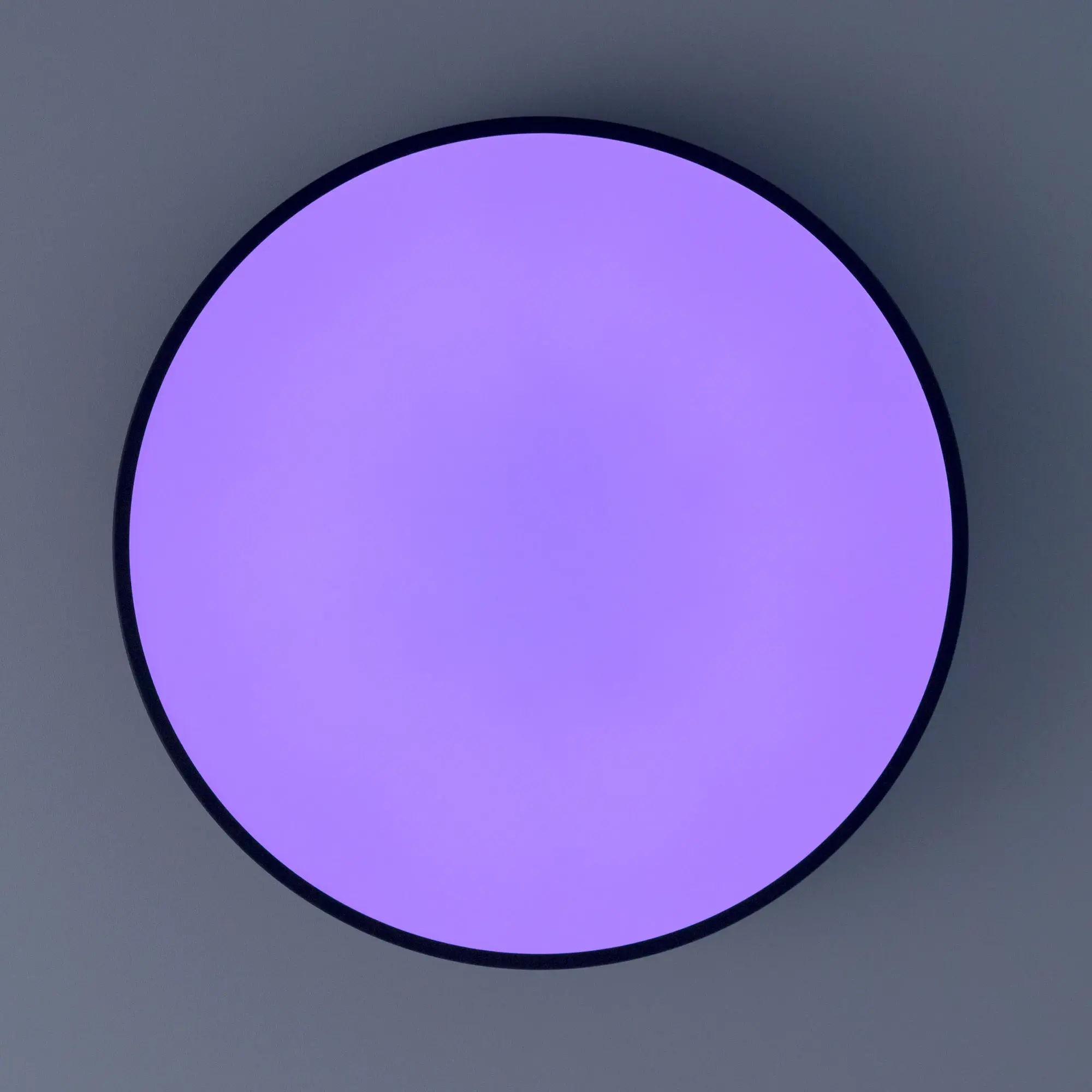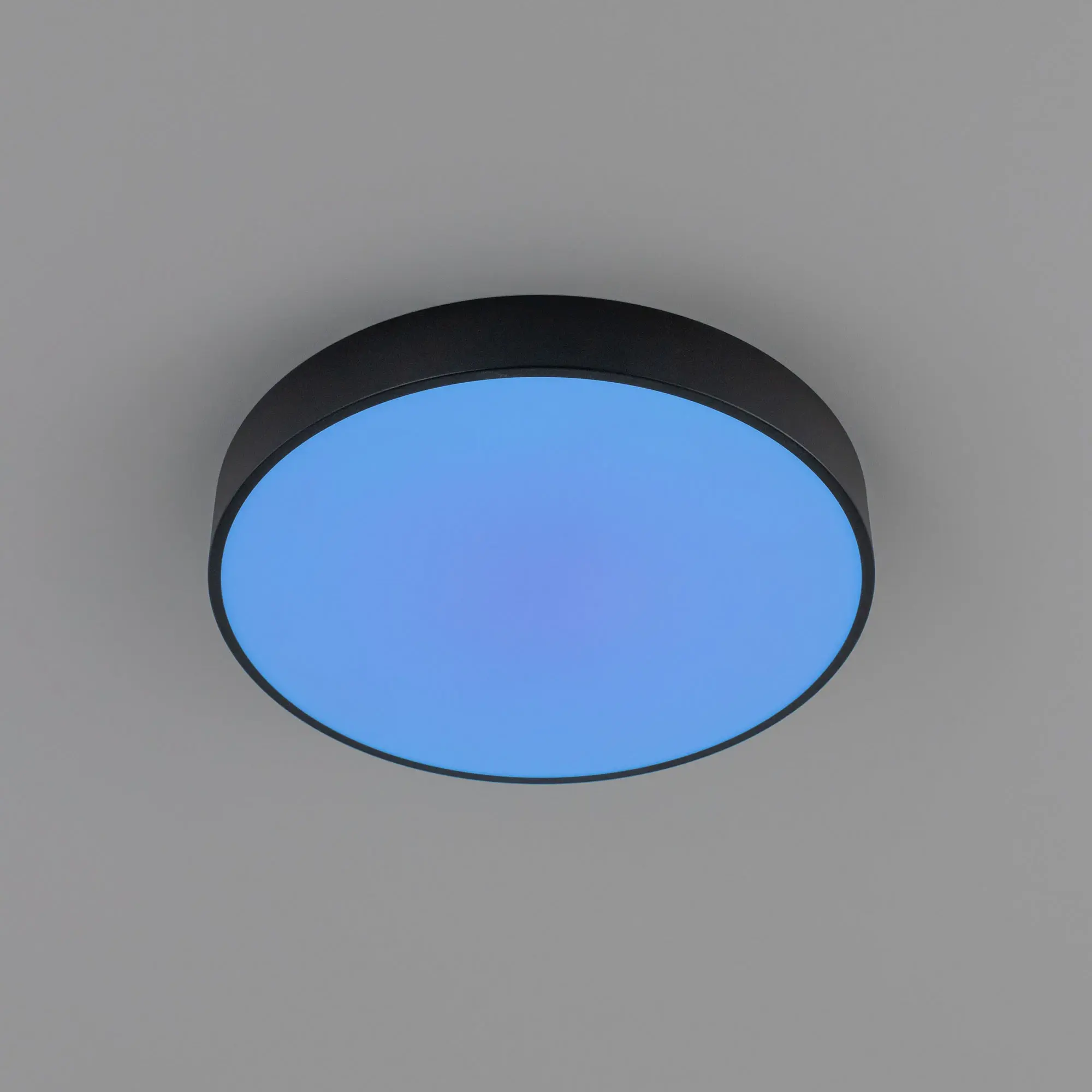 Светодиодный потолочный светильник Citilux Купер CL72470G1 с яркой цветной RGB подсветкой всего плафона. Корпус металлический, круглой формы, цвет чёрный матовый. Рассеиватель из оптического полимера. Мощность 70Вт, световой поток 5600Лм. С помощью пульта дистанционного управления доступна плавная регулировка яркости от 100 до 10%, управление цветовой температурой доступно в диапазоне от 3000К до 5500К, что позволяет настроить любые оттенки теплого, нейтрального или холодного света. Цветная RGB подсветка имеет различные режимы работы. Таймер - функция отсроченного на 20сек. выключения. Четыре кнопки памяти позволяют сохранить настроенные режимы работы и включать их пультом или обычным настенным выключателем. Подходит для всех типов потолков, в том числе натяжных. Тип крепления – через основание. Изделие комплектуется инфракрасным пультом ДУ, тип батареек ААА (батарейки в комплект не входят),