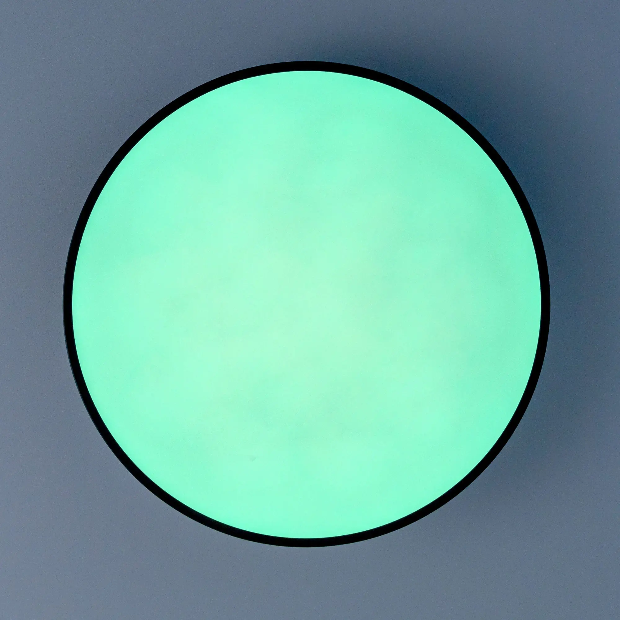 Светодиодный потолочный светильник Citilux Купер CL72470G1 с яркой цветной RGB подсветкой всего плафона. Корпус металлический, круглой формы, цвет чёрный матовый. Рассеиватель из оптического полимера. Мощность 70Вт, световой поток 5600Лм. С помощью пульта дистанционного управления доступна плавная регулировка яркости от 100 до 10%, управление цветовой температурой доступно в диапазоне от 3000К до 5500К, что позволяет настроить любые оттенки теплого, нейтрального или холодного света. Цветная RGB подсветка имеет различные режимы работы. Таймер - функция отсроченного на 20сек. выключения. Четыре кнопки памяти позволяют сохранить настроенные режимы работы и включать их пультом или обычным настенным выключателем. Подходит для всех типов потолков, в том числе натяжных. Тип крепления – через основание. Изделие комплектуется инфракрасным пультом ДУ, тип батареек ААА (батарейки в комплект не входят).,