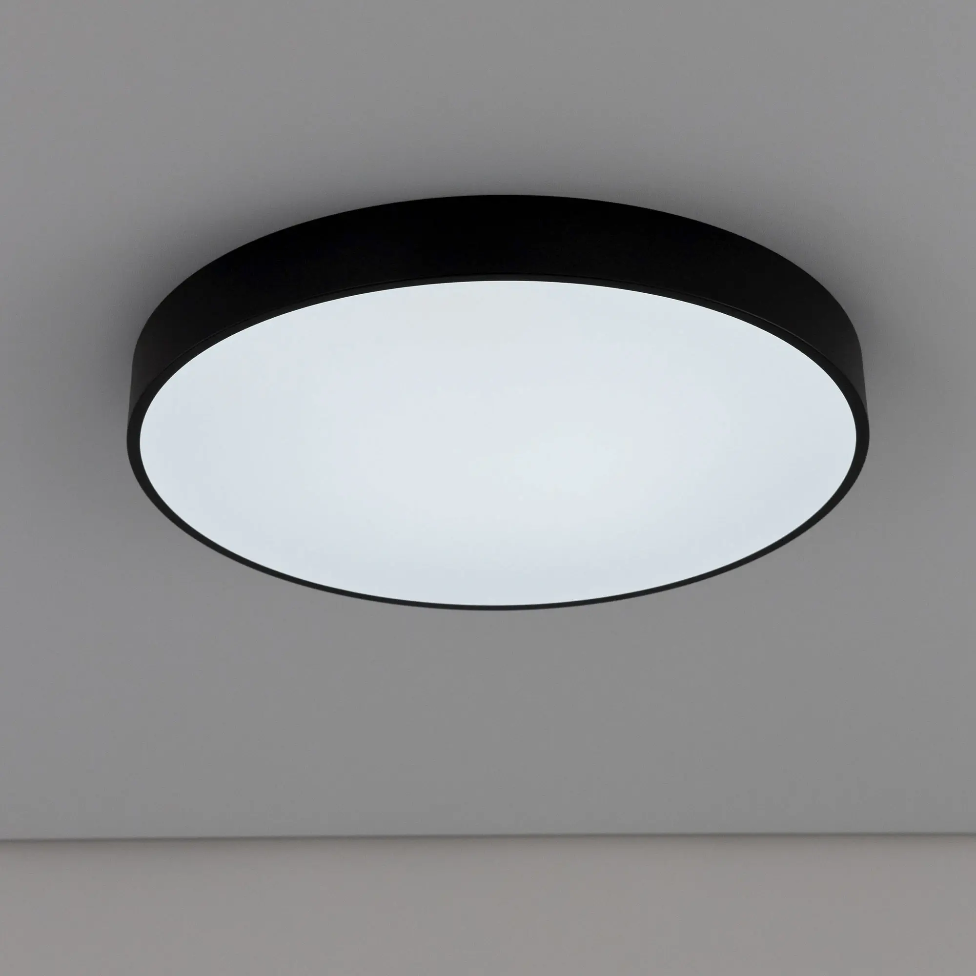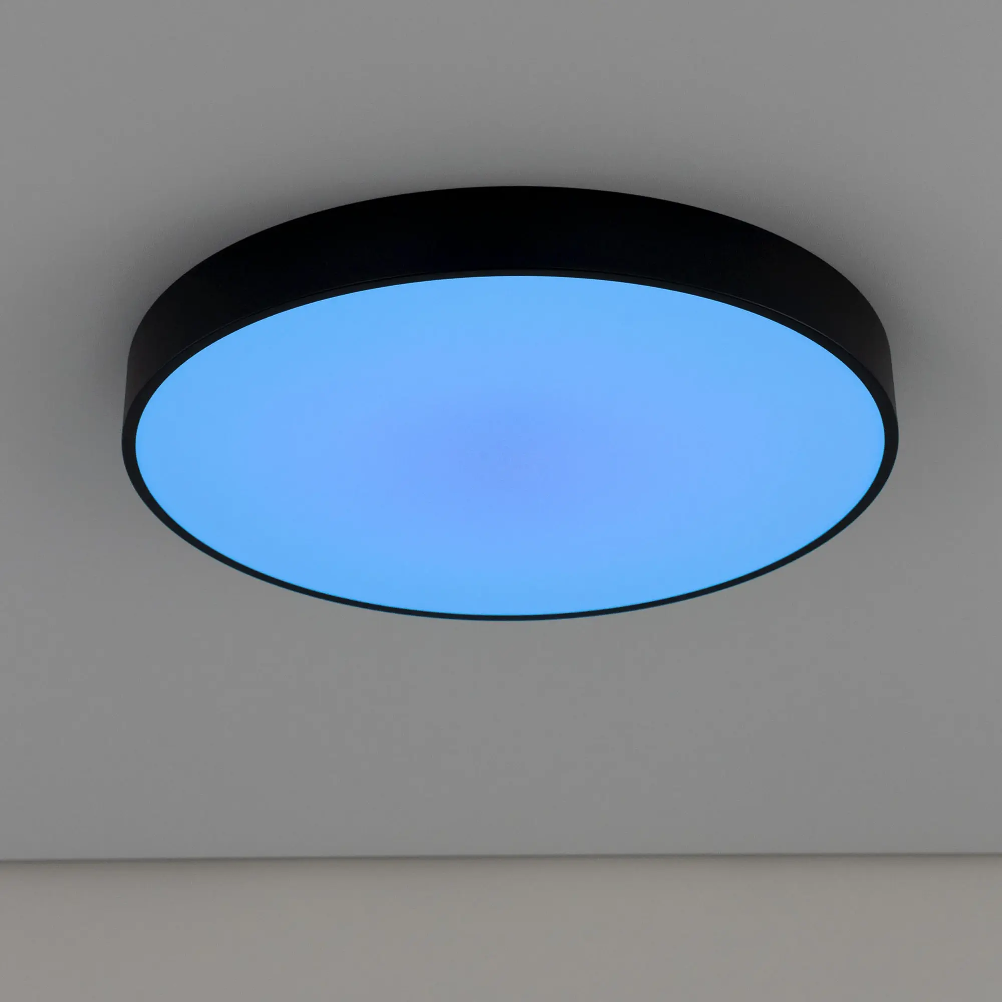 Светодиодный потолочный светильник Citilux Купер CL72495G1 с яркой цветной RGB подсветкой всего плафона. Корпус металлический, круглой формы, цвет чёрный матовый. Рассеиватель из оптического полимера. Мощность 95Вт, световой поток 7600Лм. С помощью пульта дистанционного управления доступна плавная регулировка яркости от 100 до 10%, управление цветовой температурой доступно в диапазоне от 3000К до 5500К, что позволяет настроить любые оттенки теплого, нейтрального или холодного света. Цветная RGB подсветка имеет различные режимы работы. Таймер - функция отсроченного на 20сек. выключения. Четыре кнопки памяти позволяют сохранить настроенные режимы работы и включать их пультом или обычным настенным выключателем. Подходит для всех типов потолков, в том числе натяжных. Тип крепления – через основание. Изделие комплектуется инфракрасным пультом ДУ, тип батареек ААА (батарейки в комплект не входят),