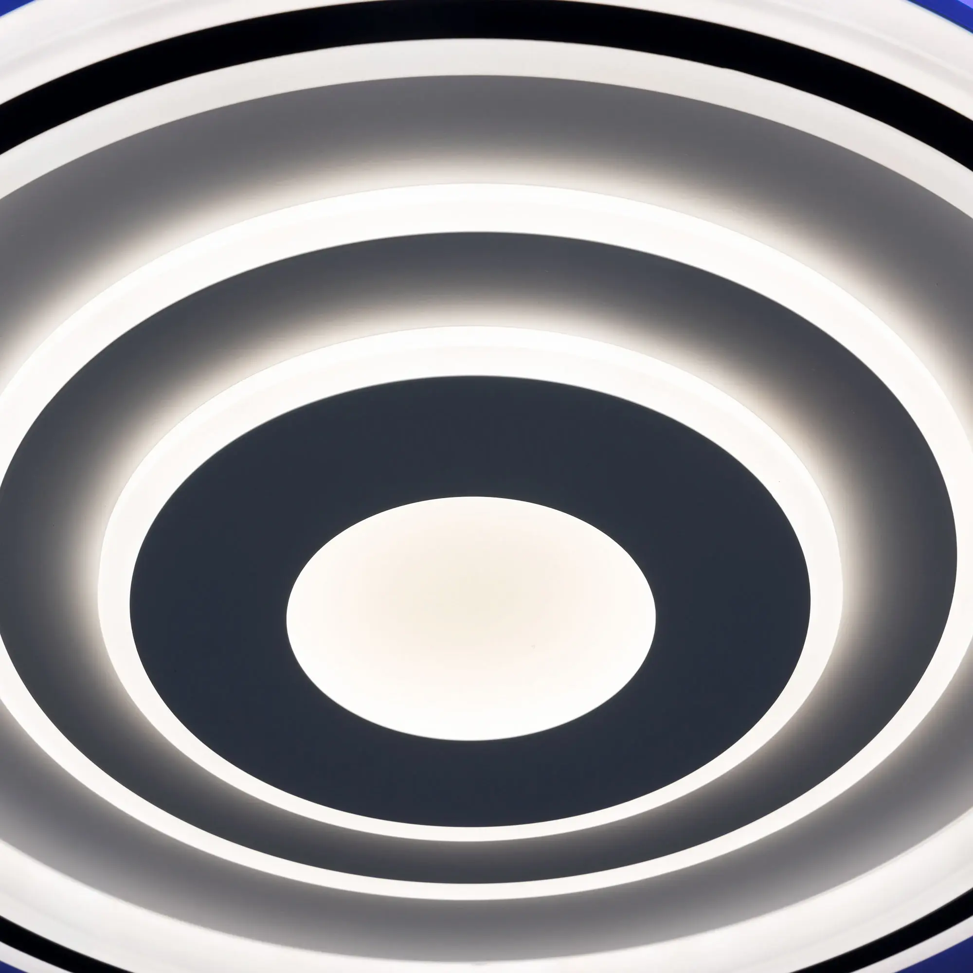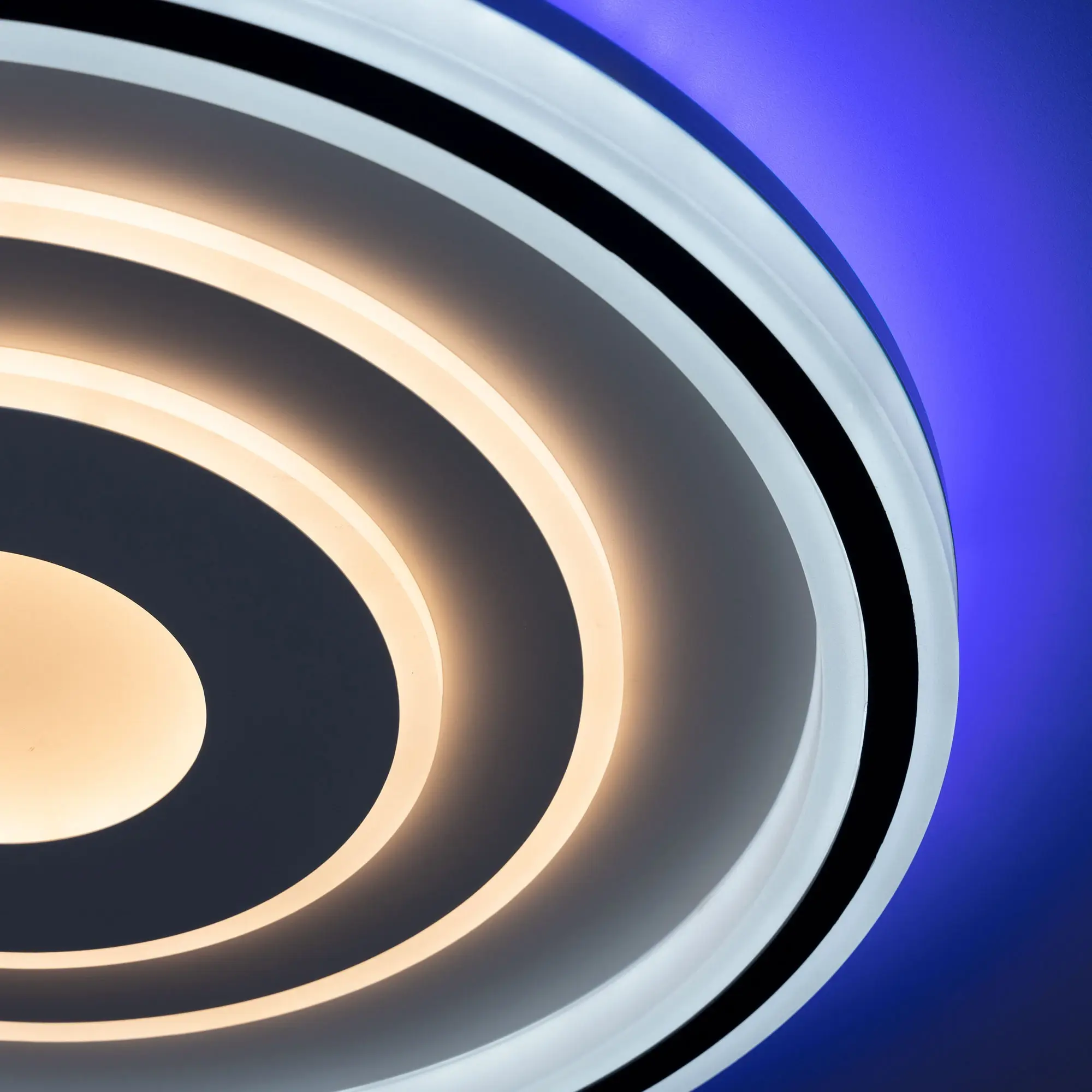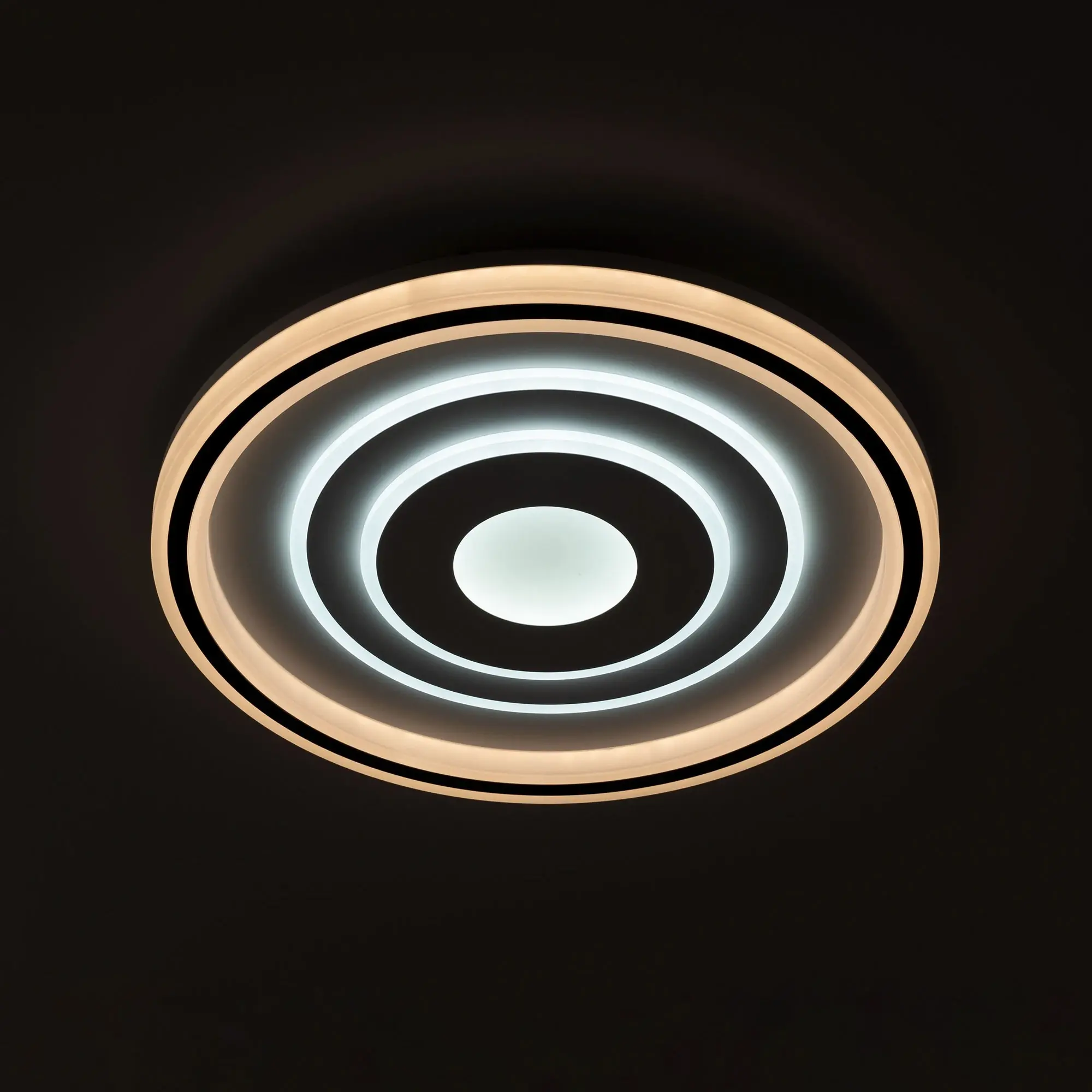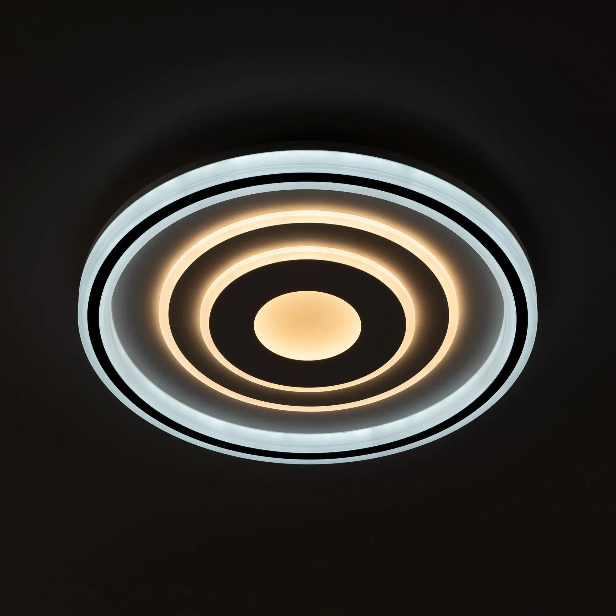 Светодиодная потолочная люстра Citilux Квест CL739190E с RGB подсветкой и пультом дистанционного управления. Основание белого цвета, со стильной чёрной окантовкой. Три светодиодных модуля плафона, формирующих внешний вид люстры, имеют круглую форму. Люстрой можно управлять с помощью пульта дистанционного управления и настенным выключателем. Изделие оснащено яркими светодиодами, с возможностью плавной регулировки яркости от 10% до 100%. Цветовая температура регулируется в диапазоне от 3000К до 5500К, позволяя настроить любые оттенки теплого, нейтрального или холодного света, без мерцания и пульсаций. Есть настраиваемые режимы памяти и таймер выключения. Модель подходит для всех типов потолков, в том числе натяжных, тип крепления – планка. Пульт ДУ в комплекте, тип батареек ААА (батарейками не комплектуется)