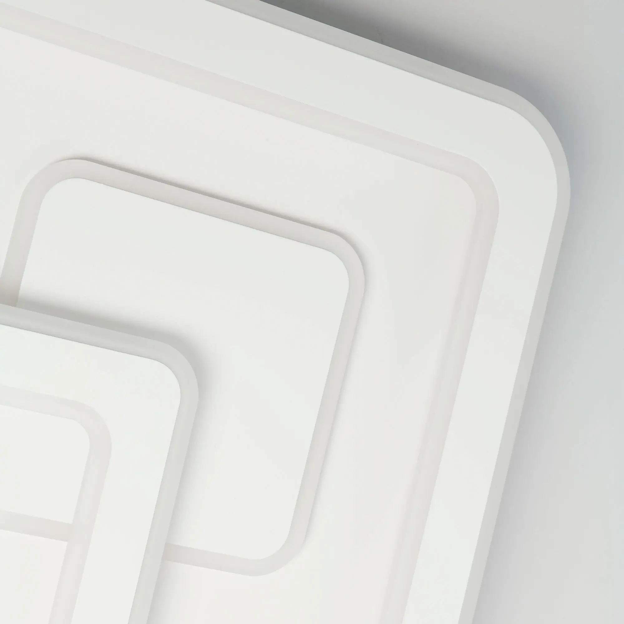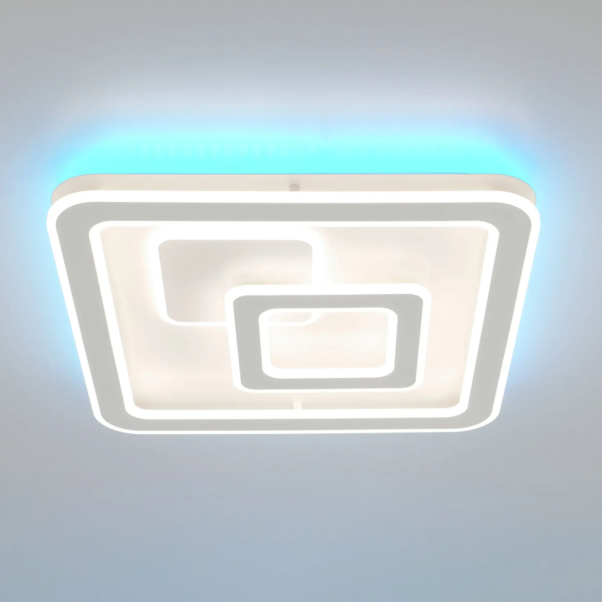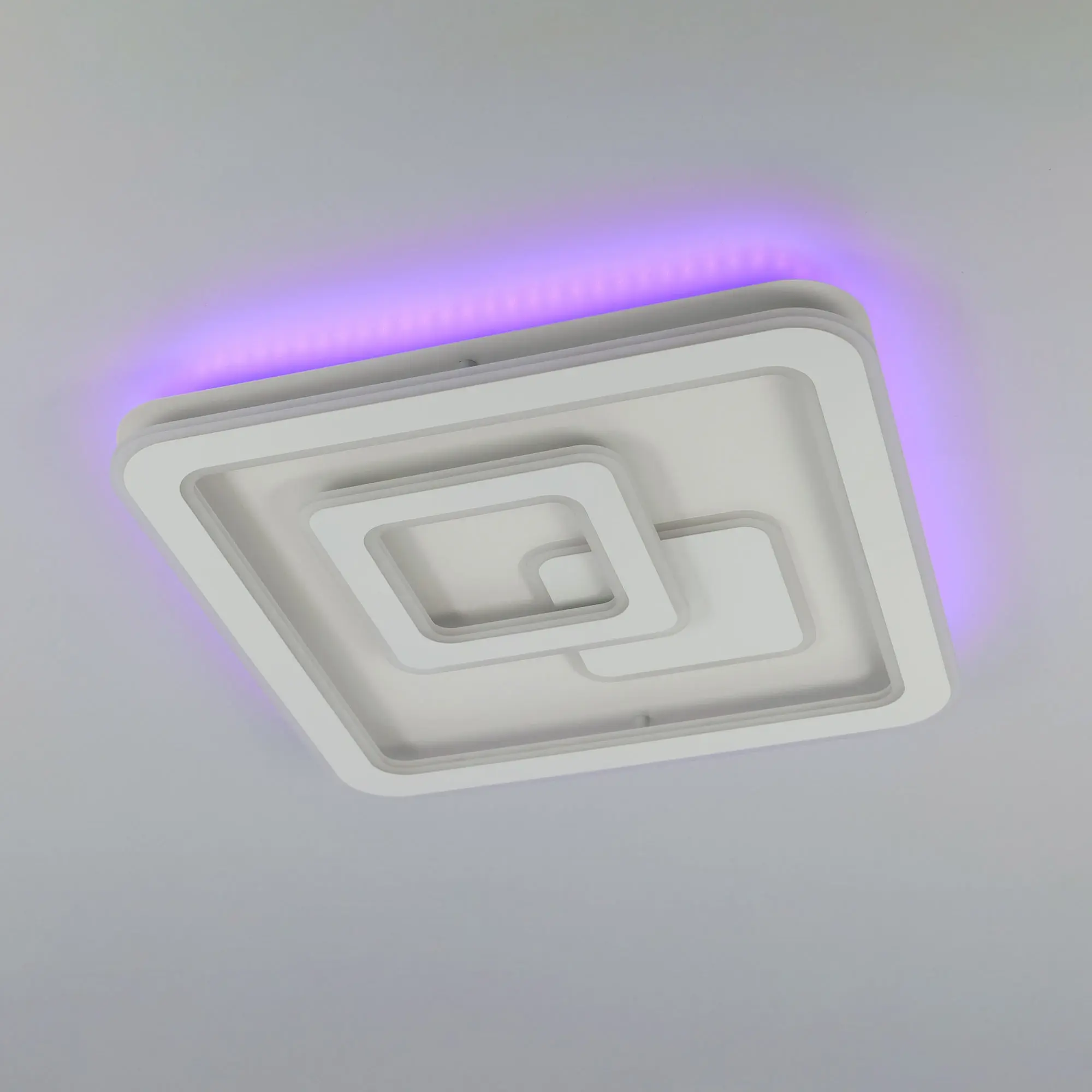 Люстра светодиодная Citilux Квест CL739B150E с RGB подсветкой и пультом дистанционного управления. Основание белого цвета, три светодиодных модуля плафона, формирующих внешний вид люстры, имеют квадратную форму. Корпус плафонов металлический, рассеиватель из оптического полимера. Изделием можно управлять с помощью радиопульта дистанционного управления и настенным выключателем.