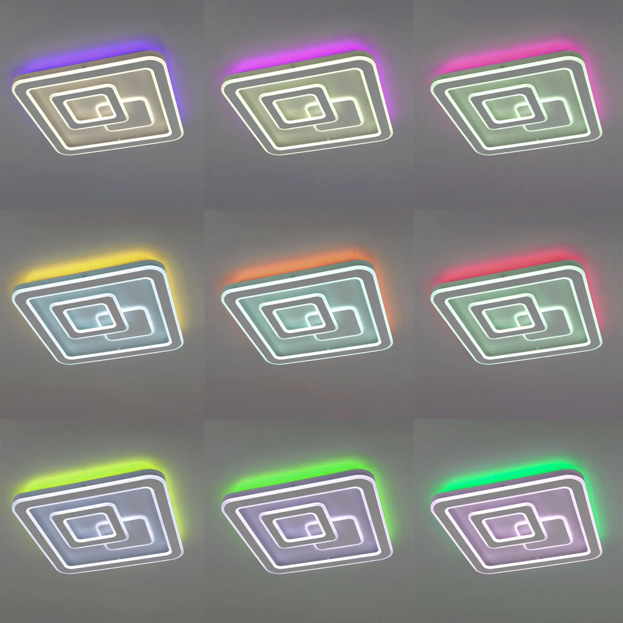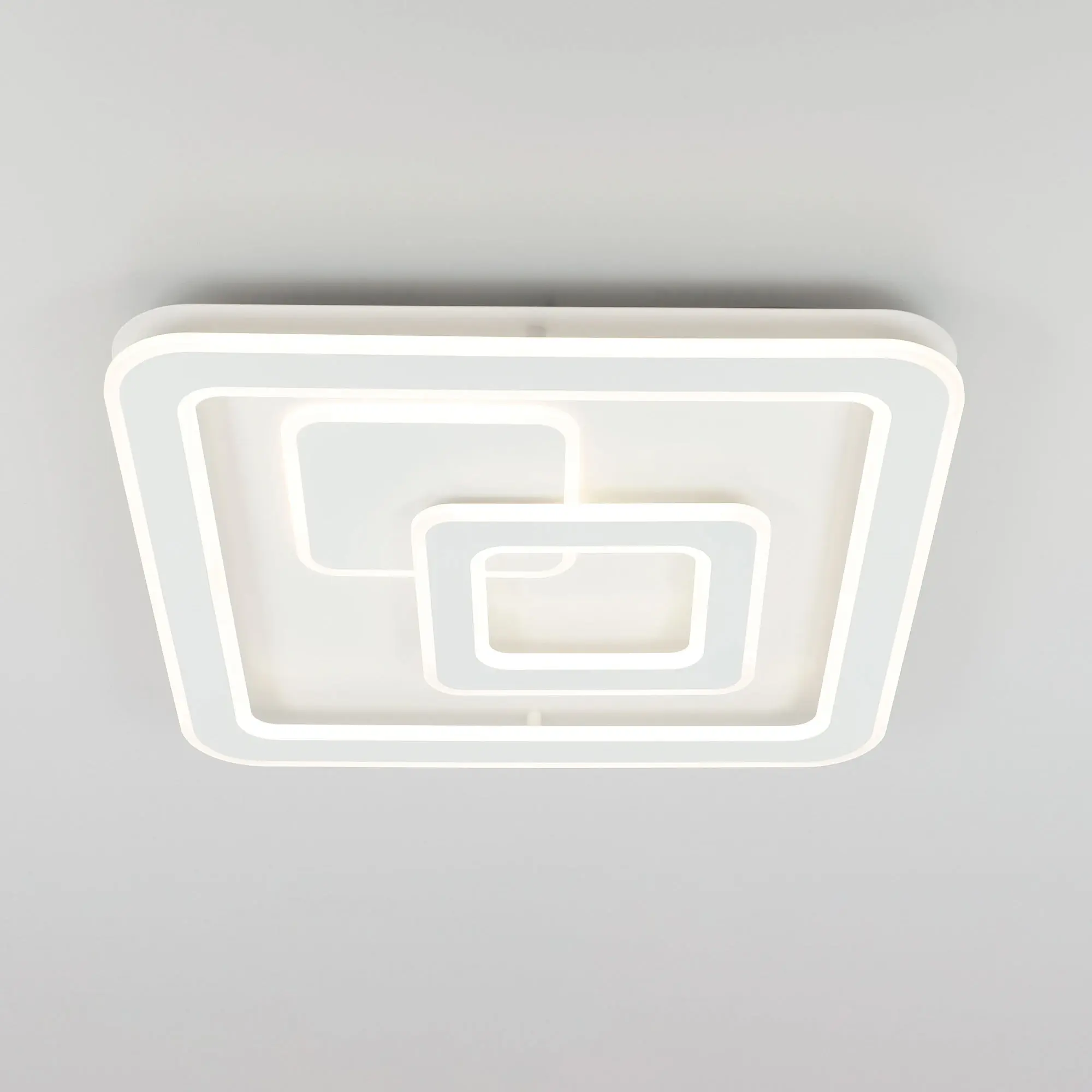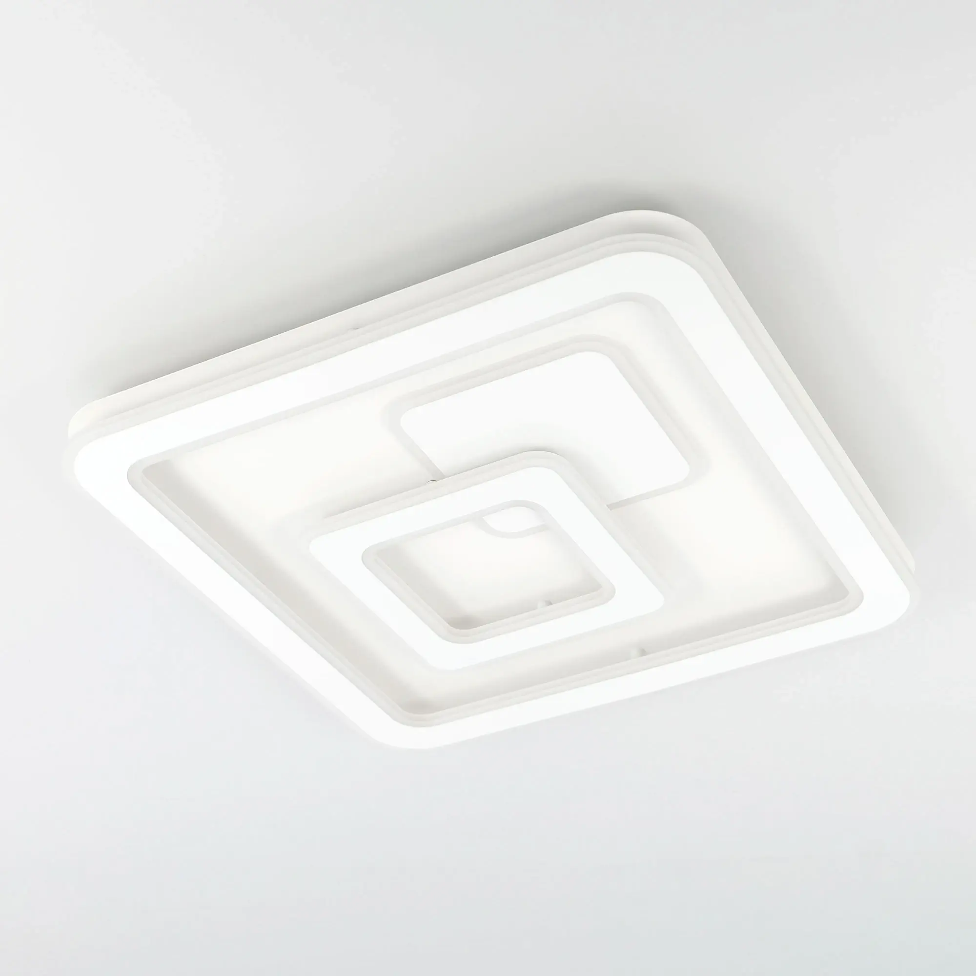 Люстра светодиодная Citilux Квест CL739B150E с RGB подсветкой и пультом дистанционного управления. Основание белого цвета, три светодиодных модуля плафона, формирующих внешний вид люстры, имеют квадратную форму. Корпус плафонов металлический, рассеиватель из оптического полимера. Изделием можно управлять с помощью радиопульта дистанционного управления и настенным выключателем.