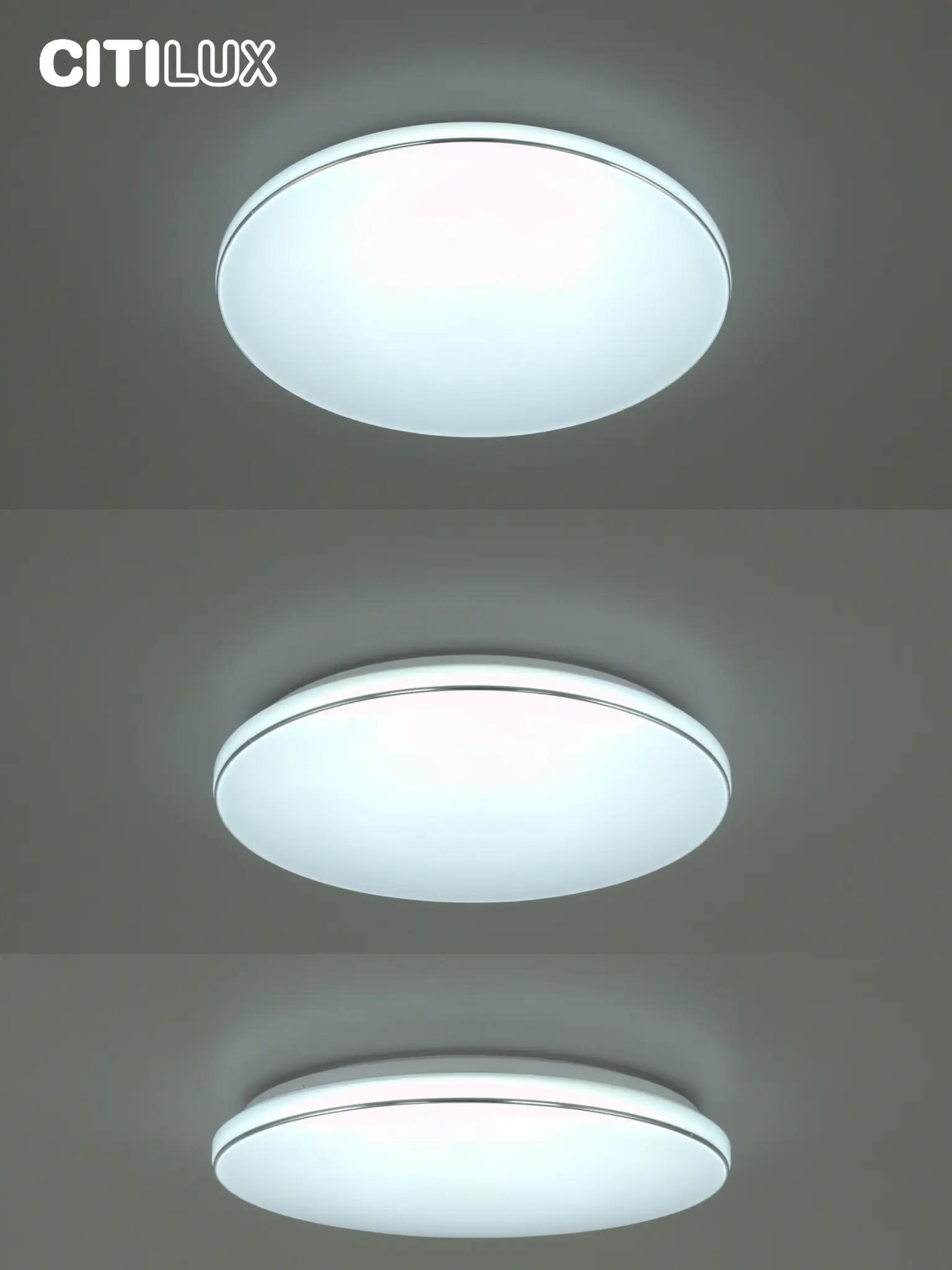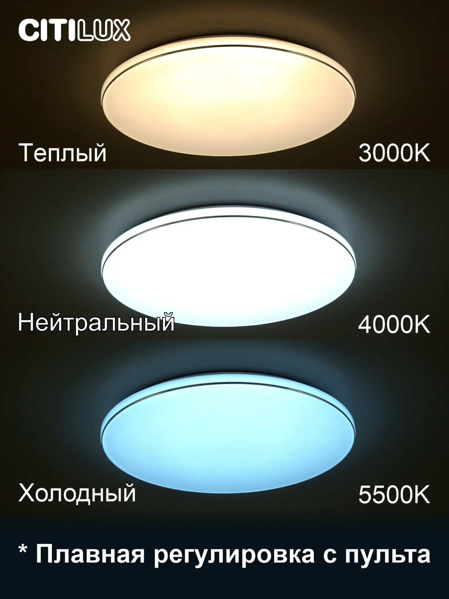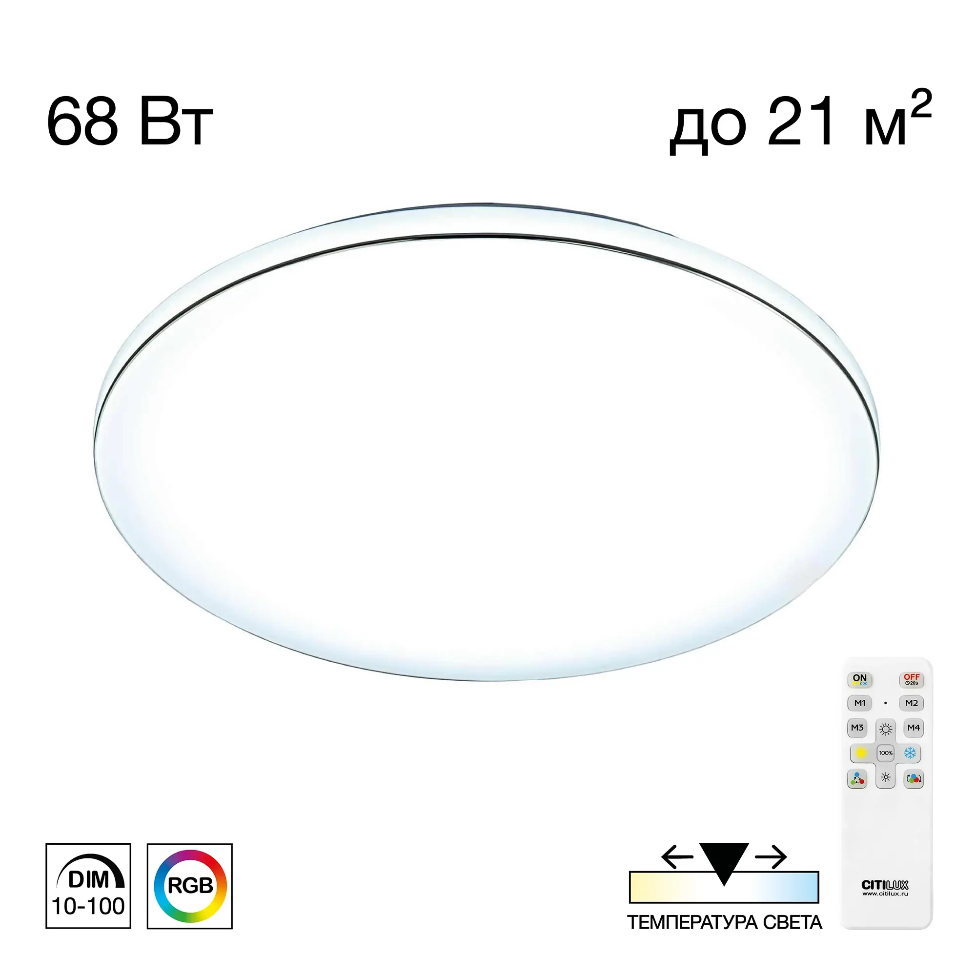 Светодиодная потолочная люстра Citilux Лаконика CL725680G с яркой цветной RGB подсветкой всего плафона. Светильник плоский, круглой формы. Основание металлическое, плафон белый матовый из оптического полимера, с изящной хромированной окантовкой. Мощность 68Вт, световой поток 5800Лм. Модель с пультом дистанционного управления. Доступна плавная регулировка яркости от 100 до 10%. Плавная регулировка цветовой температурой освещения в диапазоне от 3000К до 5500К, позволяет настроить любые оттенки теплого, нейтрального или холодного света. Цветная RGB подсветка имеет различные режимы работы. Таймер - функция отсроченного на 20сек. выключения. Четыре кнопки памяти позволяют сохранить настроенные режимы работы и включать их с пульта или обычным настенным выключателем. Пульт ДУ инфракрасный в комплекте, тип батареек ААА (батарейками не комплектуется).,