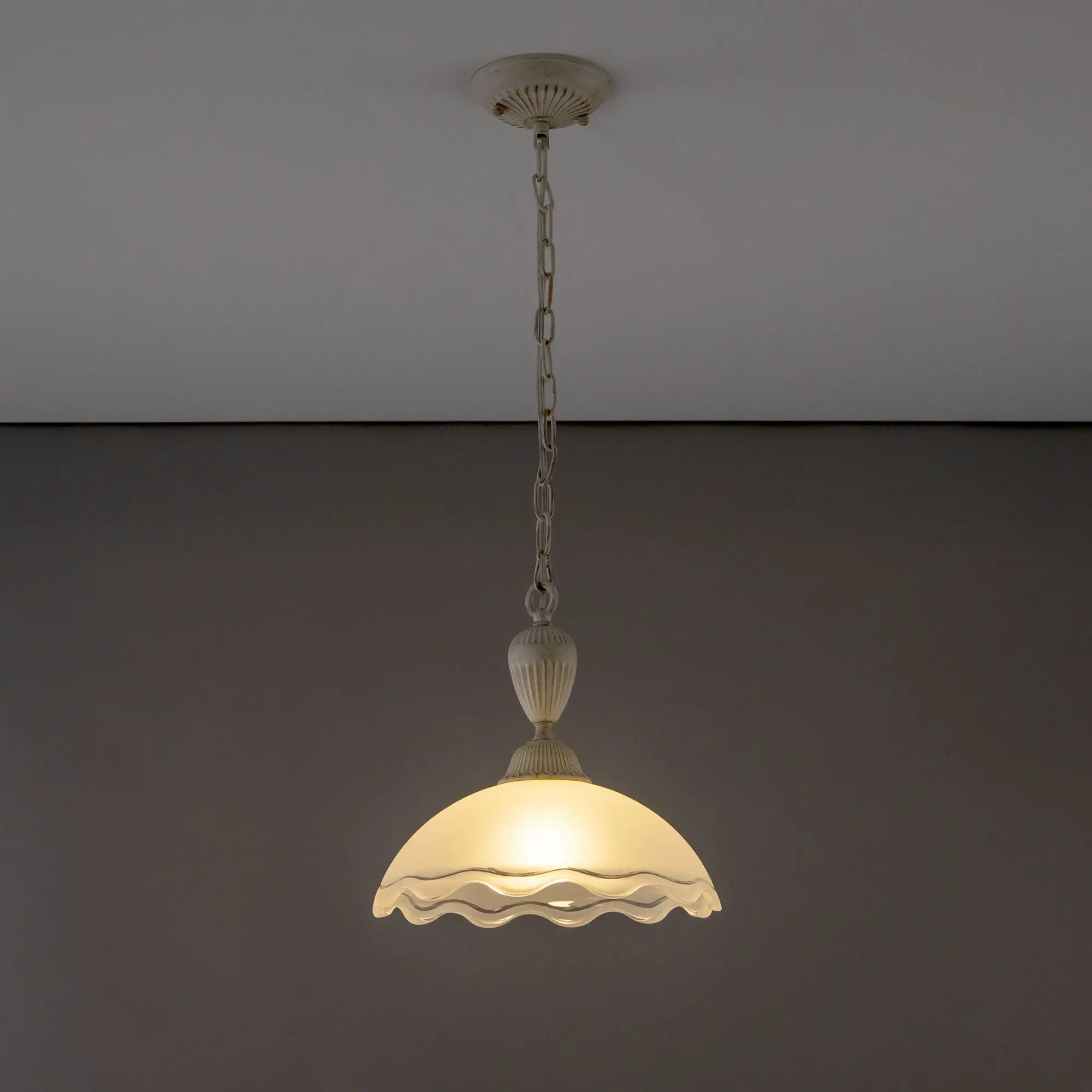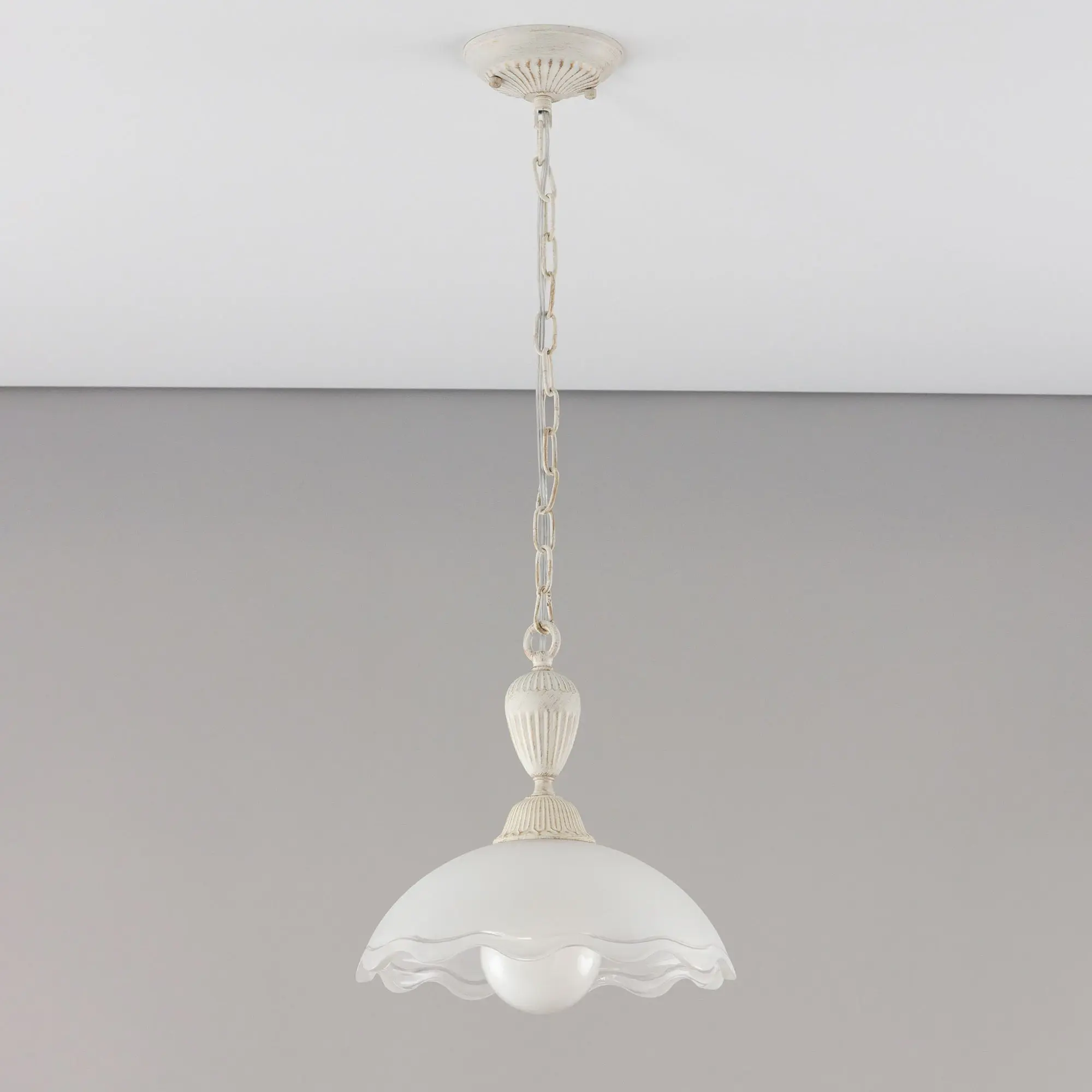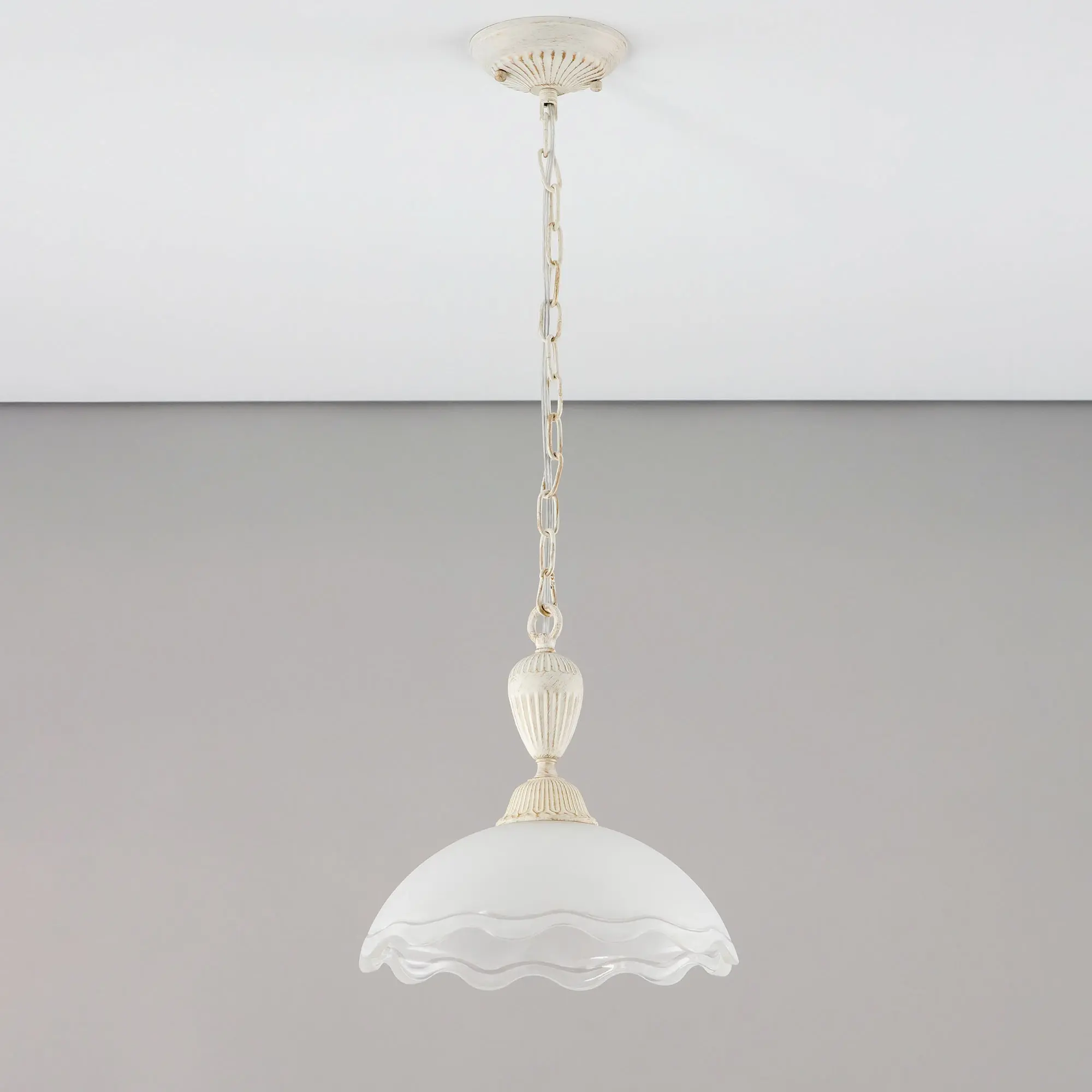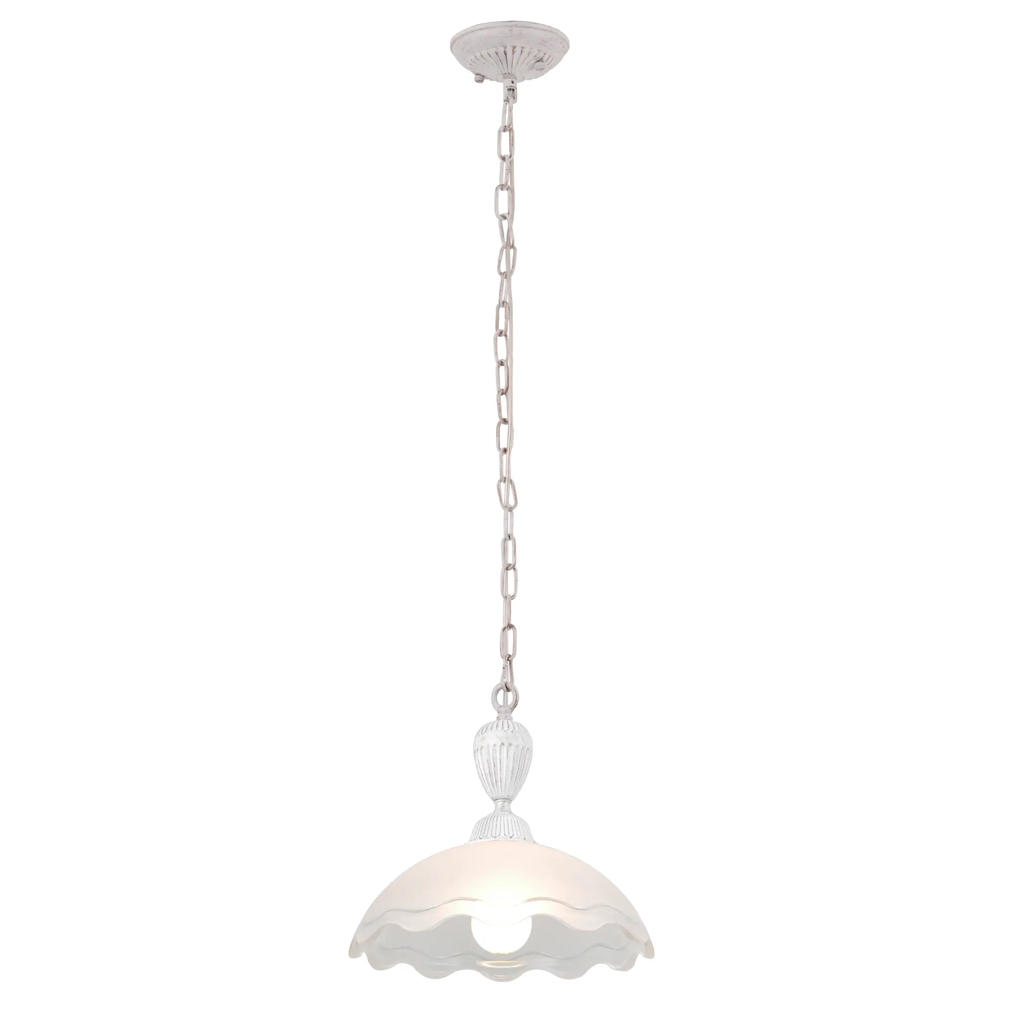 Светильник подвесной Citilux Латур CL413210 выполнен в классическом стиле. Корпус модели металлический, цвет белый с золотистой патиной. Плафон стеклянный, полуматовый, с прозрачным волнистым краем. Высоту подвеса можно отрегулировать при установке. В модели используются 1 лампа с цоколем Е27 максимальной мощностью для ламп накаливания 75Вт. Светодиодную лампу можно использовать более яркую.,