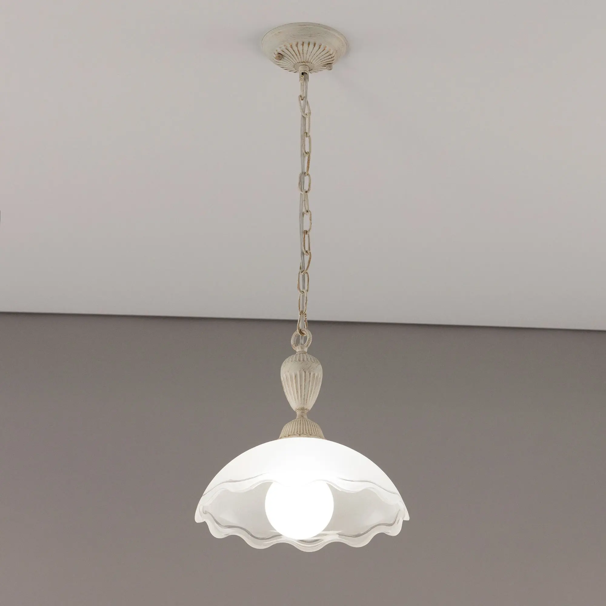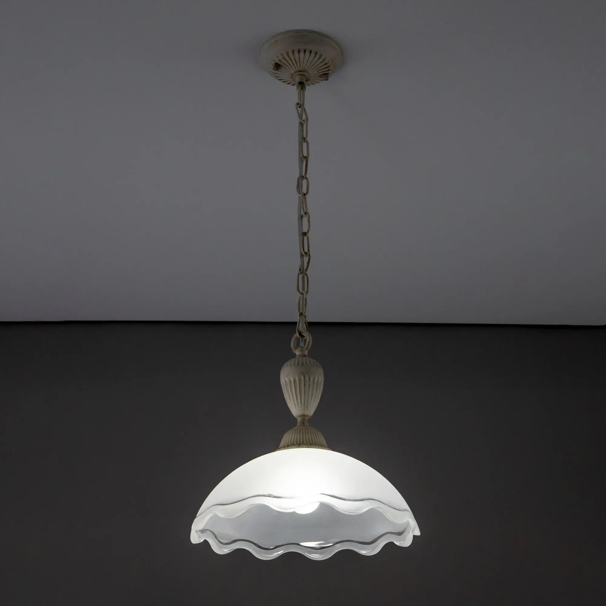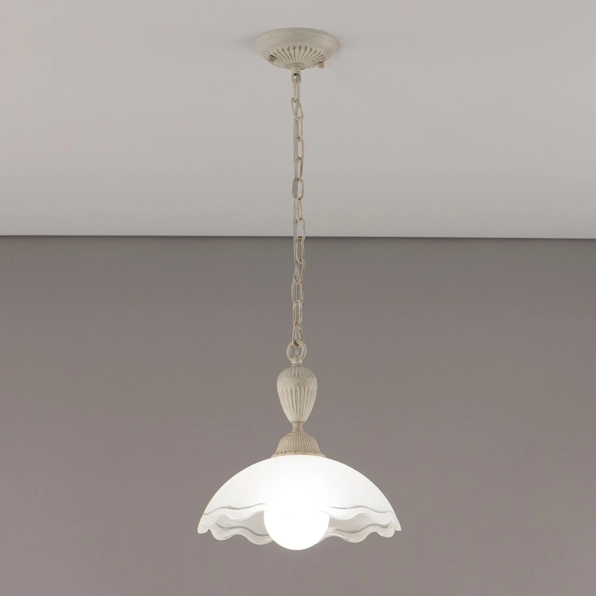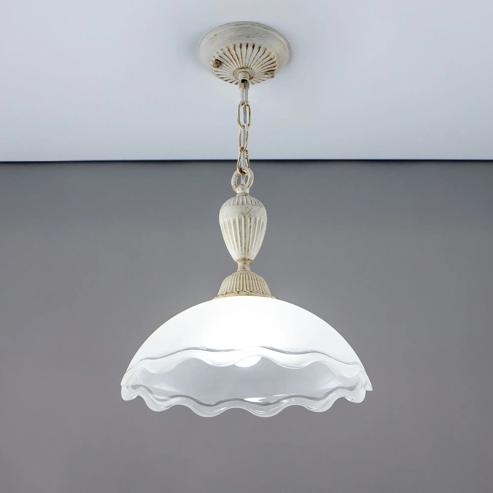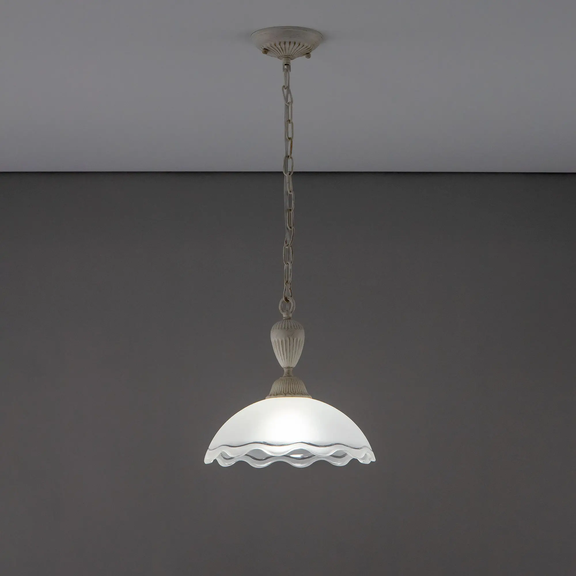 Светильник подвесной Citilux Латур CL413210 выполнен в классическом стиле. Корпус модели металлический, цвет белый с золотистой патиной. Плафон стеклянный, полуматовый, с прозрачным волнистым краем. Высоту подвеса можно отрегулировать при установке. В модели используются 1 лампа с цоколем Е27 максимальной мощностью для ламп накаливания 75Вт. Светодиодную лампу можно использовать более яркую.,