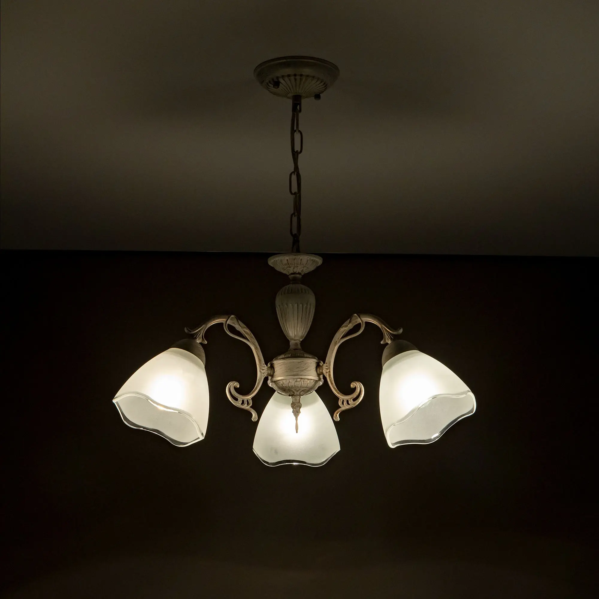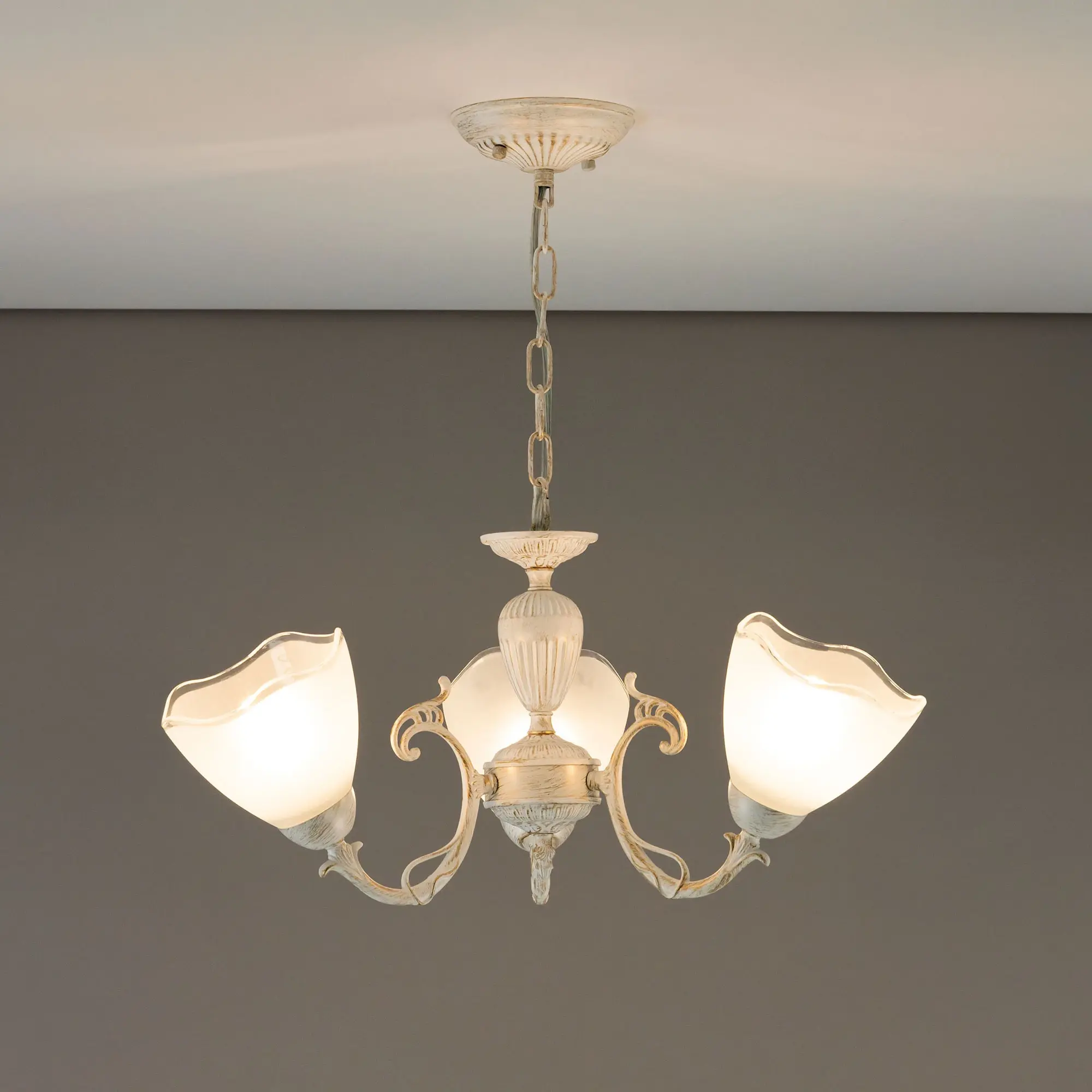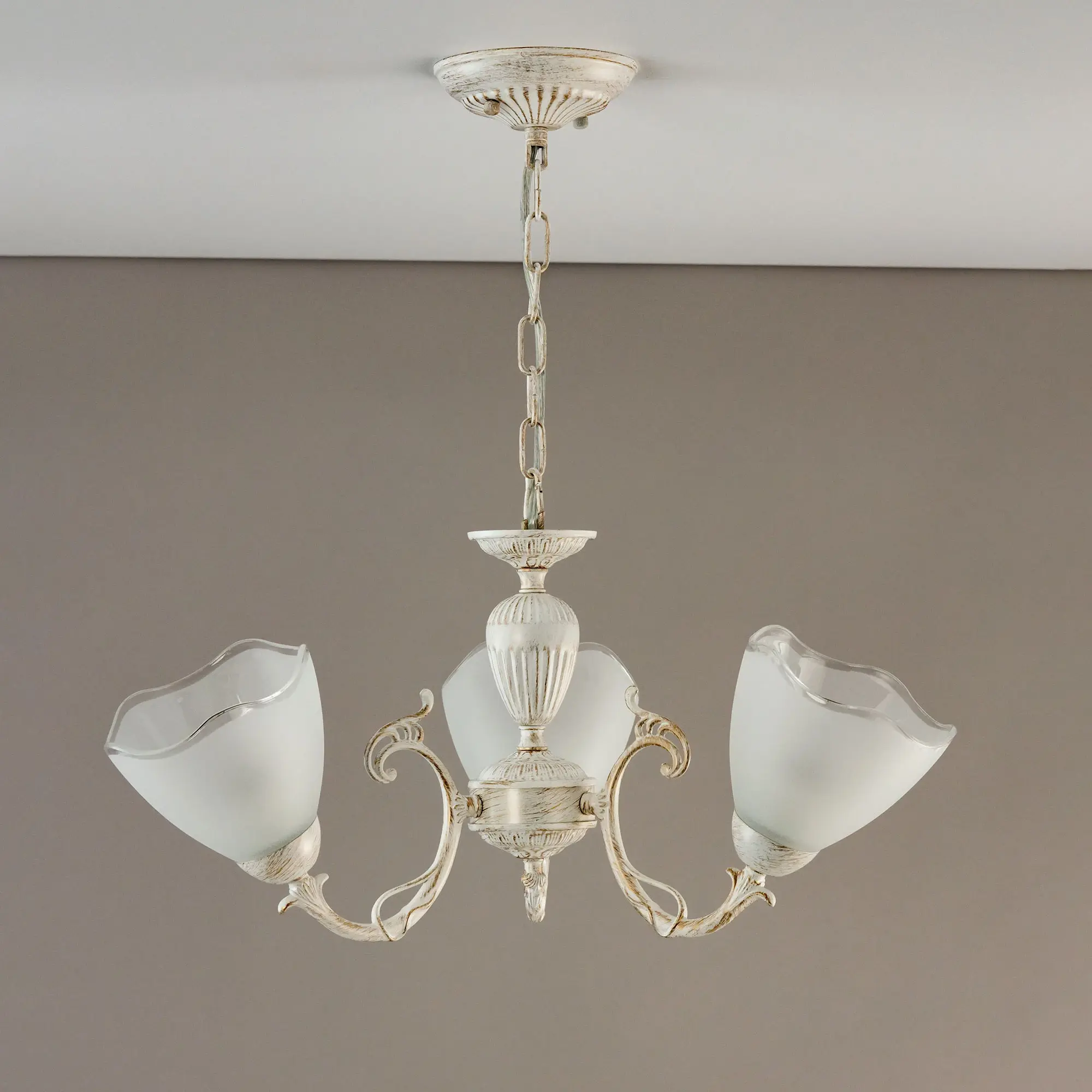 Люстра трёхрожковая Citilux Латур CL413230 в классическом стиле. Корпус светильника металлический, с литыми рожками, цвет белый с золотистой патиной. Плафоны стеклянные, полуматовые, с прозрачным волнистым краем. Светильник поставляется в виде комплекта для самостоятельной сборки, с подробной инструкцией. Из данного набора, можно собрать подвесную люстру с плафонами, направленными вверх, дающую мягкий отраженный свет или более яркий вариант с плафонами вниз. Высоту модели можно изменить при установке, уменьшив длину подвесной цепи. Если в помещении низкие потолки, изделие можно собрать вообще без цепи, как потолочную люстру. Более того, на стадии сборки, вы можете подключить светильник для работы, как с одноклавишным, так и с двухклавишным выключателем. В модели используются 3 лампы с цоколем Е27 и максимальной мощностью для ламп накаливания 75Вт. Светодиодные лампы можно использовать более яркие. Тип крепления к потолку – планка,