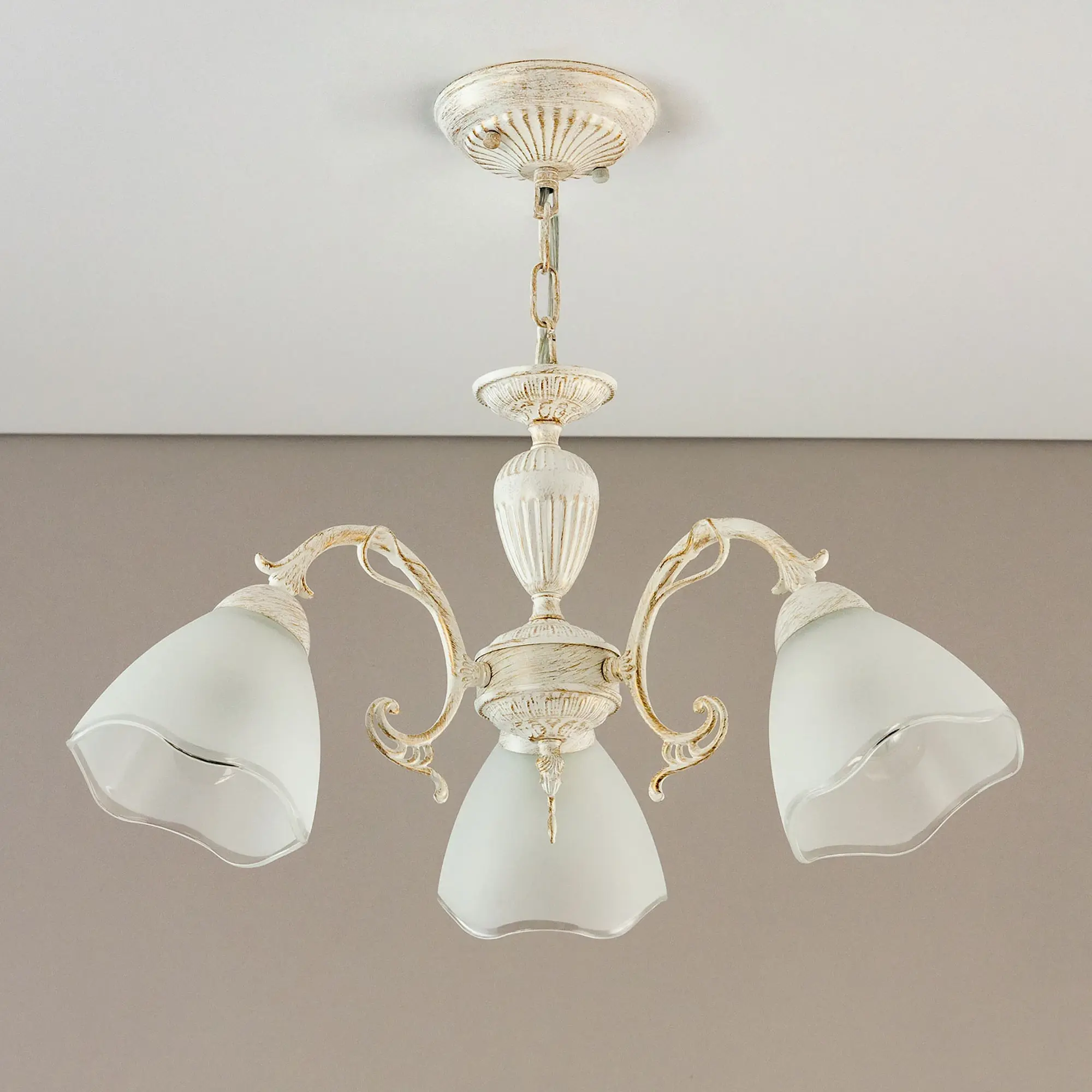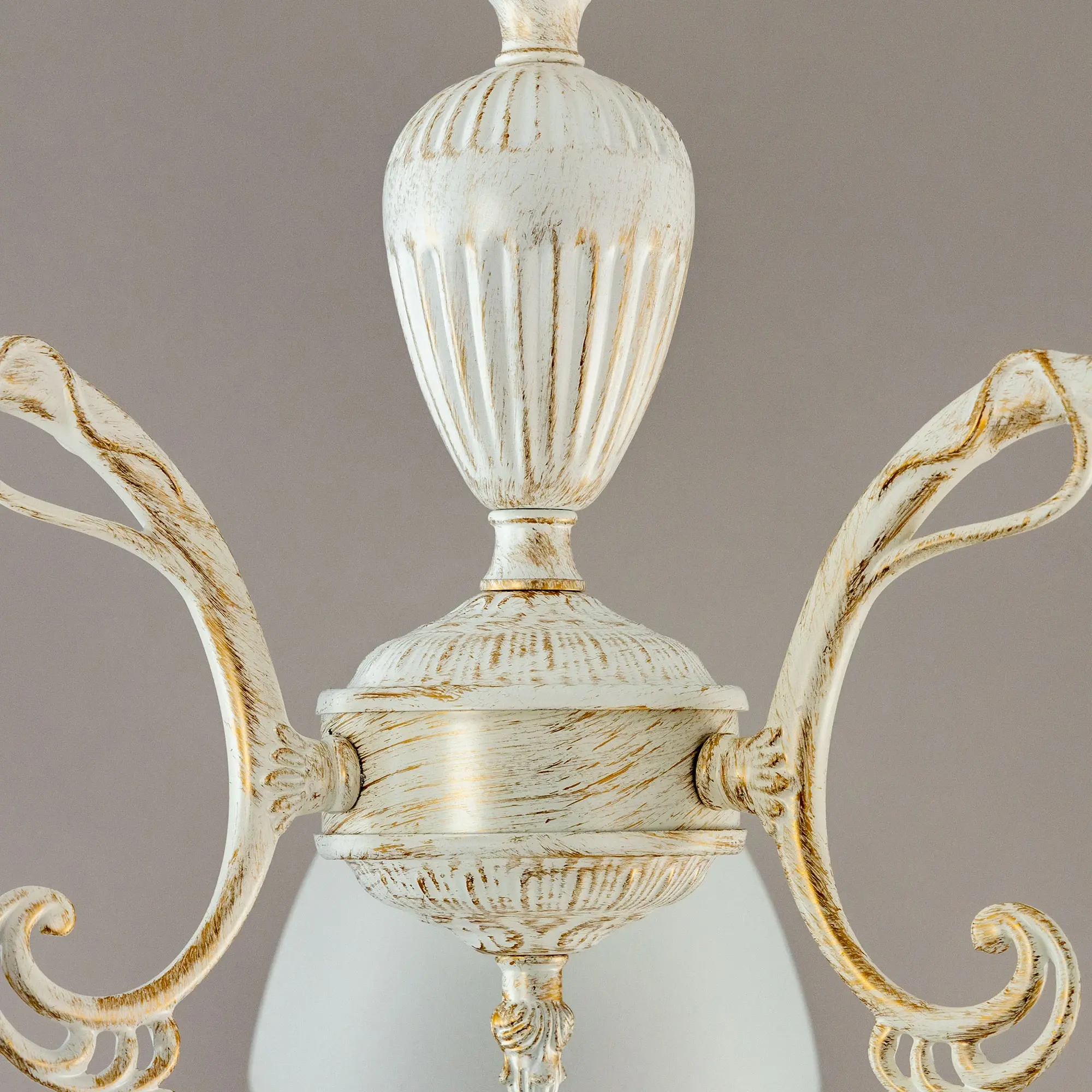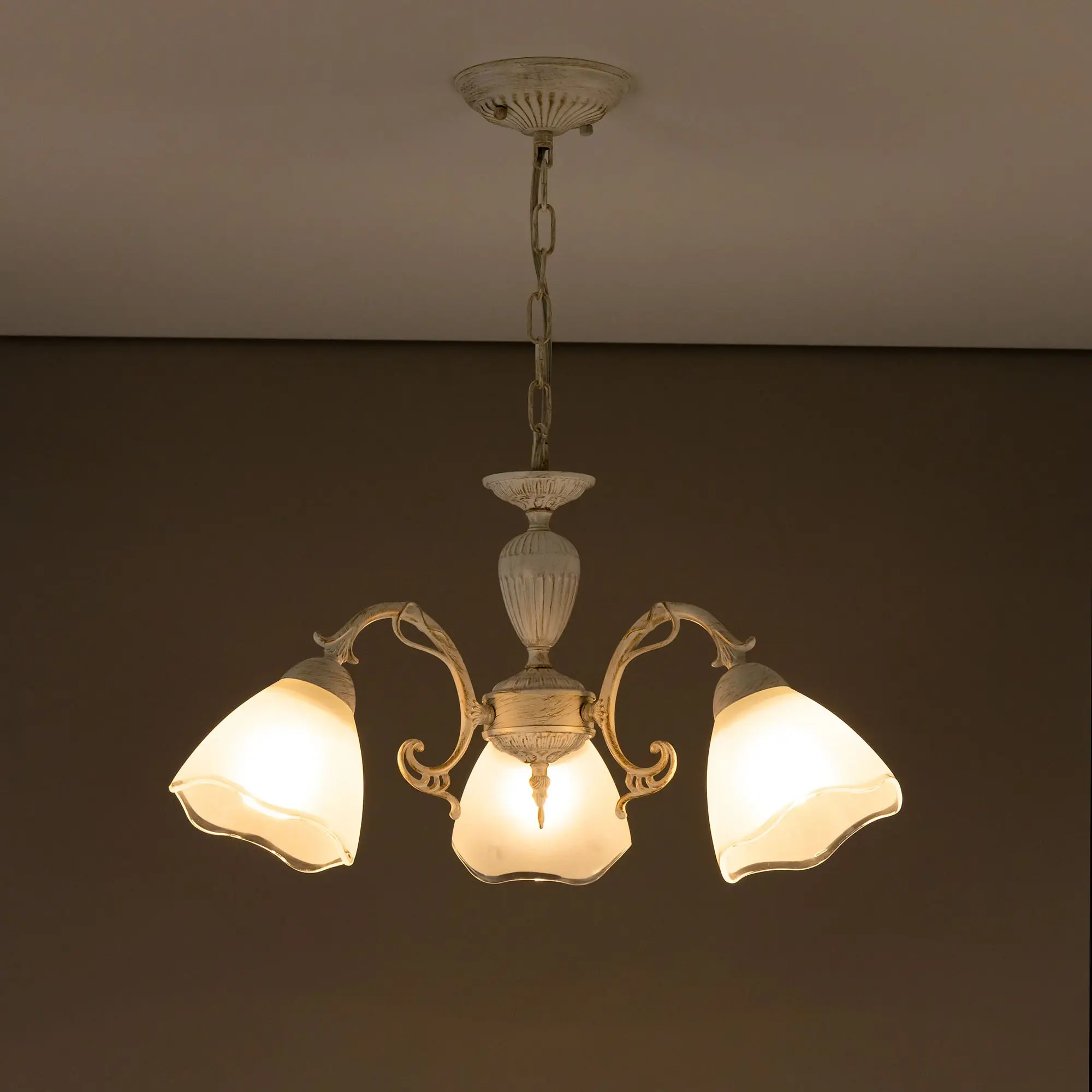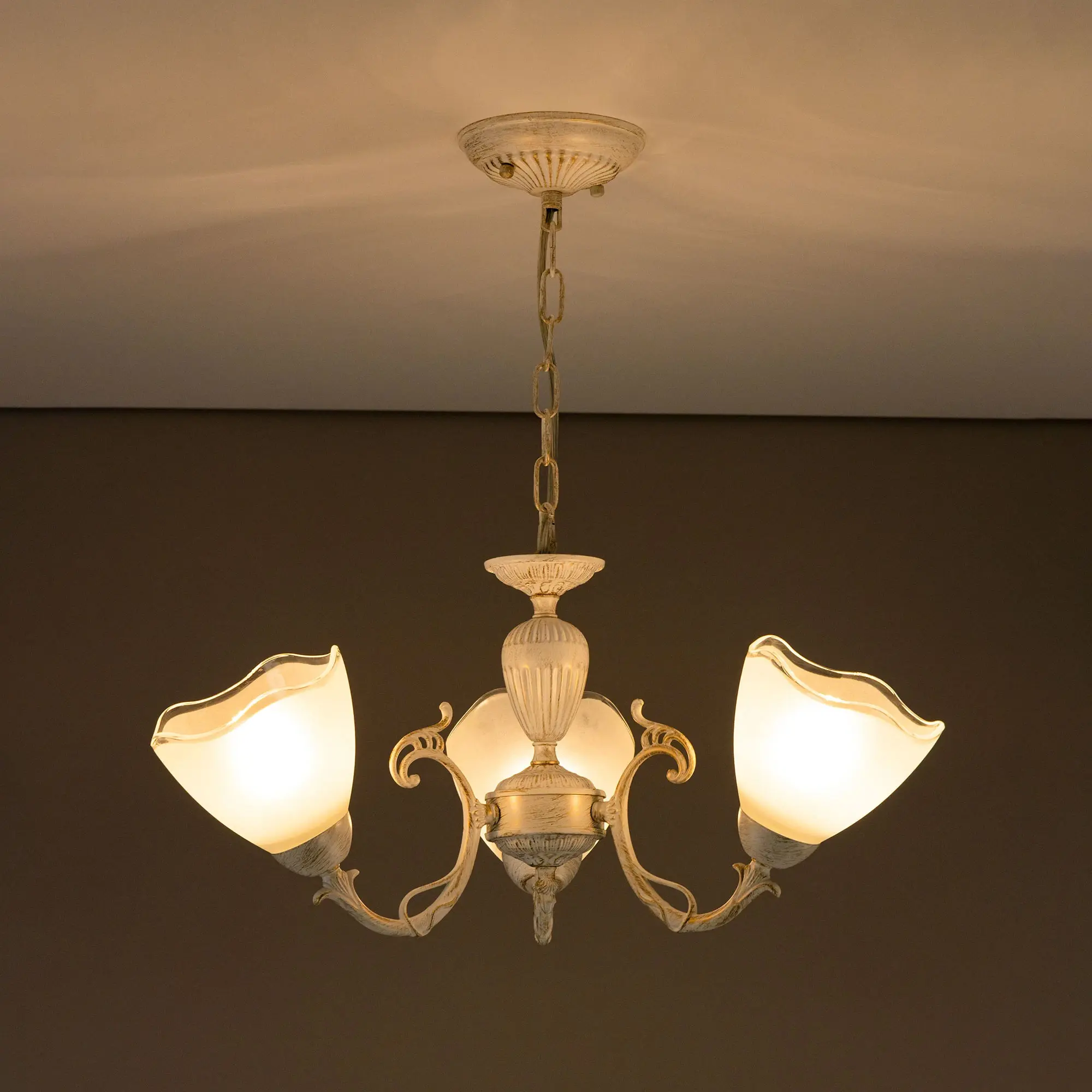 Люстра трёхрожковая Citilux Латур CL413230 в классическом стиле. Корпус светильника металлический, с литыми рожками, цвет белый с золотистой патиной. Плафоны стеклянные, полуматовые, с прозрачным волнистым краем. Светильник поставляется в виде комплекта для самостоятельной сборки, с подробной инструкцией. Из данного набора, можно собрать подвесную люстру с плафонами, направленными вверх, дающую мягкий отраженный свет или более яркий вариант с плафонами вниз. Высоту модели можно изменить при установке, уменьшив длину подвесной цепи. Если в помещении низкие потолки, изделие можно собрать вообще без цепи, как потолочную люстру. Более того, на стадии сборки, вы можете подключить светильник для работы, как с одноклавишным, так и с двухклавишным выключателем. В модели используются 3 лампы с цоколем Е27 и максимальной мощностью для ламп накаливания 75Вт. Светодиодные лампы можно использовать более яркие. Тип крепления к потолку – планка,