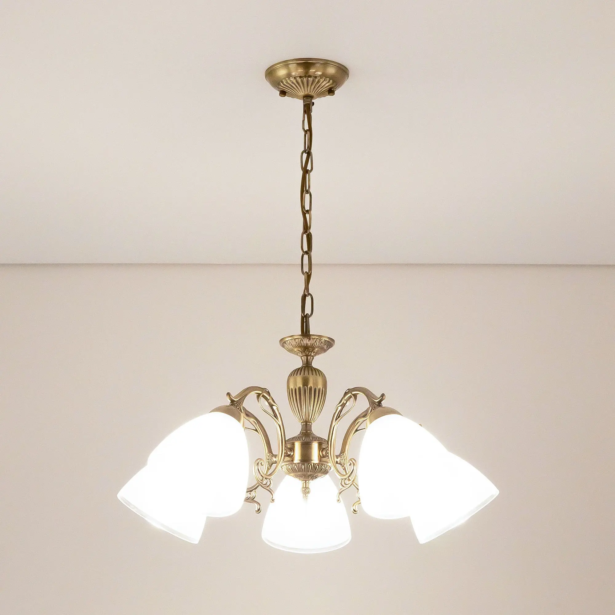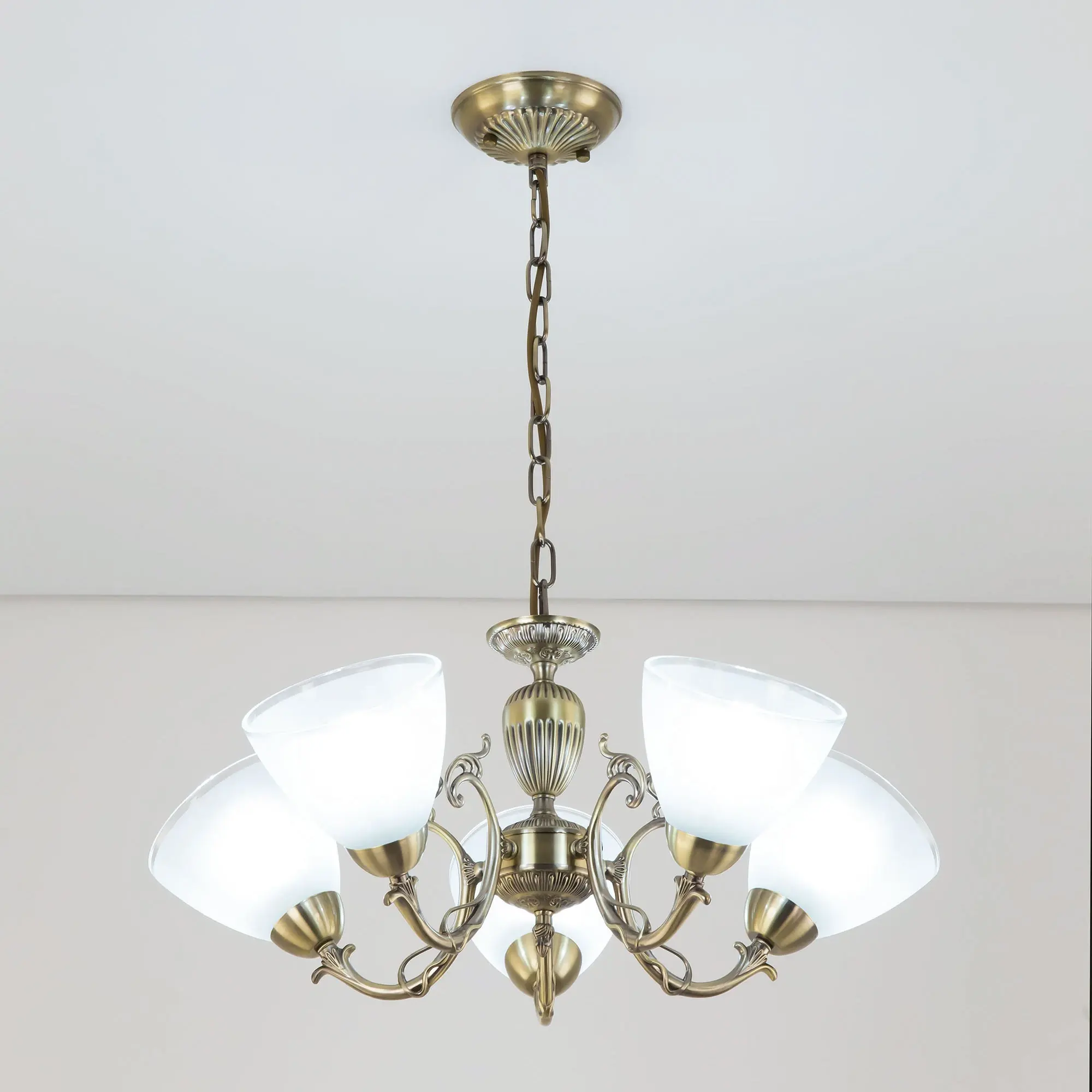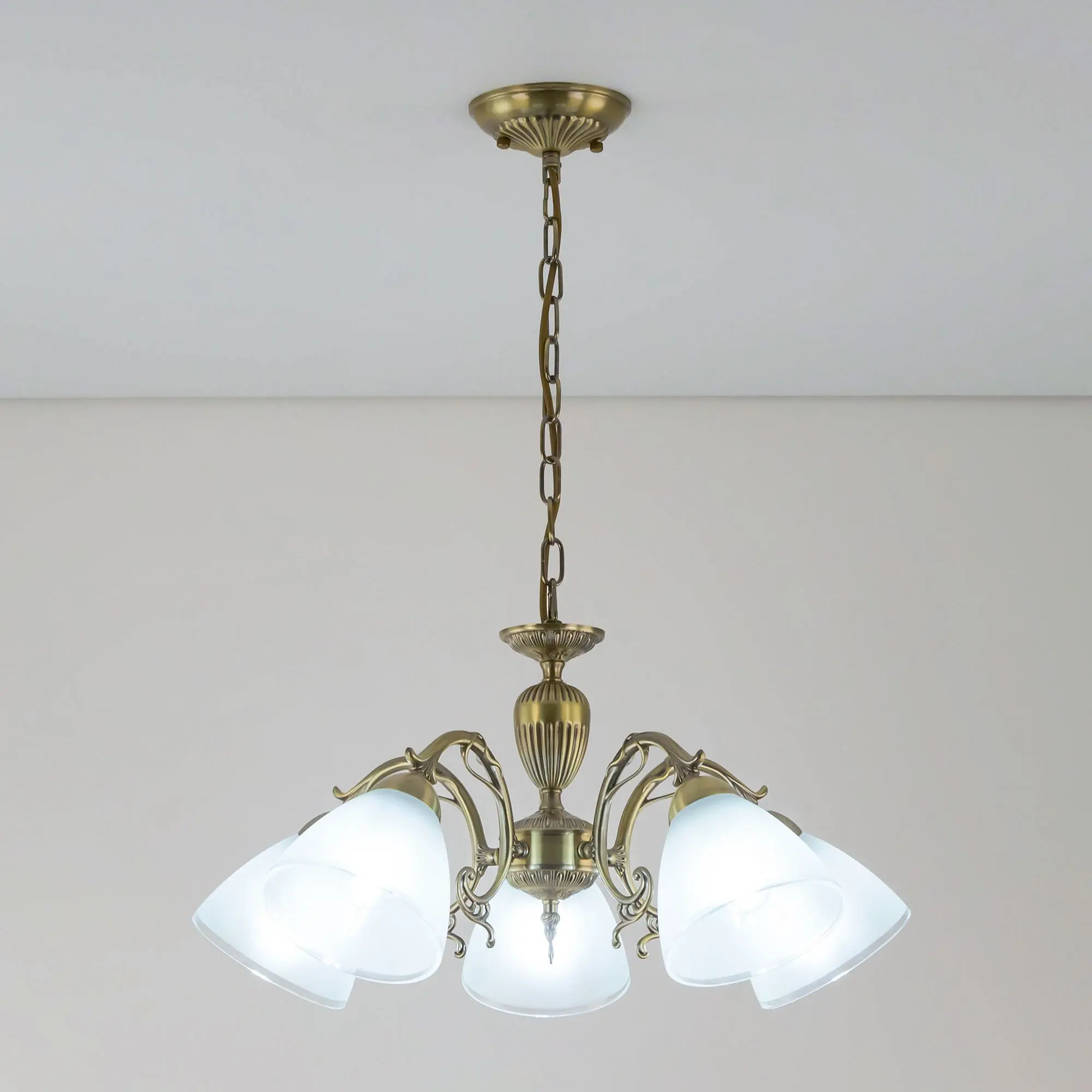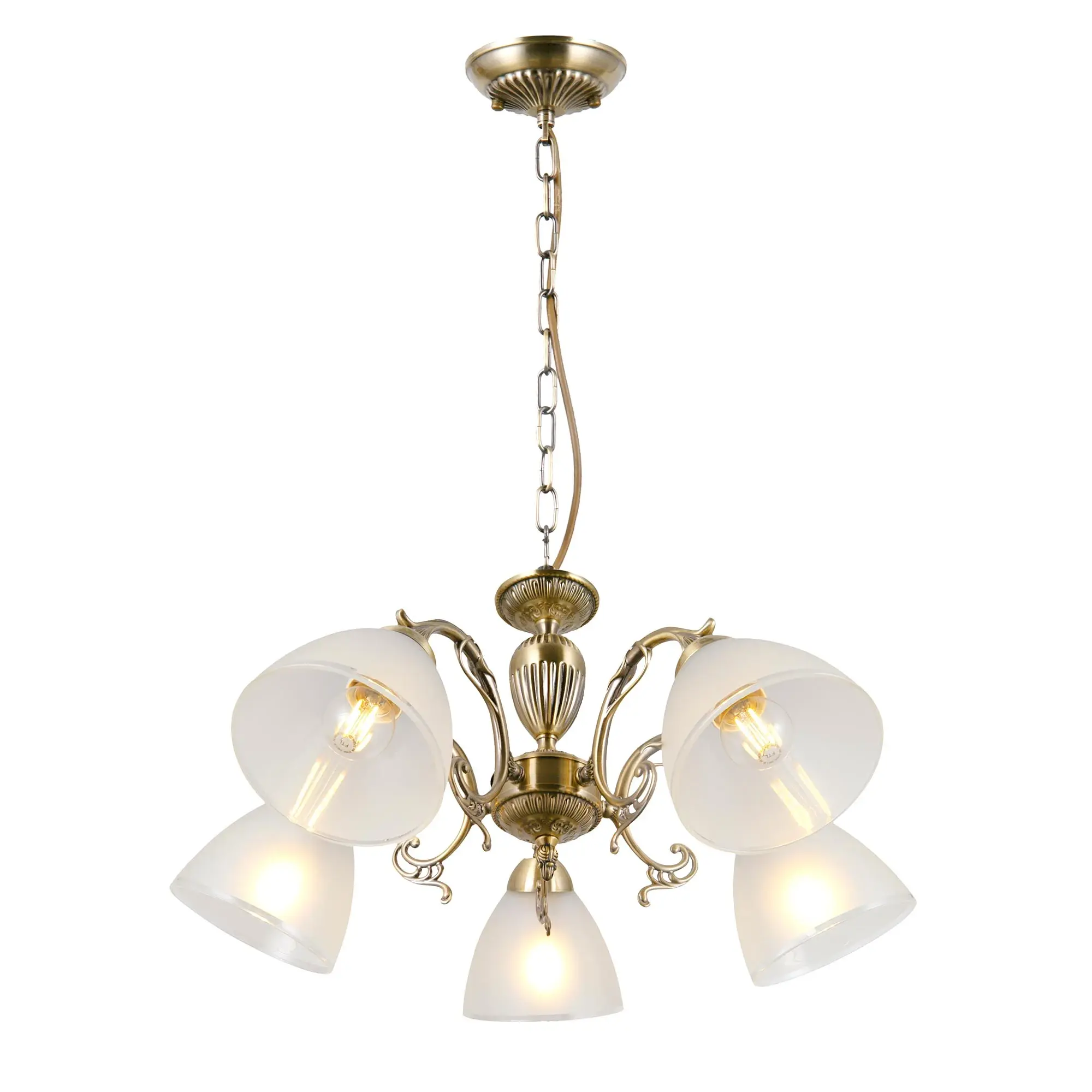 Люстра пятирожковая Citilux Латур CL413251 выполнена в классическом стиле. Корпус светильника металлический, с литыми рожками, цвет бронза. Плафоны стеклянные, полуматовые с утончённой прозрачной окантовкой. Люстра поставляется в виде комплекта для самостоятельной сборки, с подробной инструкцией. Из данного набора, можно собрать подвесную модель с плафонами, направленными вверх, дающую мягкий отраженный свет или более яркий вариант с плафонами вниз. Высота люстры на цепи 70 см, прекрасный выбор для комнат с высокими потолками. Если в помещении низкие потолки, люстру можно собрать вообще без цепи, как потолочную, высотой всего 27 см. Тип крепления к потолку – планка. Более того, на стадии сборки, вы можете подключить люстру для работы, как с одноклавишным, так и с двухклавишным выключателем. В модели используются 5 ламп с цоколем Е27 и максимальной мощностью для ламп накаливания 75Вт. Суммарная мощность 375 Вт. Светодиодные лампы можно использовать большей яркости.